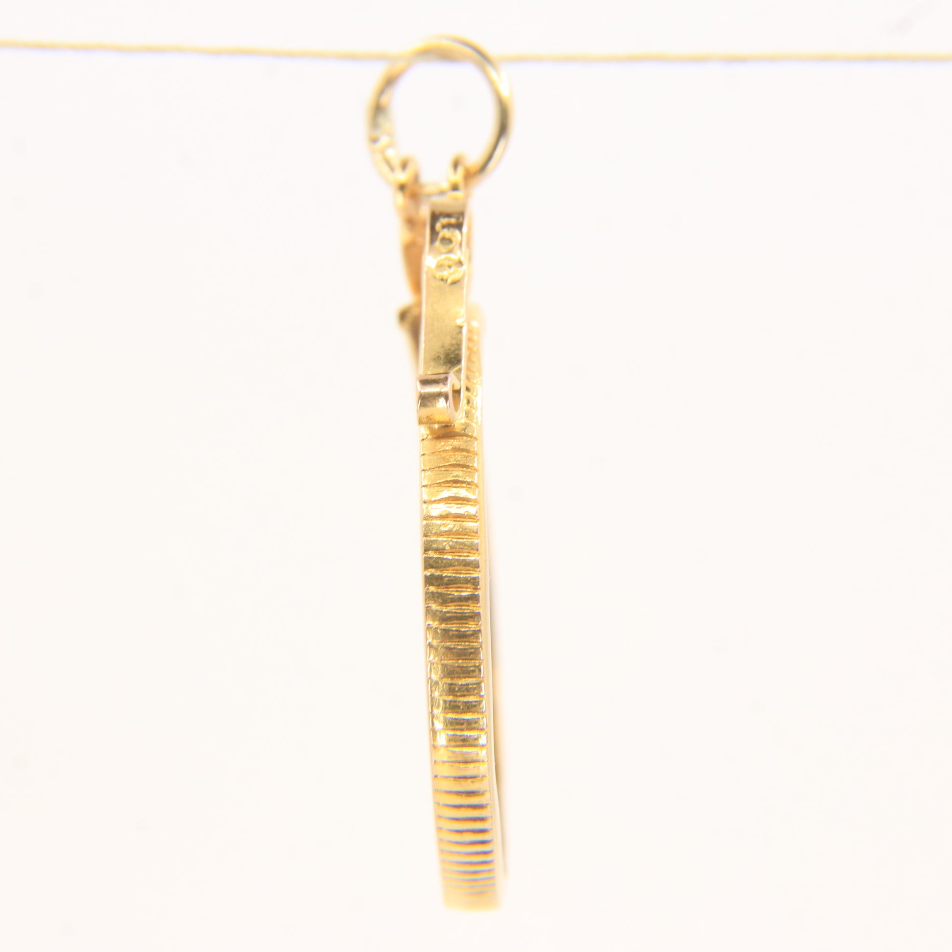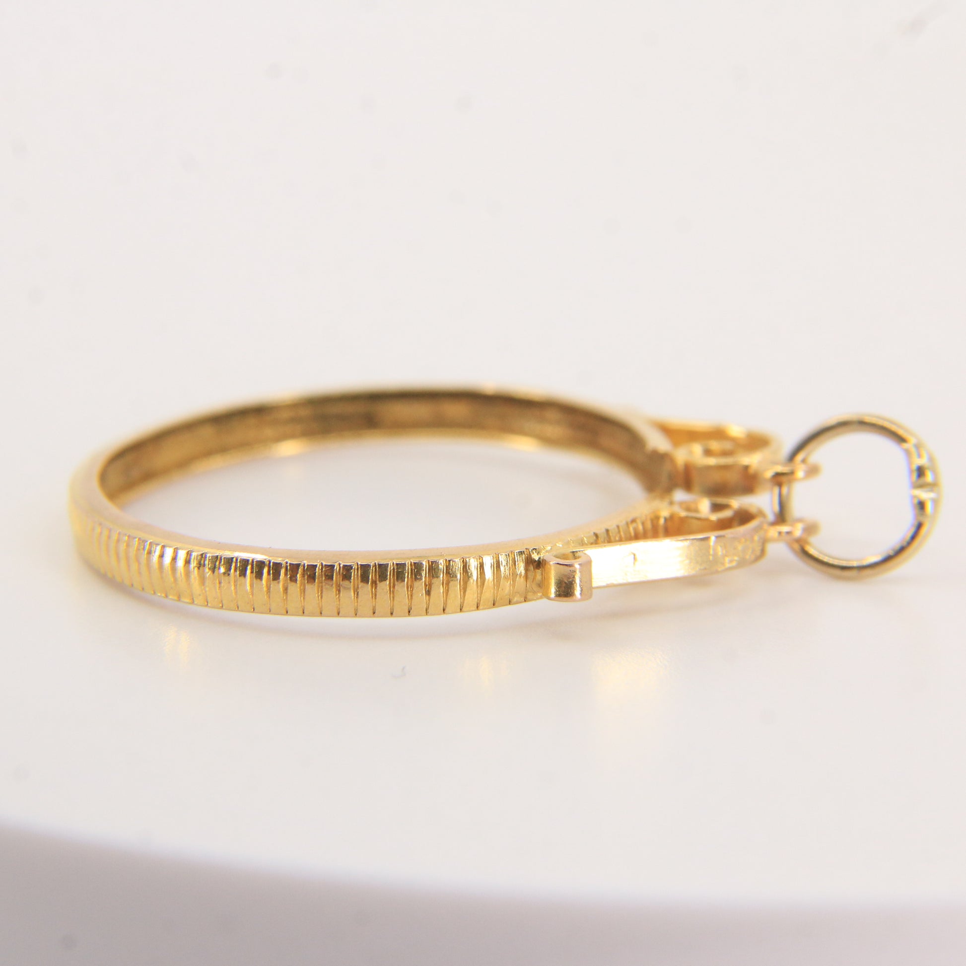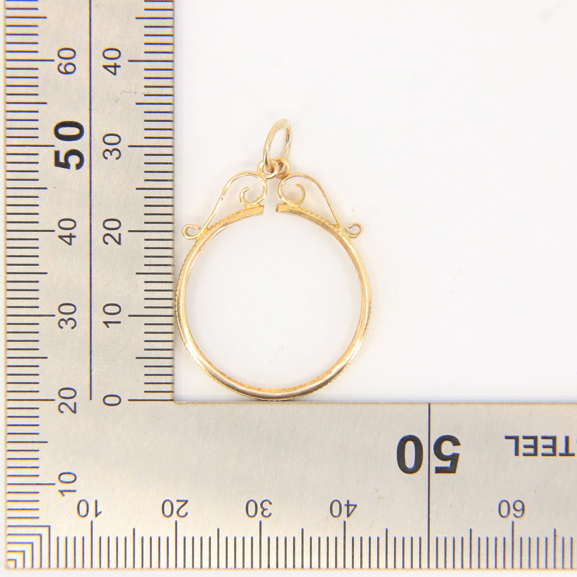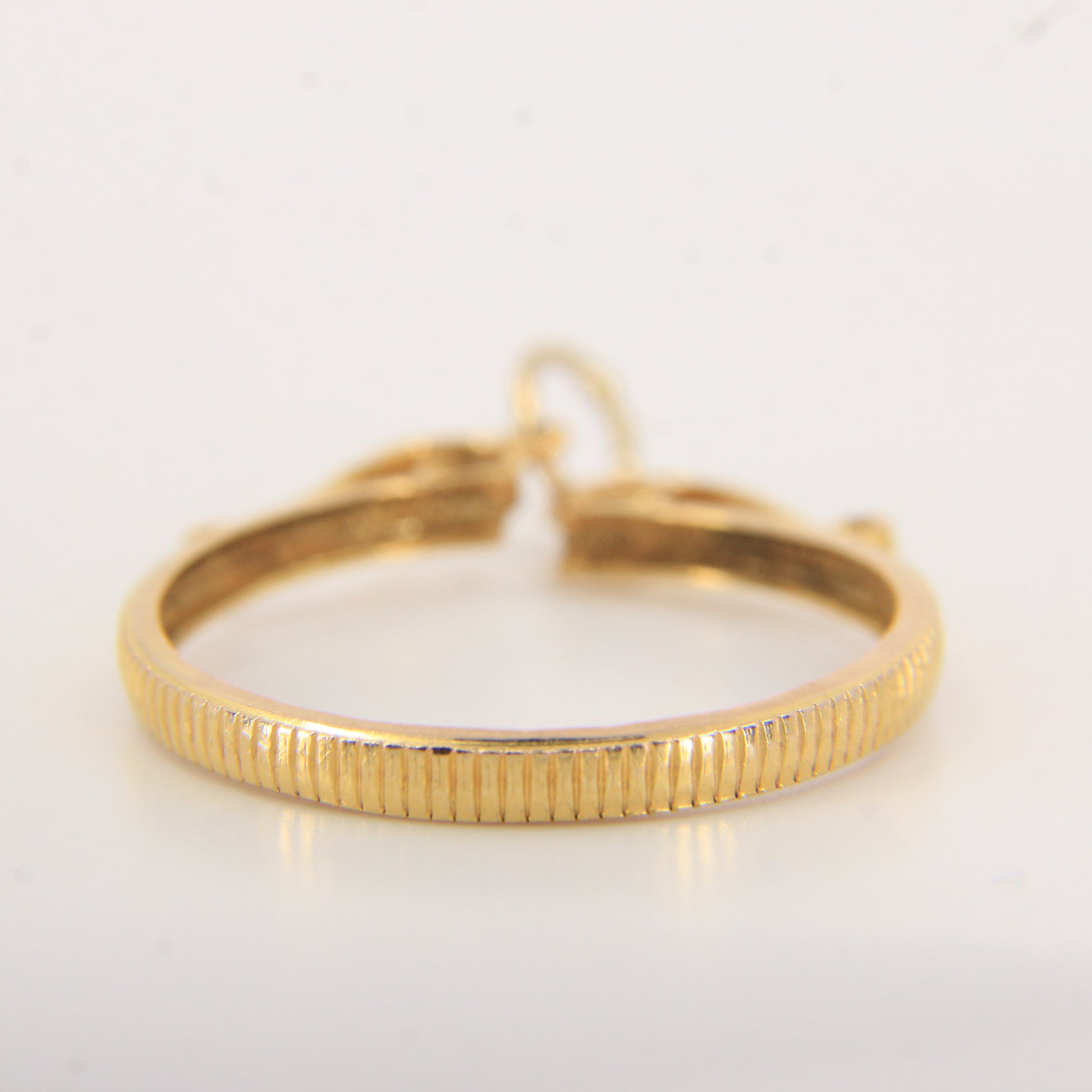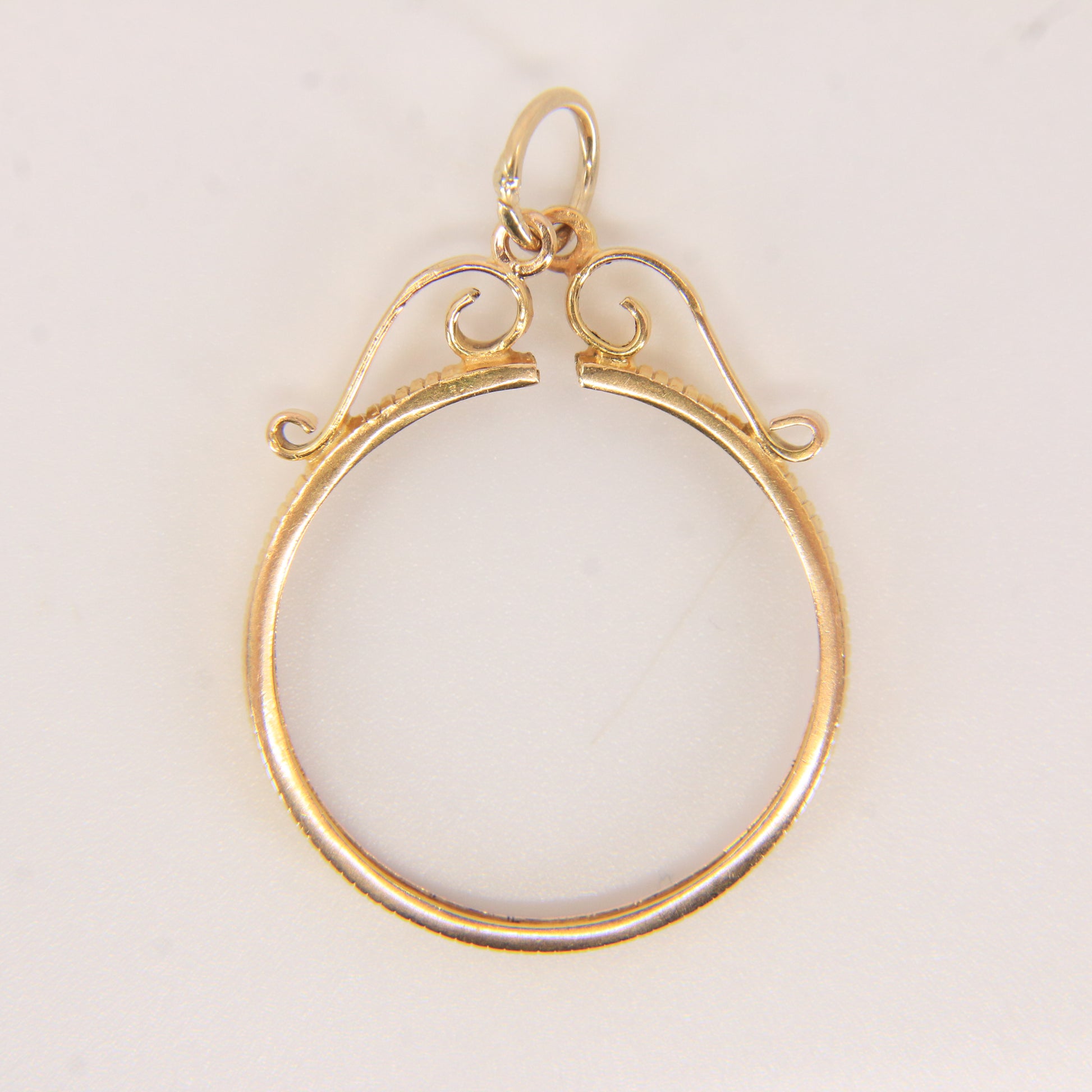 A classic vintage 9ct gold full sovereign coin frame pendant, designed to securely house a full sovereign coin. An ideal charm for collectors or investment wear—add this to your collection today.