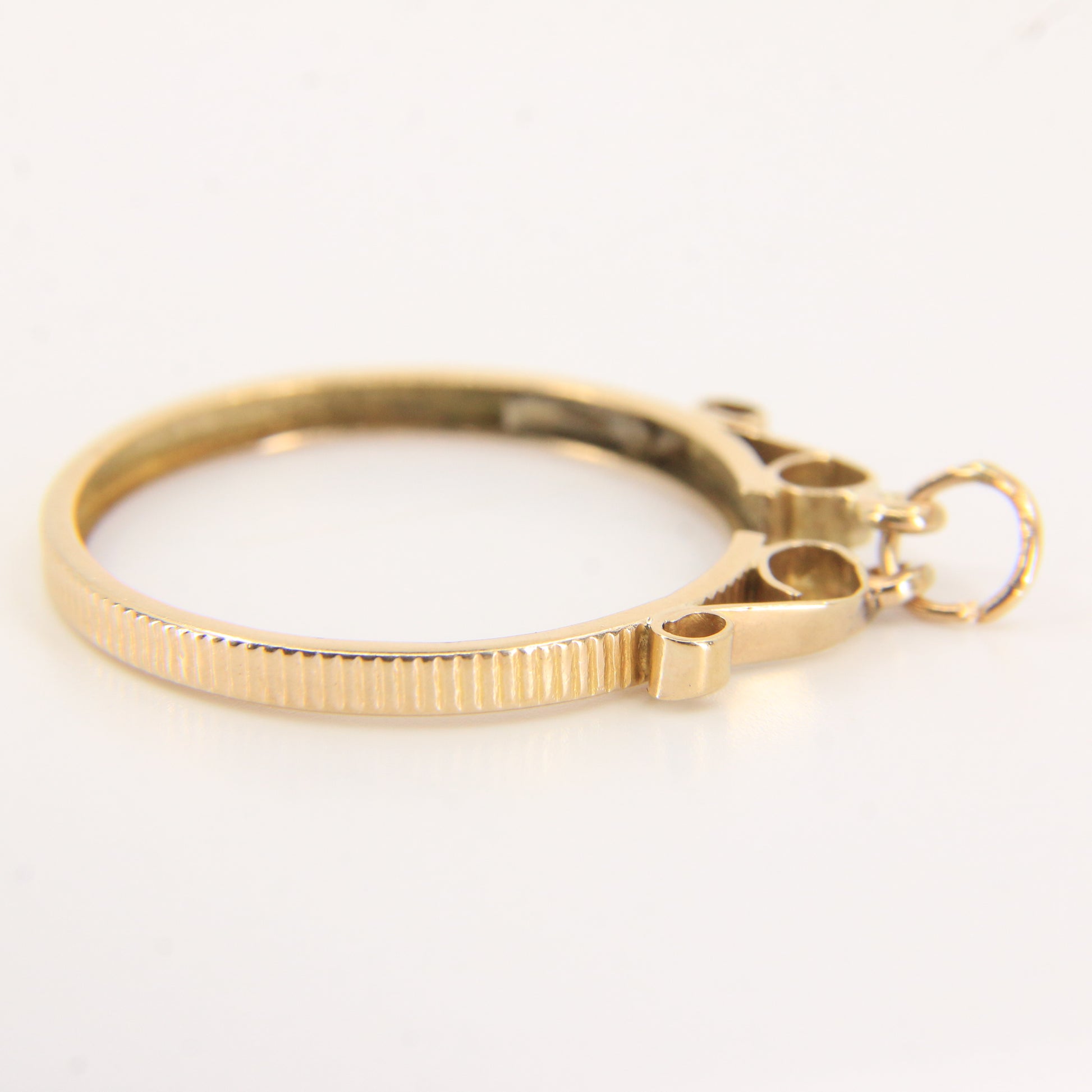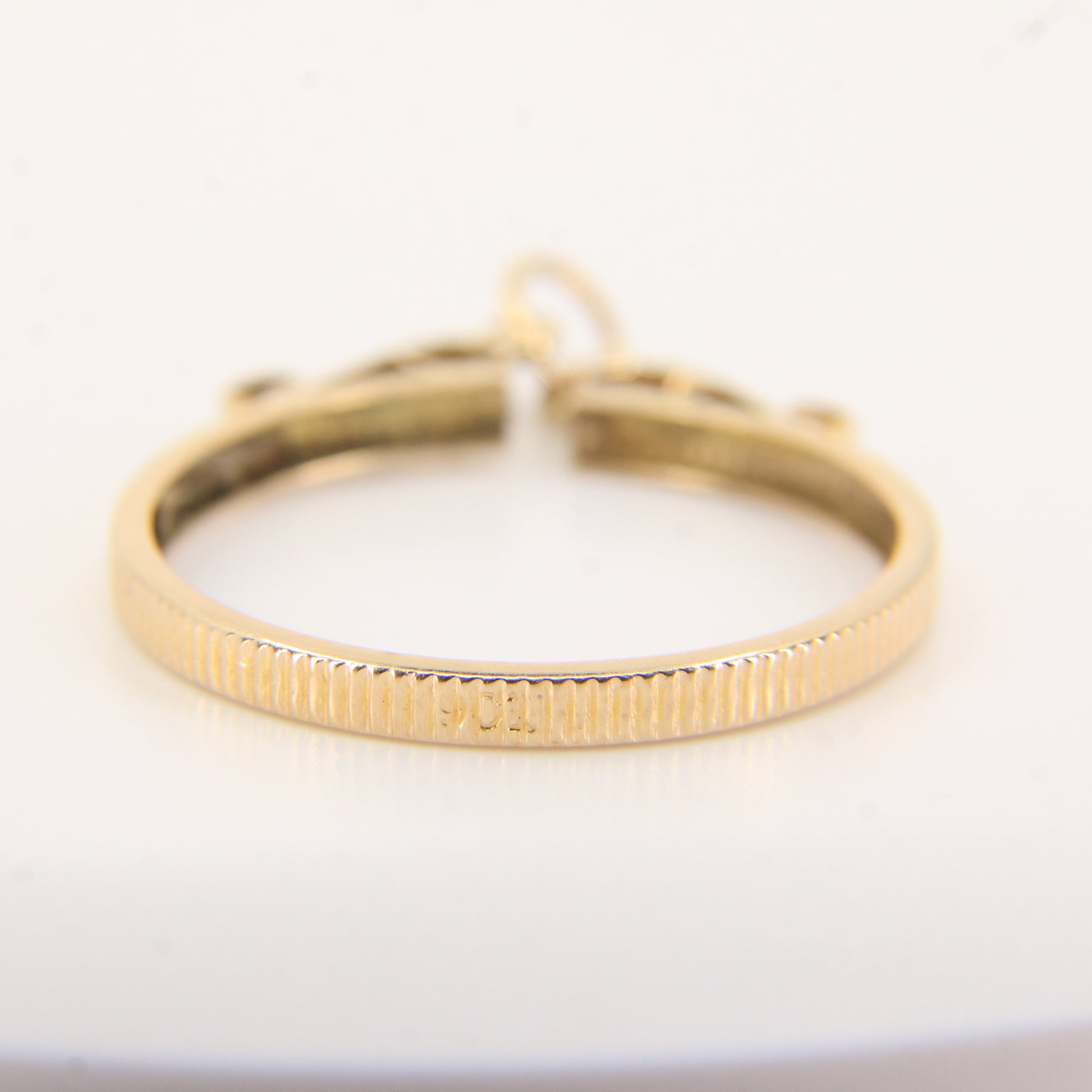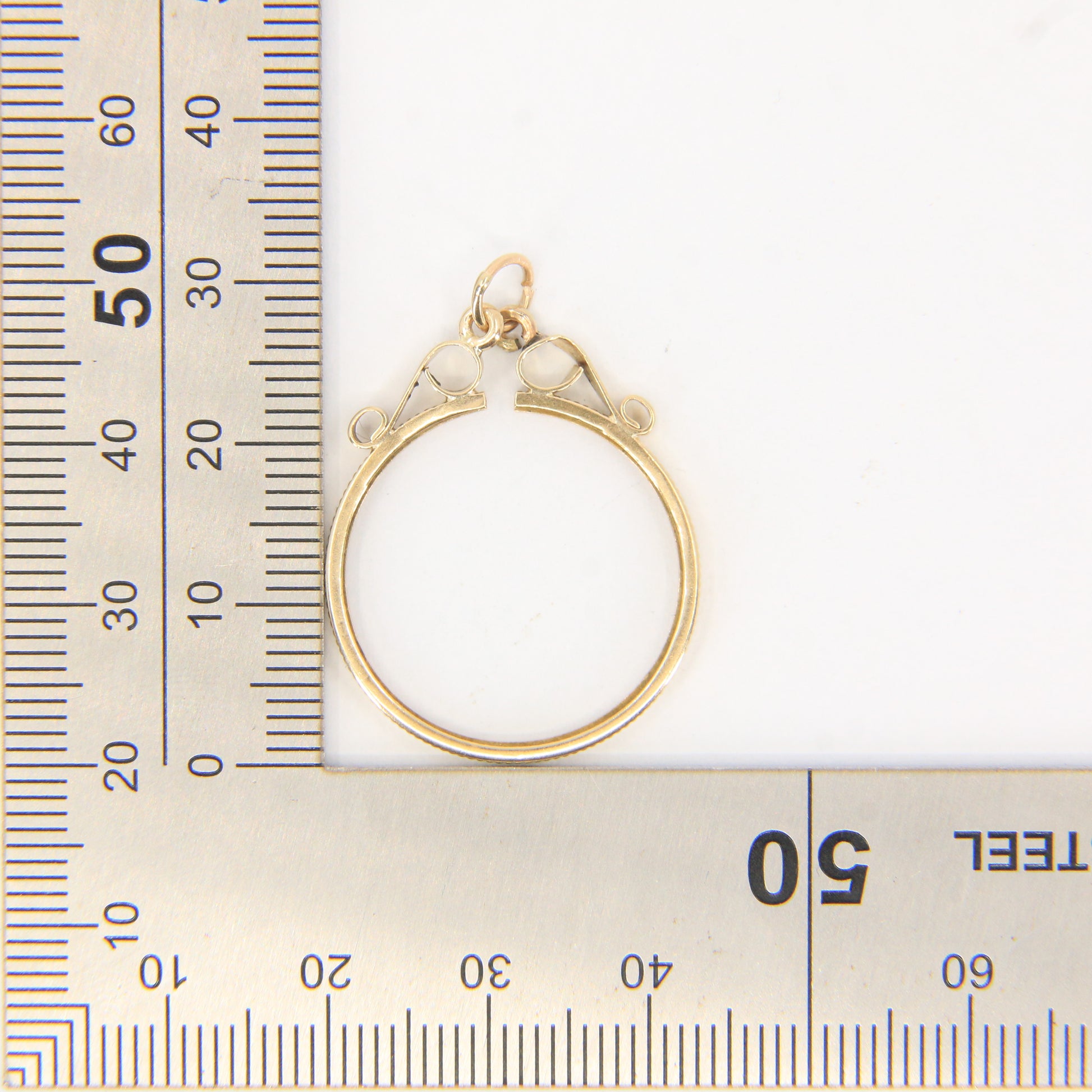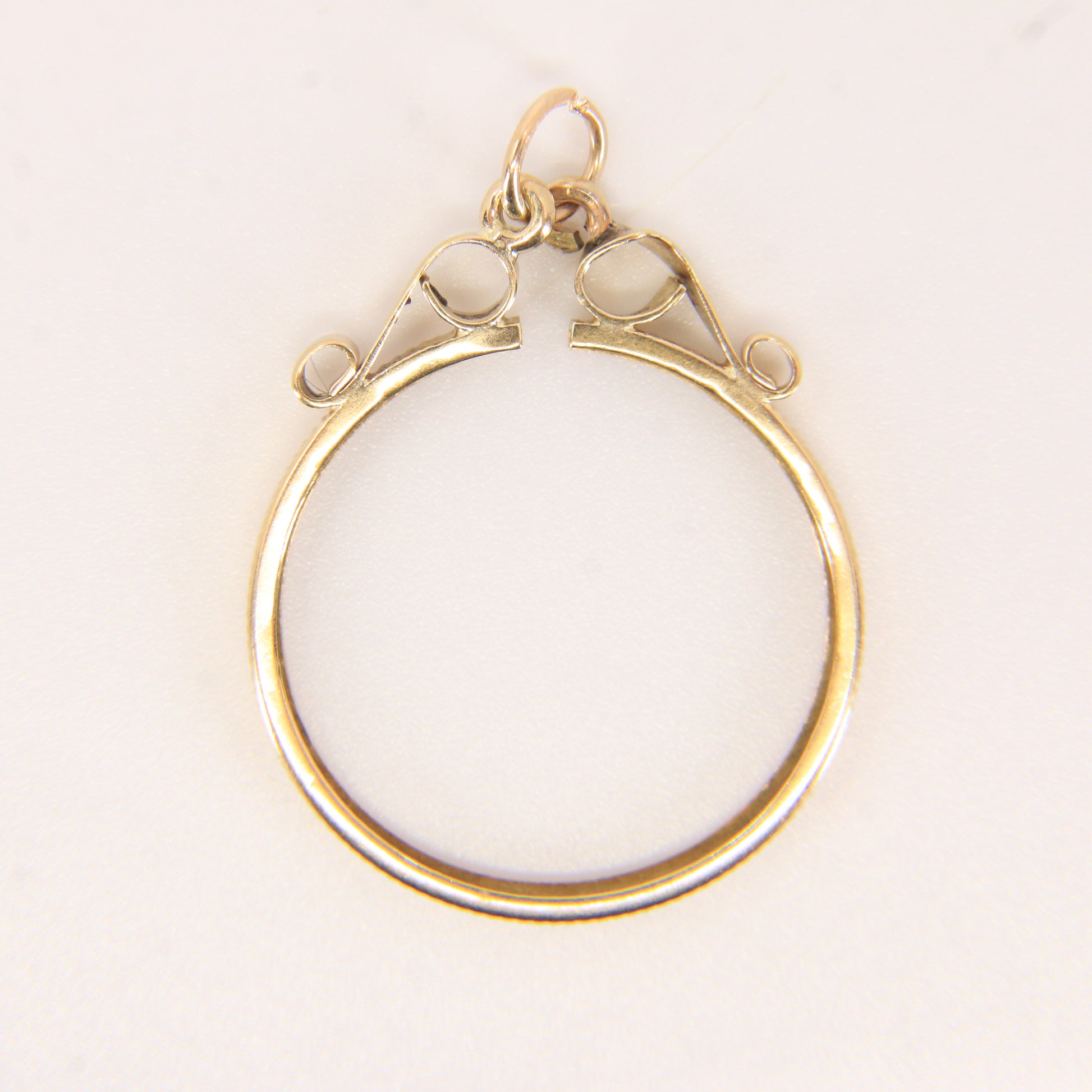 A classic vintage 9ct gold full sovereign coin frame pendant, designed to securely house a full sovereign coin. An ideal charm for collectors or investment wear—add this to your collection today.