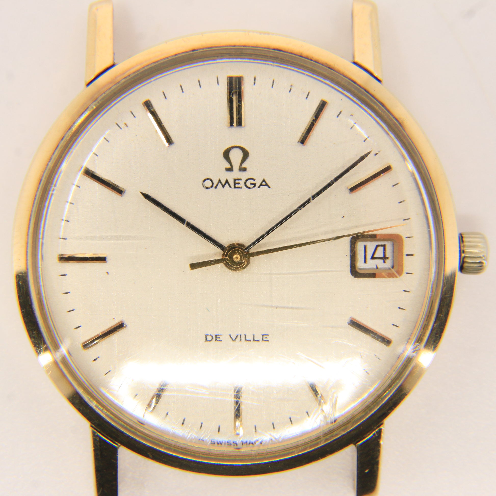 A classic vintage Omega De Ville wristwatch in a 9ct gold case, featuring a clean silvered dial with date aperture. The case back is engraved with original initials, and the watch will require a new strap, allowing the next owner to personalise the fit and style. Add this to your collection today.