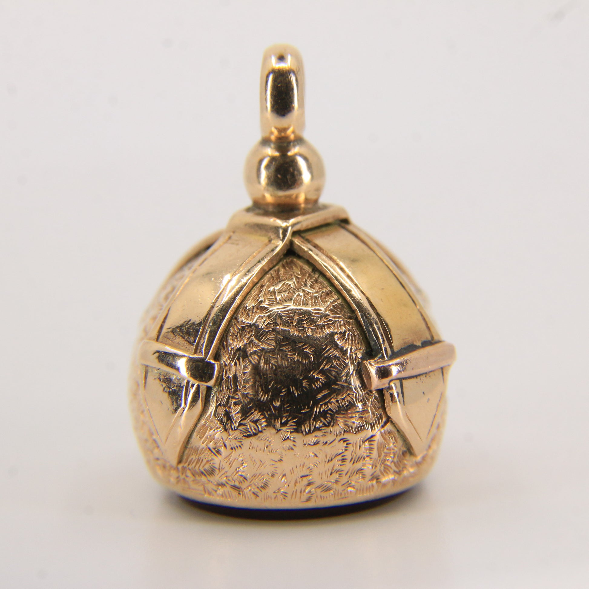 An elegant antique 9ct yellow gold fob pendant featuring a smooth carnelian base and ornate engraved detailing. A timeless Victorian-style charm that adds warmth and sophistication—perfect for a chain or Albert necklace.