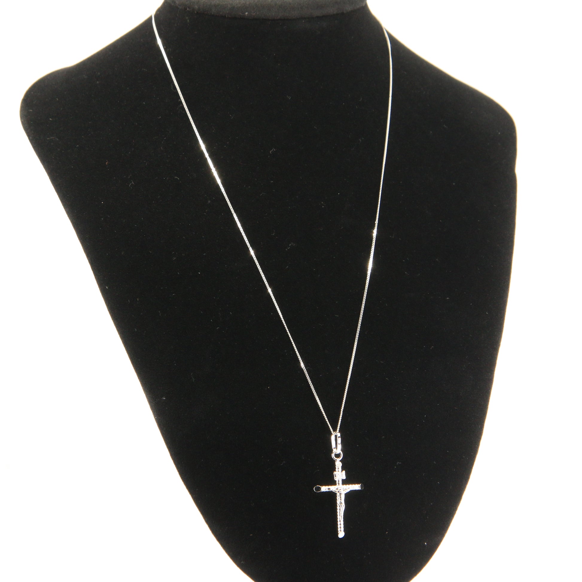 Vintage 9ct White Gold 18 Inch Curb Chain Crucifix INRI Cross Pendant Boxed Gift