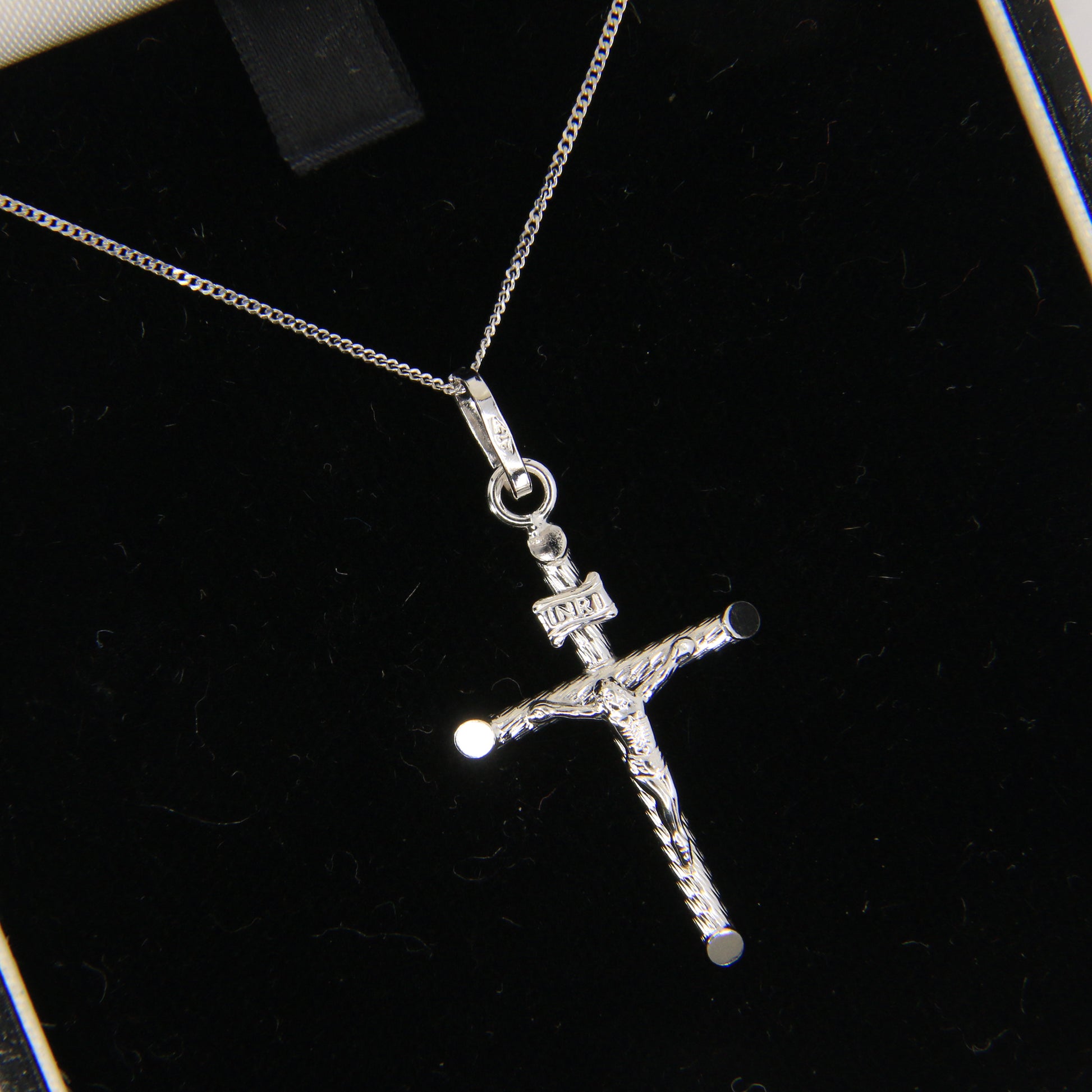A vintage 9ct white gold crucifix pendant with INRI detail, suspended from an 18 inch curb chain for a classic and balanced look. The crucifix is a long-standing symbol of faith, devotion, and protection, making this a meaningful piece to wear or gift—add it to your collection today.