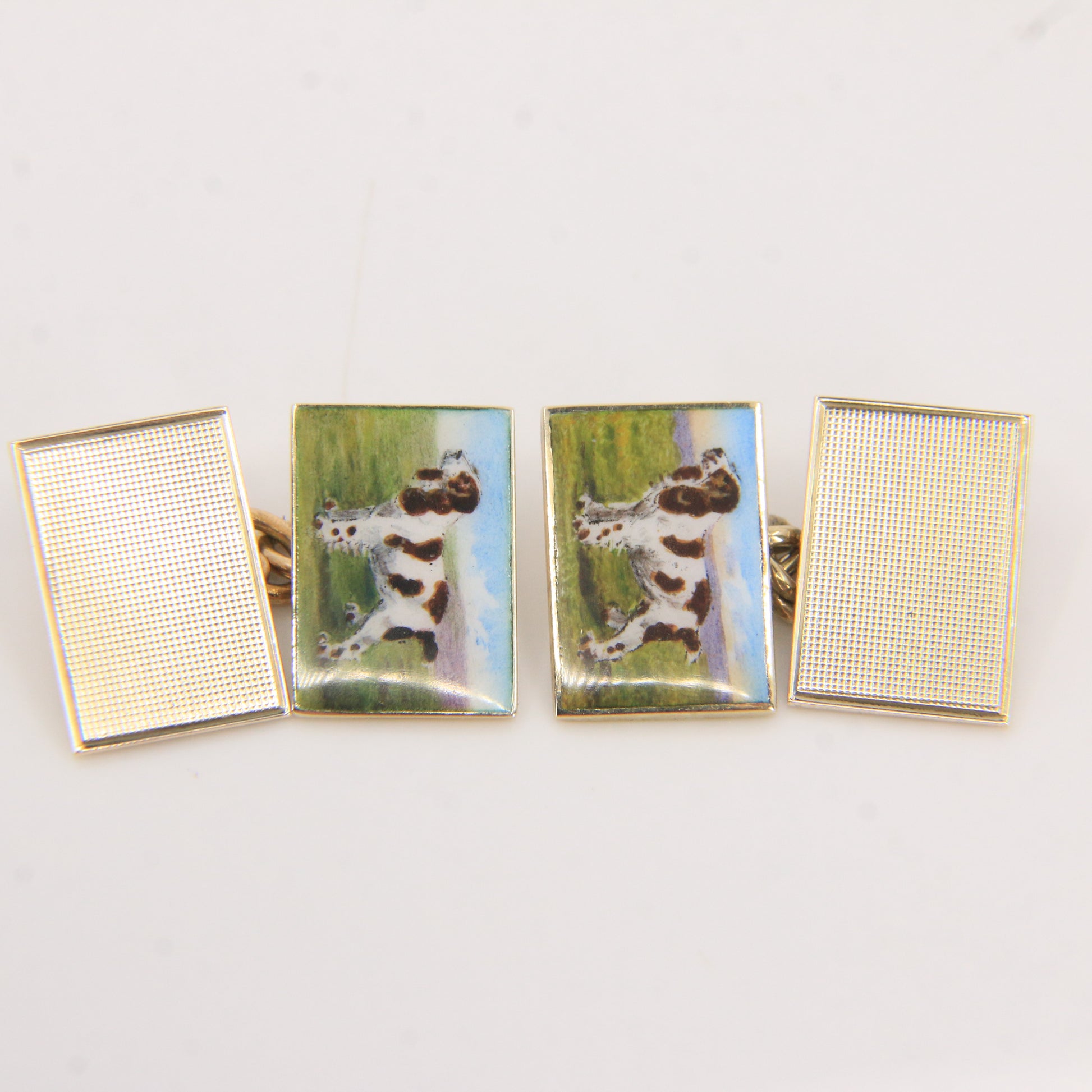 Charming antique 9ct gold cufflinks featuring enamelled spaniel dog detail alongside engine turned decoration, hallmarked for 1935 and presented in a fitted Cairncross Perth box. A distinctive and collectible piece with strong character and period appeal. Add this to your collection today.