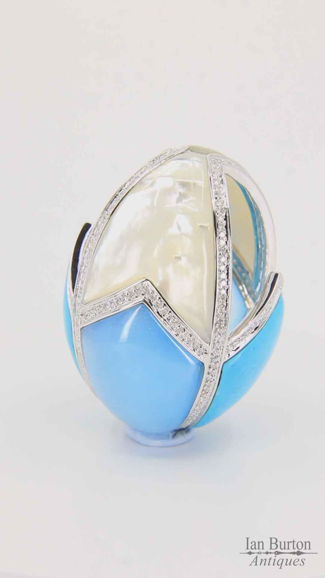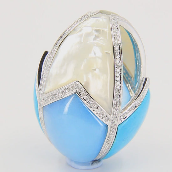 A striking vintage contemporary 18ct white gold egg pendant set with turquoise, mother-of-pearl panels and approximately 1.95ct of diamonds. A bold, luxurious designer statement piece with exceptional craftsmanship and a large showpiece presence.