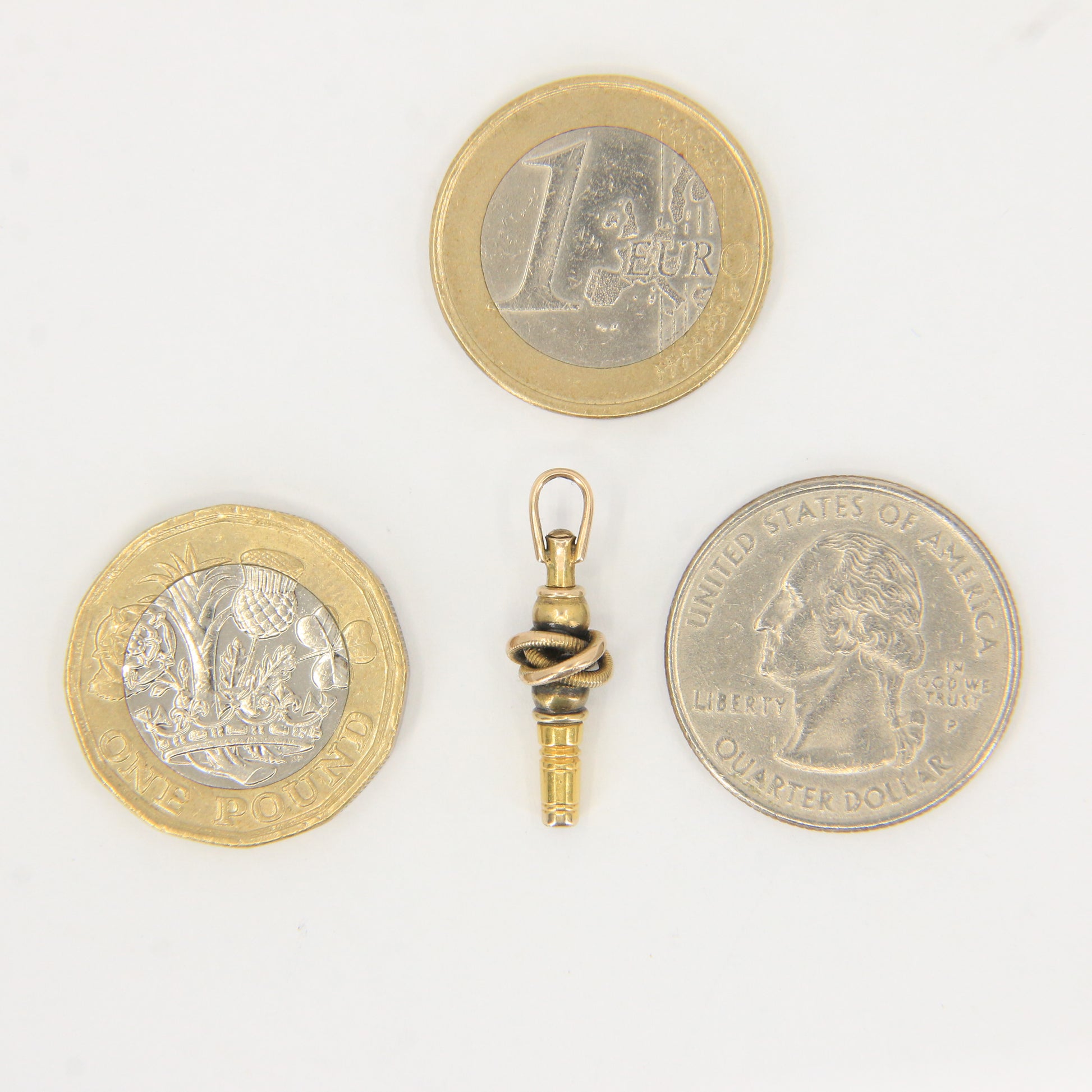 A rare antique watch key crafted in 14ct and 9ct gold with a square end fitting. Designed with an ornate knot detail, it makes a fine collector’s piece or pendant. Add this unique historic treasure to your collection today.