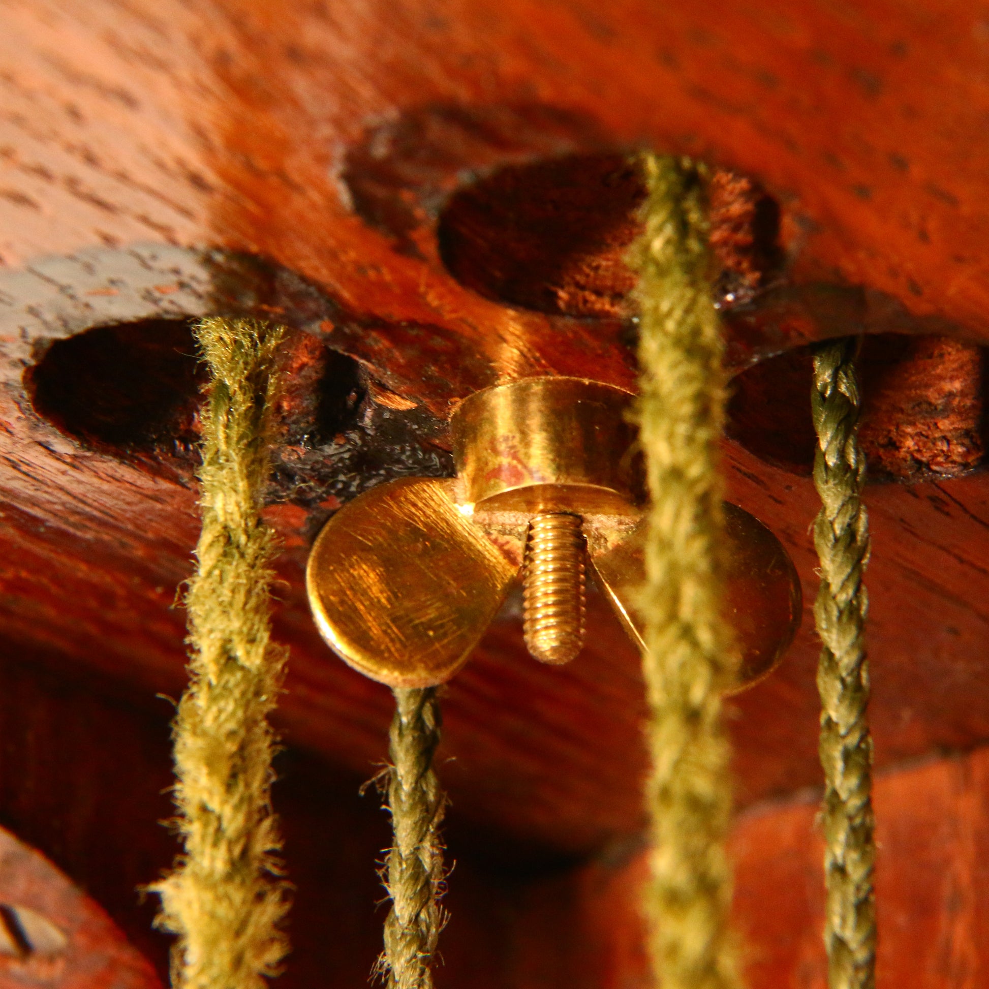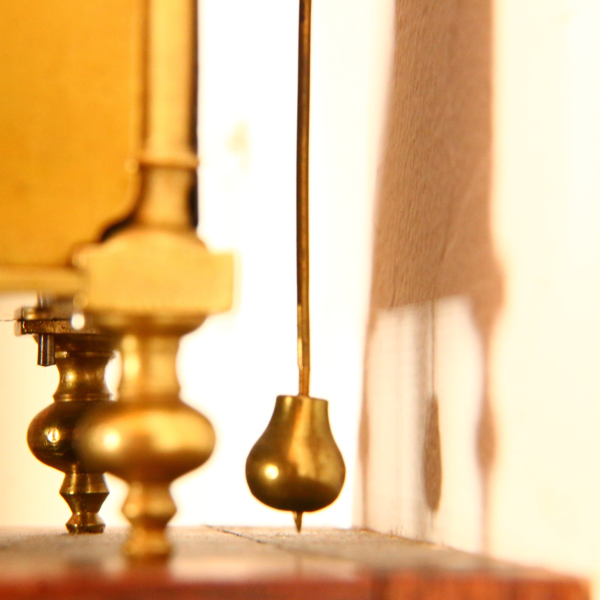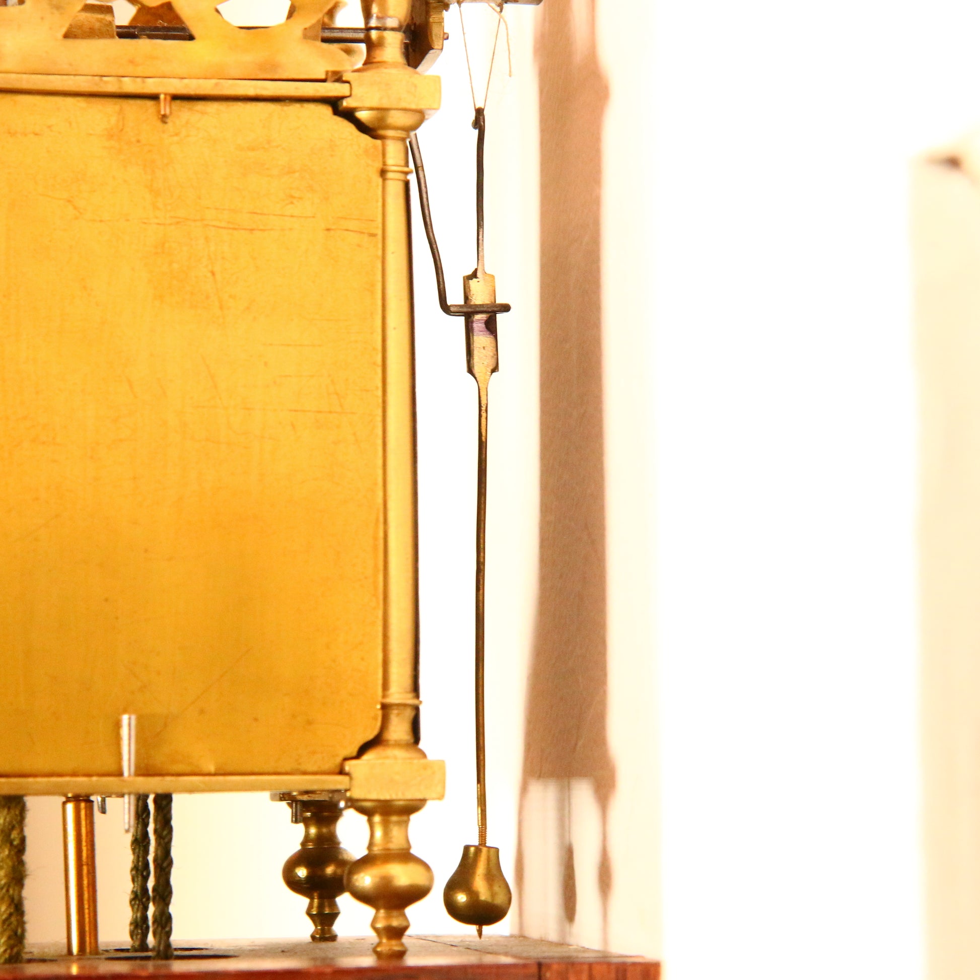 30 Hour movement with verge escapement, silk suspended pendulum and alarm.