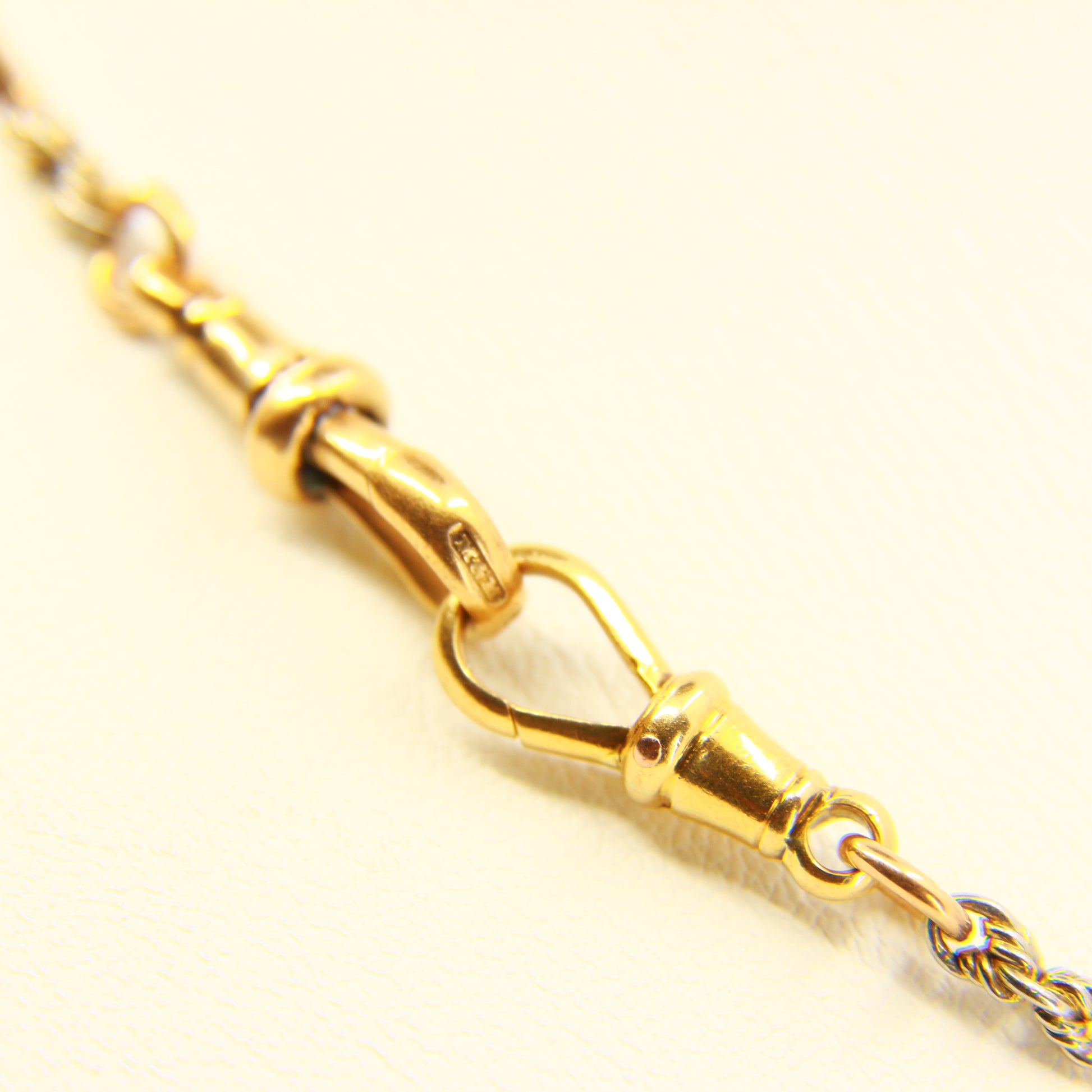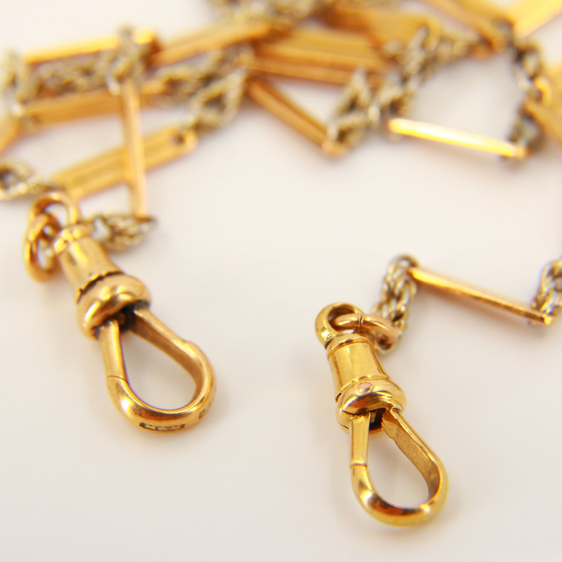 This chain has been fitted with an 18ct watch clip at each end, both clips work well. The chain is just long enough to be also used as a necklace. The beautiful dual white and yellow gold design is from the Edwardian era.