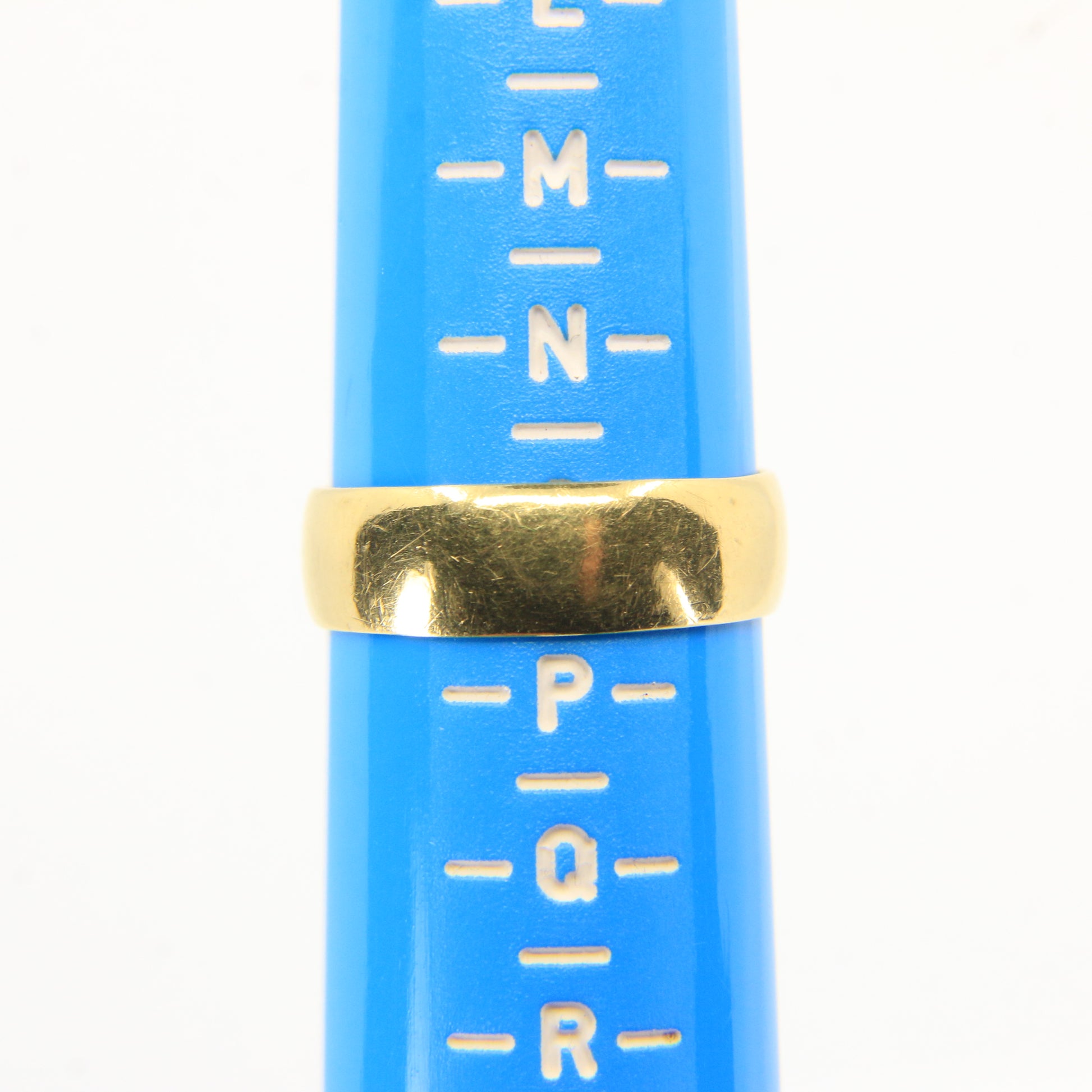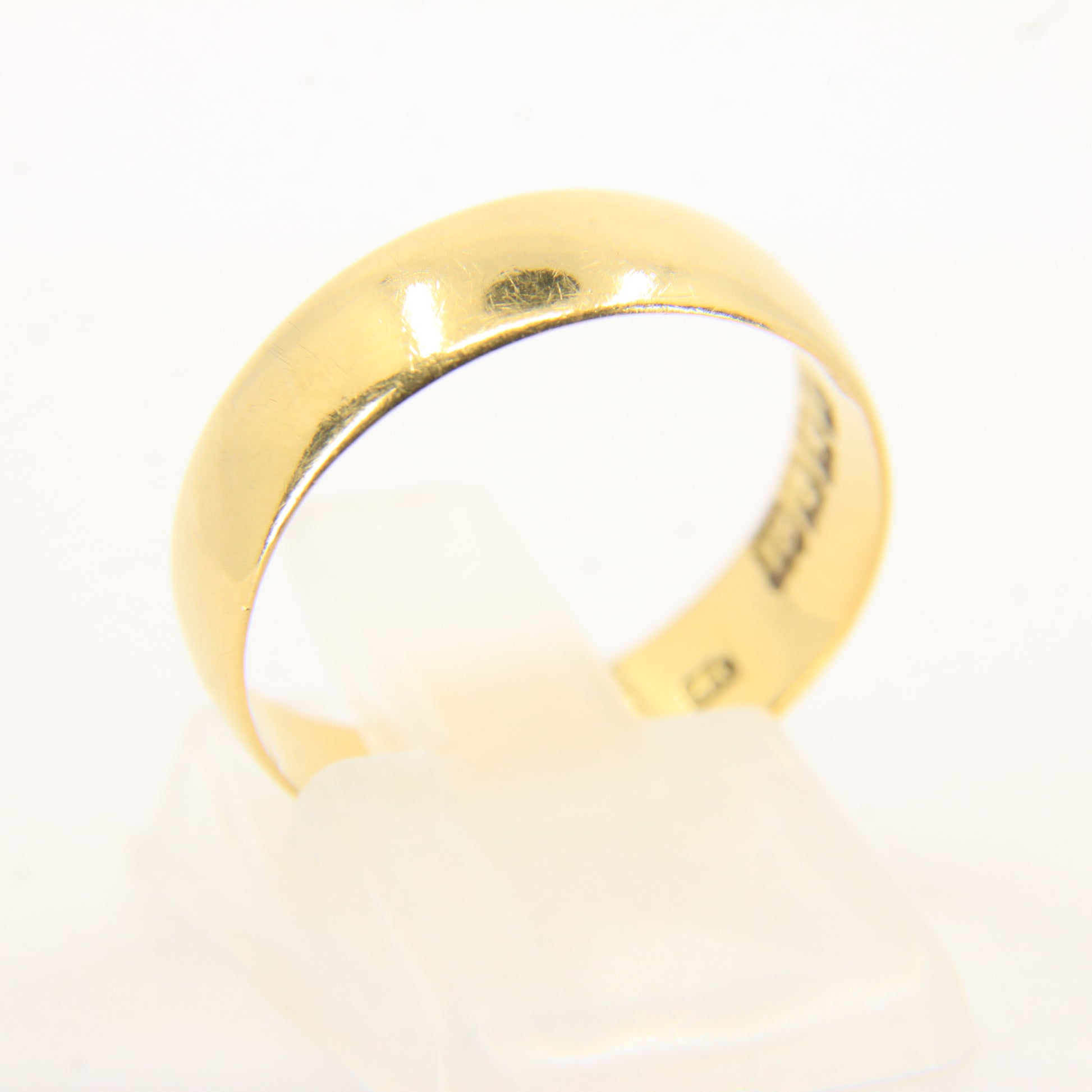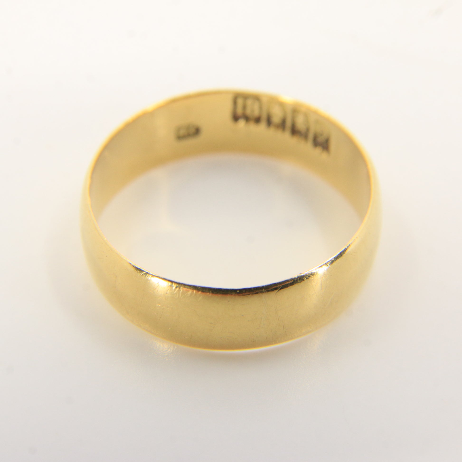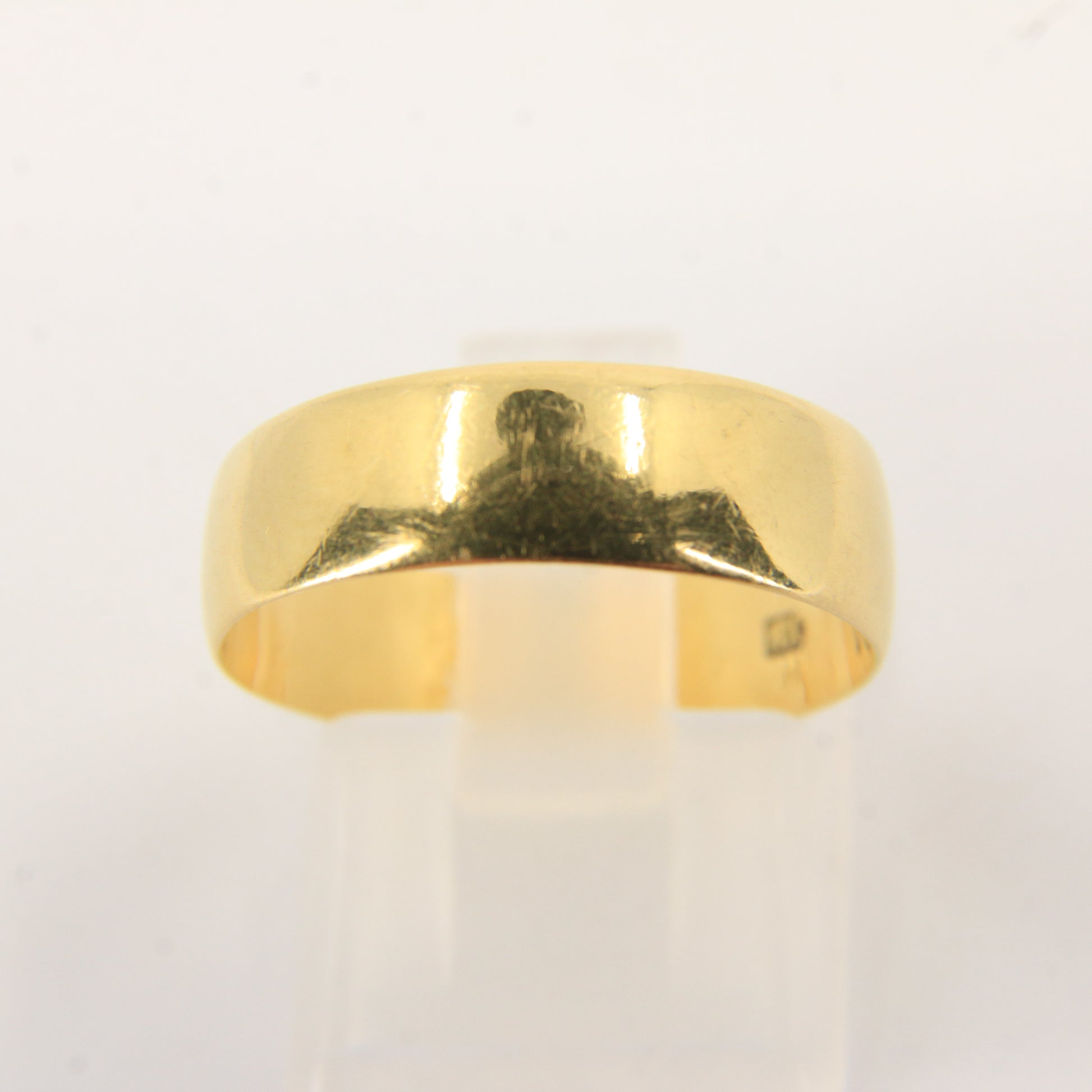 A classic antique 18ct yellow gold wedding band with clear Glasgow assay hallmarks, UK size O½. Solid and elegant paired with a Glasgow antique ring box—add this timeless ring to your collection today.