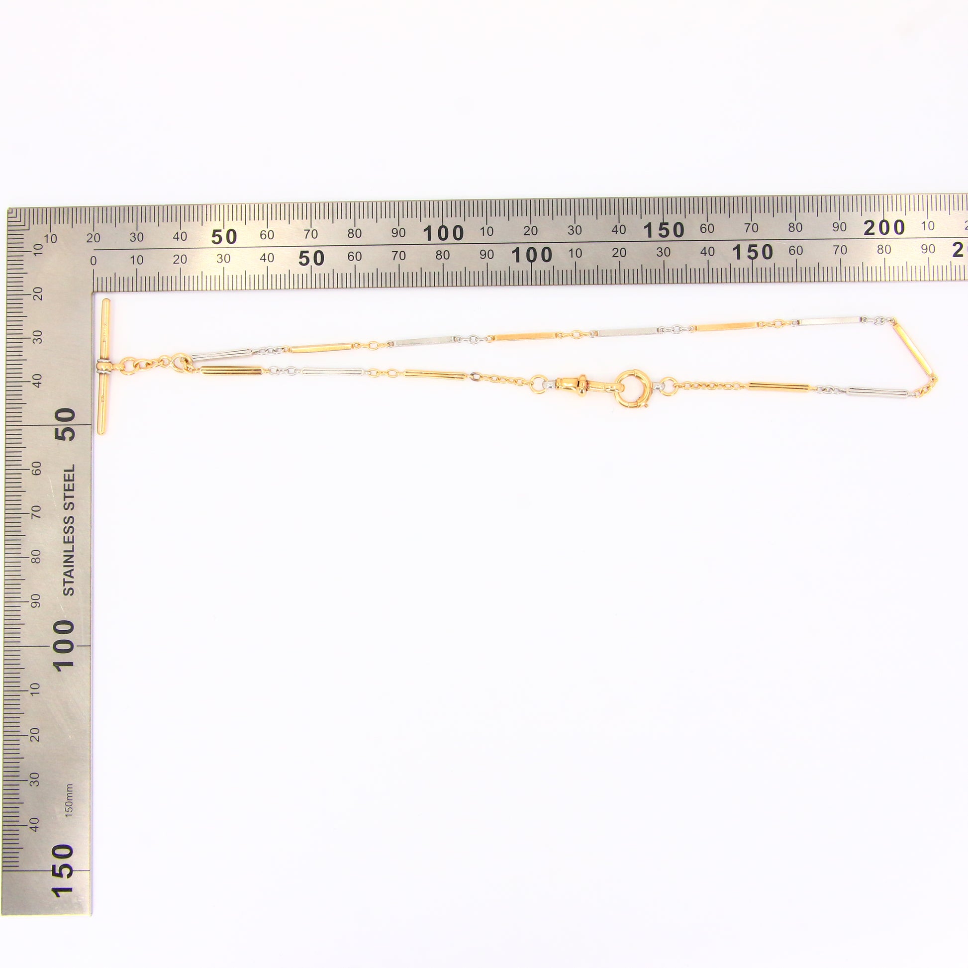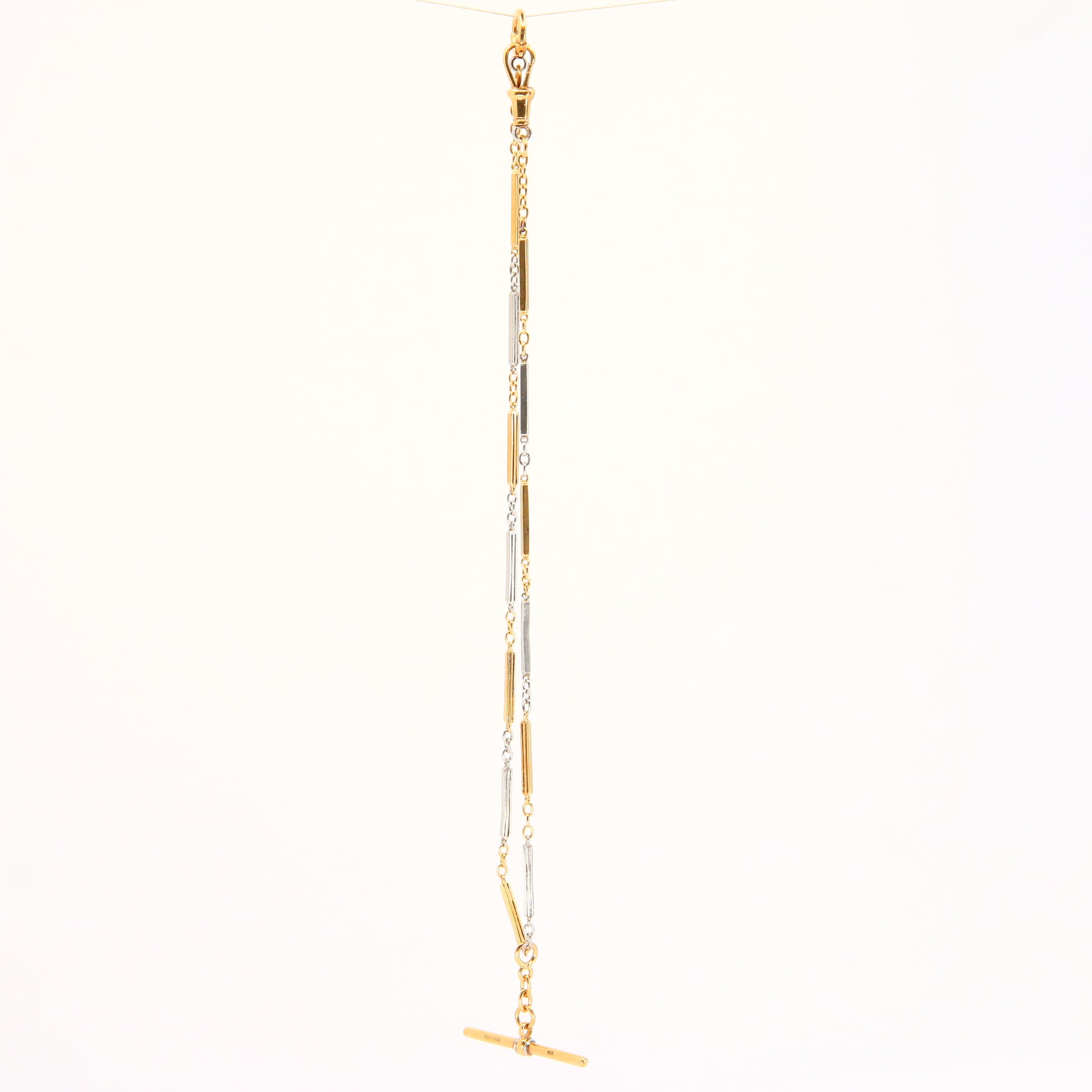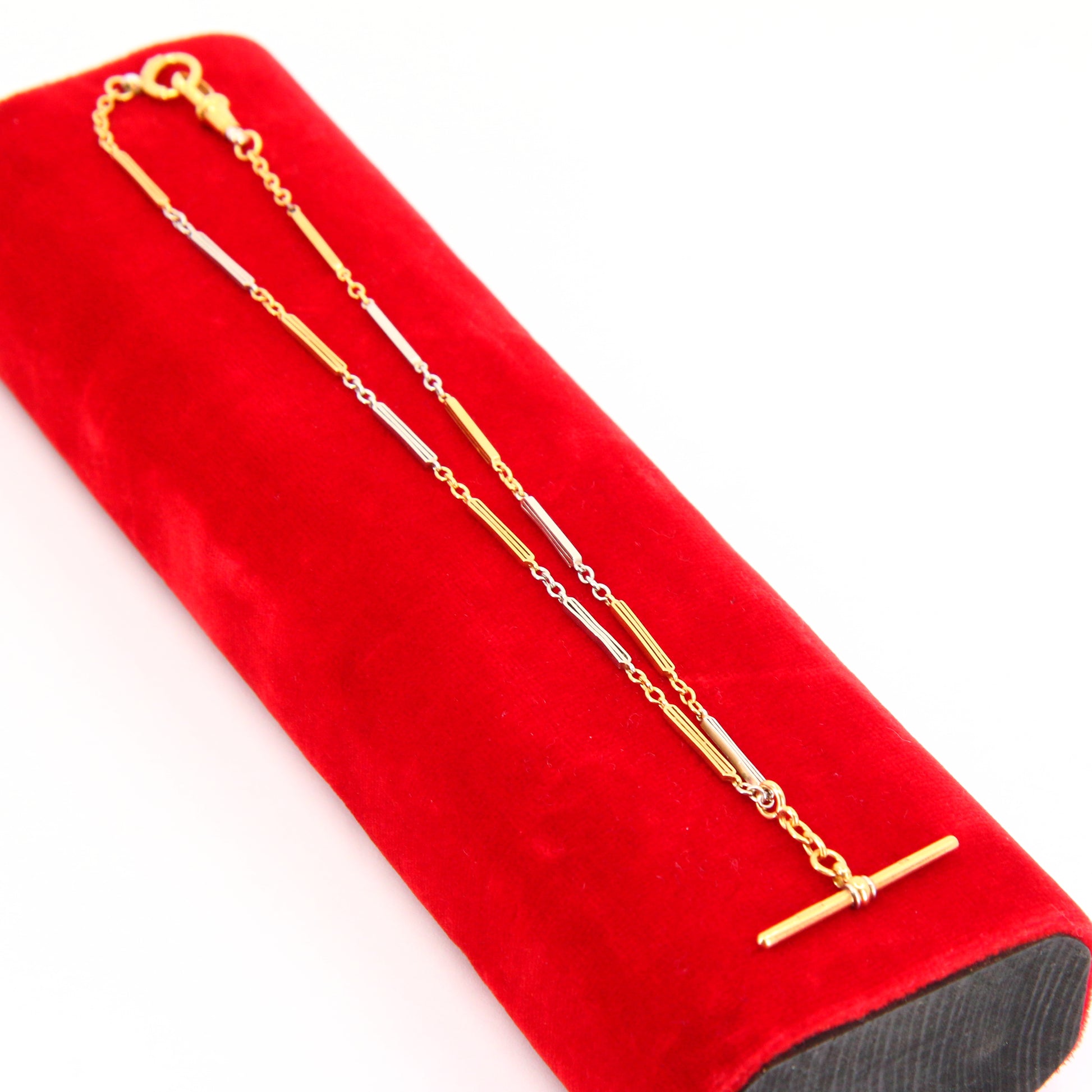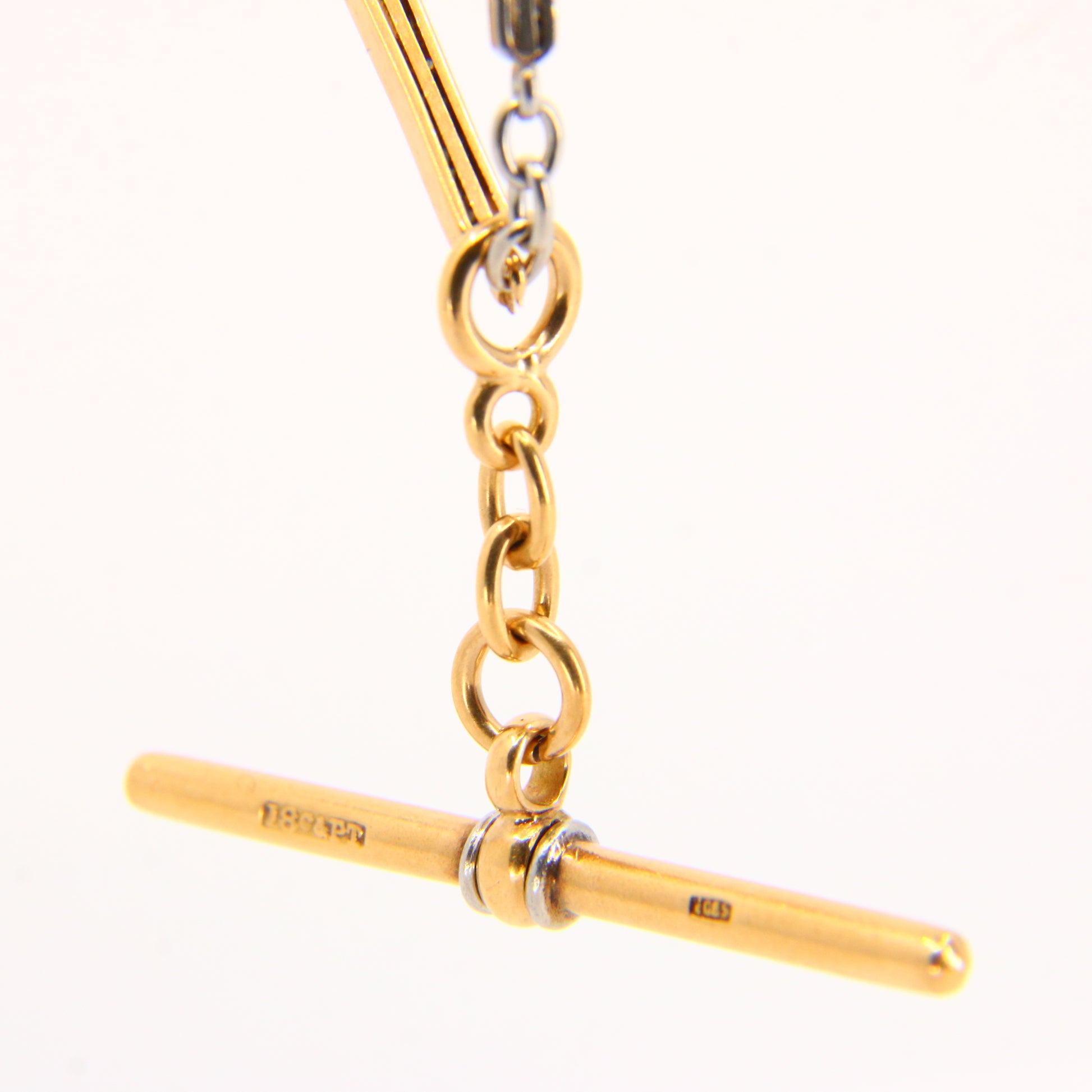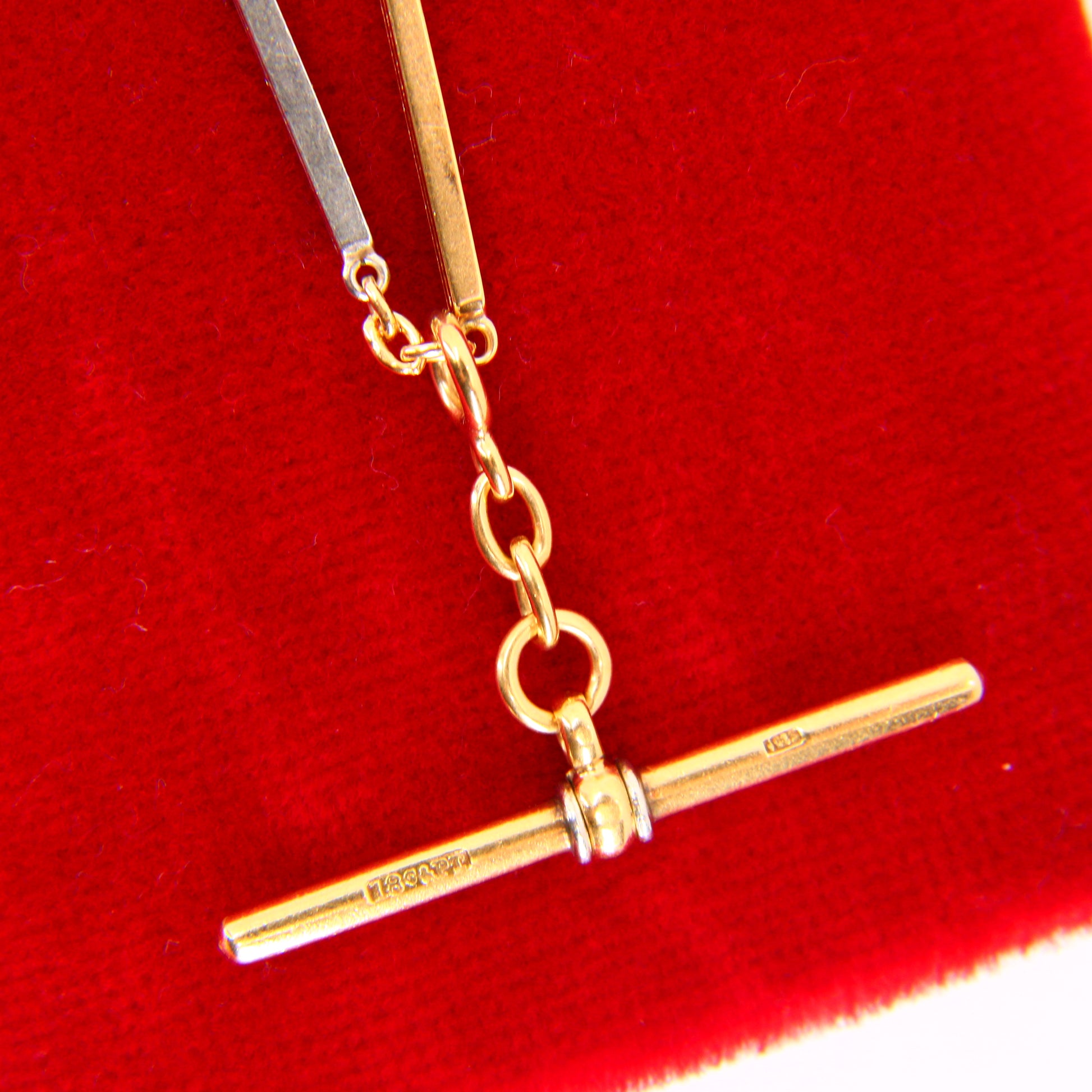 A beautiful 14 inch sliding T bar watch guard chain in yellow gold 18ct and platinum. The T bar is hallmarked with makers marks. A perfect gift or addition to any collection.