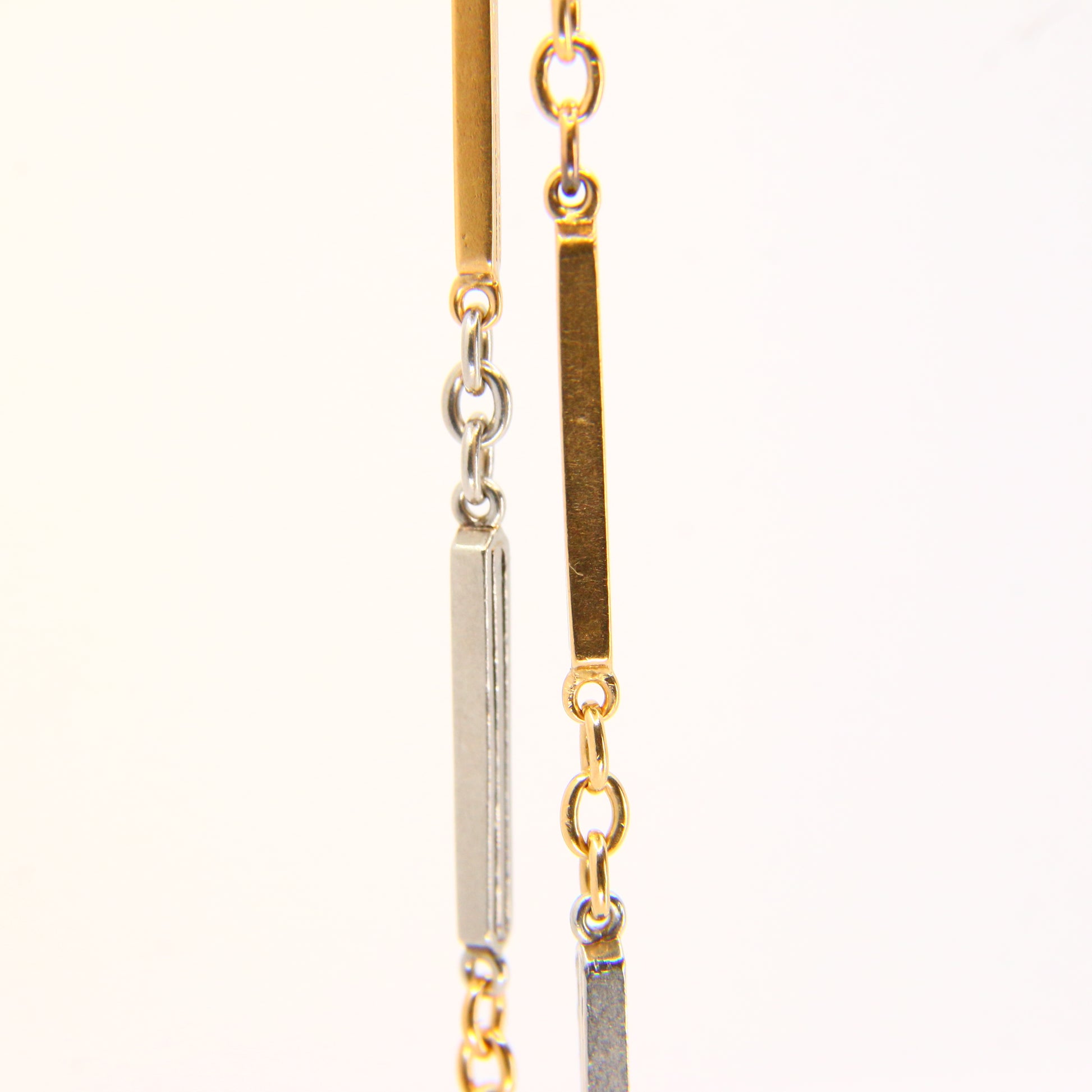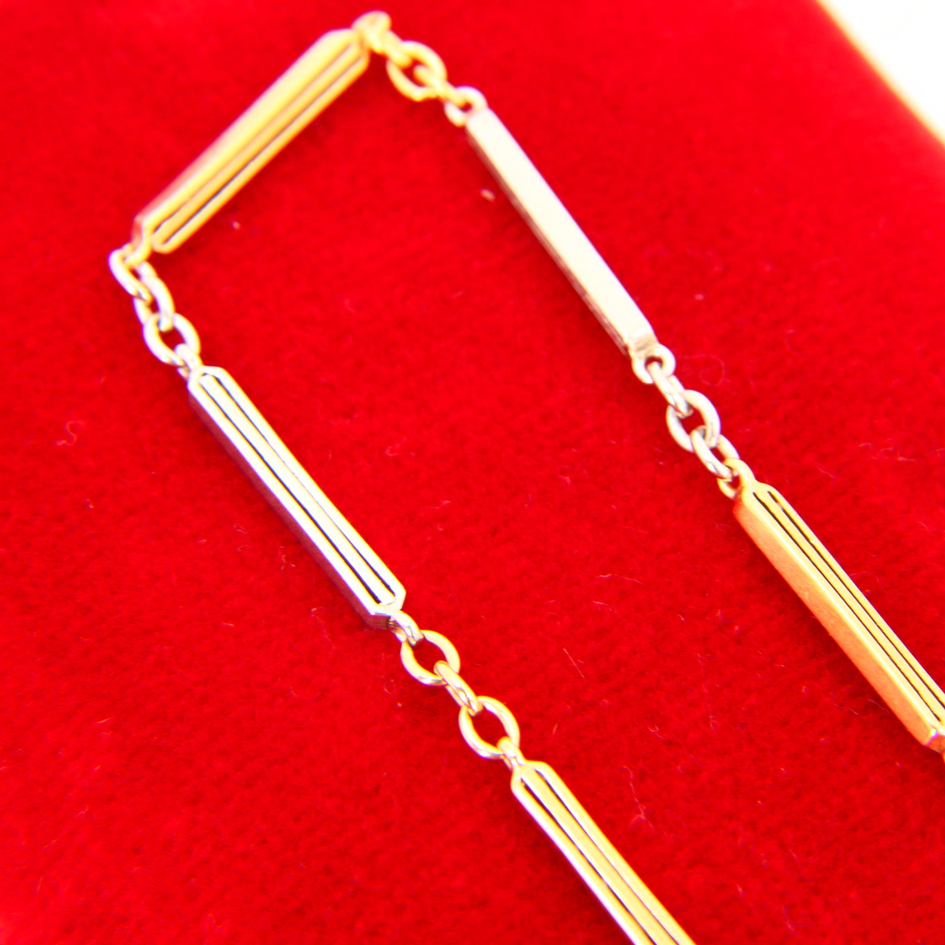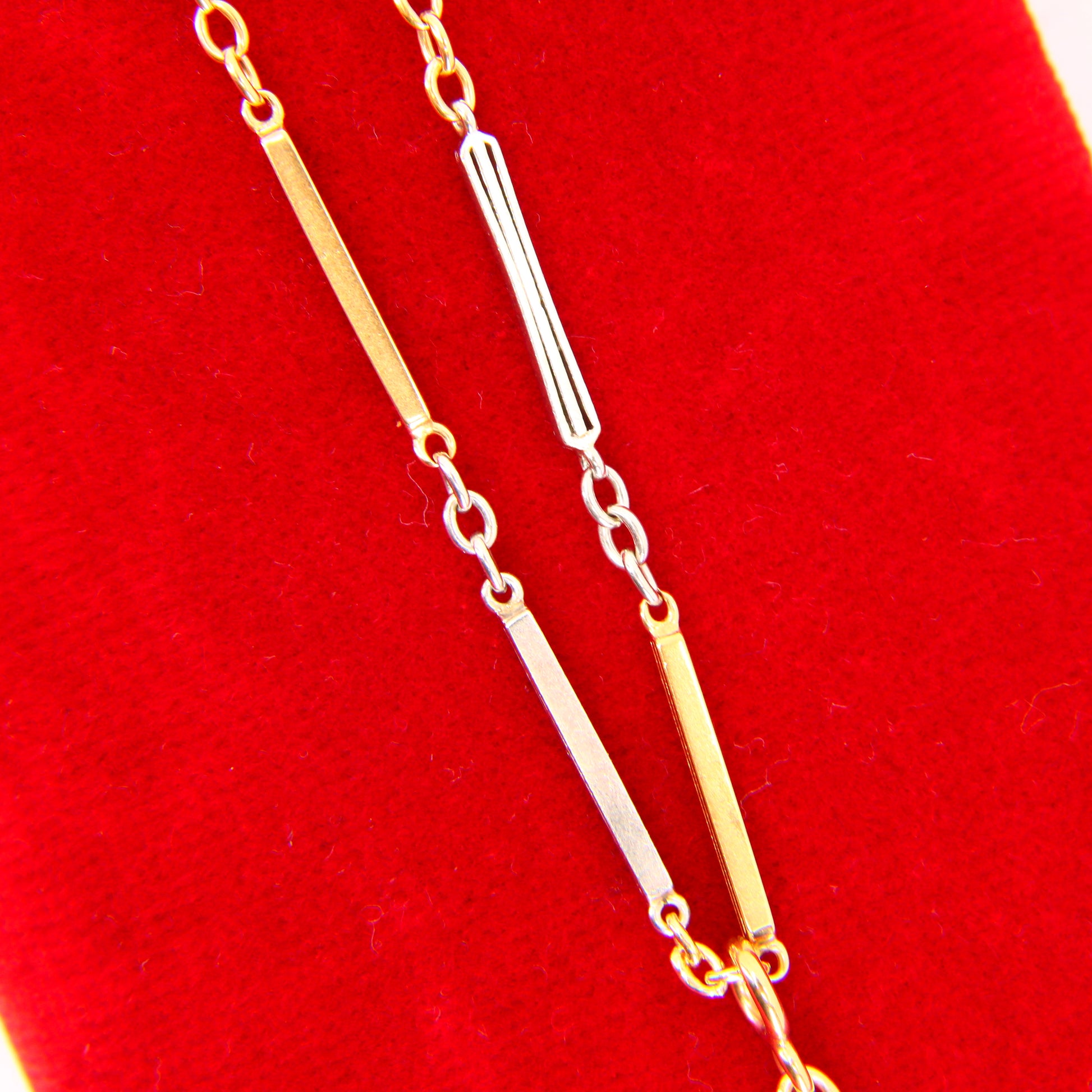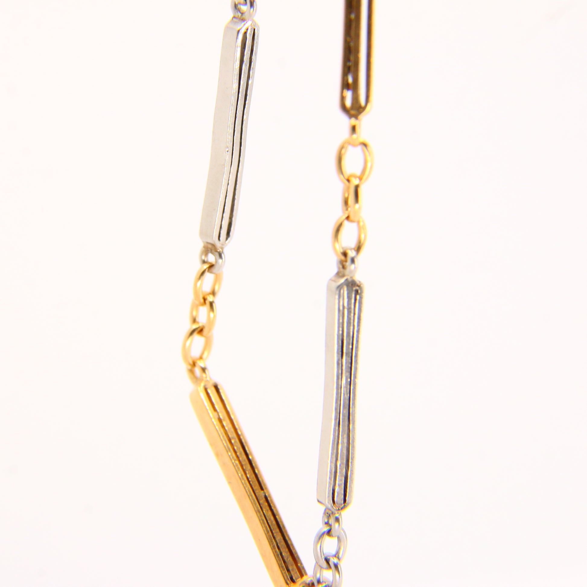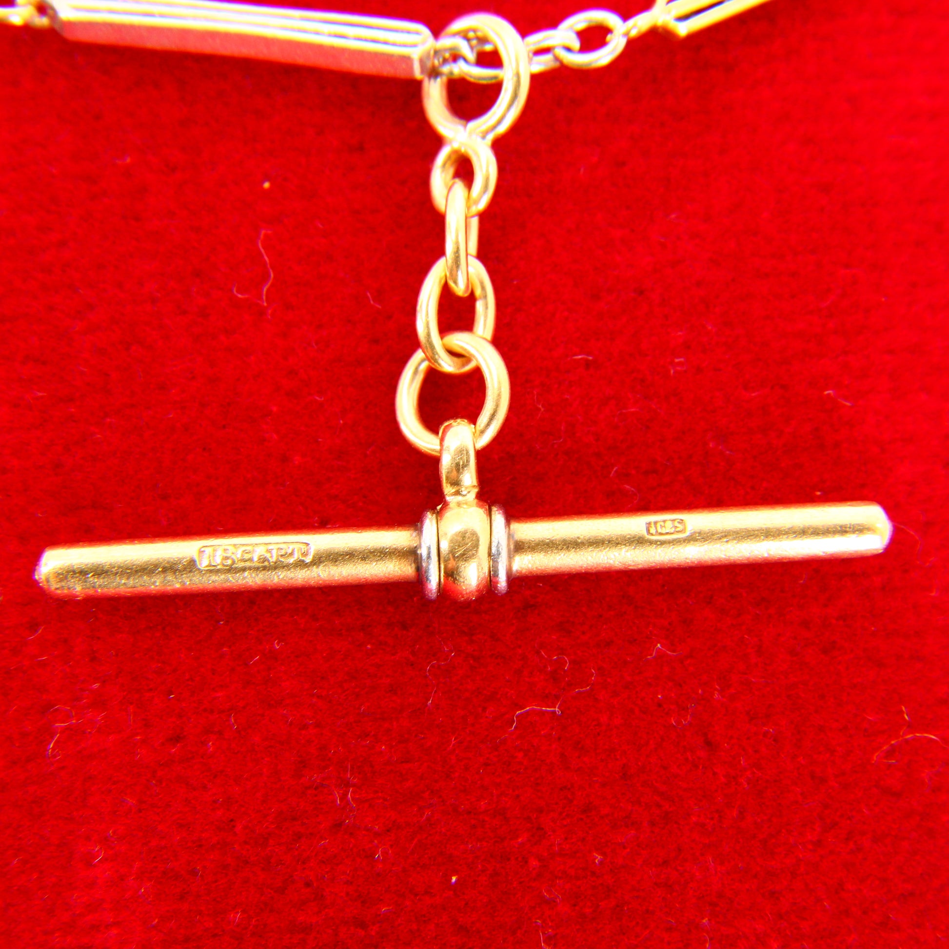 A beautiful 14 inch sliding T bar watch guard chain in yellow gold 18ct and platinum. The T bar is hallmarked with makers marks. A perfect gift or addition to any collection.