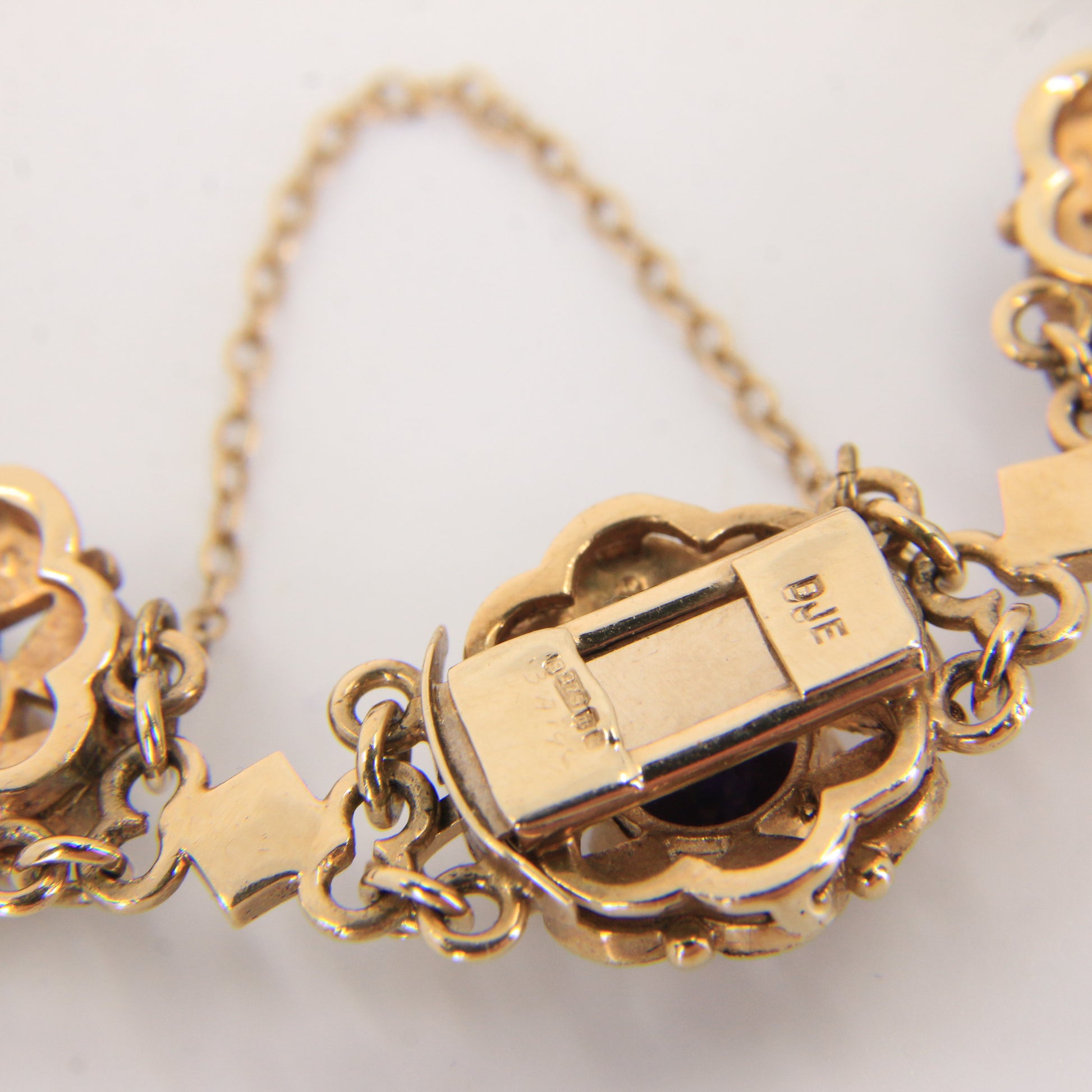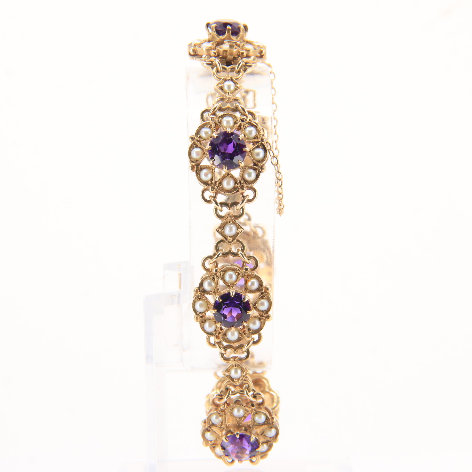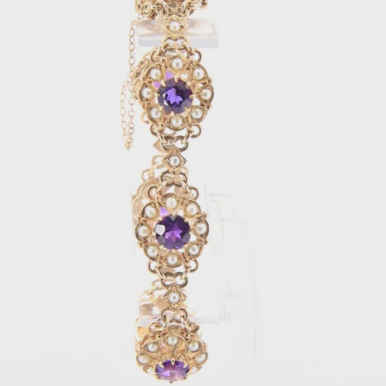 An antique 9ct yellow gold hallmarked Scottish bracelet set with amethysts and seed pearls in ornate openwork panels. A fine example of craftsmanship — add this elegant hallmarked bracelet to your collection today.