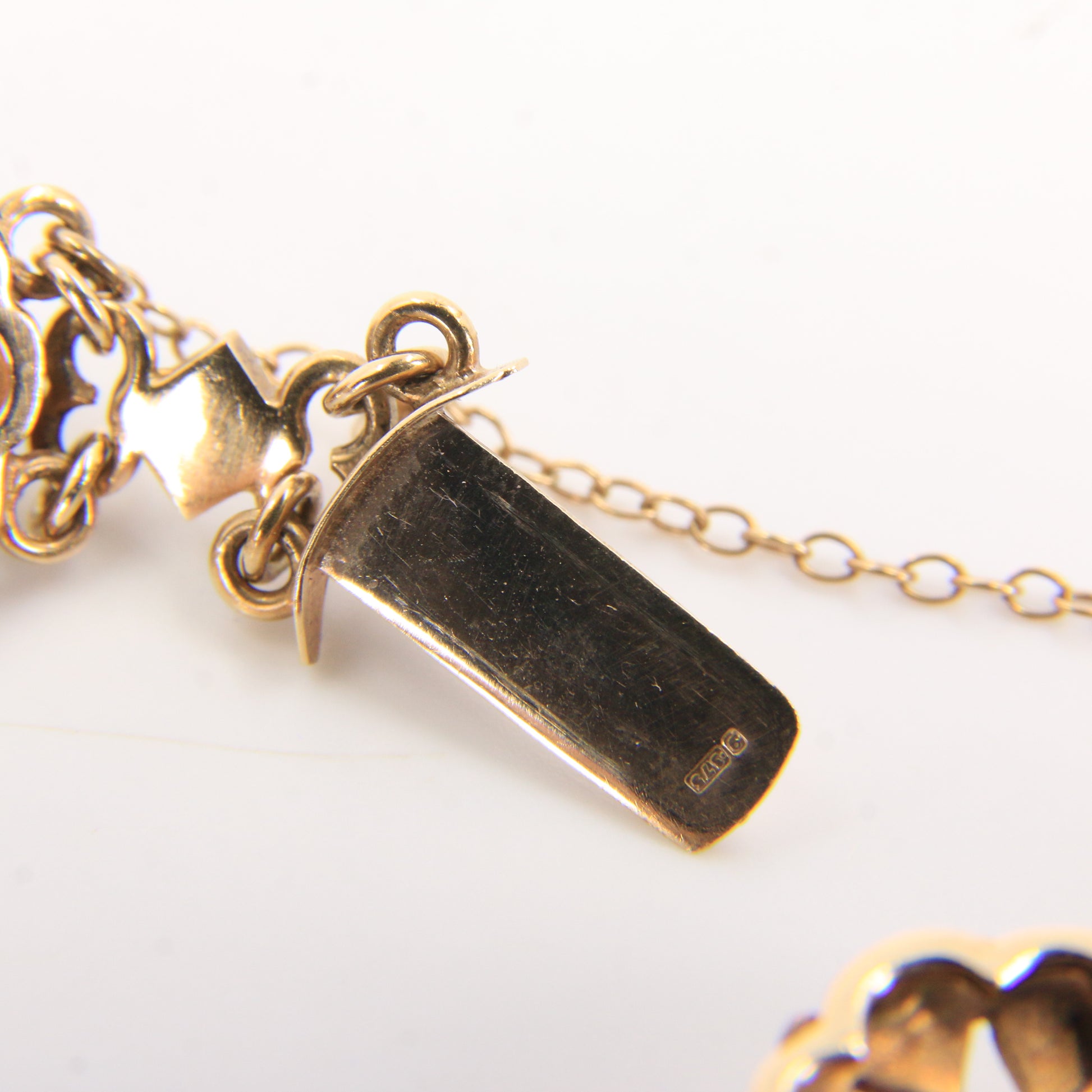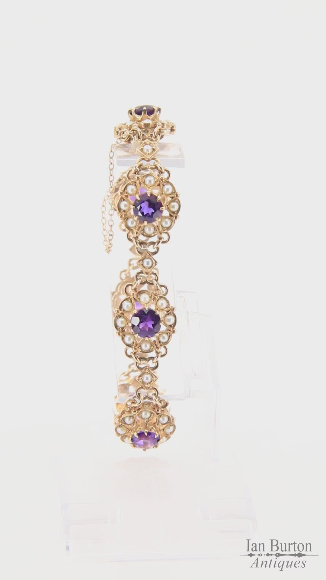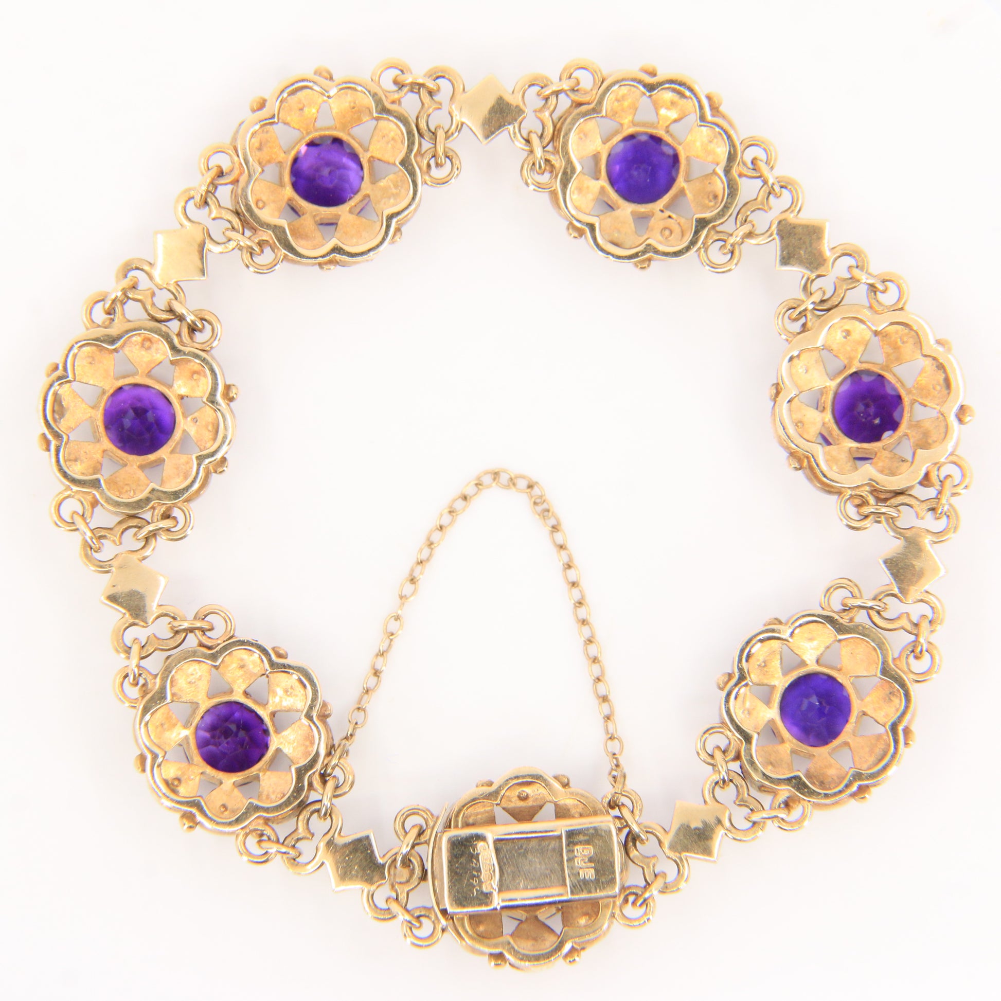 An antique 9ct yellow gold hallmarked Scottish bracelet set with amethysts and seed pearls in ornate openwork panels. A fine example of craftsmanship — add this elegant hallmarked bracelet to your collection today.