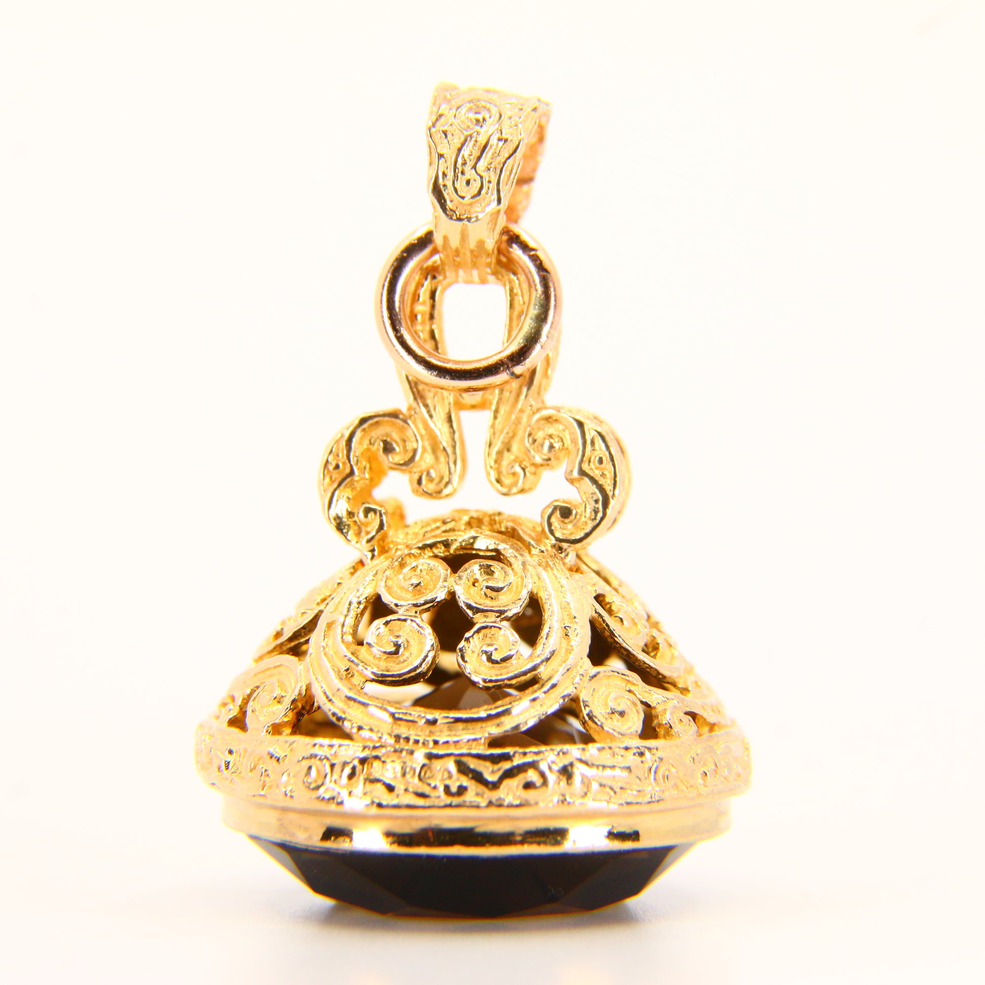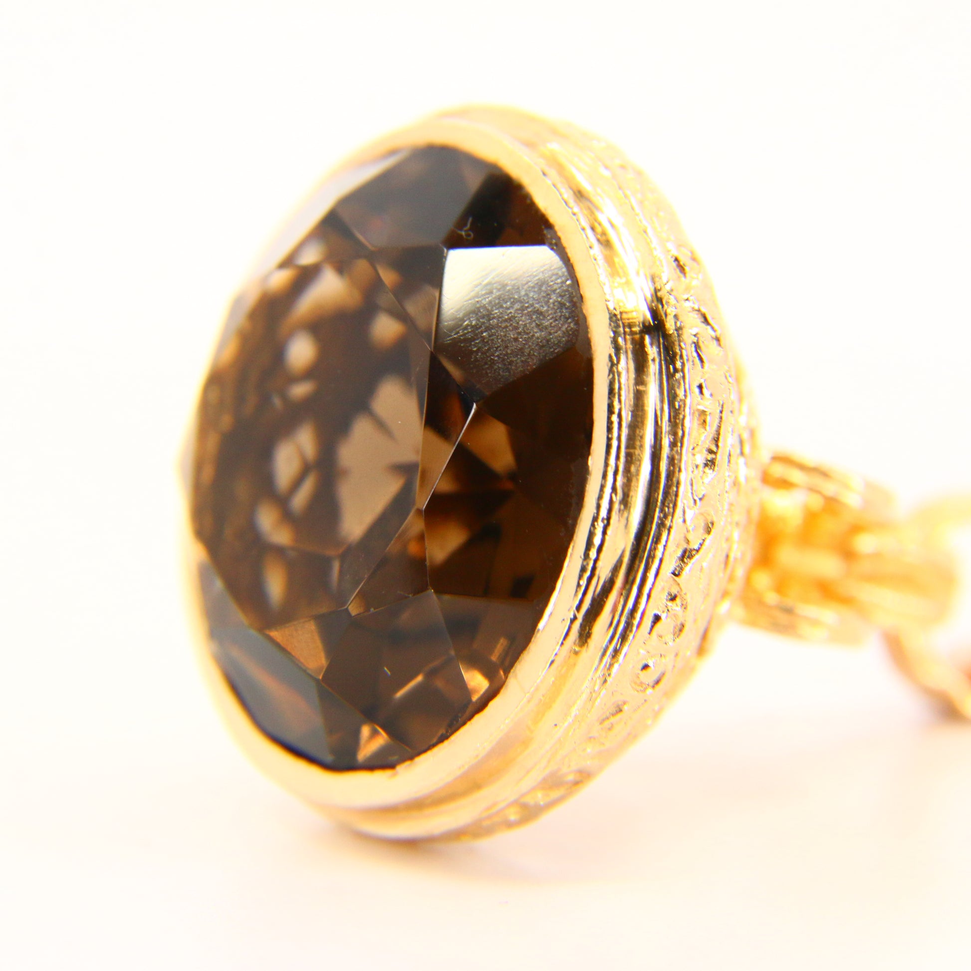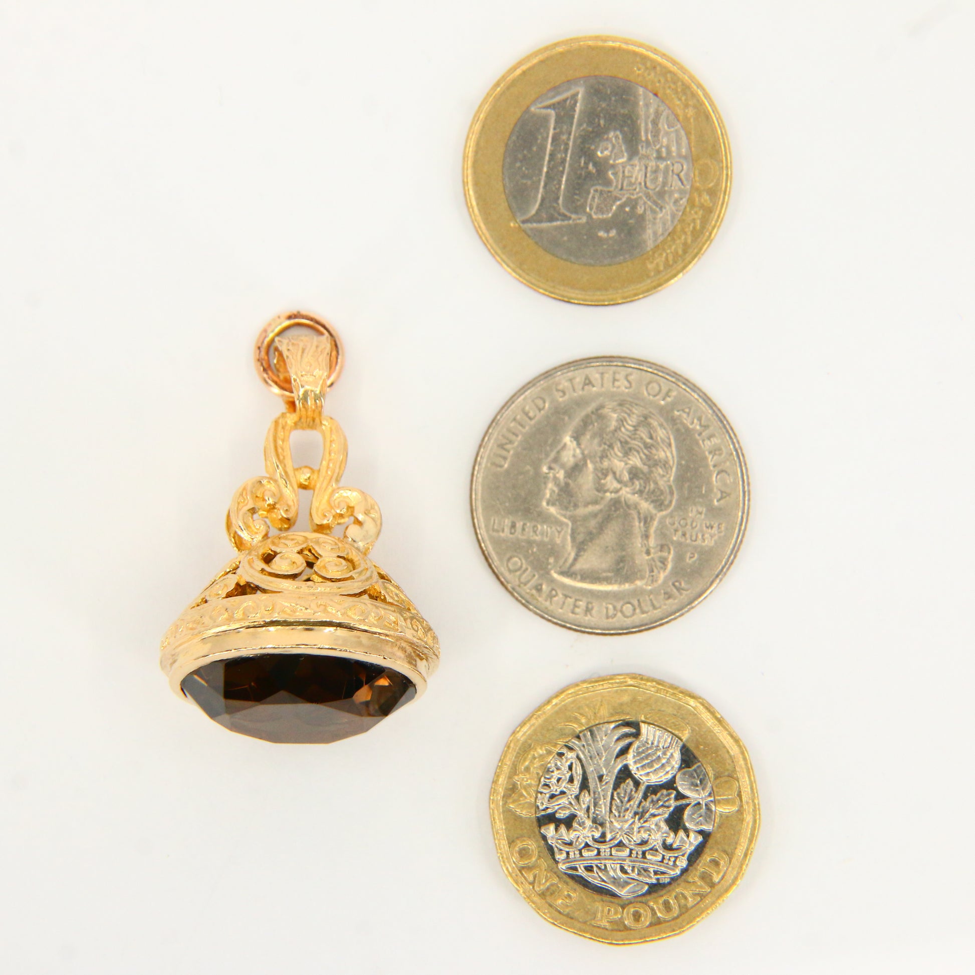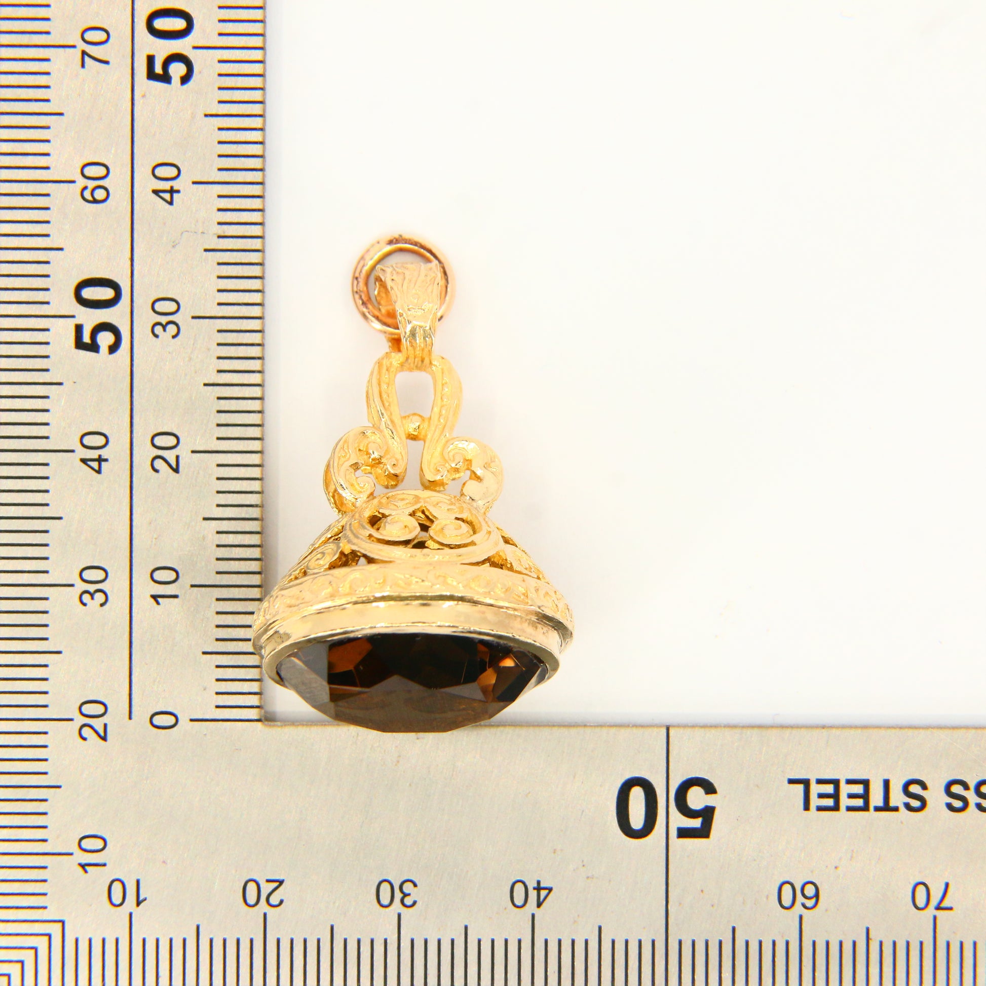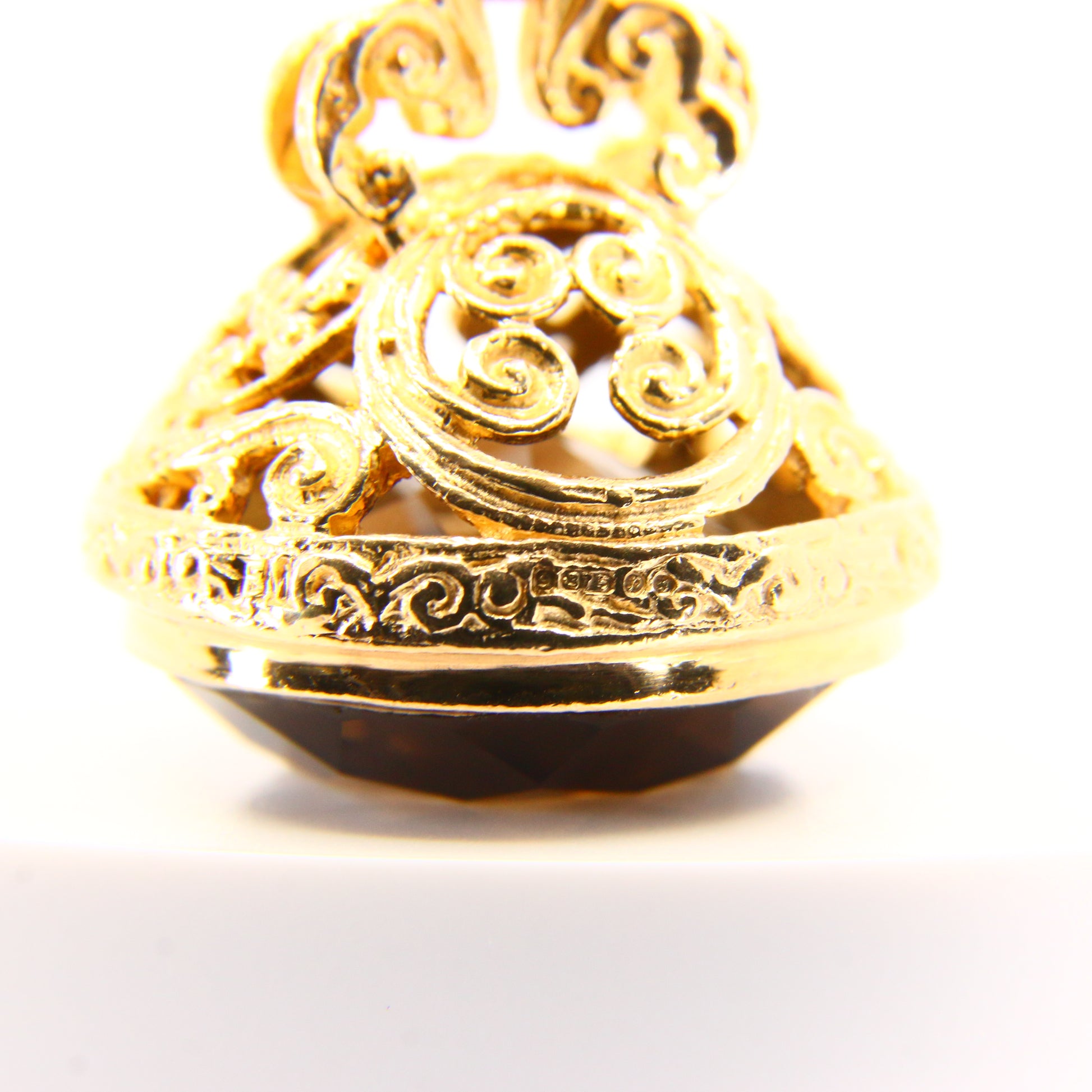This stunning antique pendant features a smokey citrine gemstone set in solid 9ct yellow gold. Fully hallmarked, the piece was likely worn as a watch chain fob but also makes an eye-catching pendant or charm.
