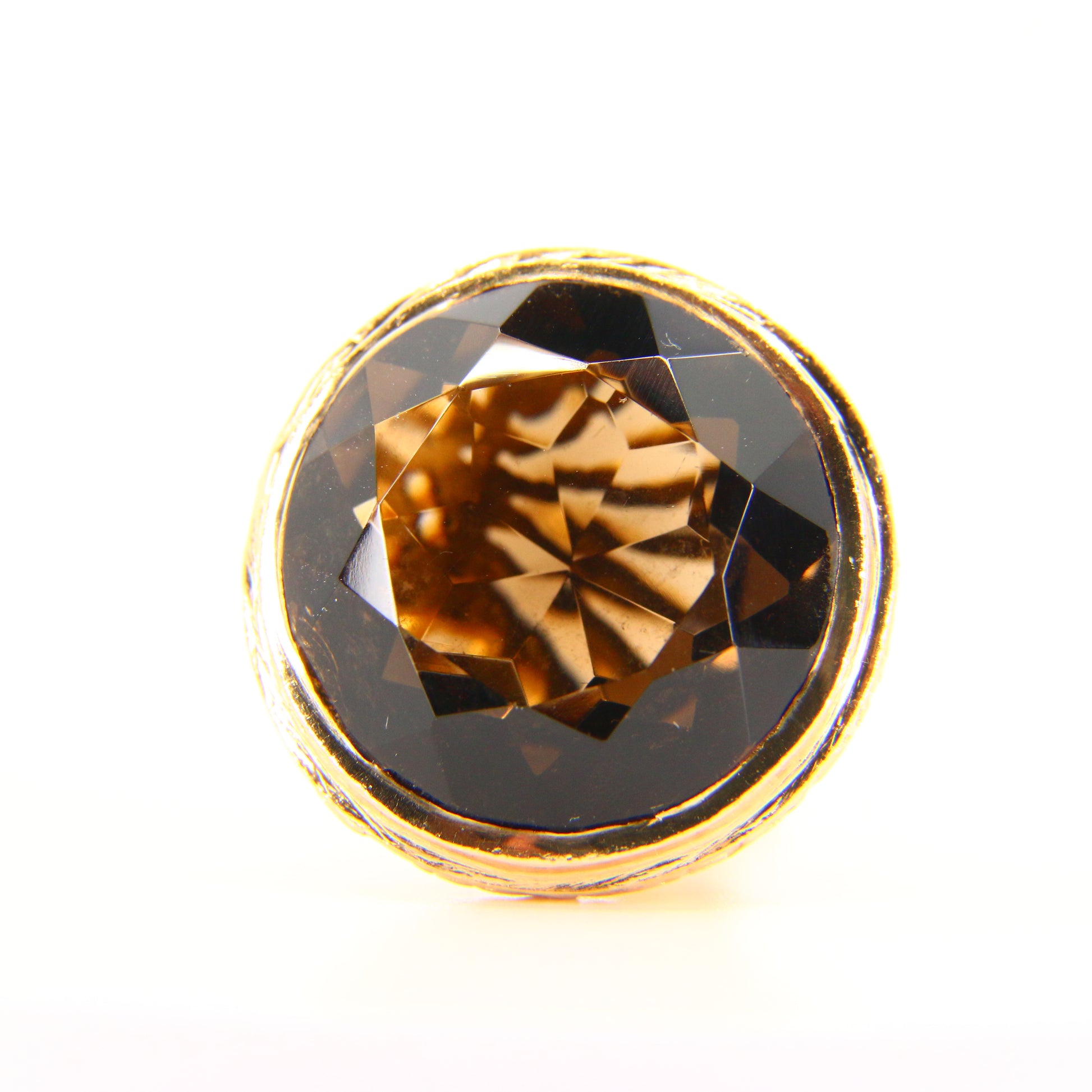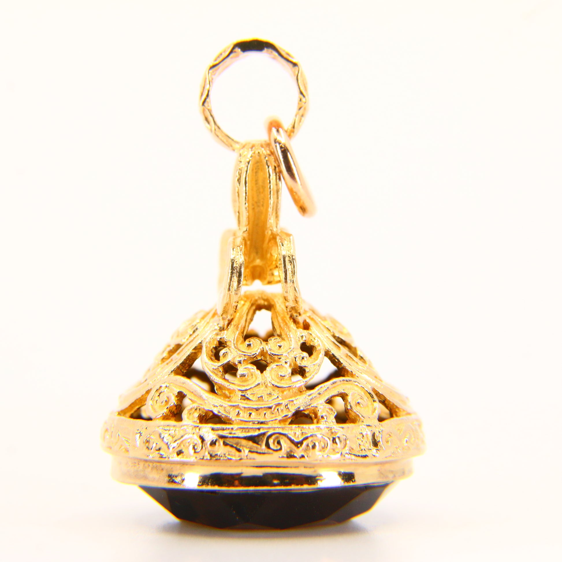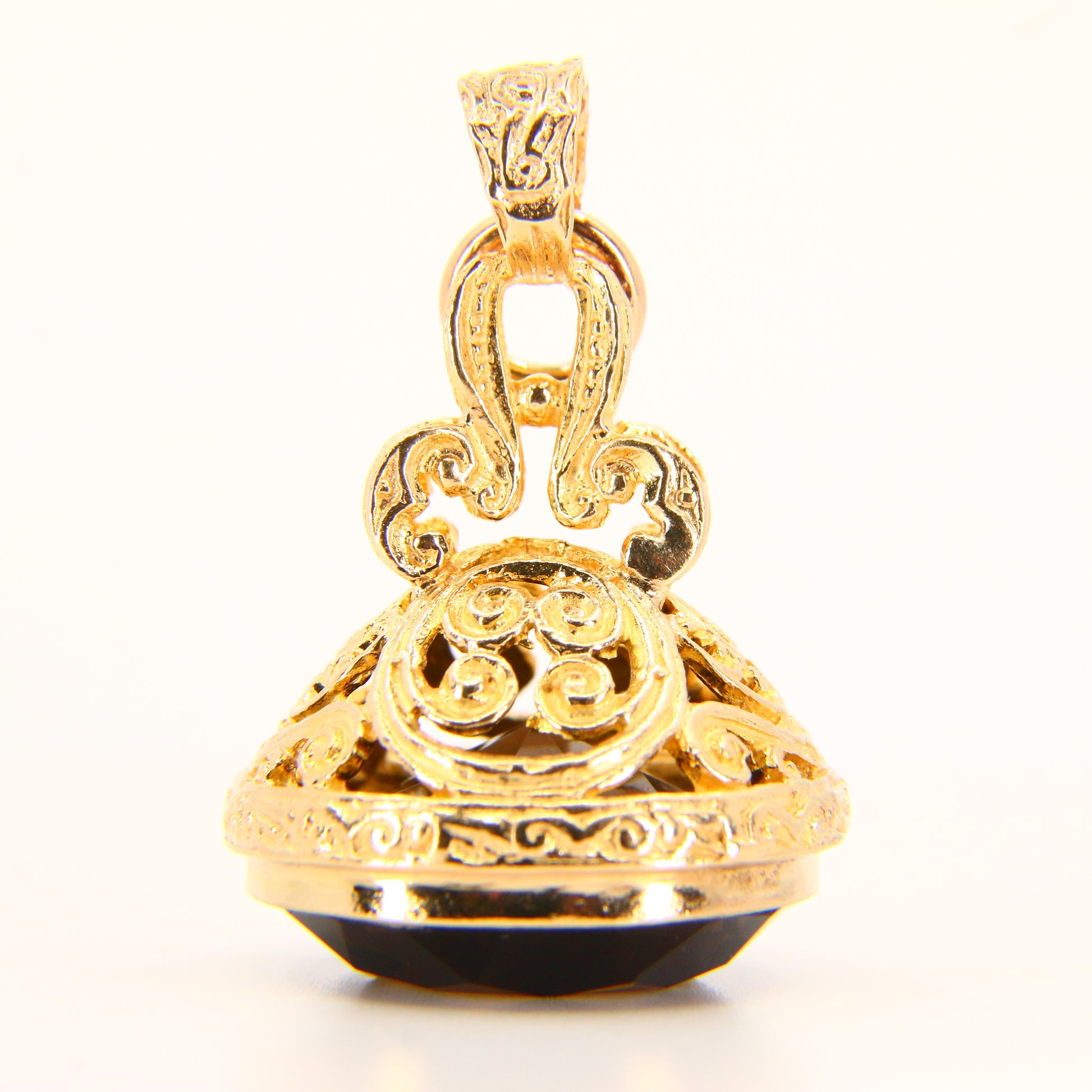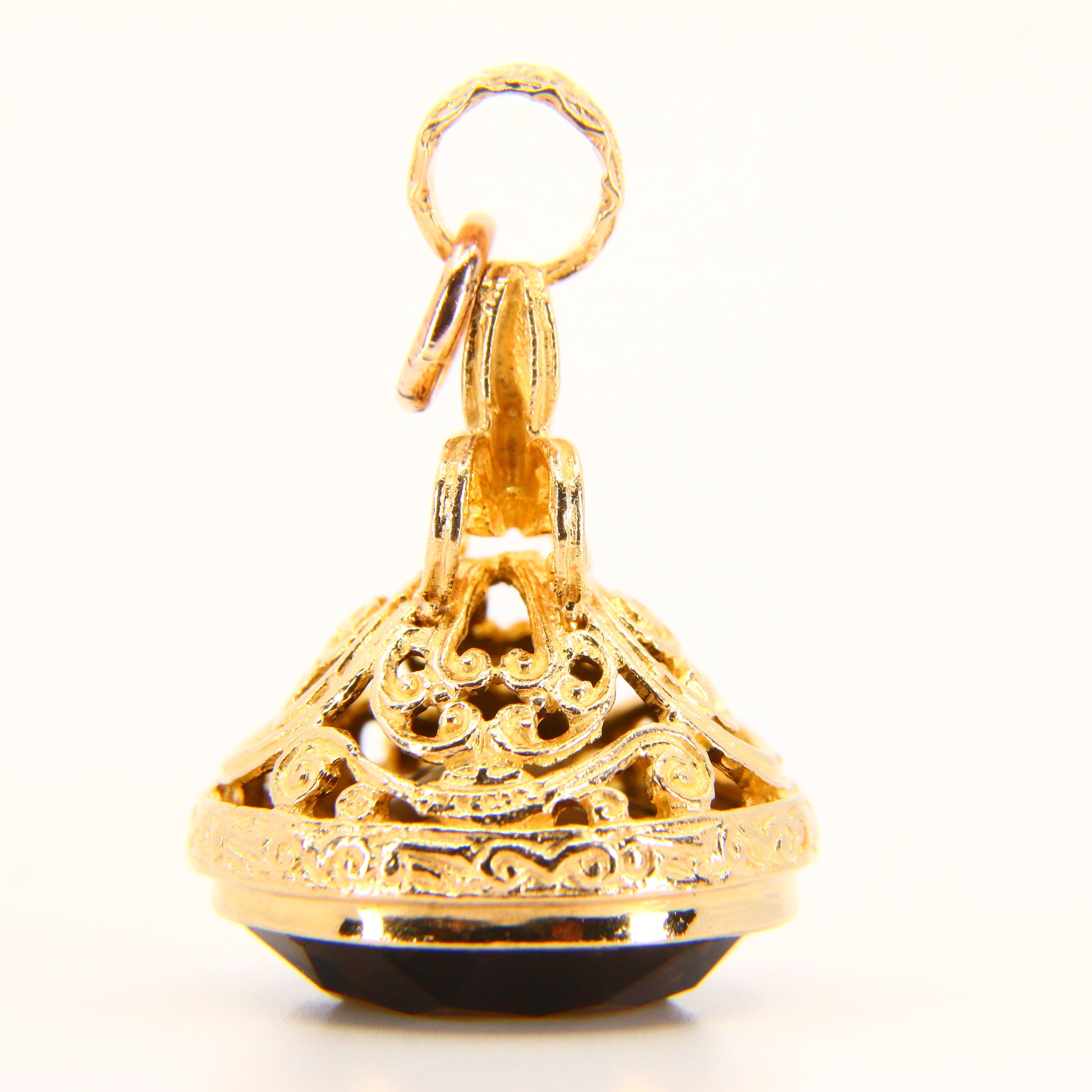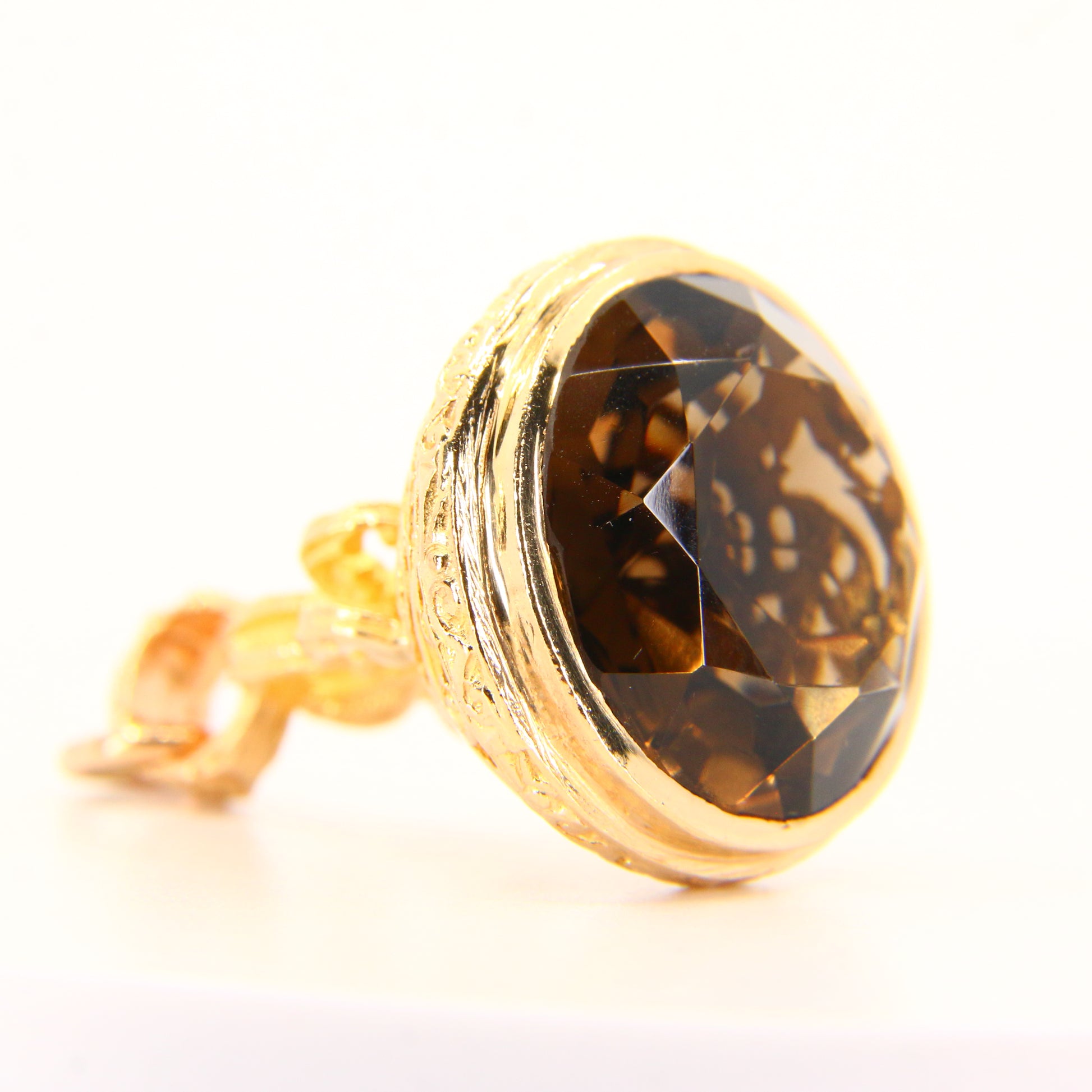 This stunning antique pendant features a smokey citrine gemstone set in solid 9ct yellow gold. Fully hallmarked, the piece was likely worn as a watch chain fob but also makes an eye-catching pendant or charm.