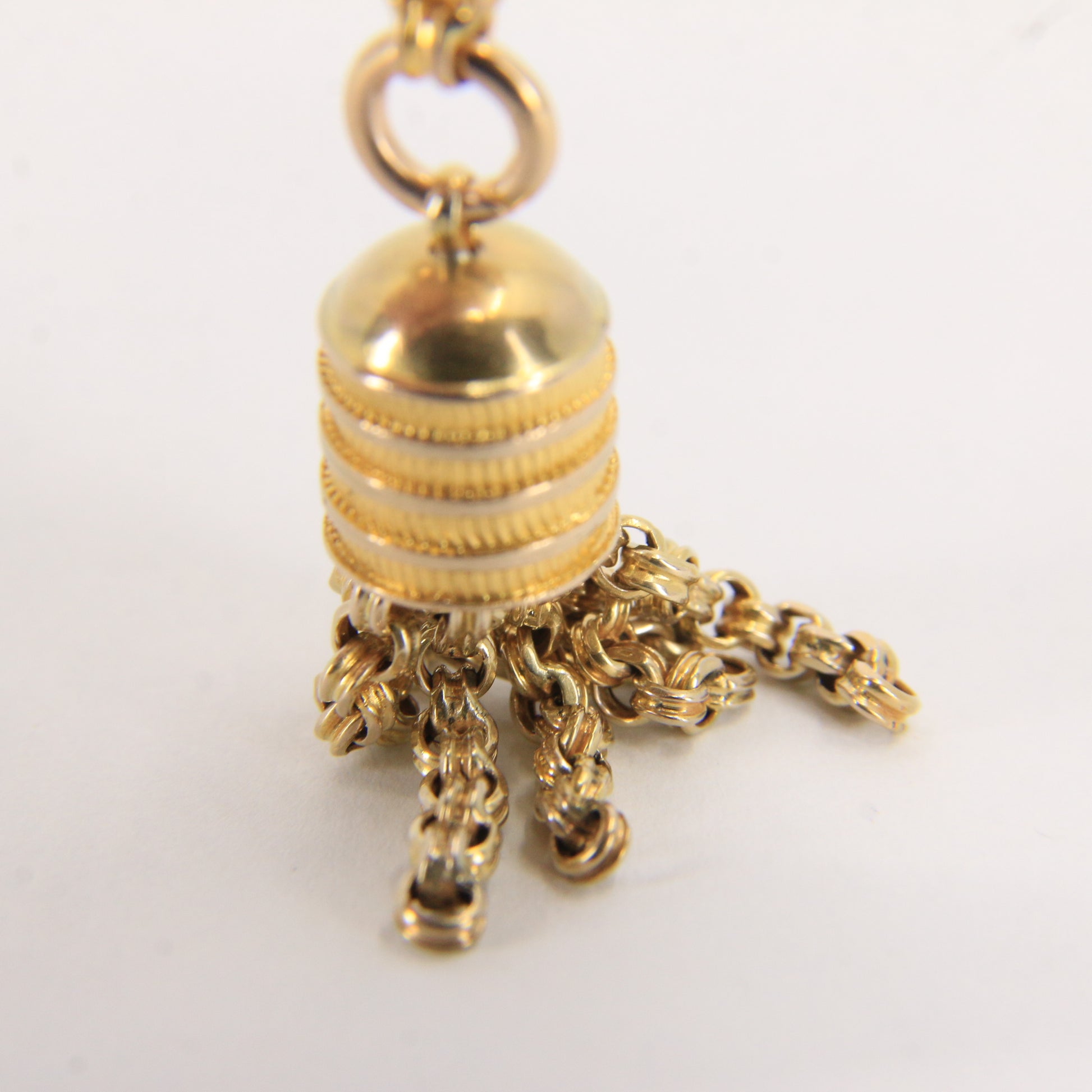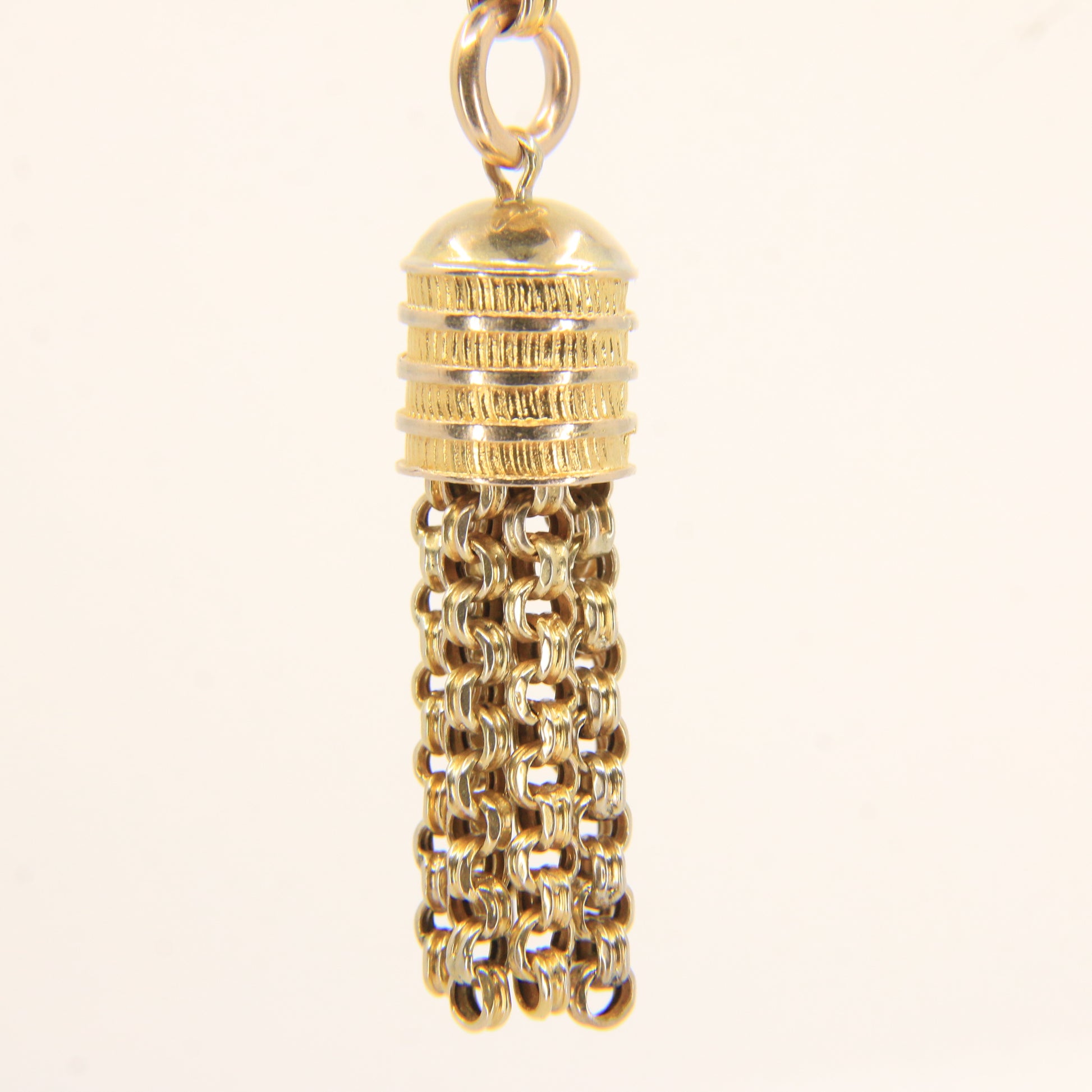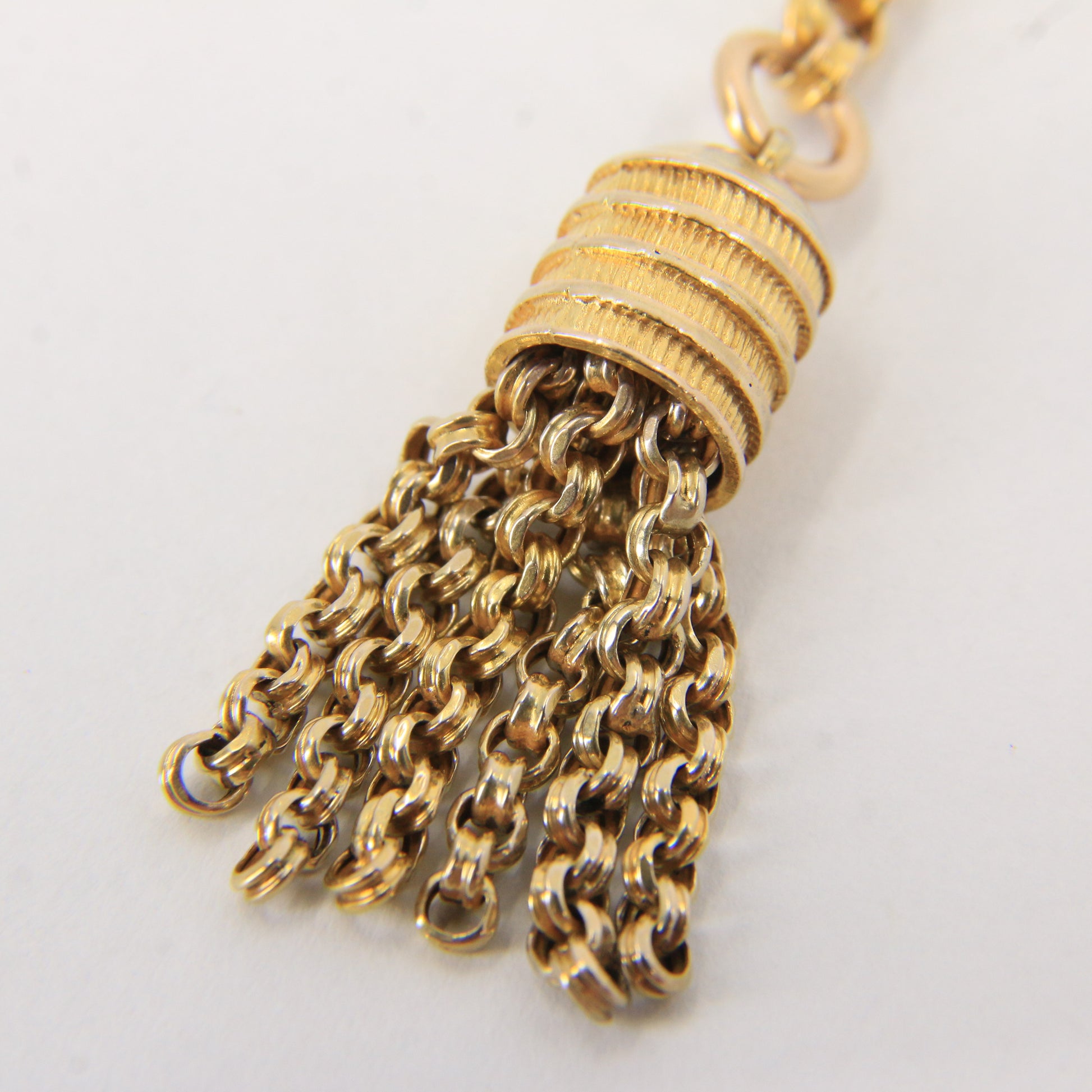 Antique 9ct solid yellow gold tassel drop on T-bar with fancy chain, part of an Albertina-style watch chain. A charming and versatile gift for vintage jewellery lovers or fob chain collectors.