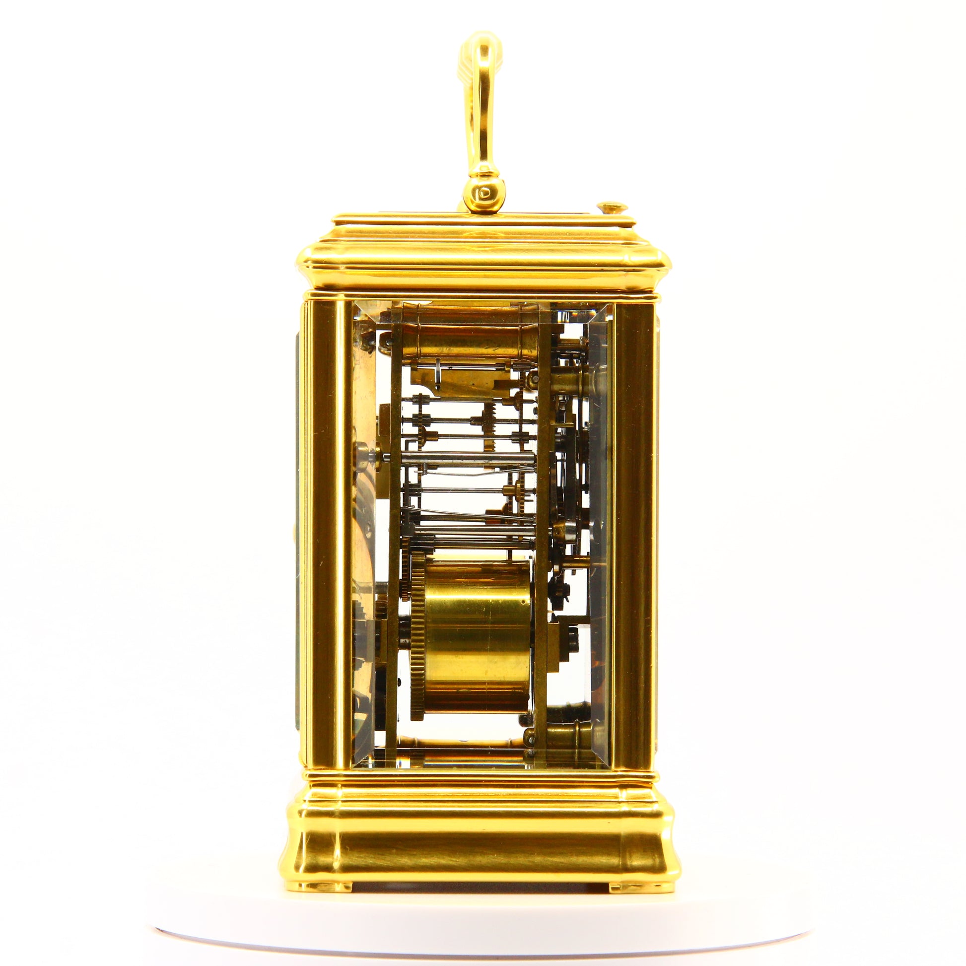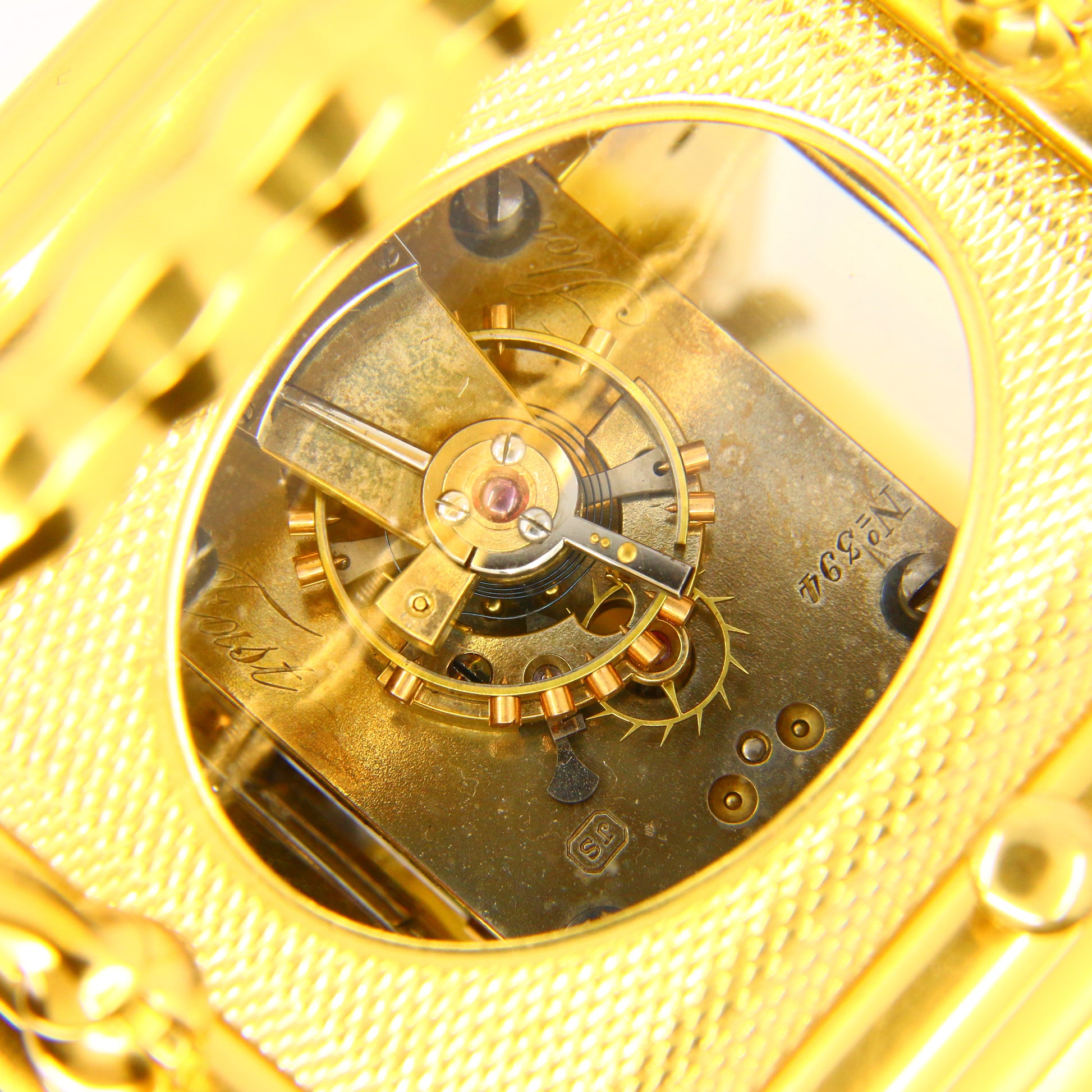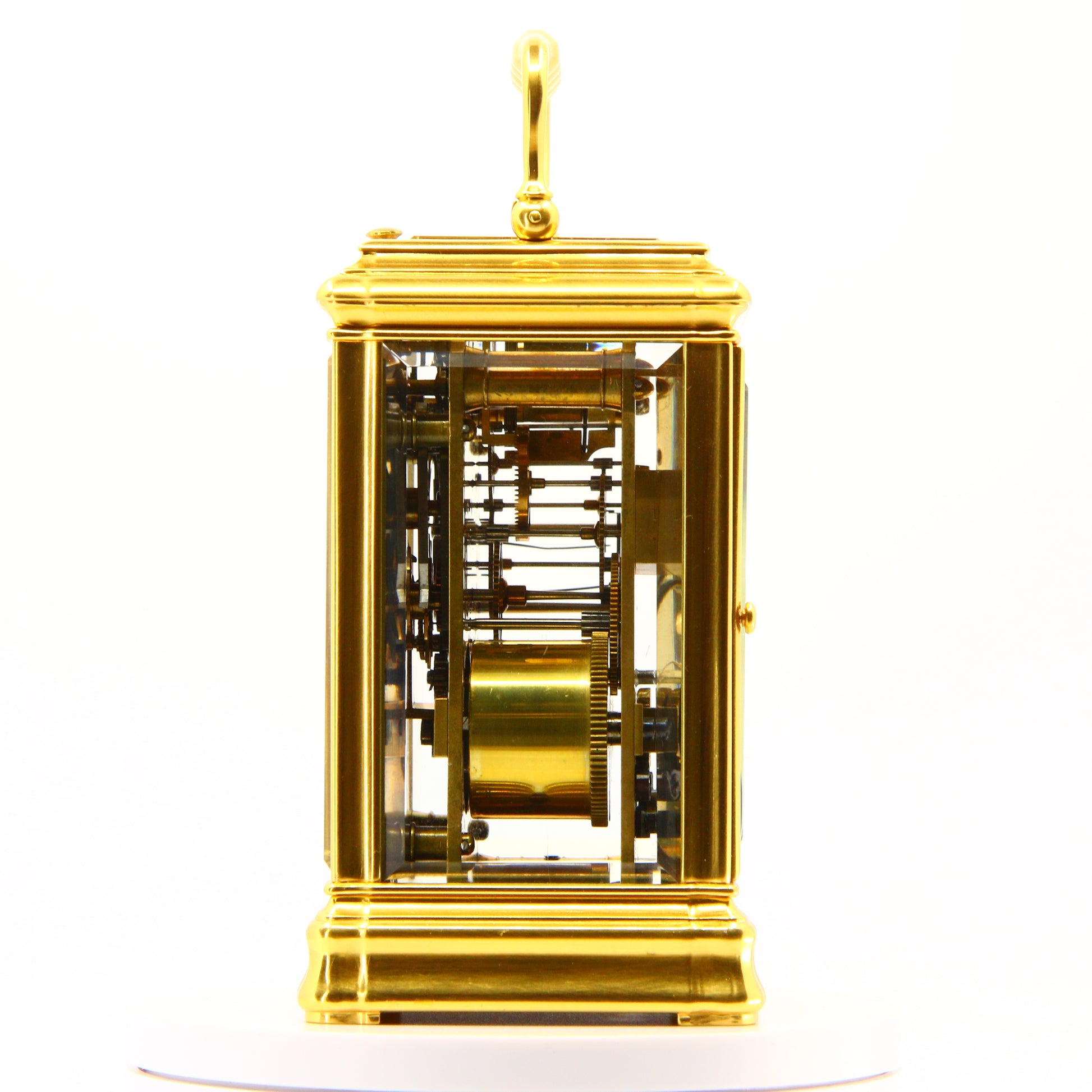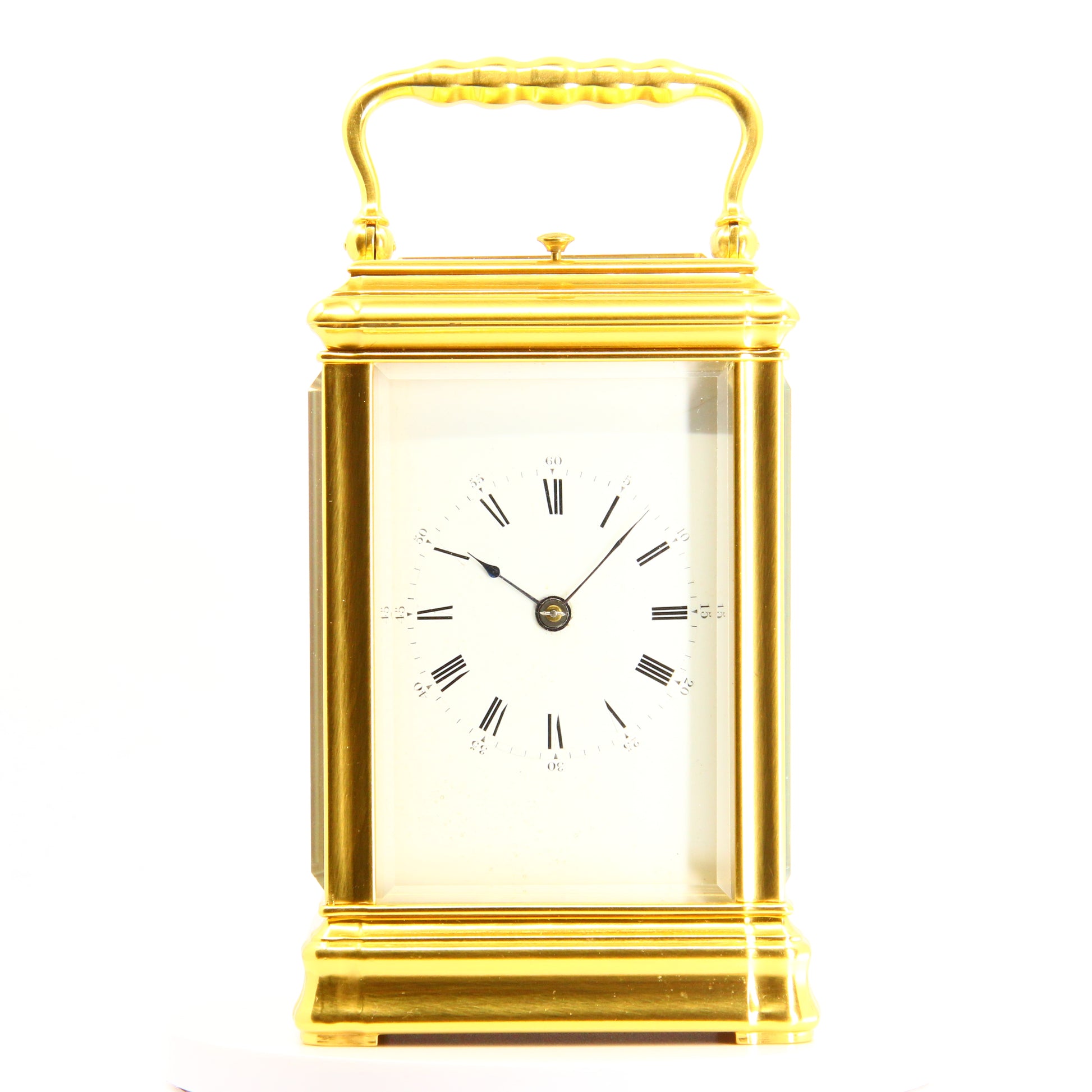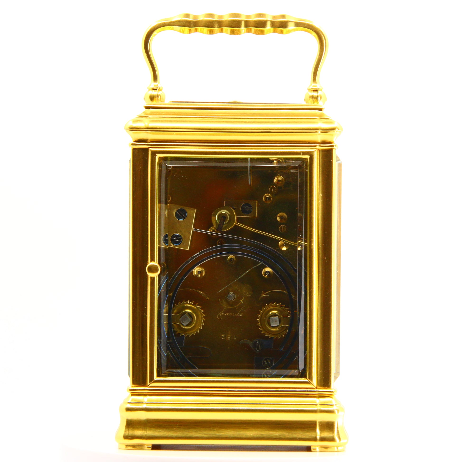Gilt brass Gorge case with bevelled glass. 8-Day movement, striking the hour, the half hour and can repeating the hours at will via the repeat button on top. Enamel dial with Roman and Arabic numerals and blued steel hands. Complete with a double ended key for winding and adjustment.