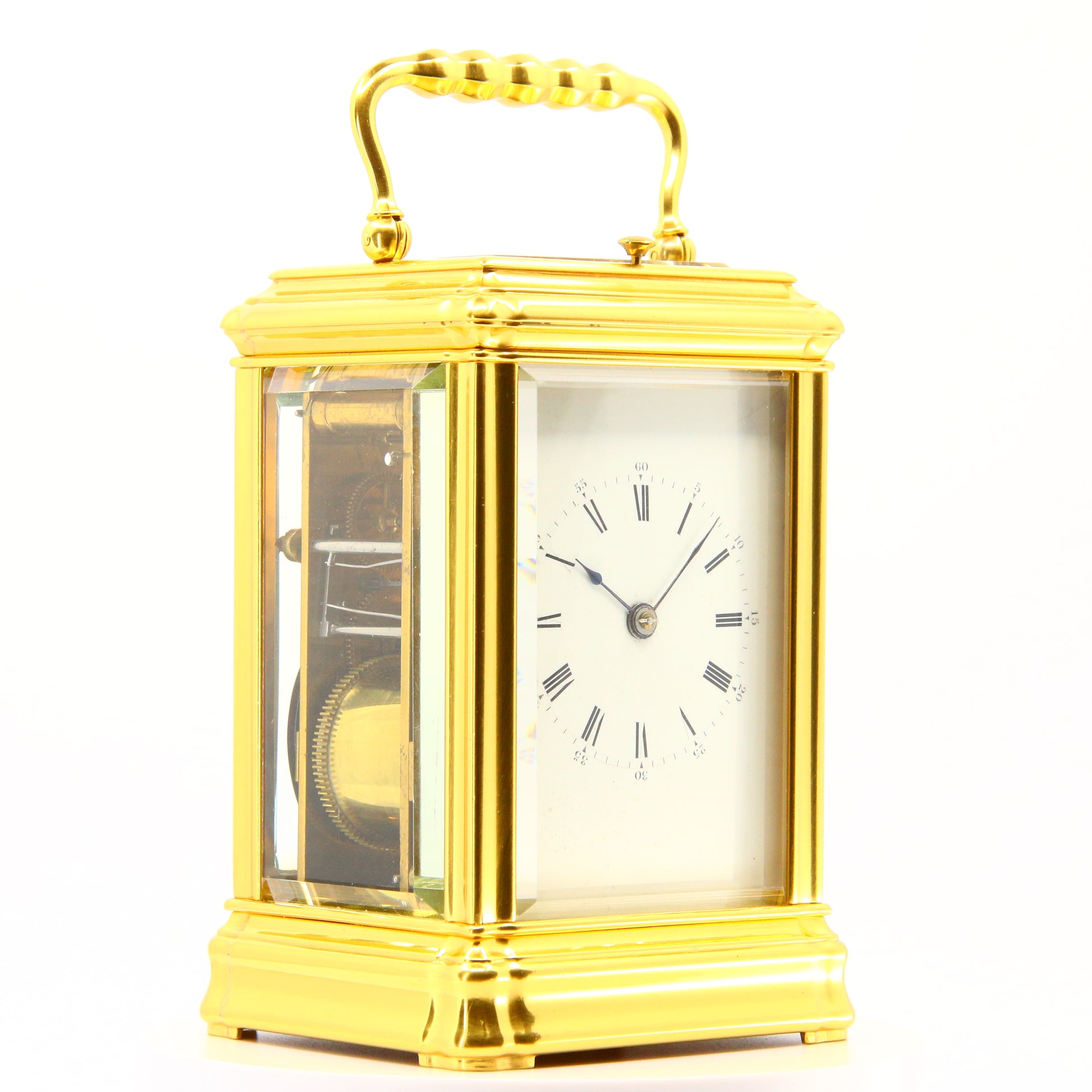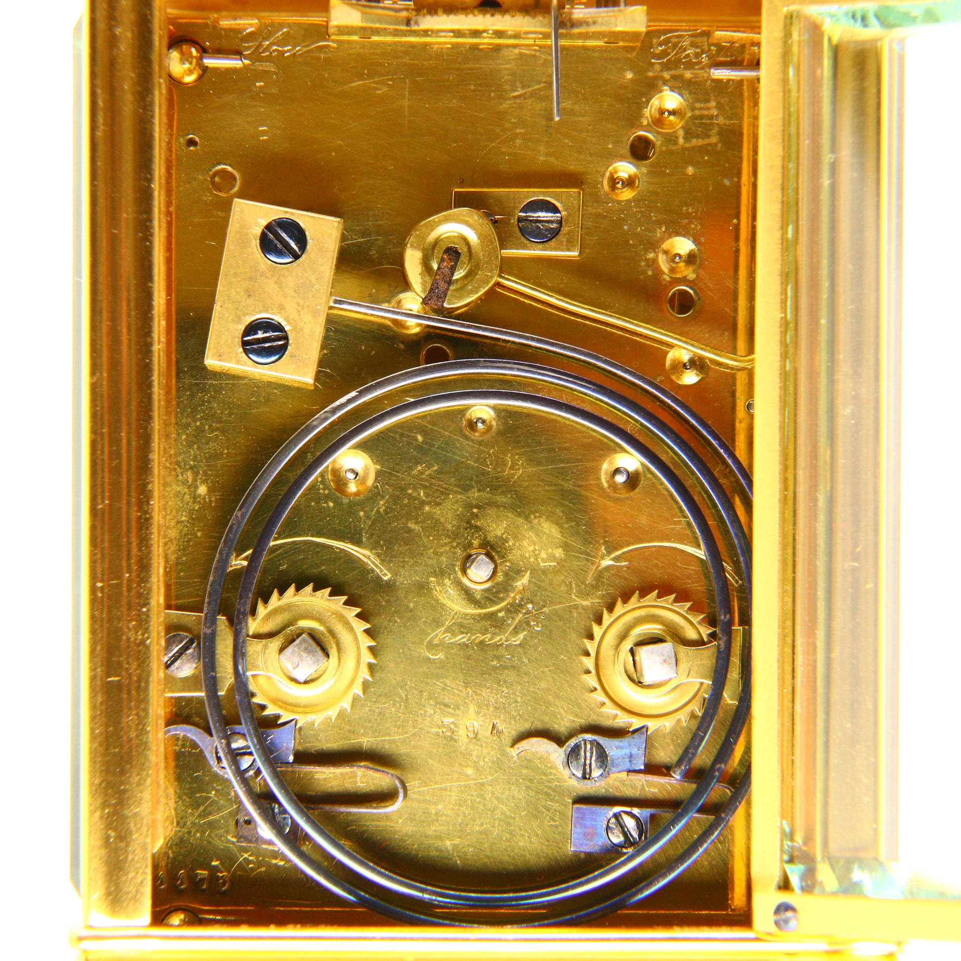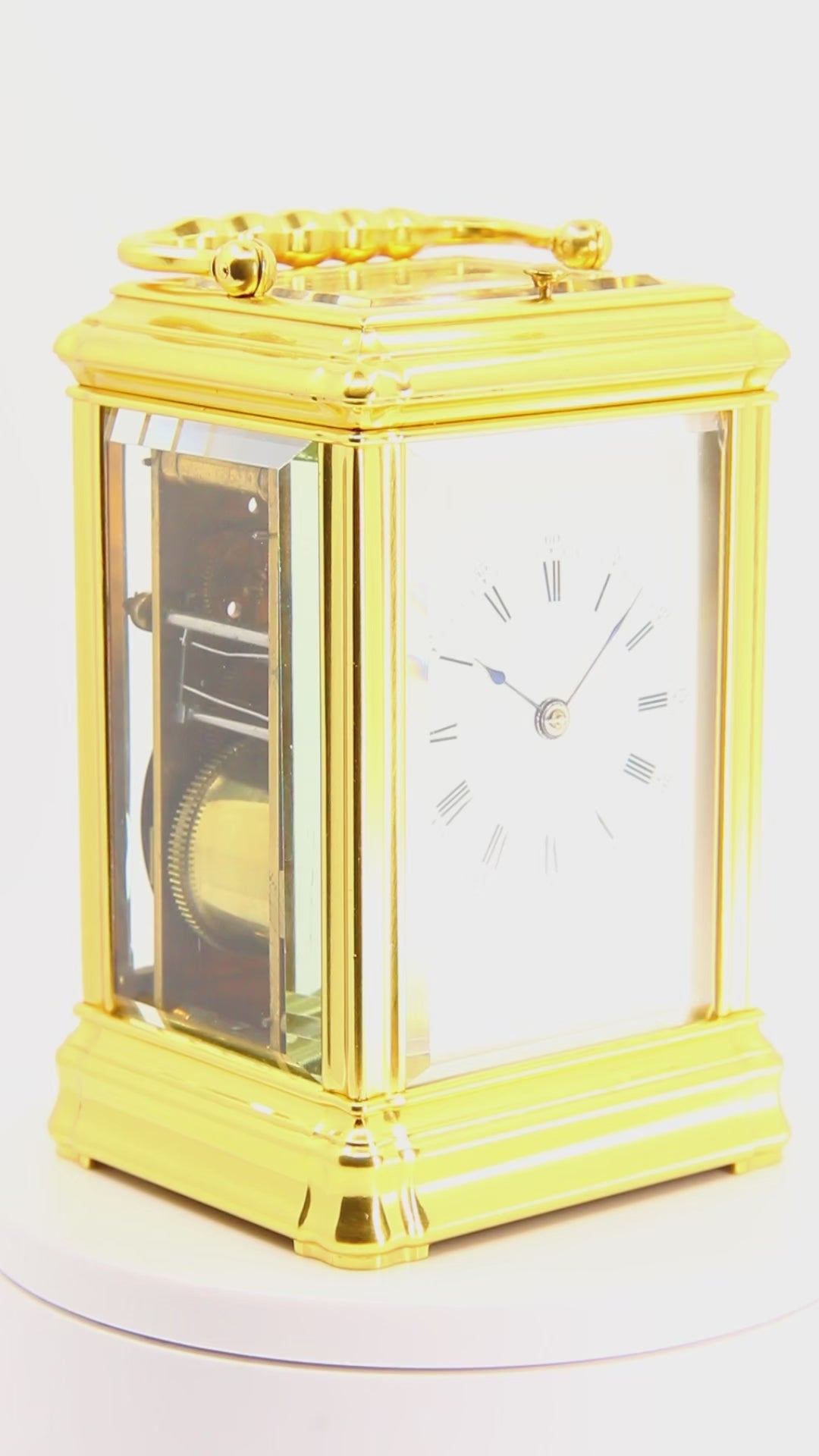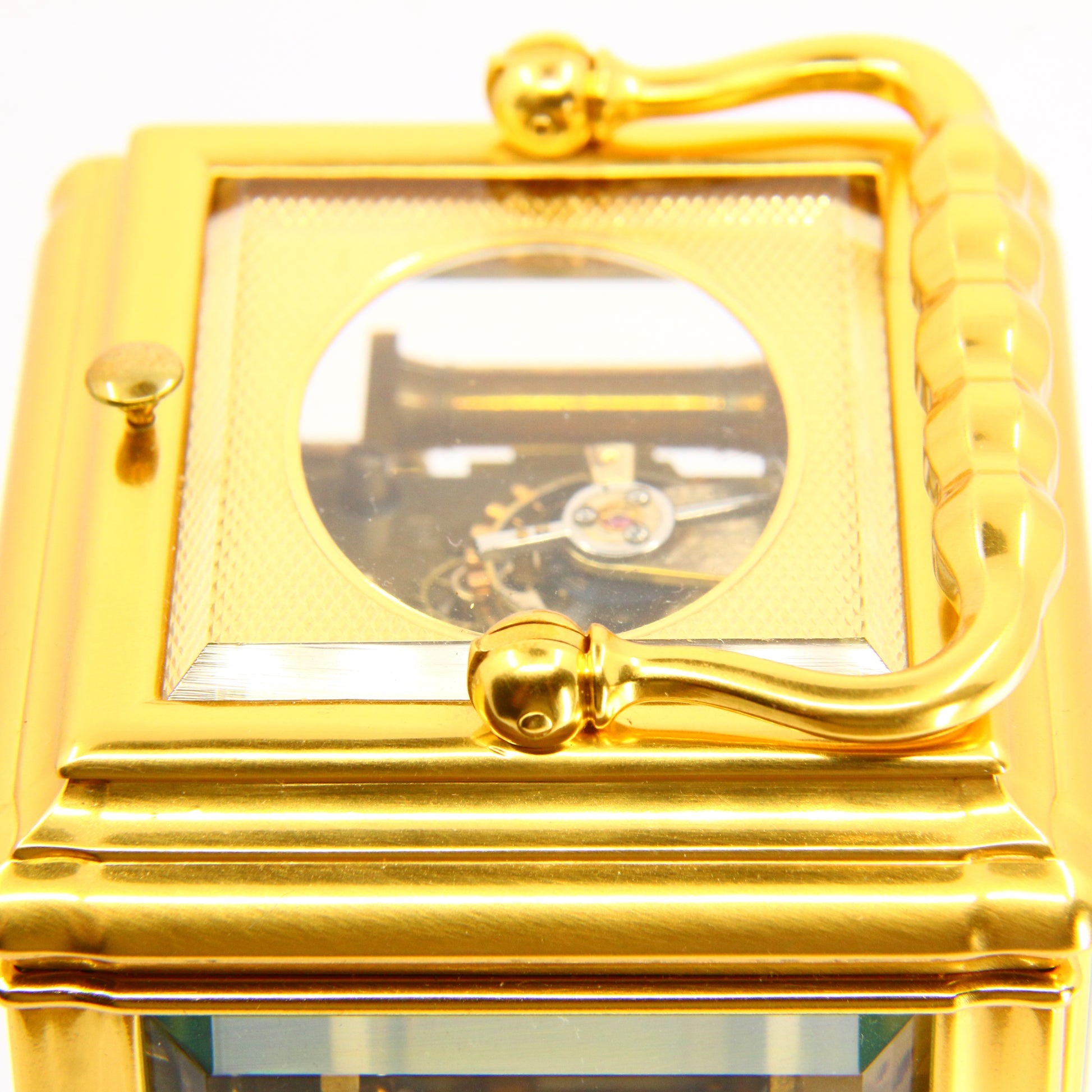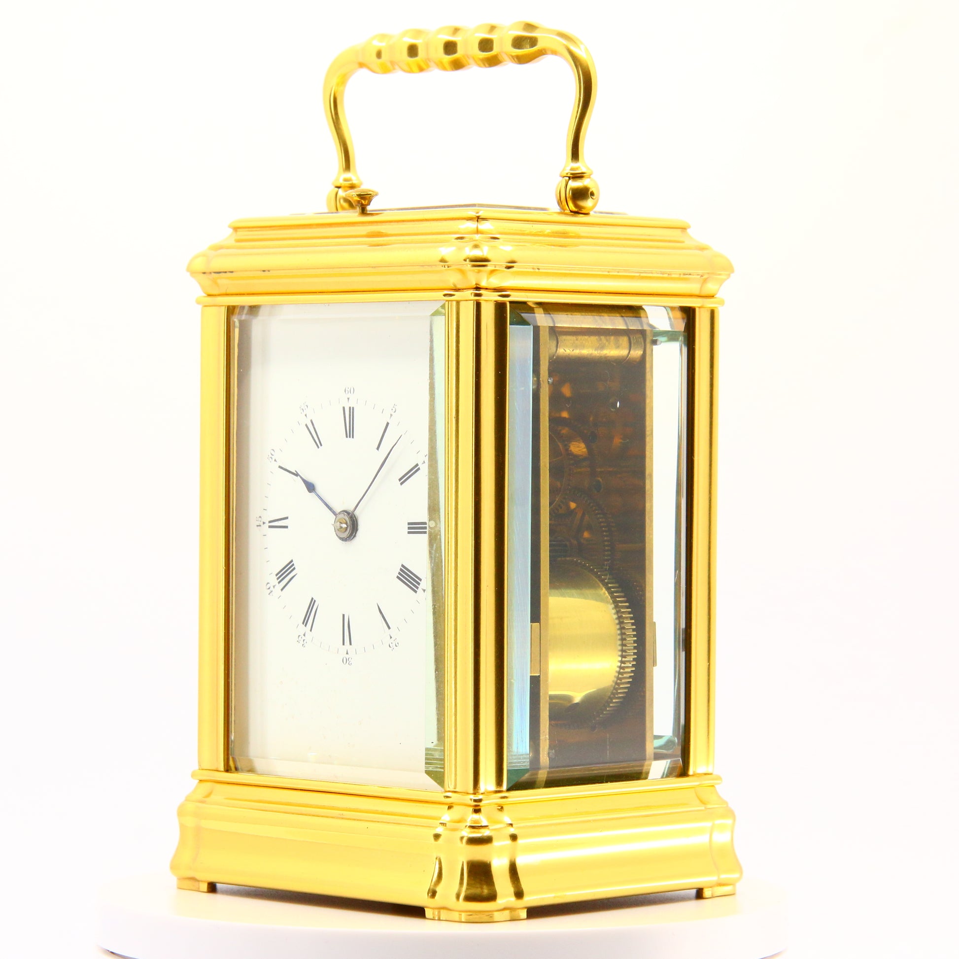 Gilt brass Gorge case with bevelled glass. 8-Day movement, striking the hour, the half hour and can repeating the hours at will via the repeat button on top. Enamel dial with Roman and Arabic numerals and blued steel hands. Complete with a double ended key for winding and adjustment.