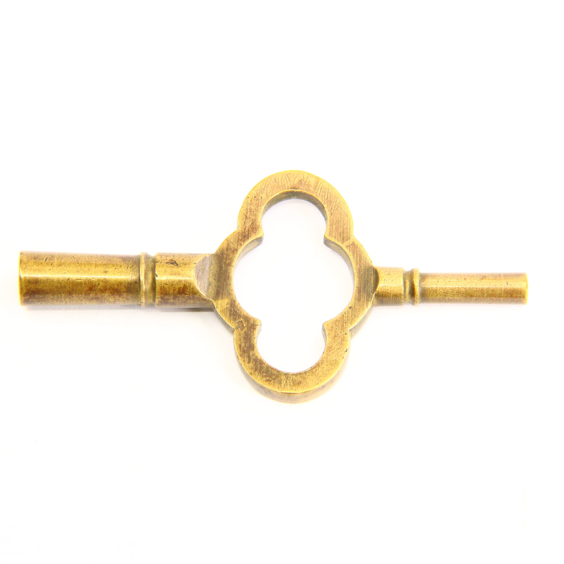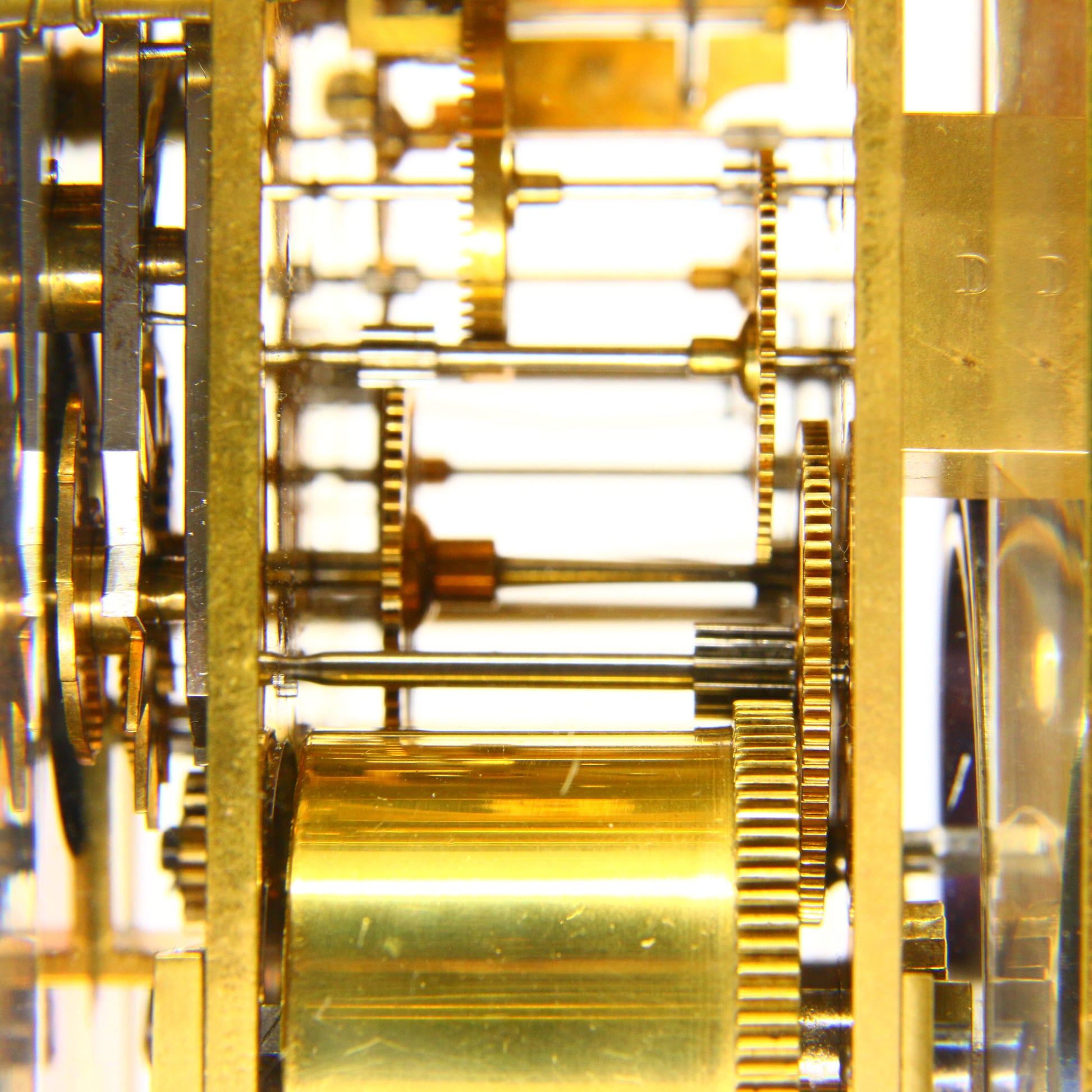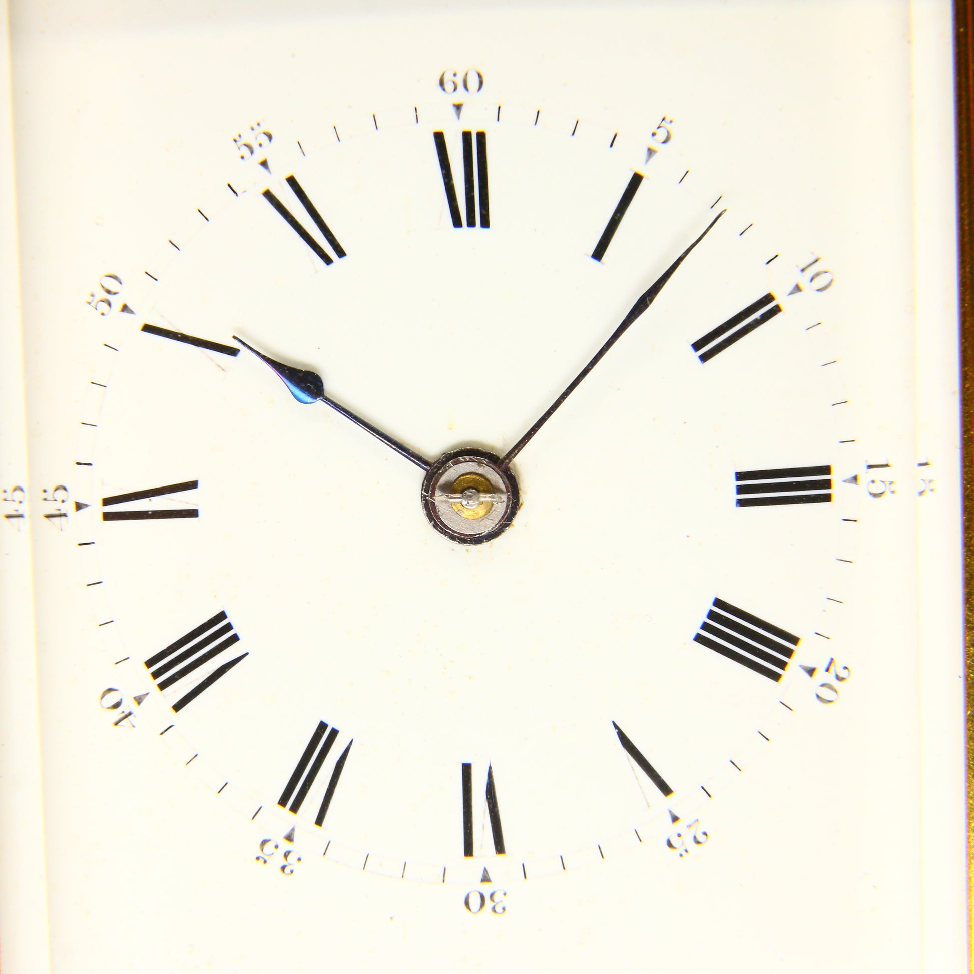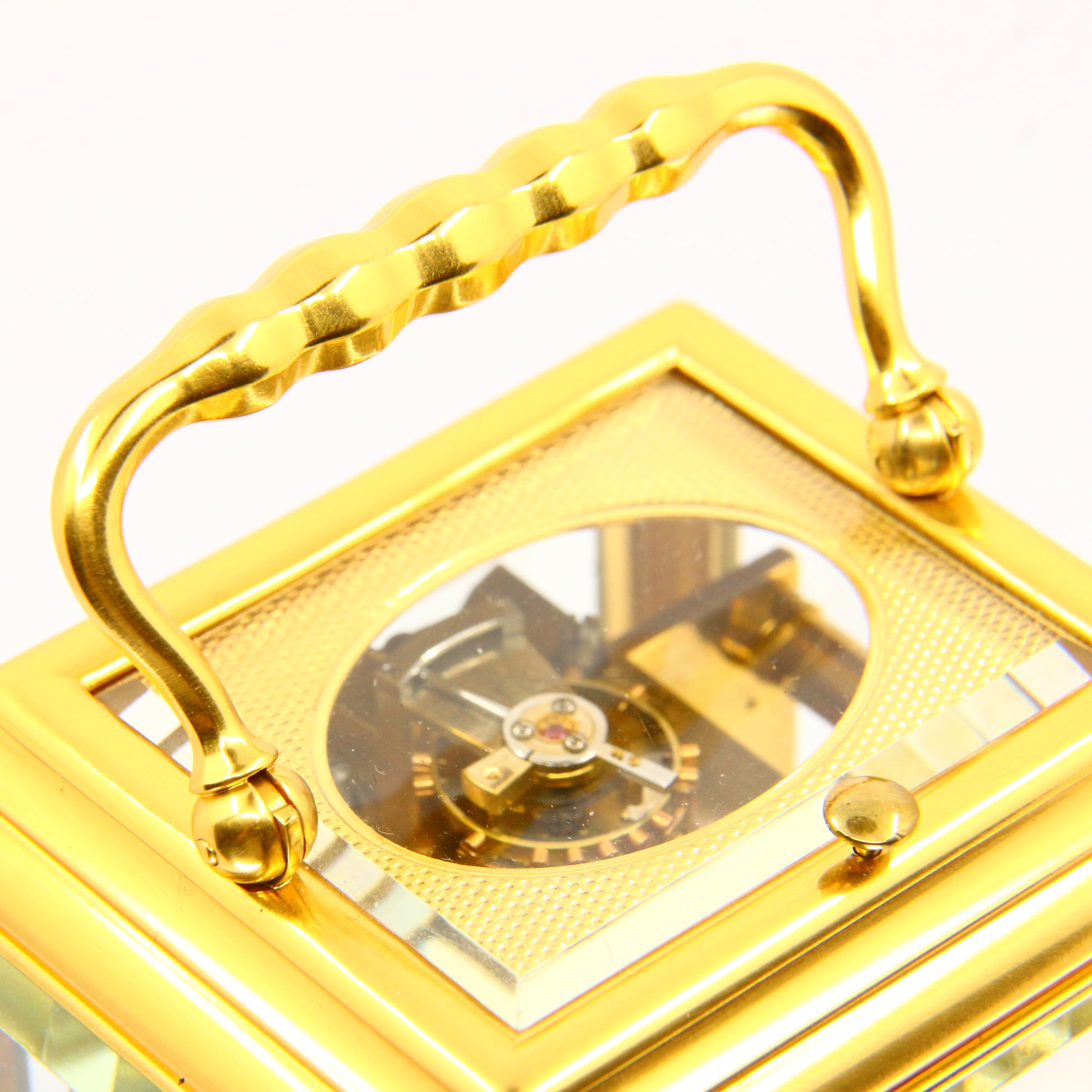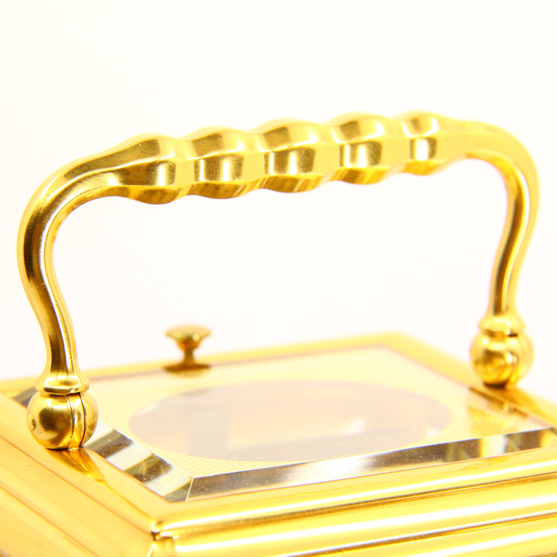 Gilt brass Gorge case with bevelled glass. 8-Day movement, striking the hour, the half hour and can repeating the hours at will via the repeat button on top. Enamel dial with Roman and Arabic numerals and blued steel hands. Complete with a double ended key for winding and adjustment.