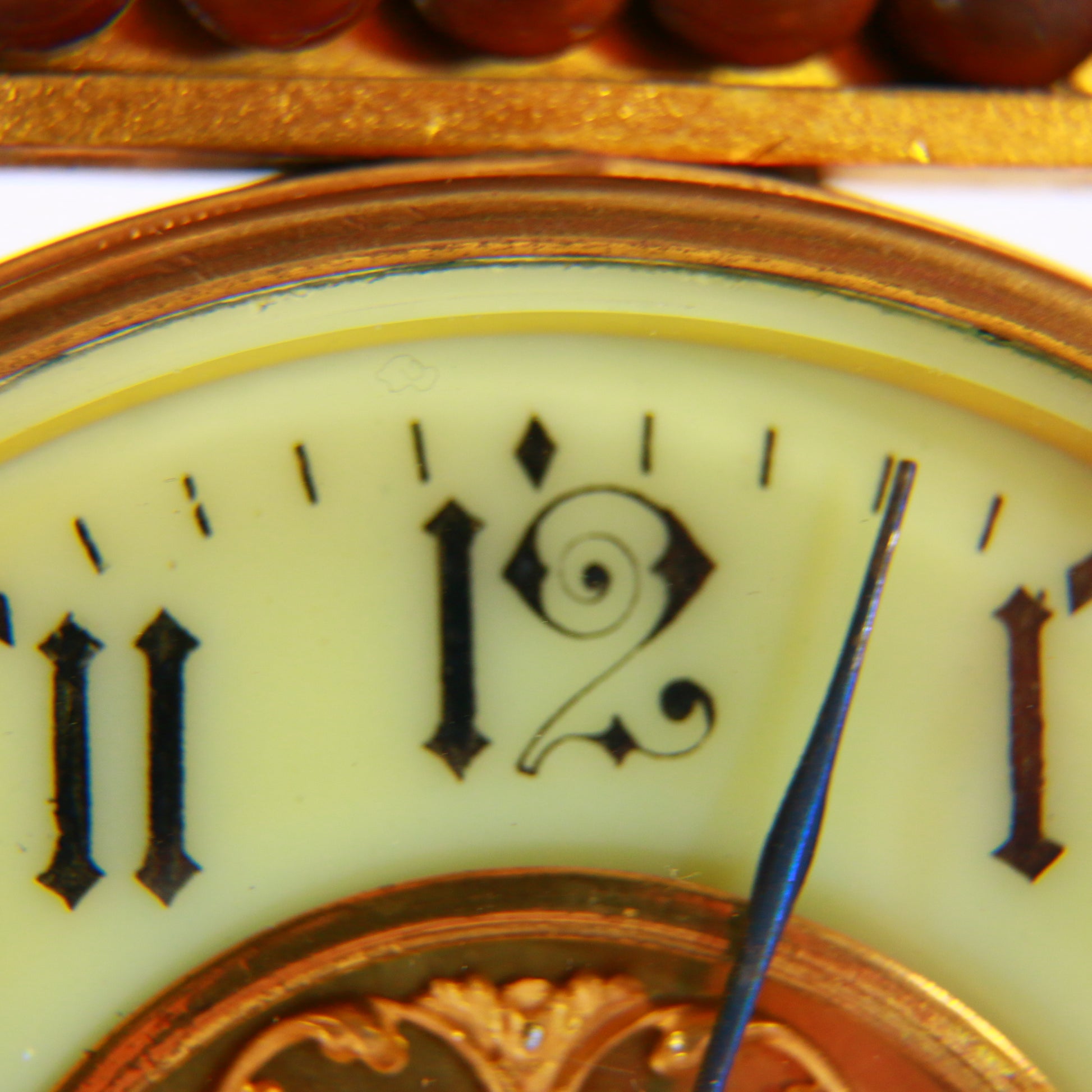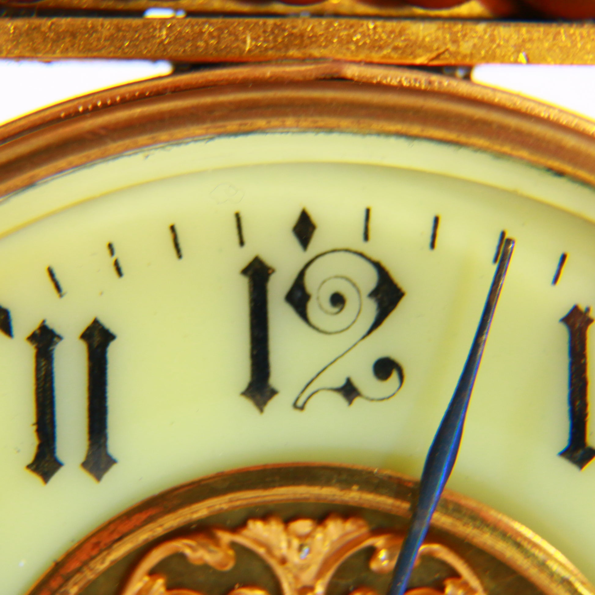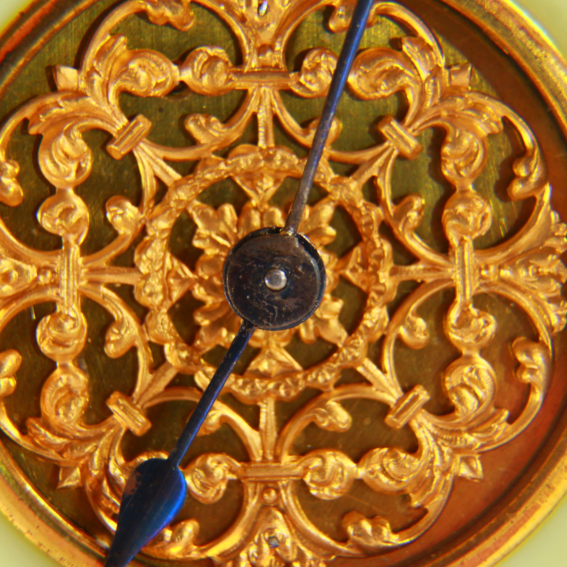 The clock with a cream enamel dial, Arabic numerals and foliate filigree centre.