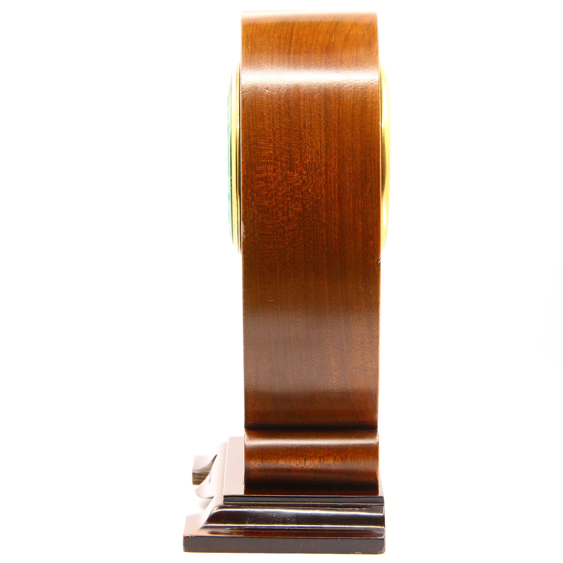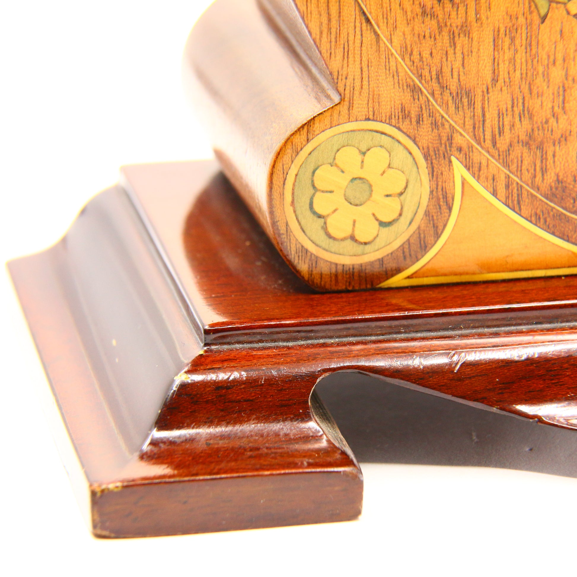A beautiful running Antique Mantel Clock in mahogany with floral design inlays from the Art Nouveau movement within the Edwardian time period of 1910 Great Britain. This clock is time only, no strike. It doesn't use a pendulum, it has a platform escapement like a carriage clock. A perfect gift or addition to any collection.