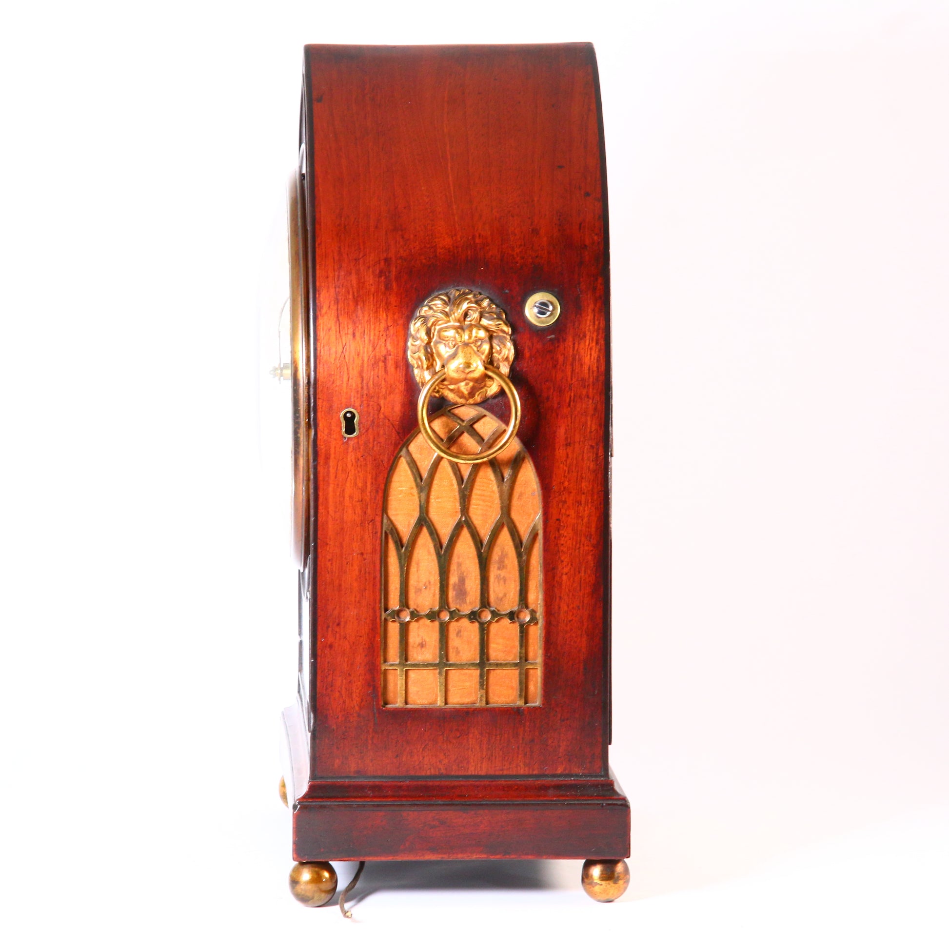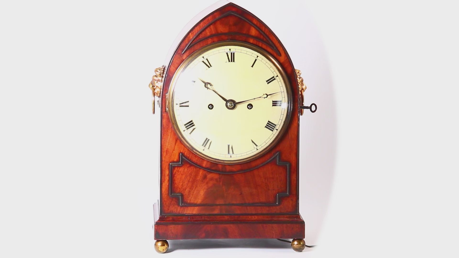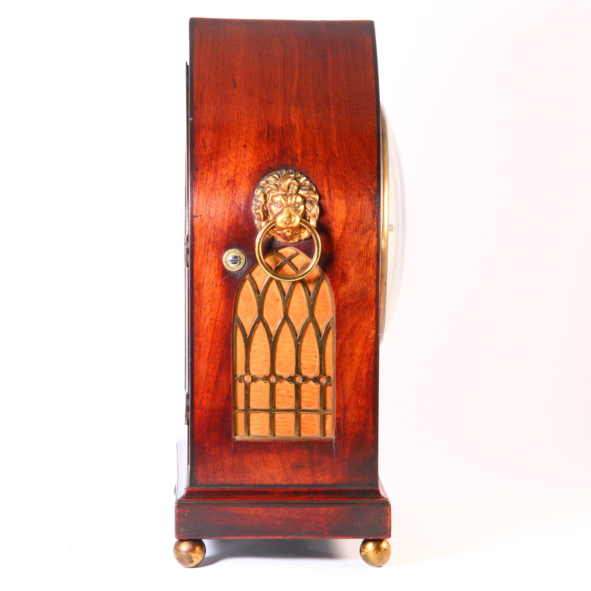 Mahogany veneered case with fine ebonised details, brass pierced sound grills to the sides and lion head ring handles, standing on adjustable brass ball feet.