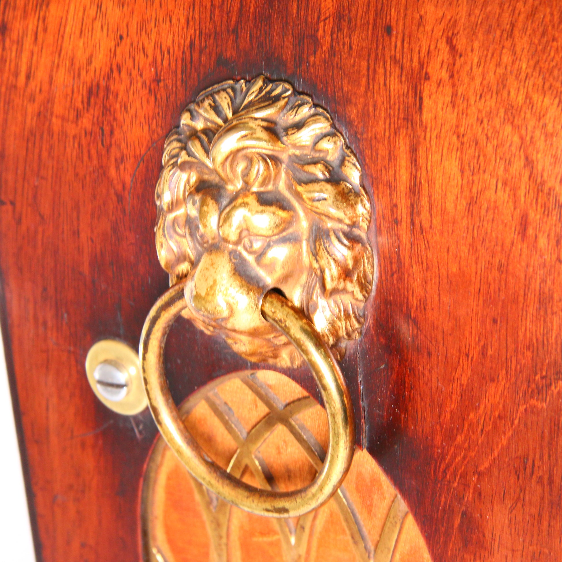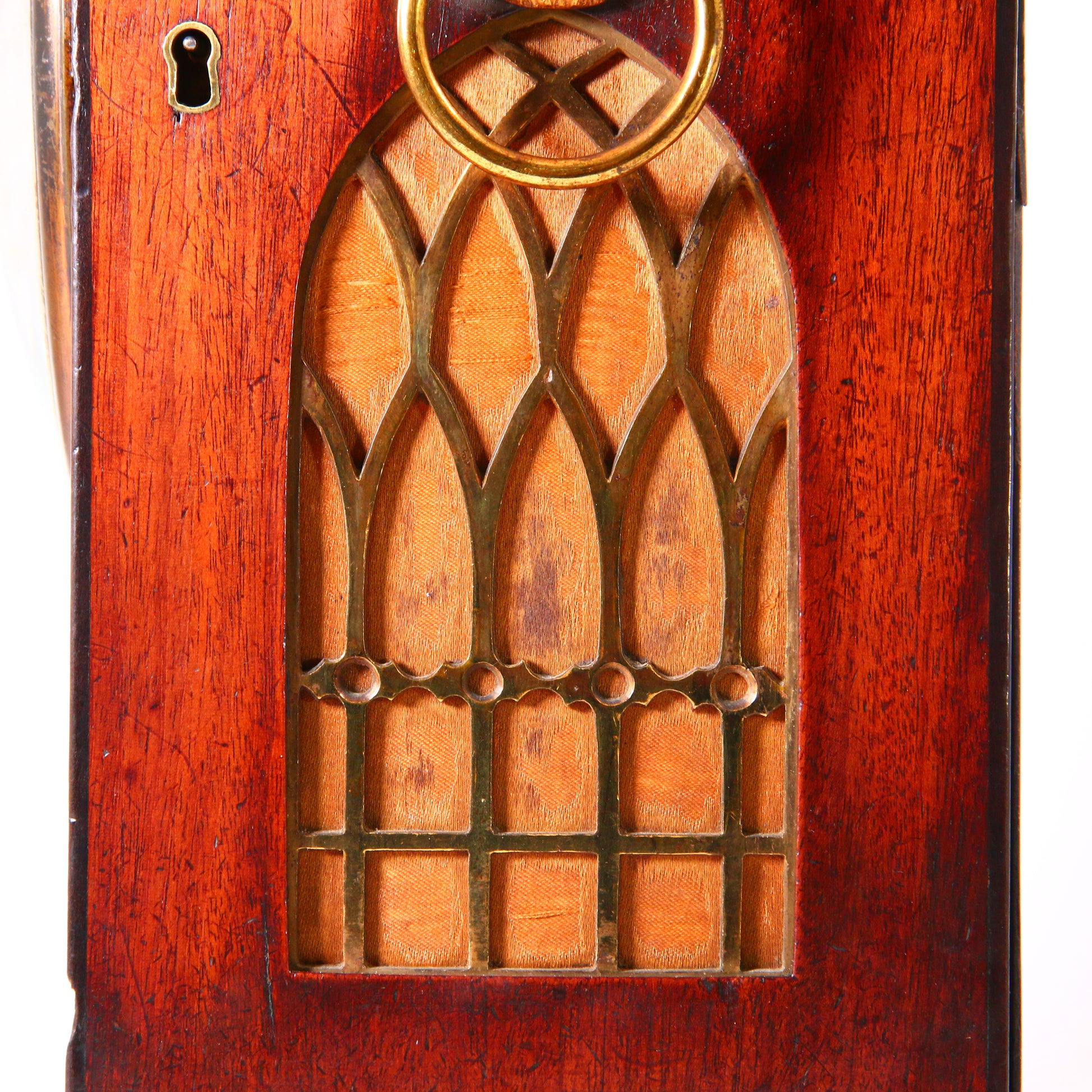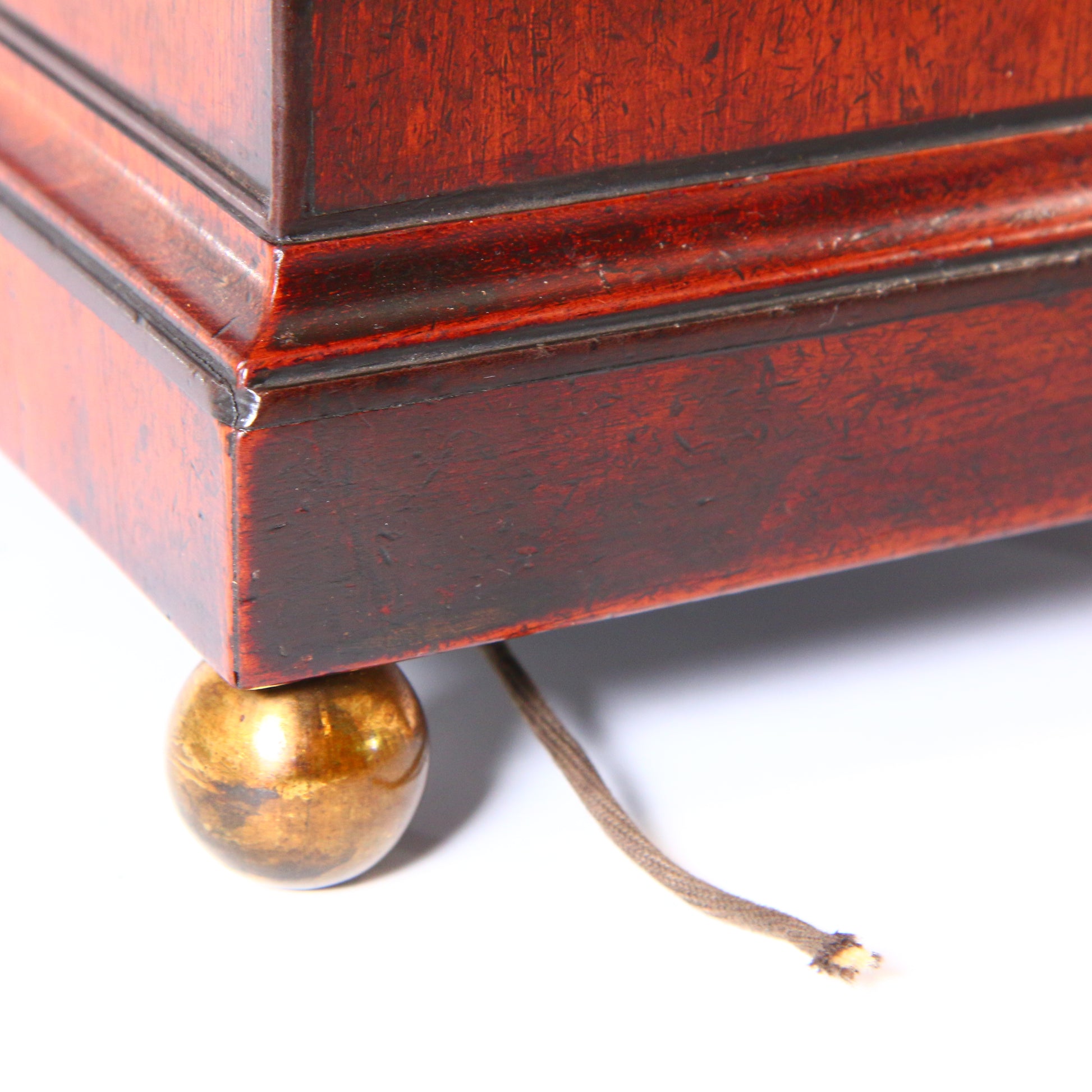 Mahogany veneered case with fine ebonised details, brass pierced sound grills to the sides and lion head ring handles, standing on adjustable brass ball feet.