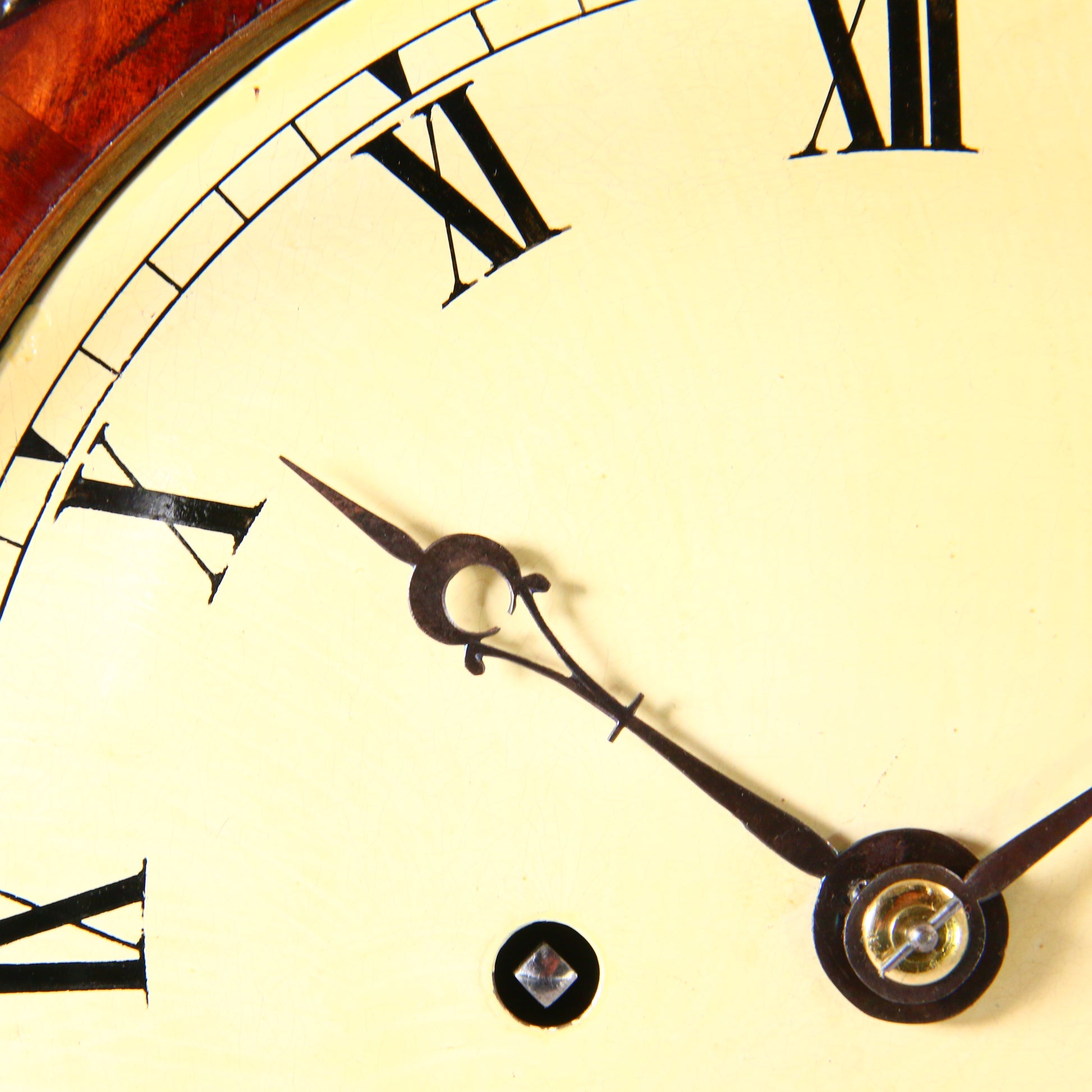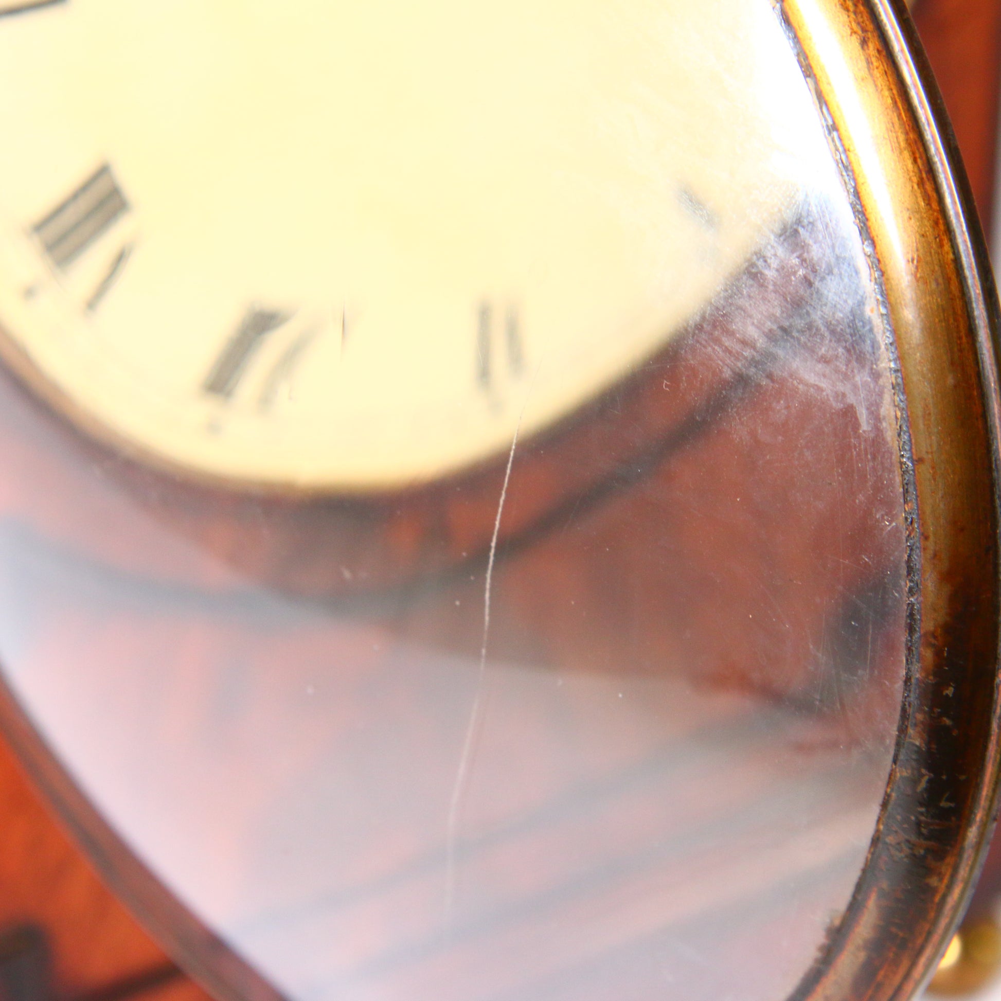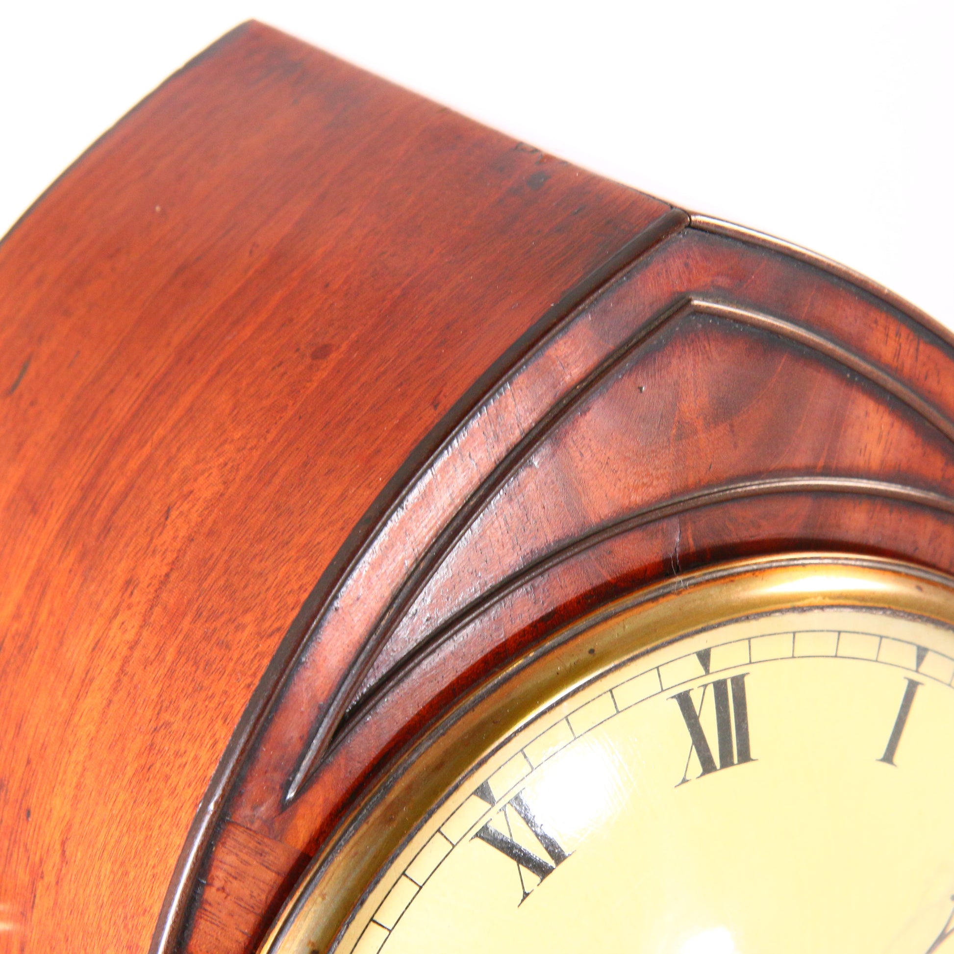 Painted convex dial with Roman numerals and steel hands with a strike / silent lever above twelve, concealed by the cast brass bezel.