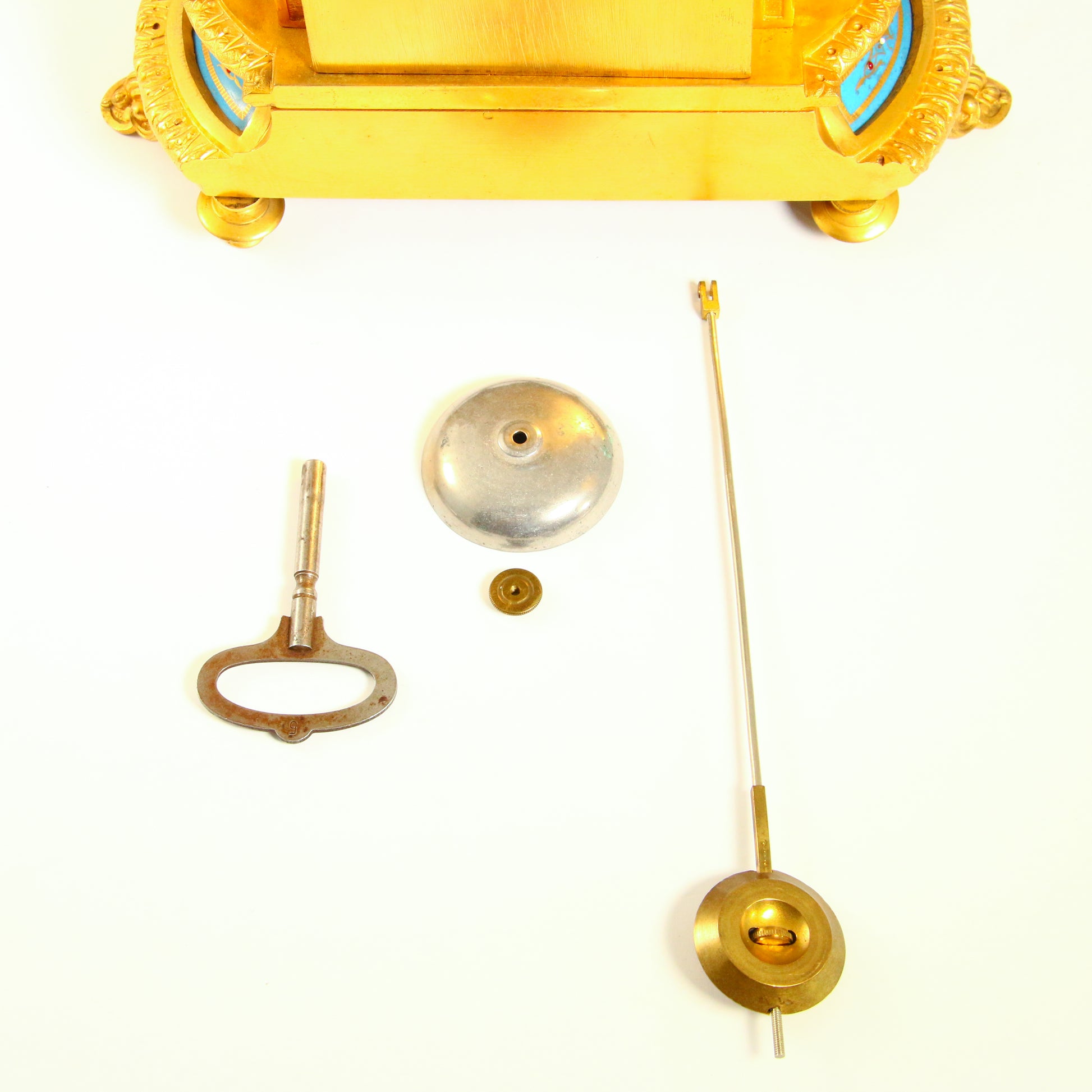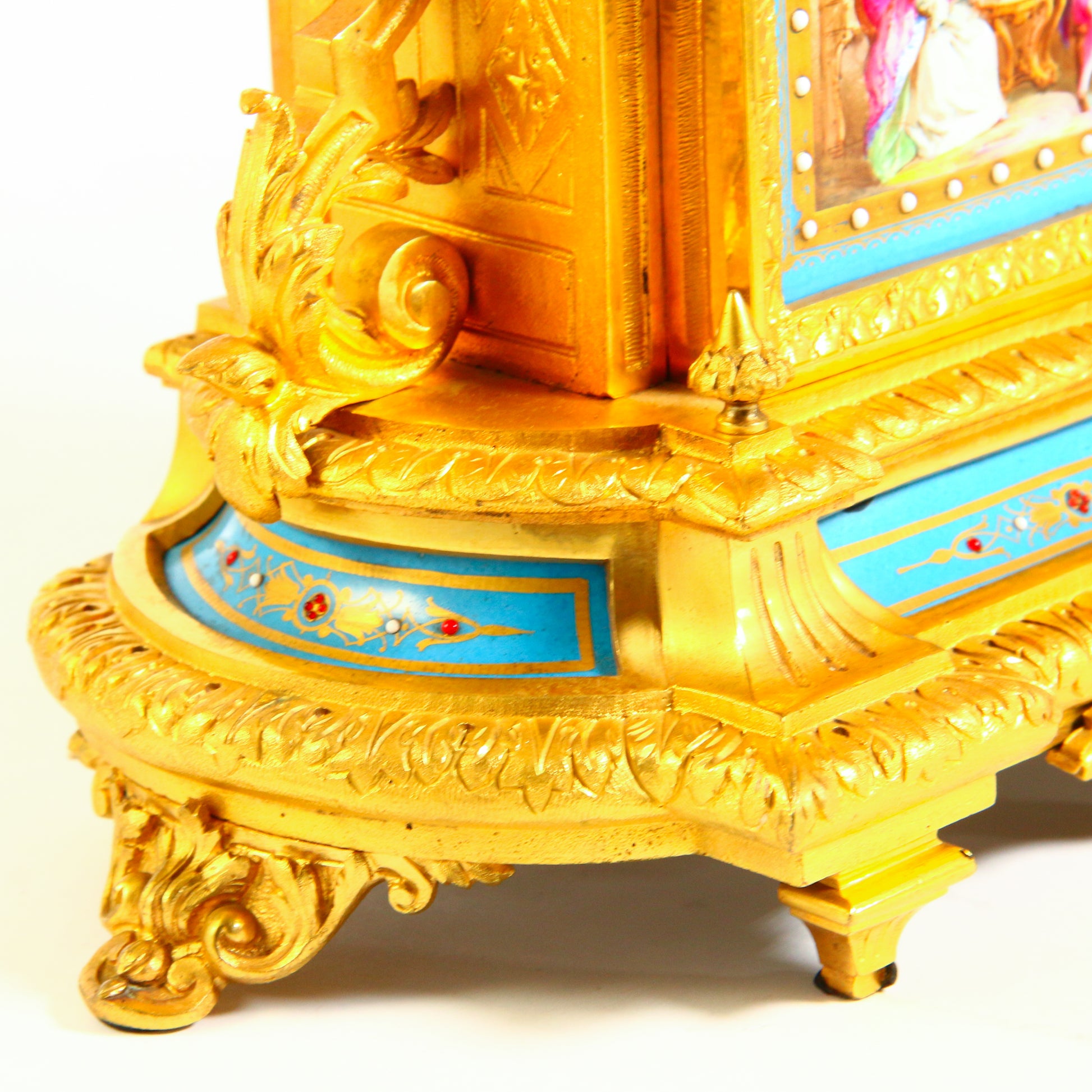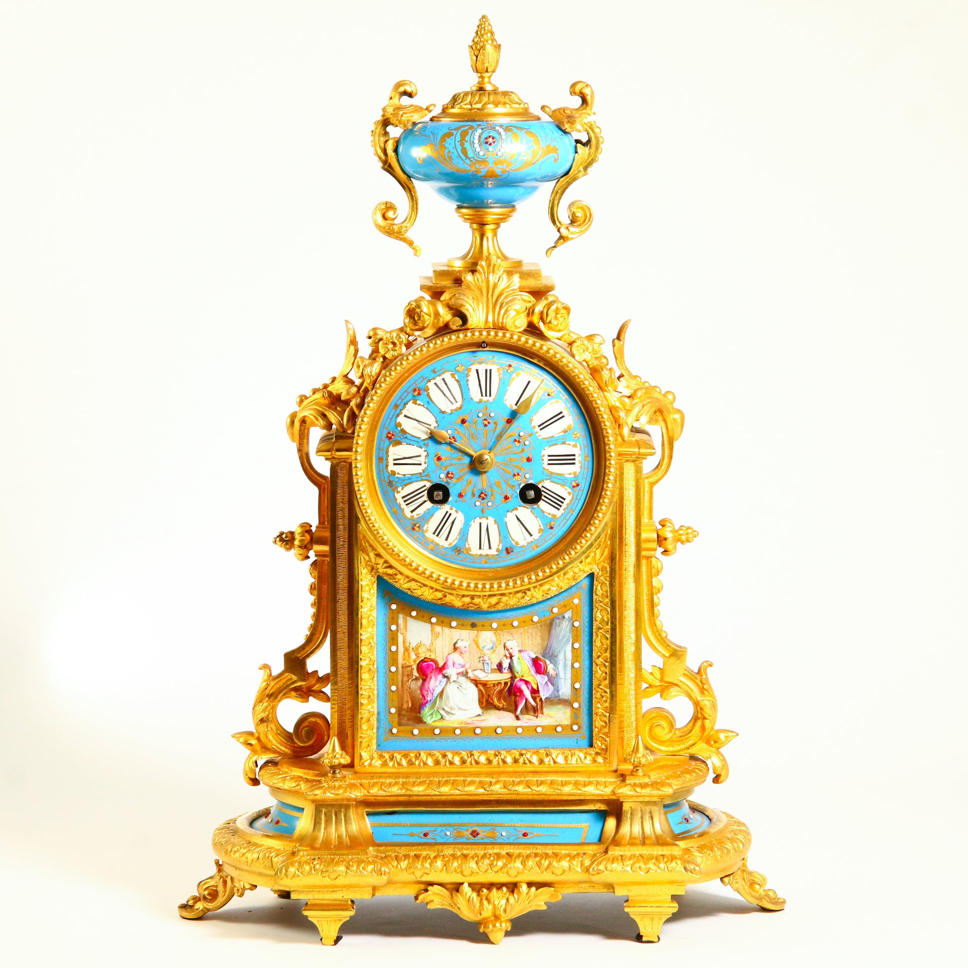 Antique French Gilt Bronze Ormolu Mantel Clock with Blue Porcelain Serves panels. Circa 1890.