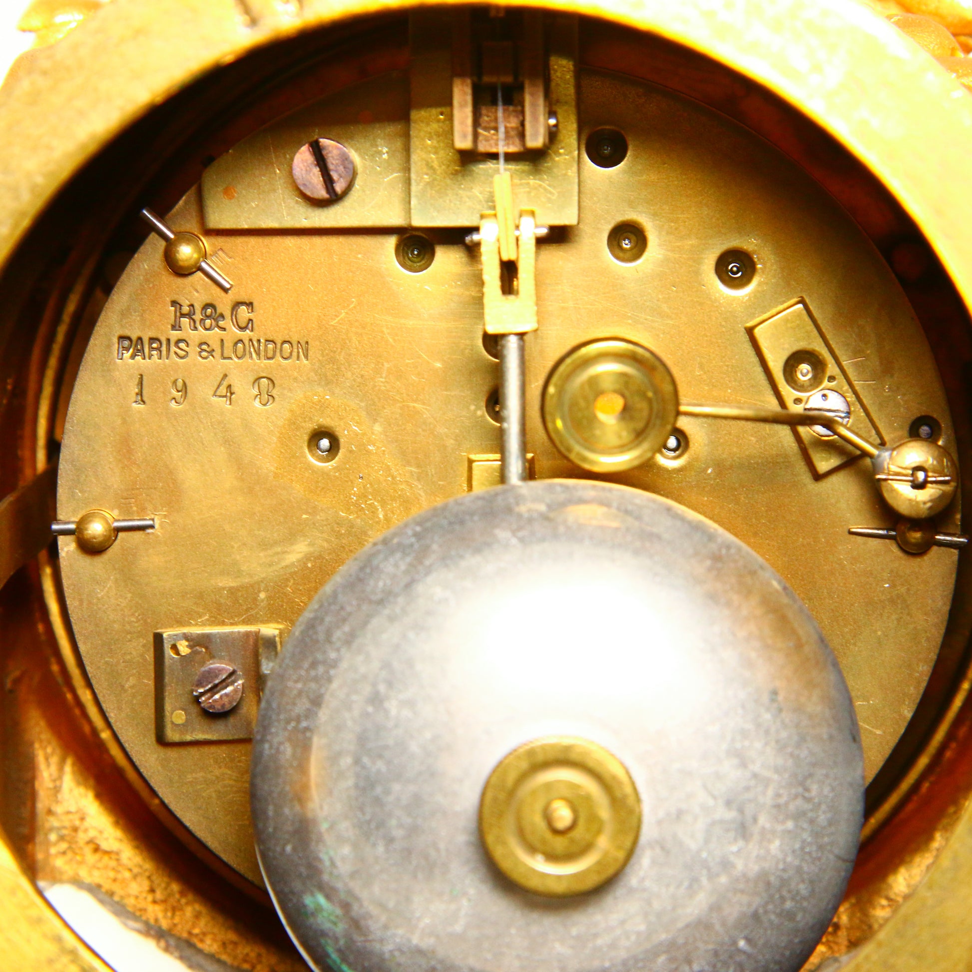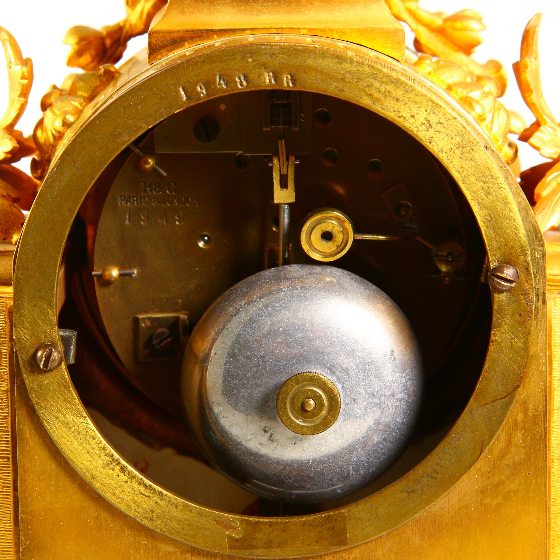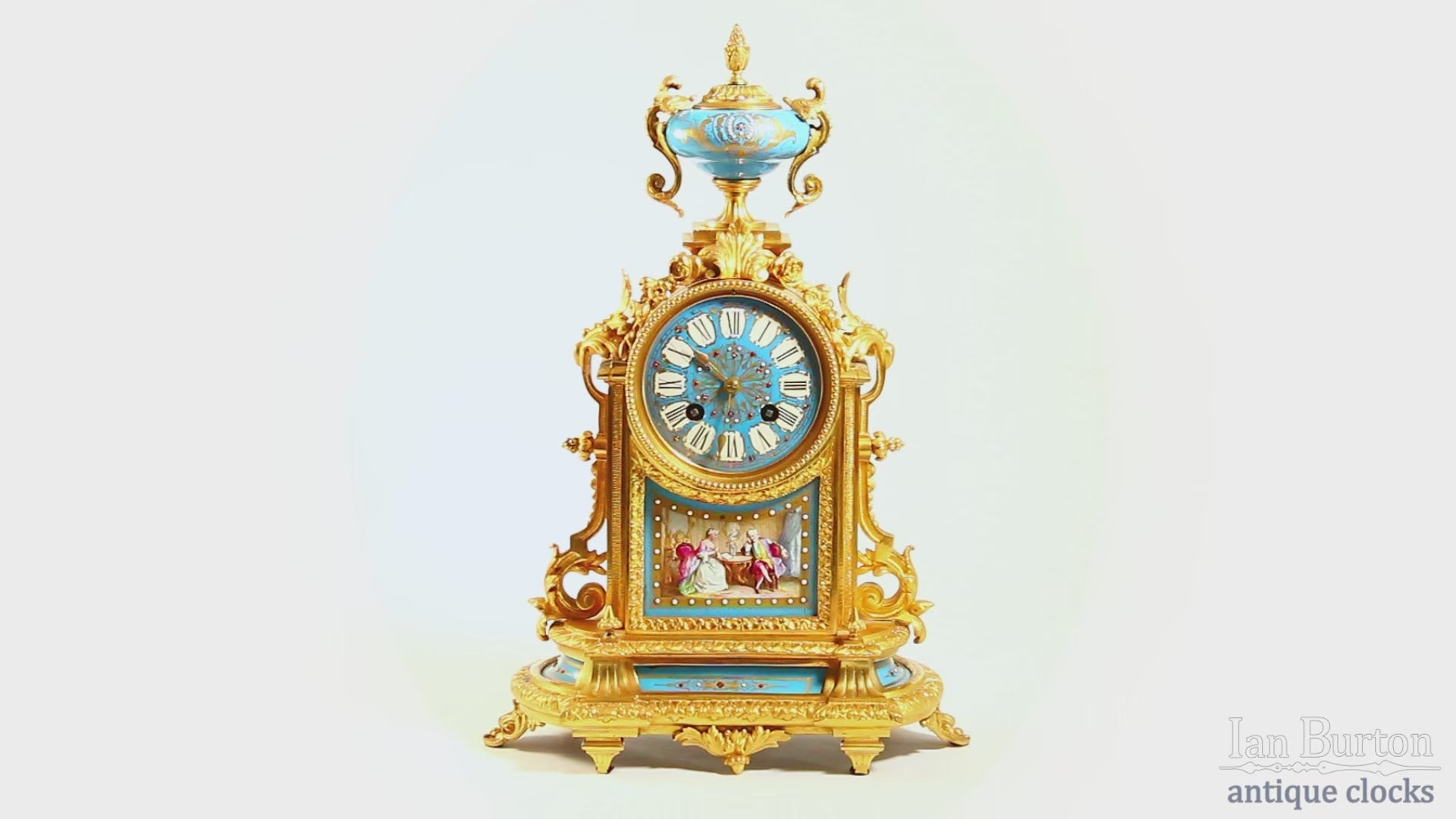 French, Japy Frere, marked H & C Paris & London and numbered 1948. The porcelain dial has gilt hands and Roman numerals, the porcelain is marked on the reverse of all the pieces, Hant. Collot. P. C. Curq. QR 55. The clock is in great original condition and runs as designed, although it does have a replacement pendulum.