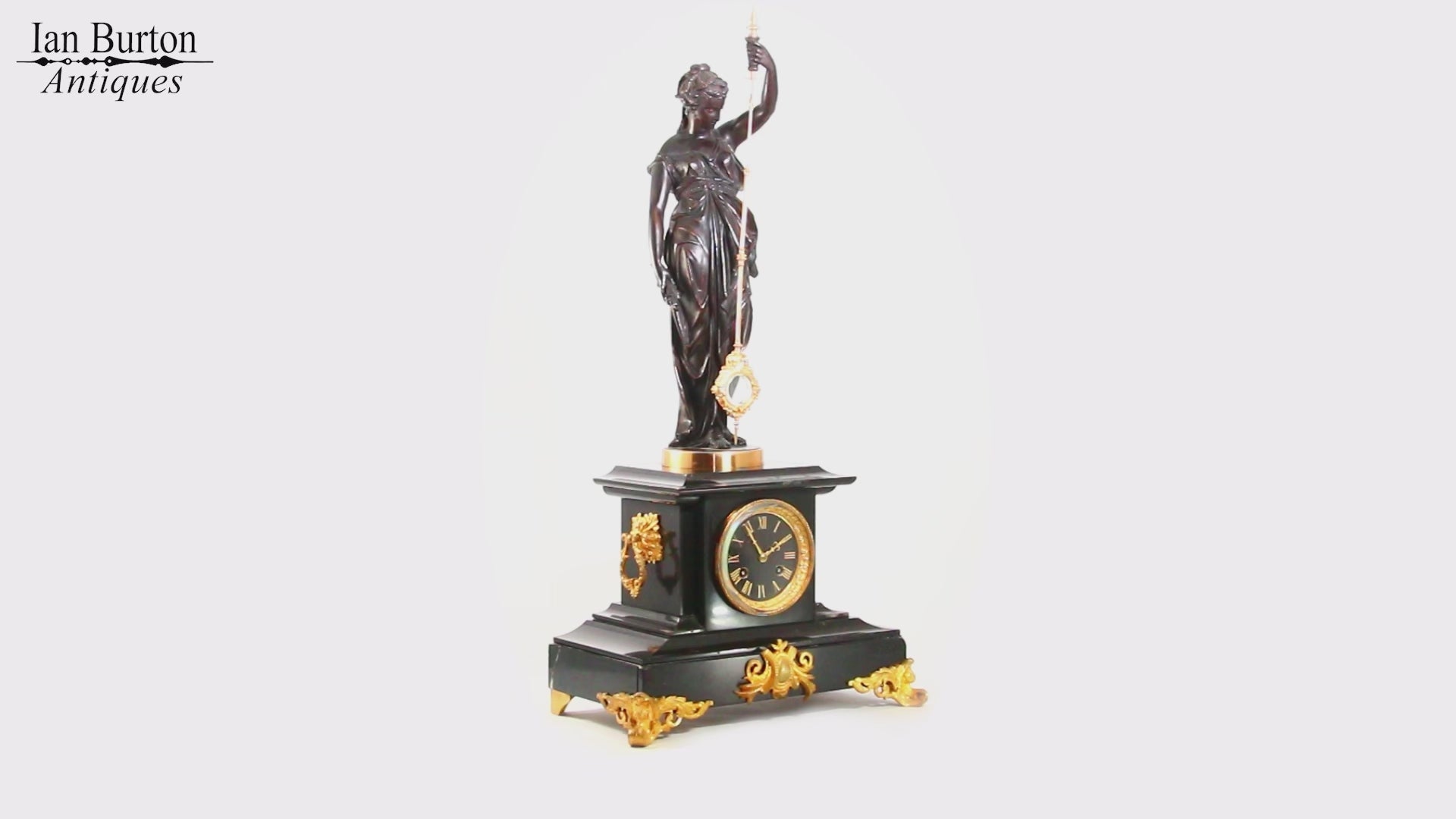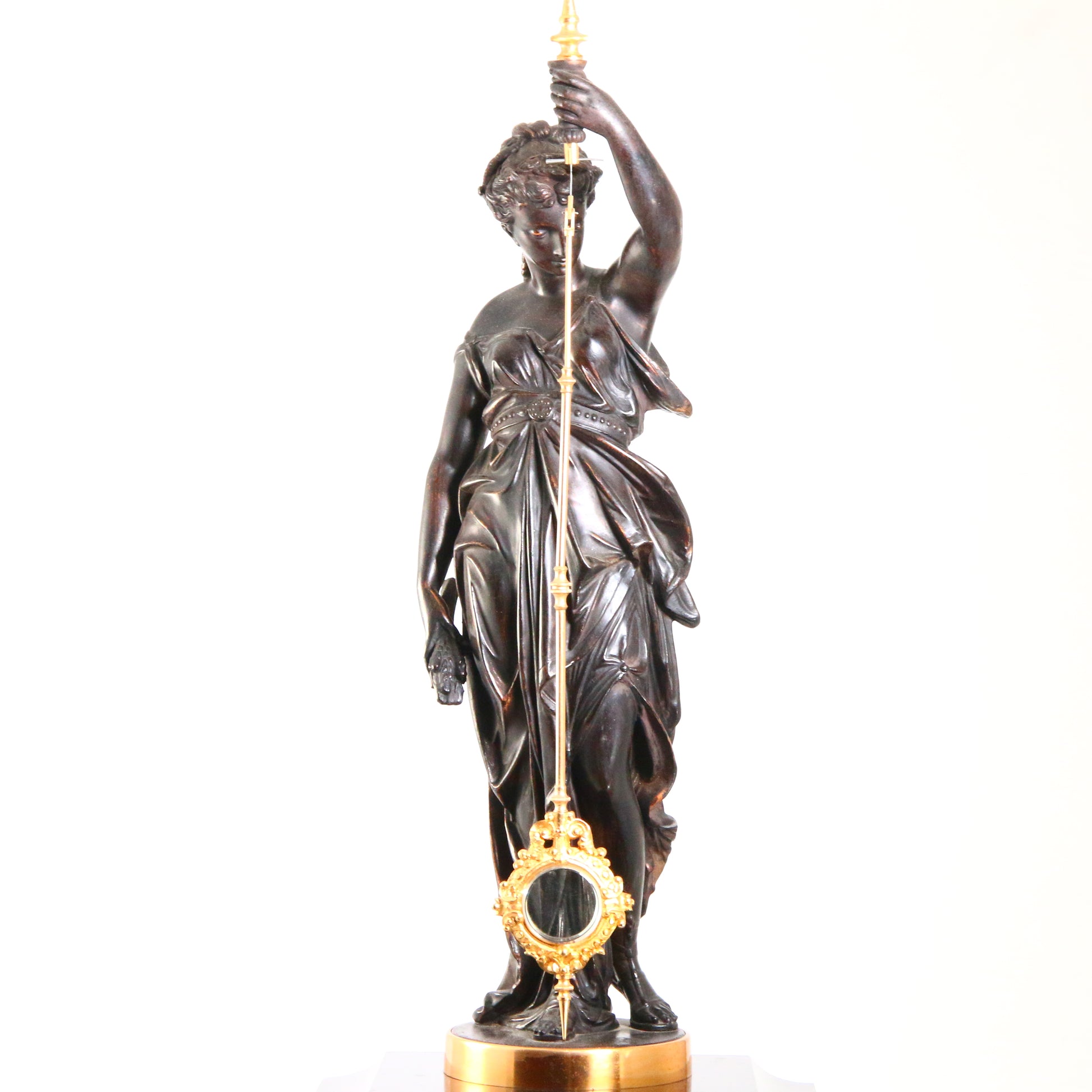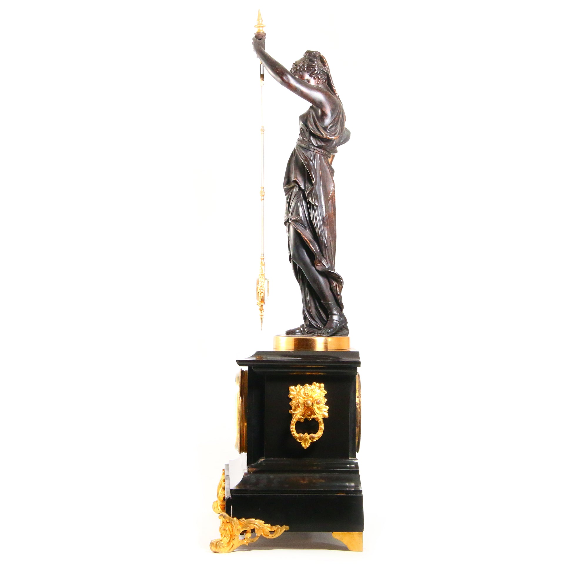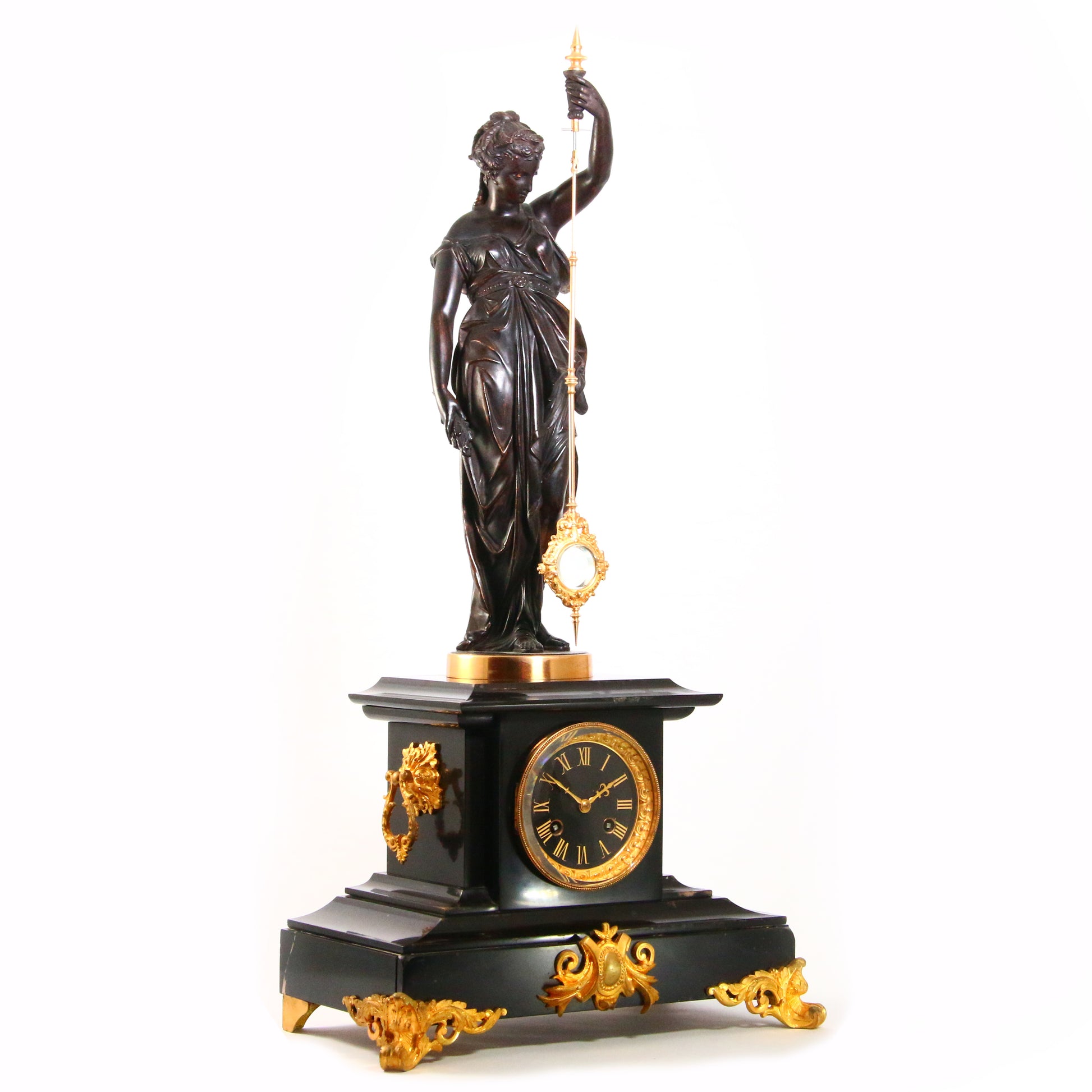 A beautiful French Antique Mystery Clock from the Victorian era. Standing on a black marble base the woman stands tall at 29.25 inches from the ground. Brilliantly detailed holding the pendulum as it swings and clasping a bail of wheat. The body stands on gilt decorated feet with centre floral shielded plinth with the dial just below the pendulum swing. The body features gilt ring carrying handles to either side. The Dial features black marble with gilt roman numerals incised into the 4 inch stone dial. The 8-day movement has an outside count wheel striking, chiming the hours and the halves on a bell.
