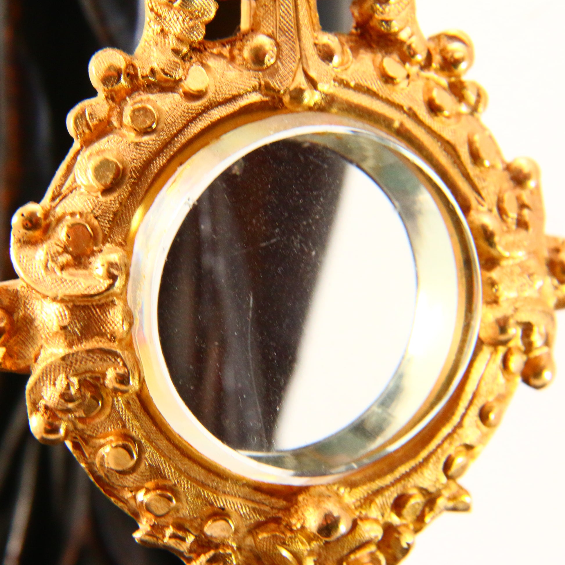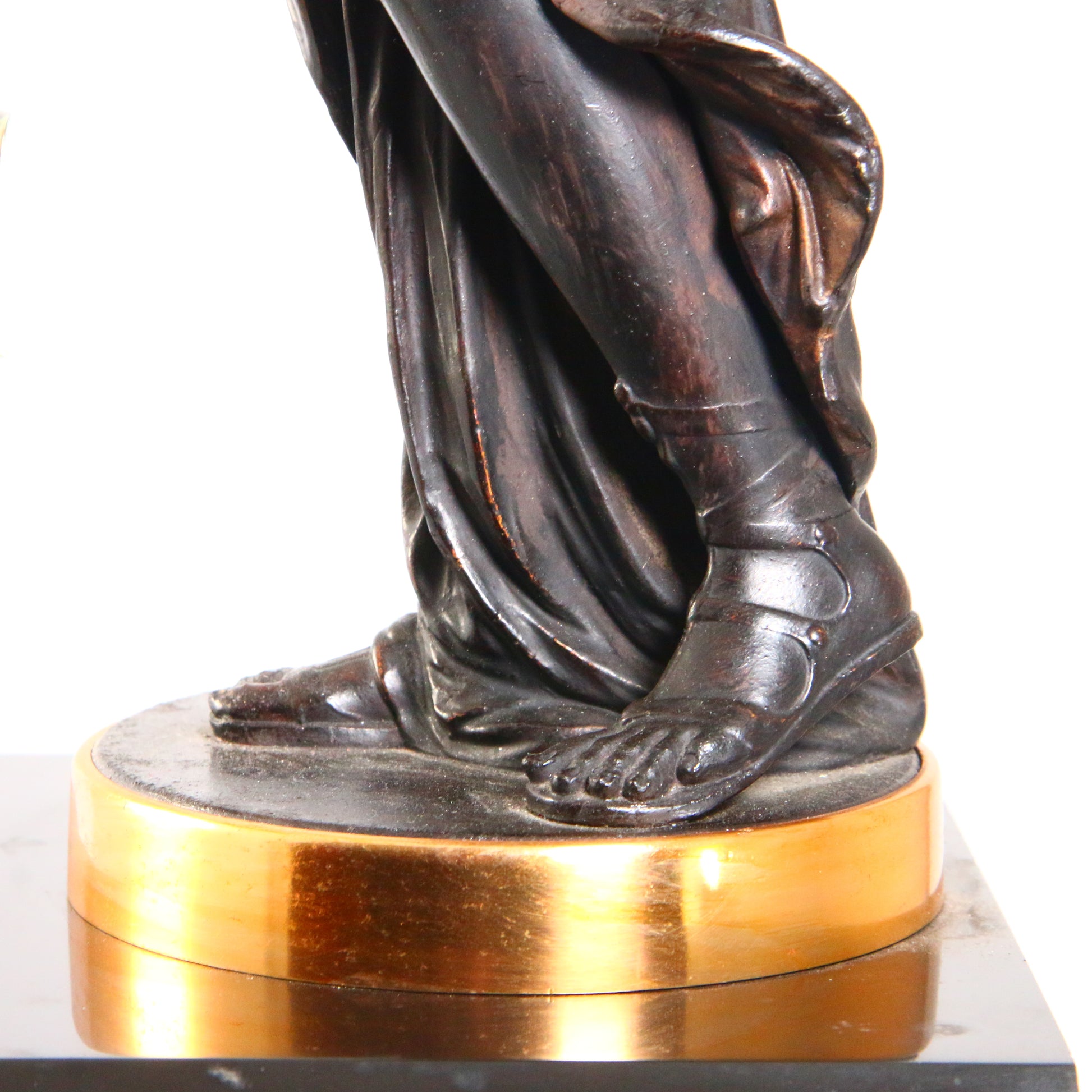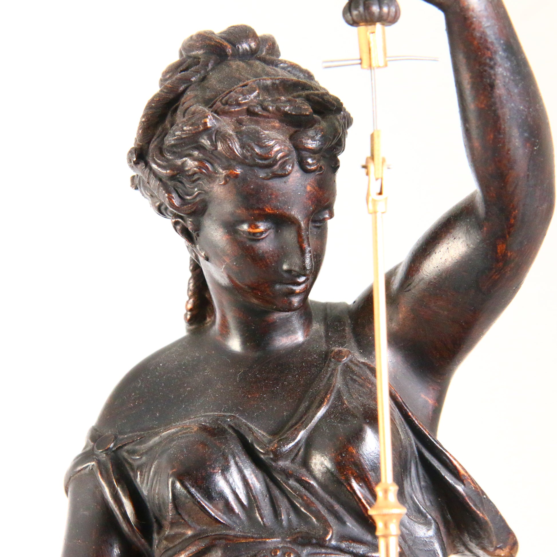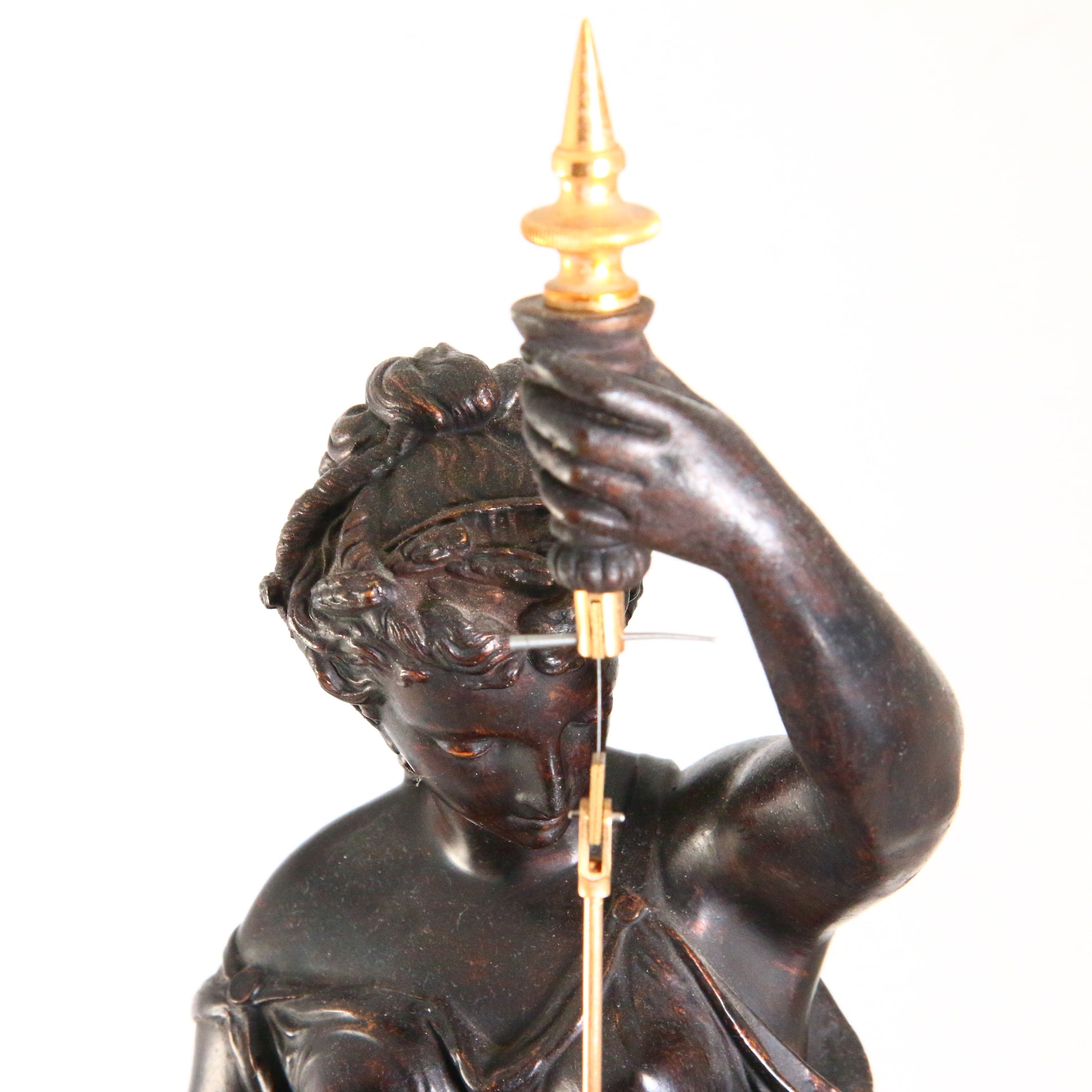 A beautiful French Antique Mystery Clock from the Victorian era. Standing on a black marble base the woman stands tall at 29.25 inches from the ground. Brilliantly detailed holding the pendulum as it swings and clasping a bail of wheat. The body stands on gilt decorated feet with centre floral shielded plinth with the dial just below the pendulum swing. The body features gilt ring carrying handles to either side. The Dial features black marble with gilt roman numerals incised into the 4 inch stone dial. The 8-day movement has an outside count wheel striking, chiming the hours and the halves on a bell.