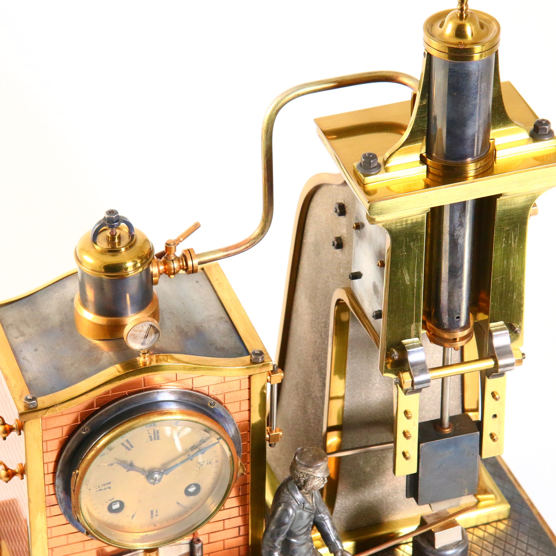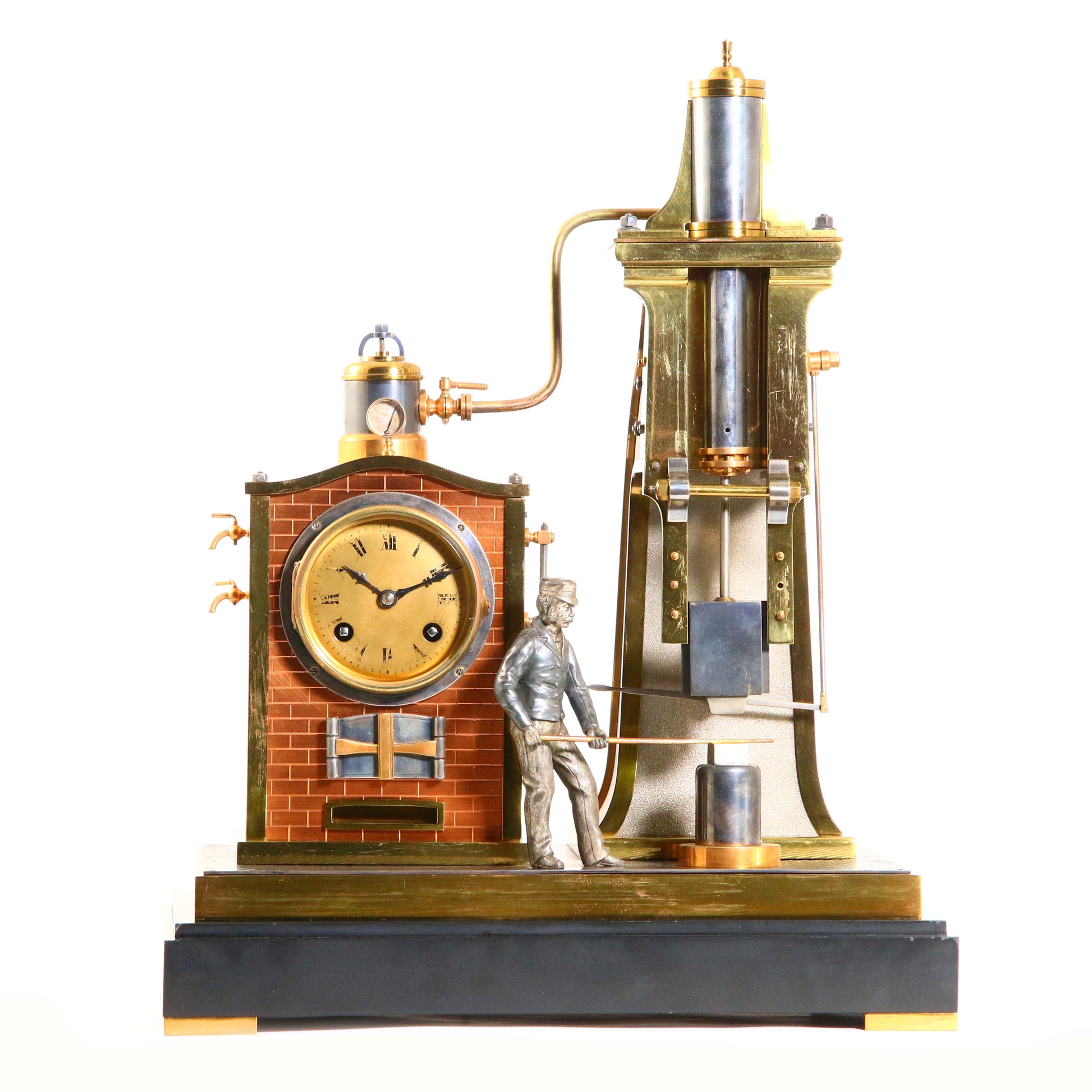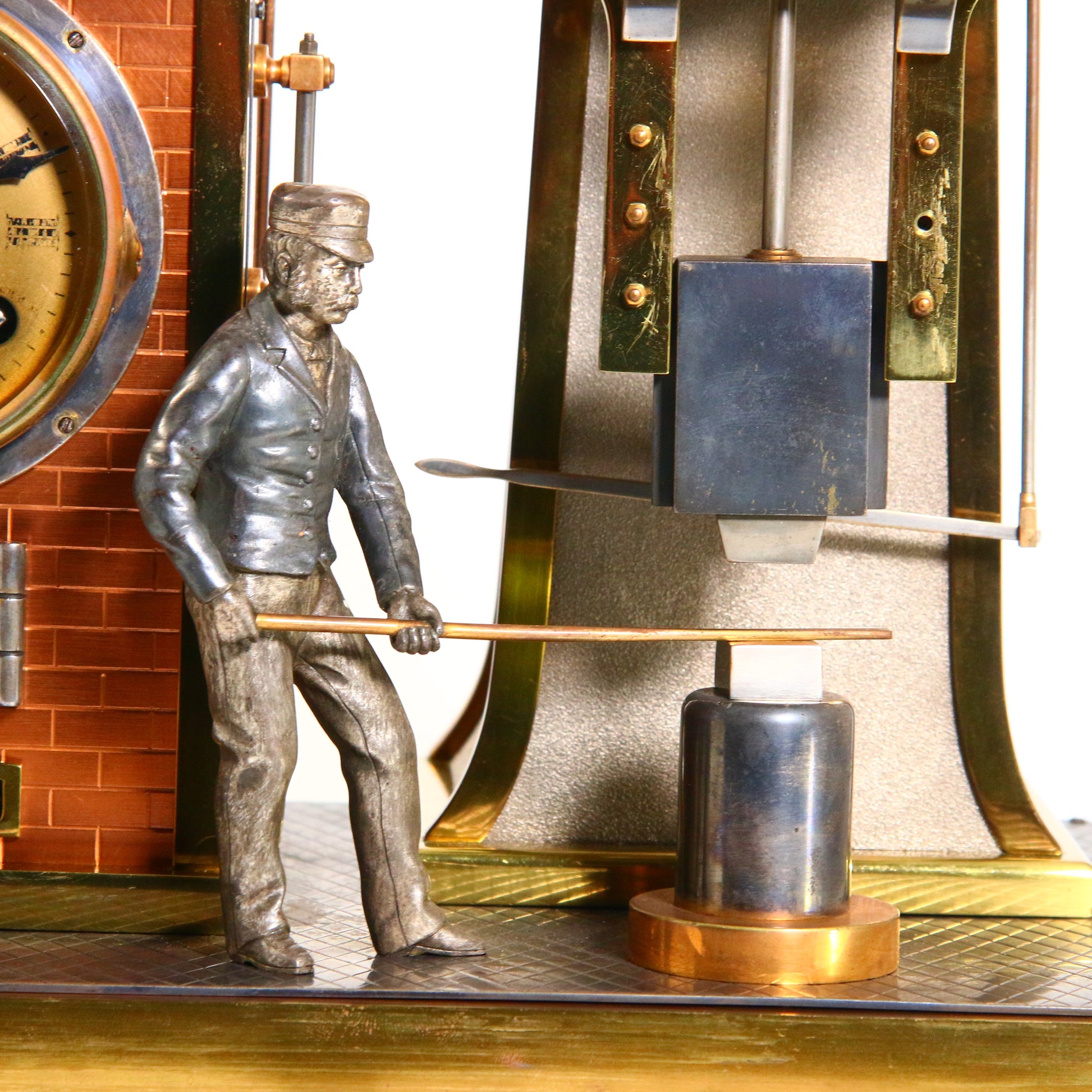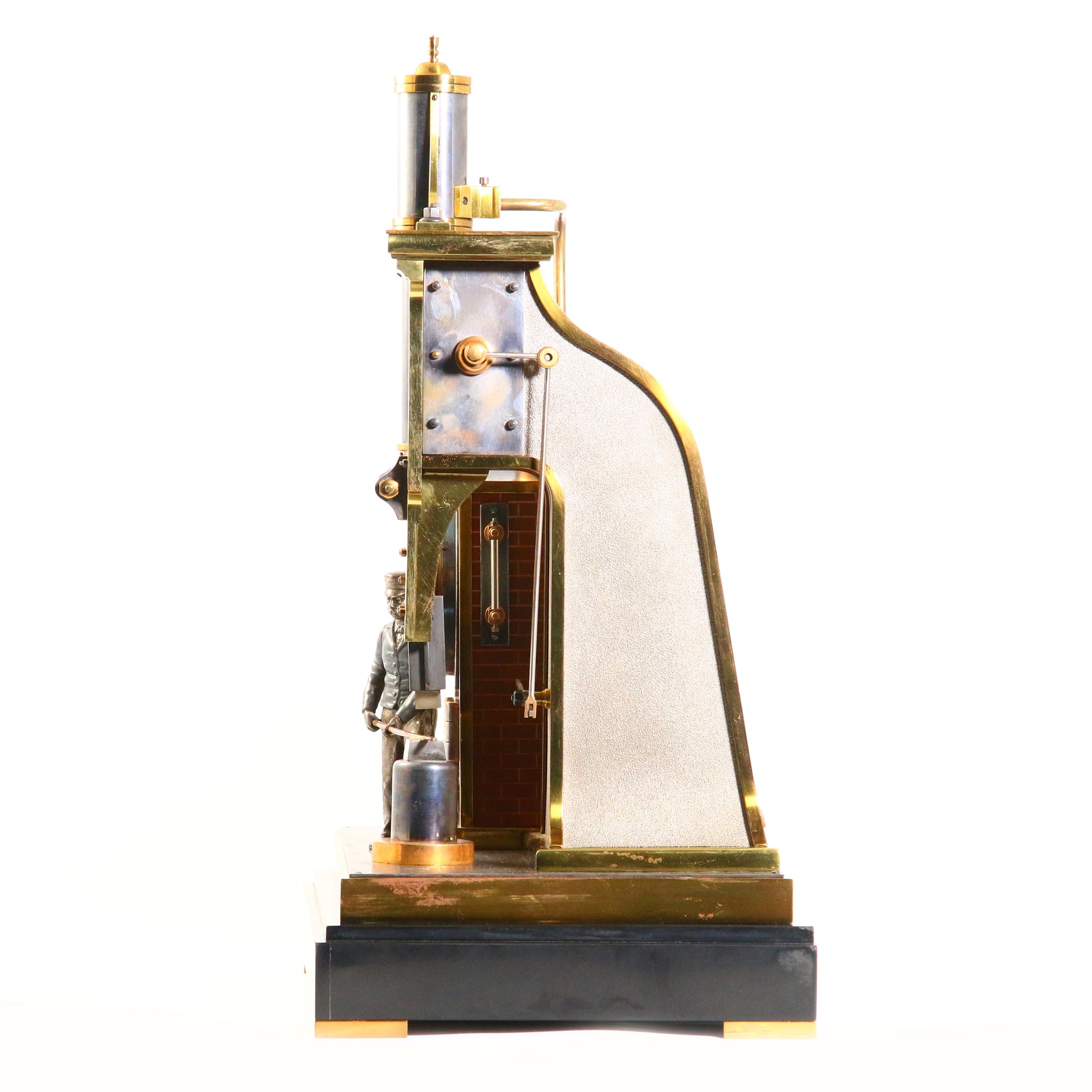 The case realistically depicts an metal worker in cap, trousers and jacket forming a bar of brass at the anvil, the bar's far edge flattened by the constant vertical motion of the hammer which is set in the large piston assembly to the right. The red-brick boiler to the left behind him with door, taps and pressure gauge set with the clock dial and containing the clock movement. All mounted on a patinated tiled floor and set on a brass plinth, supported by a black marble plinth.