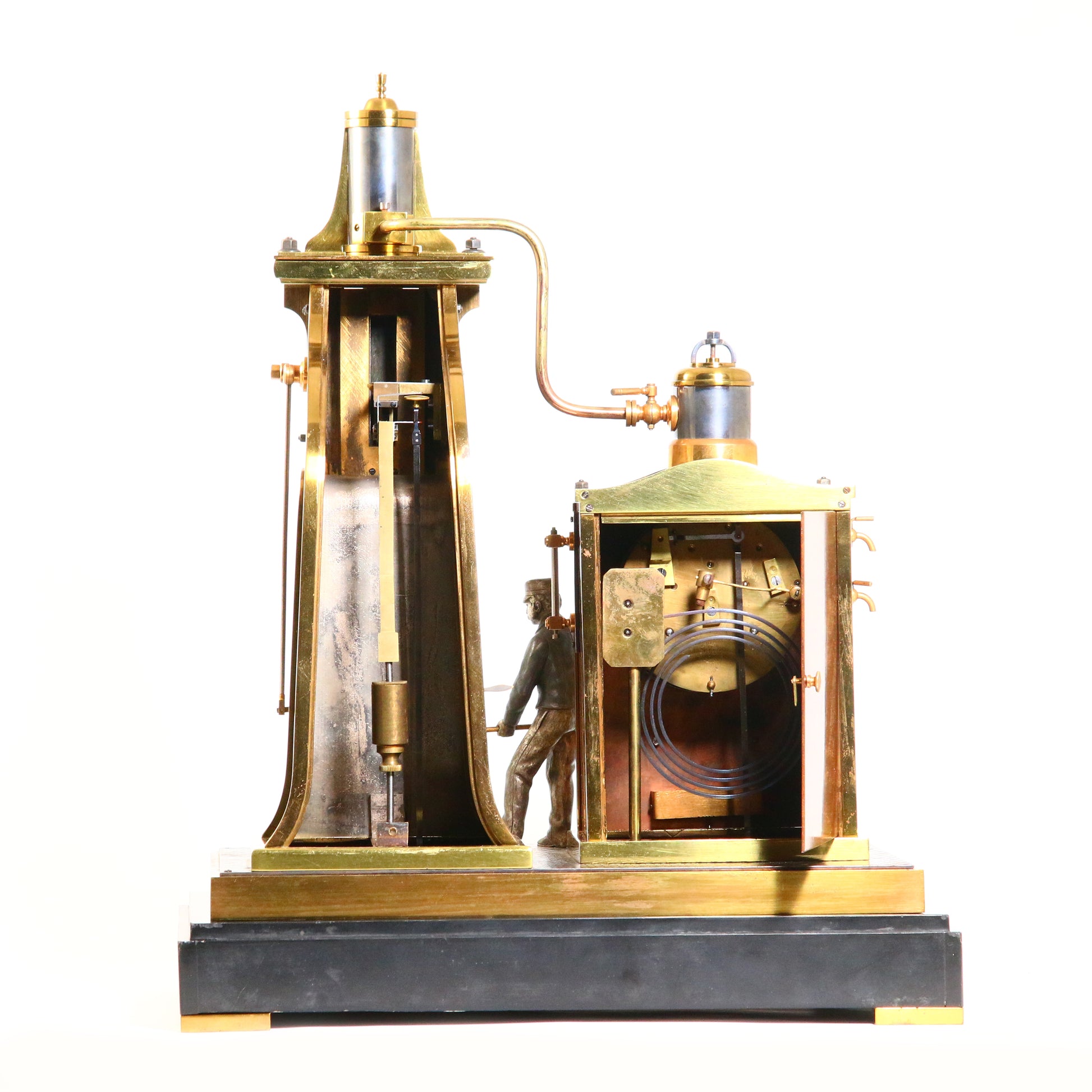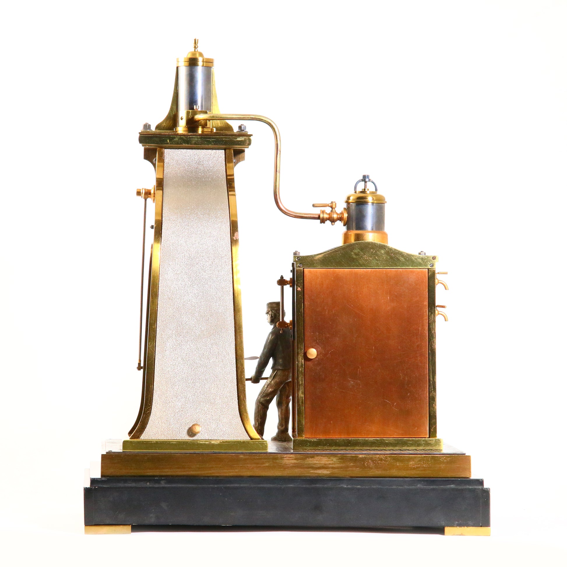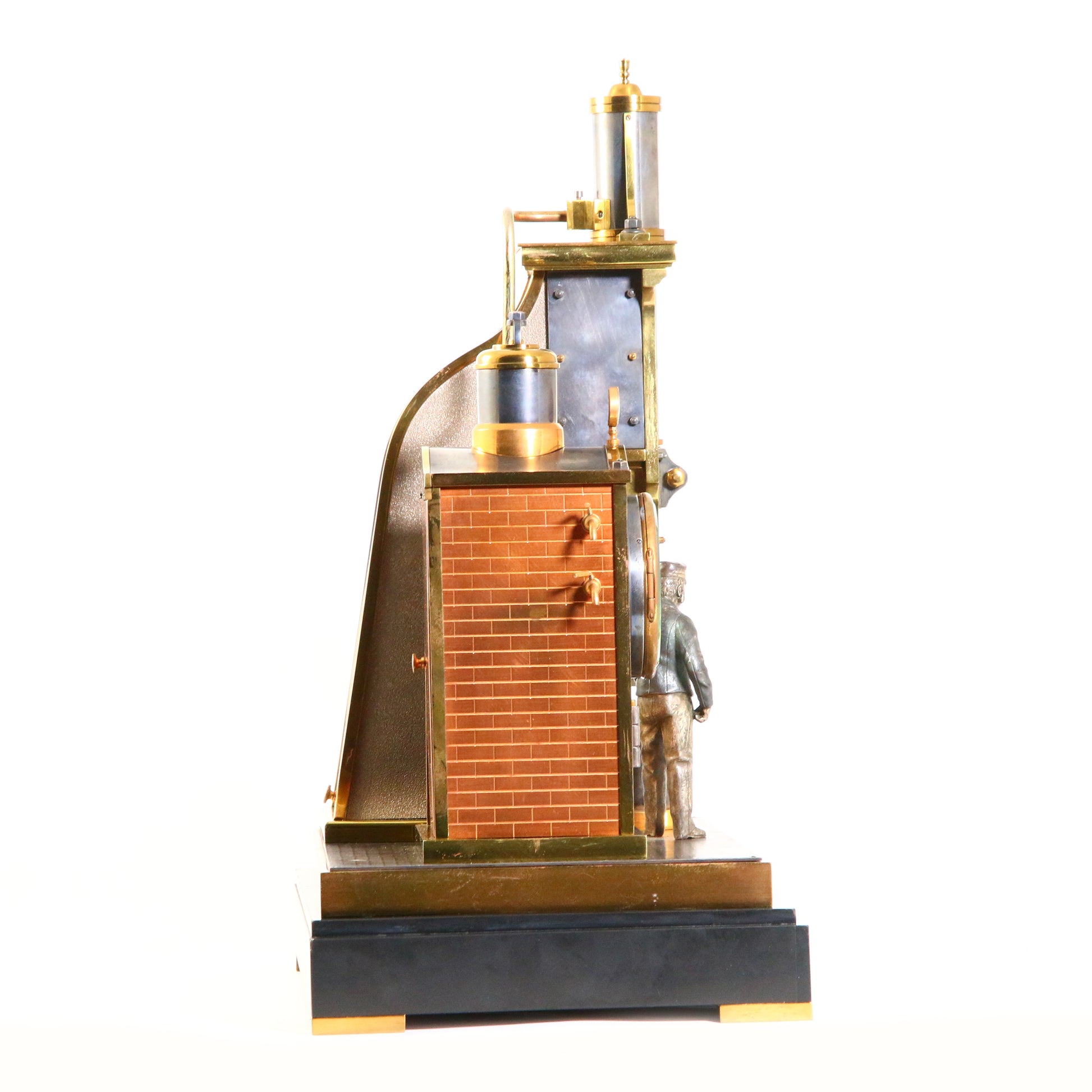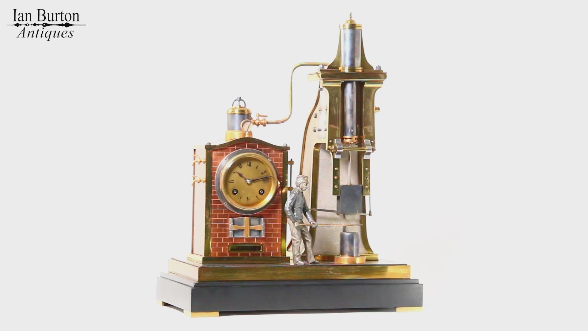 The case realistically depicts an metal worker in cap, trousers and jacket forming a bar of brass at the anvil, the bar's far edge flattened by the constant vertical motion of the hammer which is set in the large piston assembly to the right. The red-brick boiler to the left behind him with door, taps and pressure gauge set with the clock dial and containing the clock movement. All mounted on a patinated tiled floor and set on a brass plinth, supported by a black marble plinth.