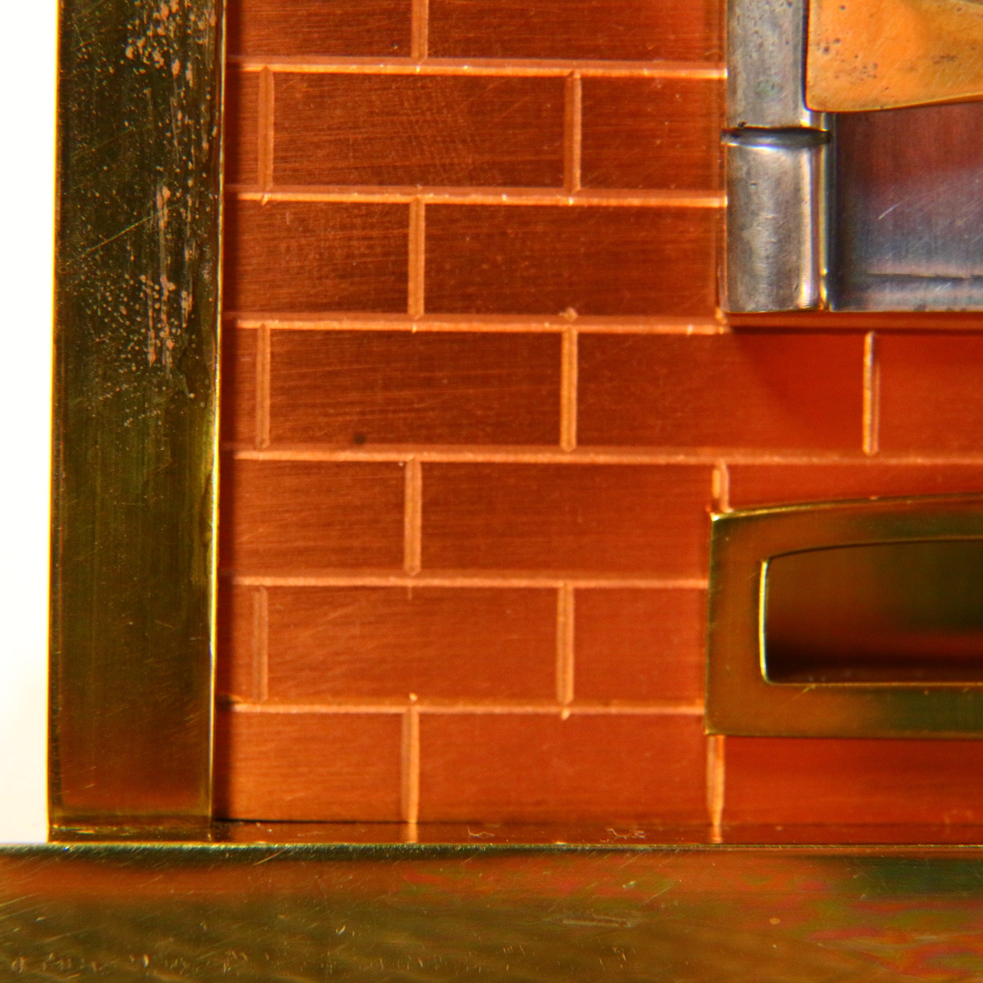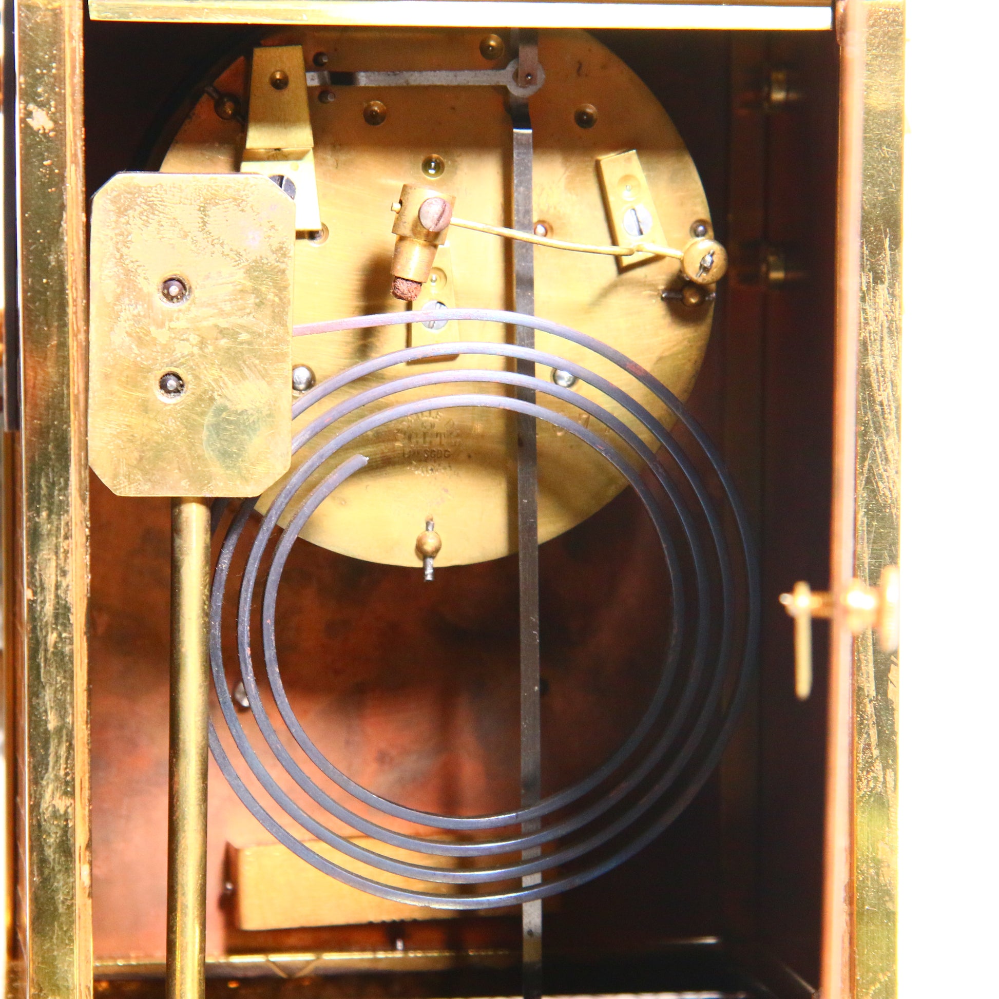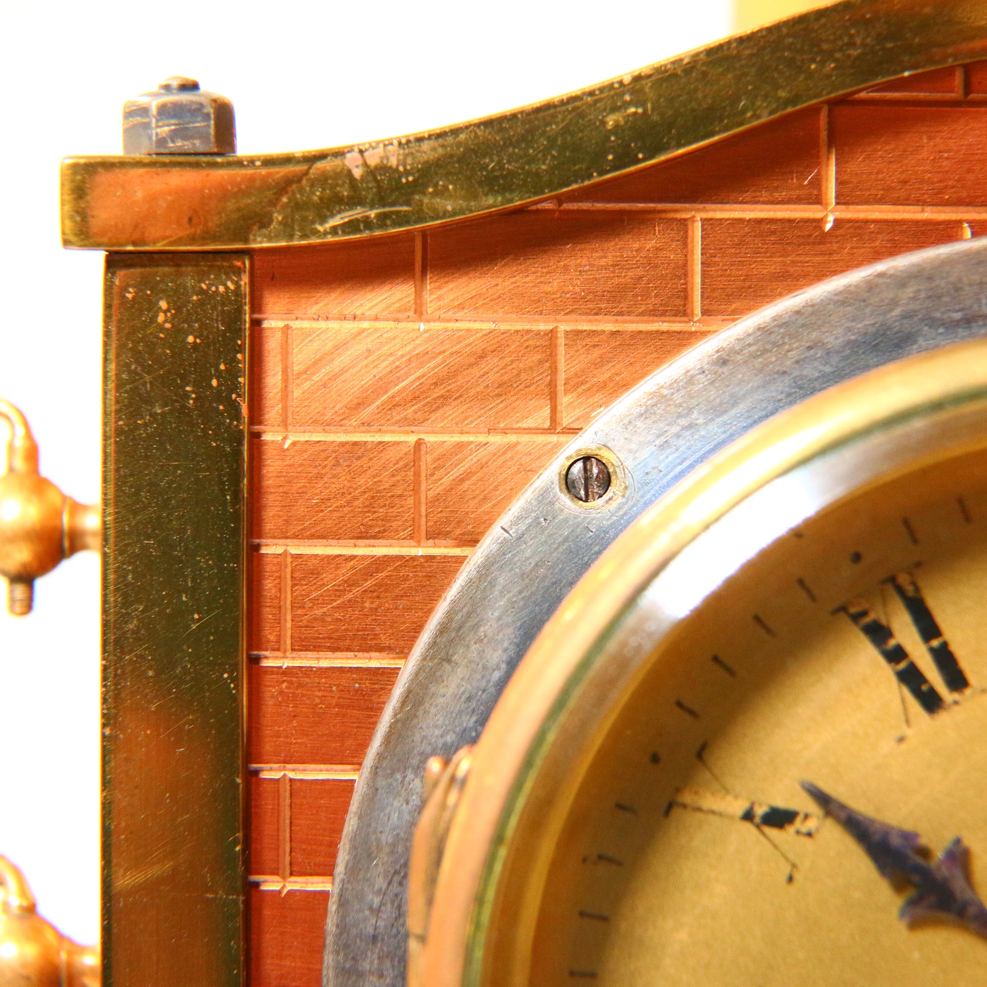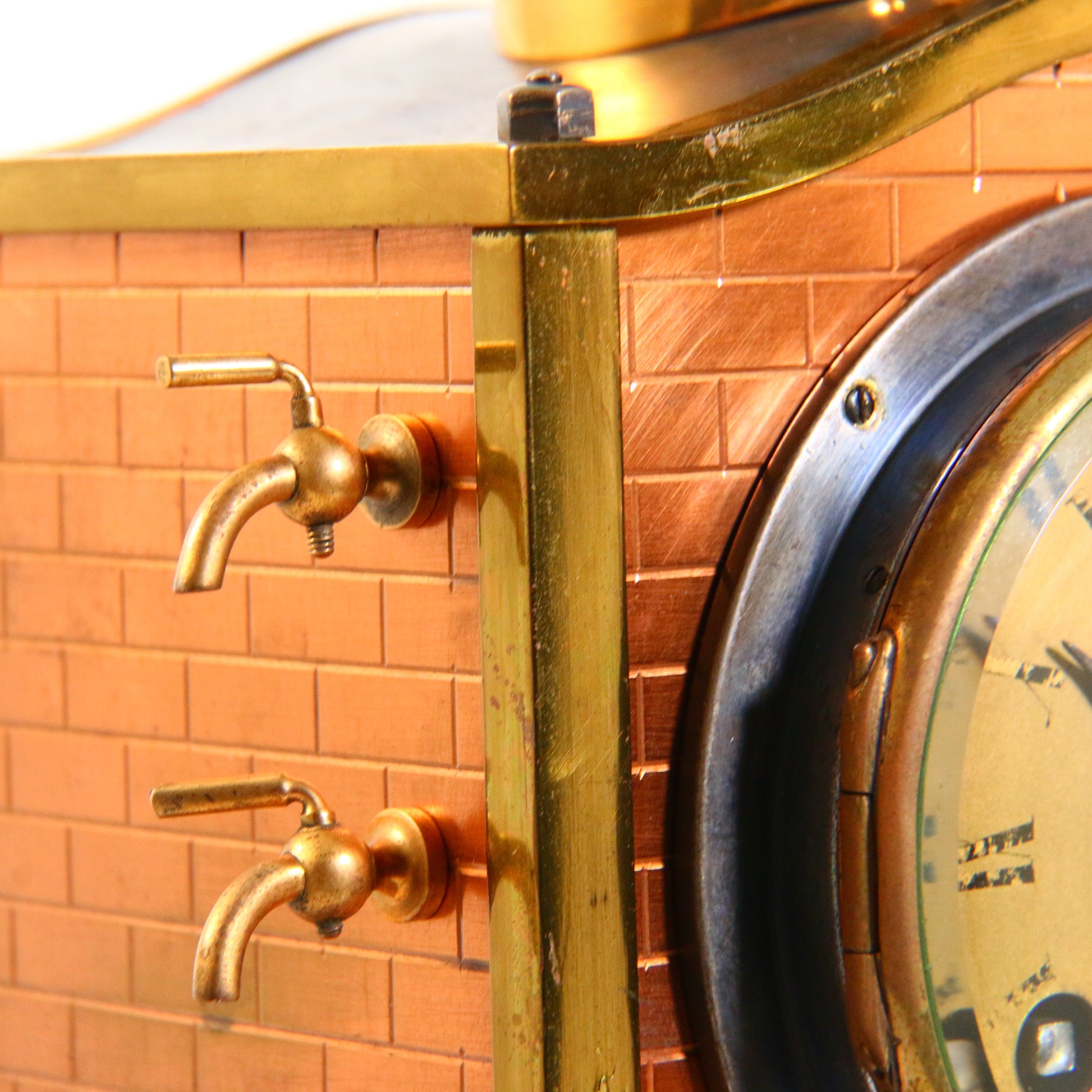 The case realistically depicts an metal worker in cap, trousers and jacket forming a bar of brass at the anvil, the bar's far edge flattened by the constant vertical motion of the hammer which is set in the large piston assembly to the right. The red-brick boiler to the left behind him with door, taps and pressure gauge set with the clock dial and containing the clock movement. All mounted on a patinated tiled floor and set on a brass plinth, supported by a black marble plinth.