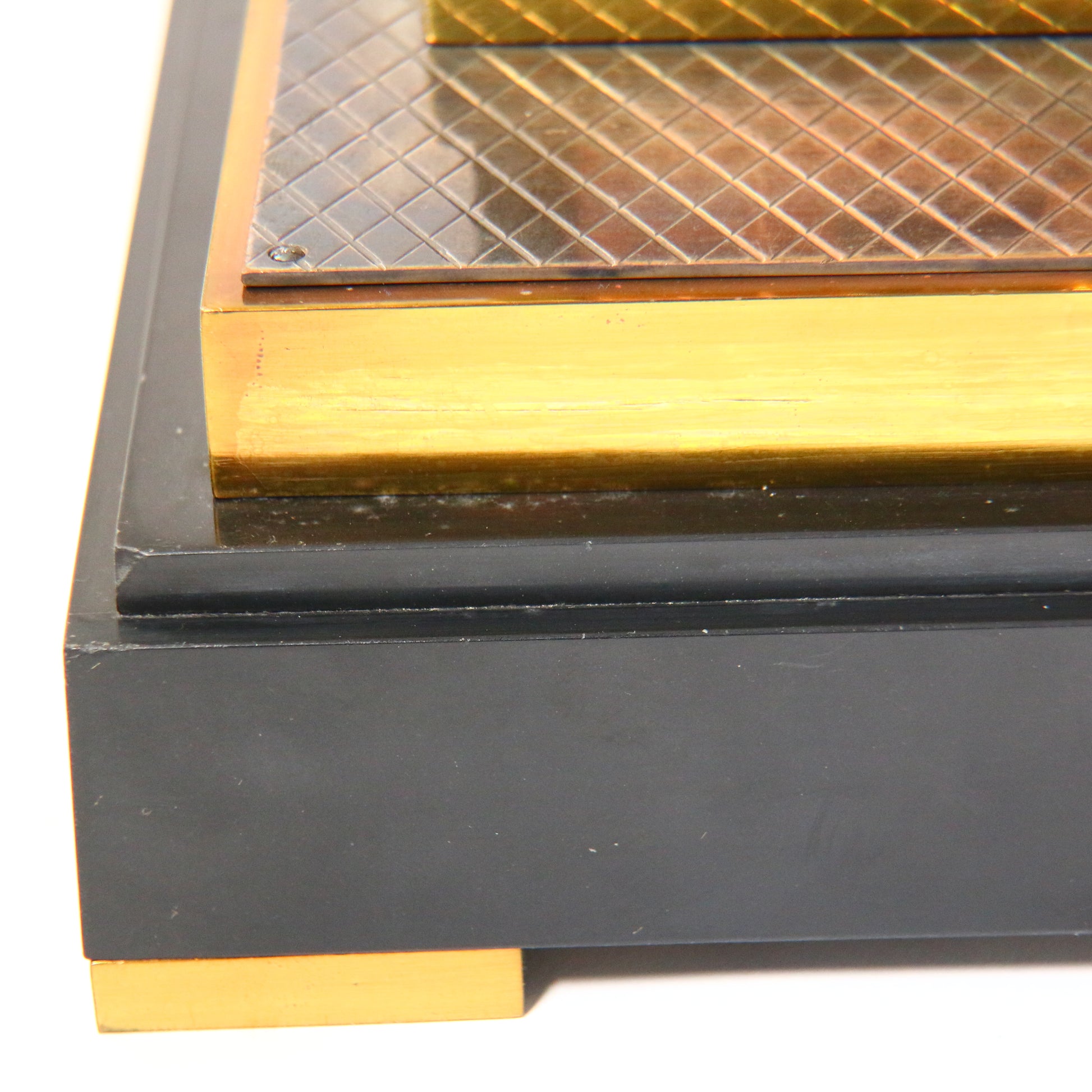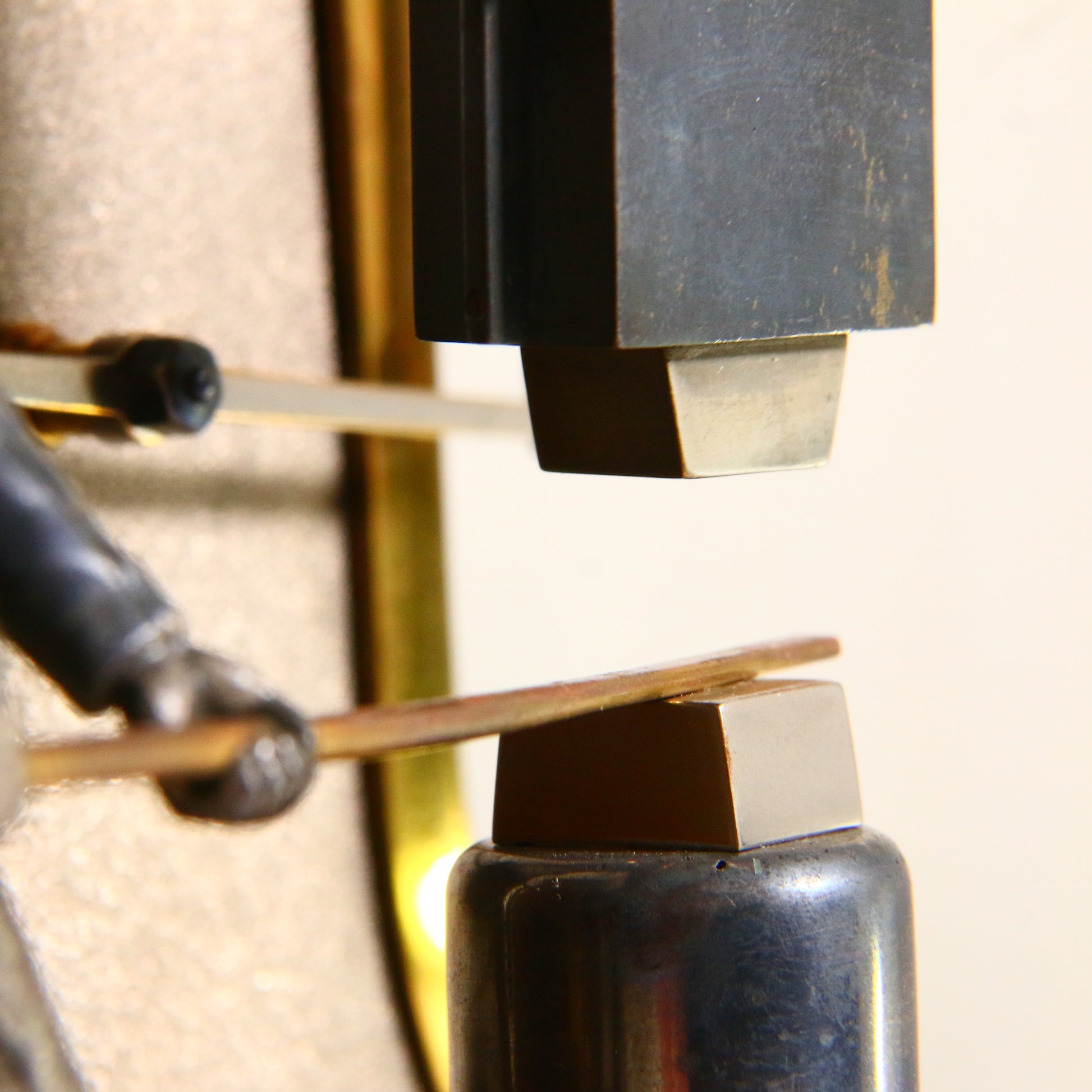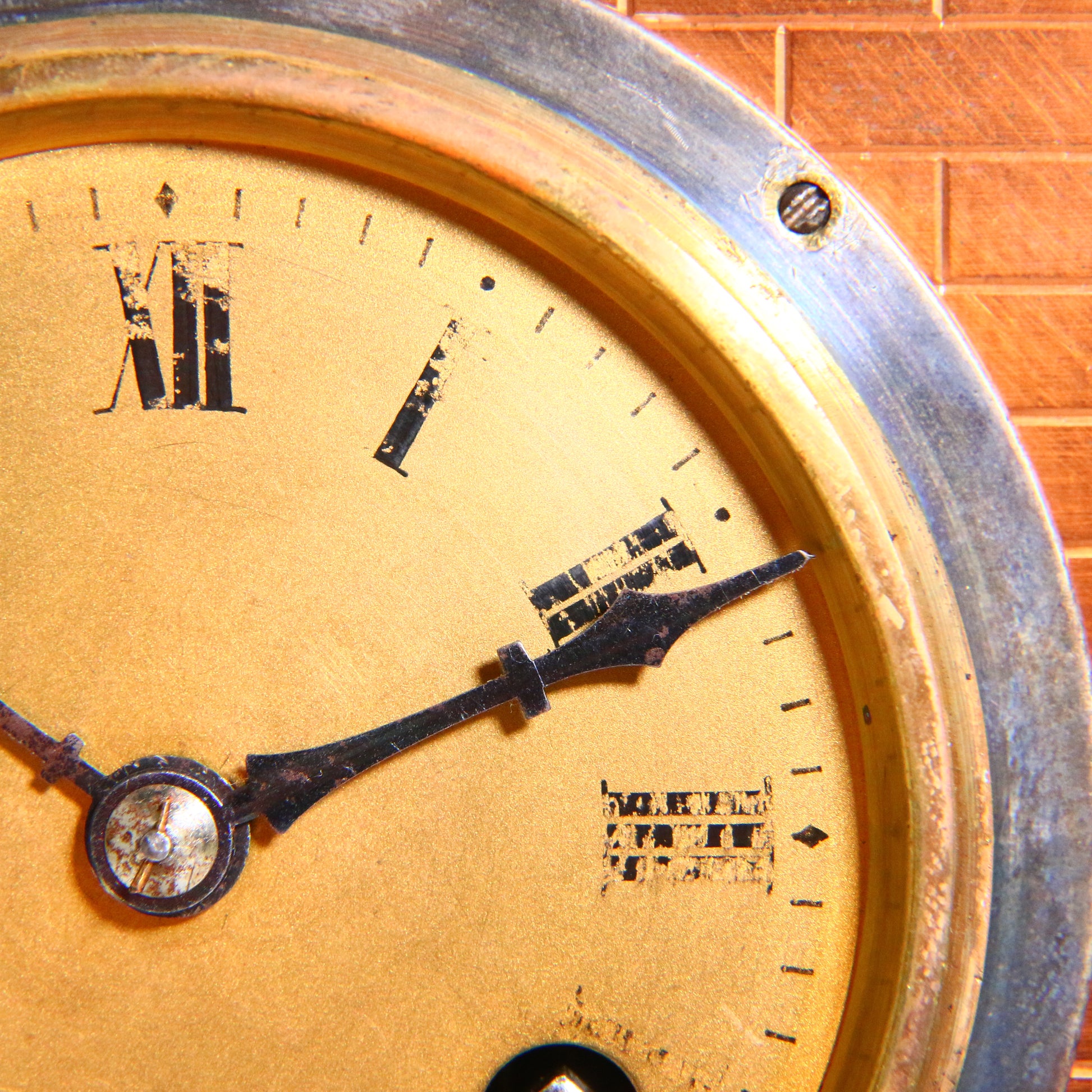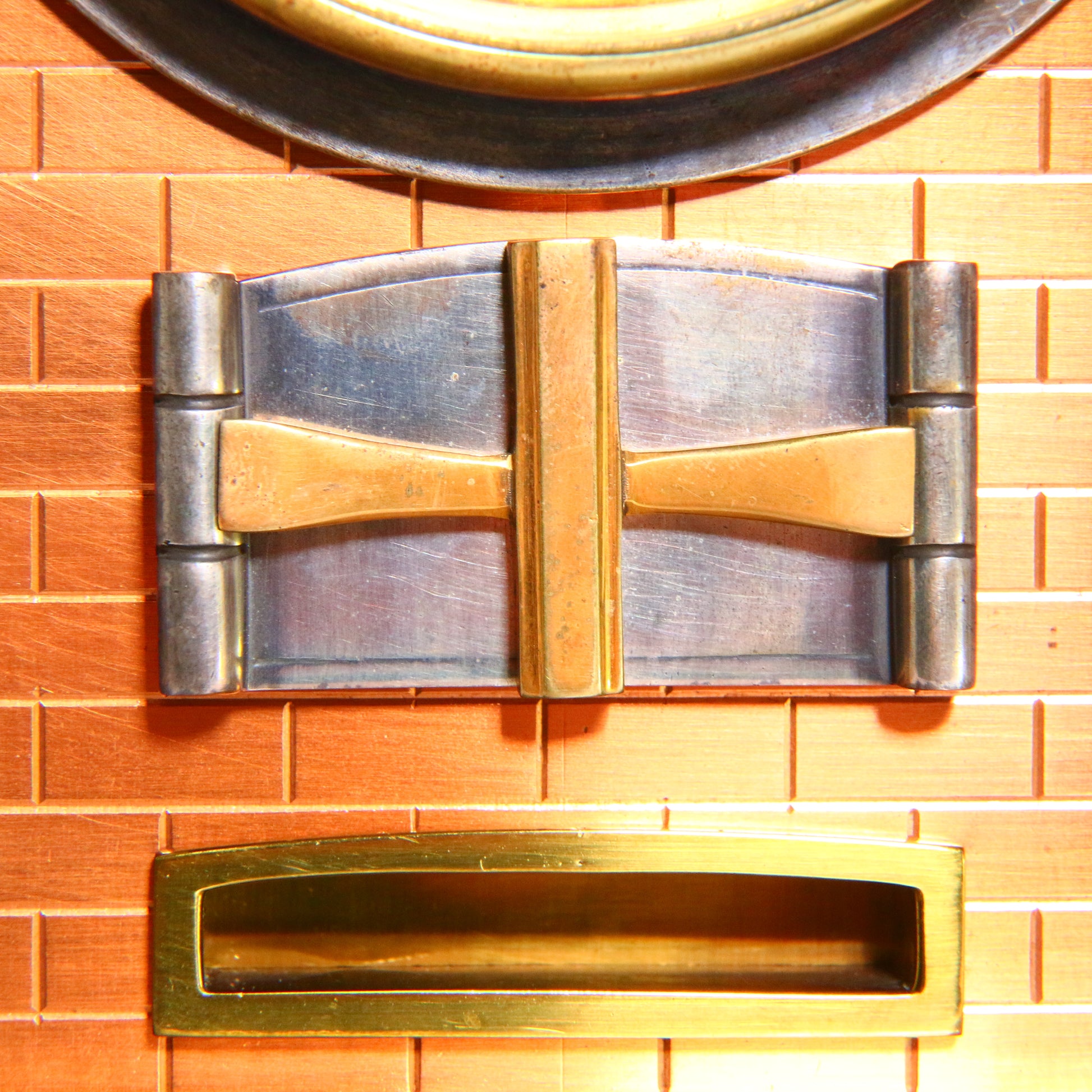 The case realistically depicts an metal worker in cap, trousers and jacket forming a bar of brass at the anvil, the bar's far edge flattened by the constant vertical motion of the hammer which is set in the large piston assembly to the right. The red-brick boiler to the left behind him with door, taps and pressure gauge set with the clock dial and containing the clock movement. All mounted on a patinated tiled floor and set on a brass plinth, supported by a black marble plinth.