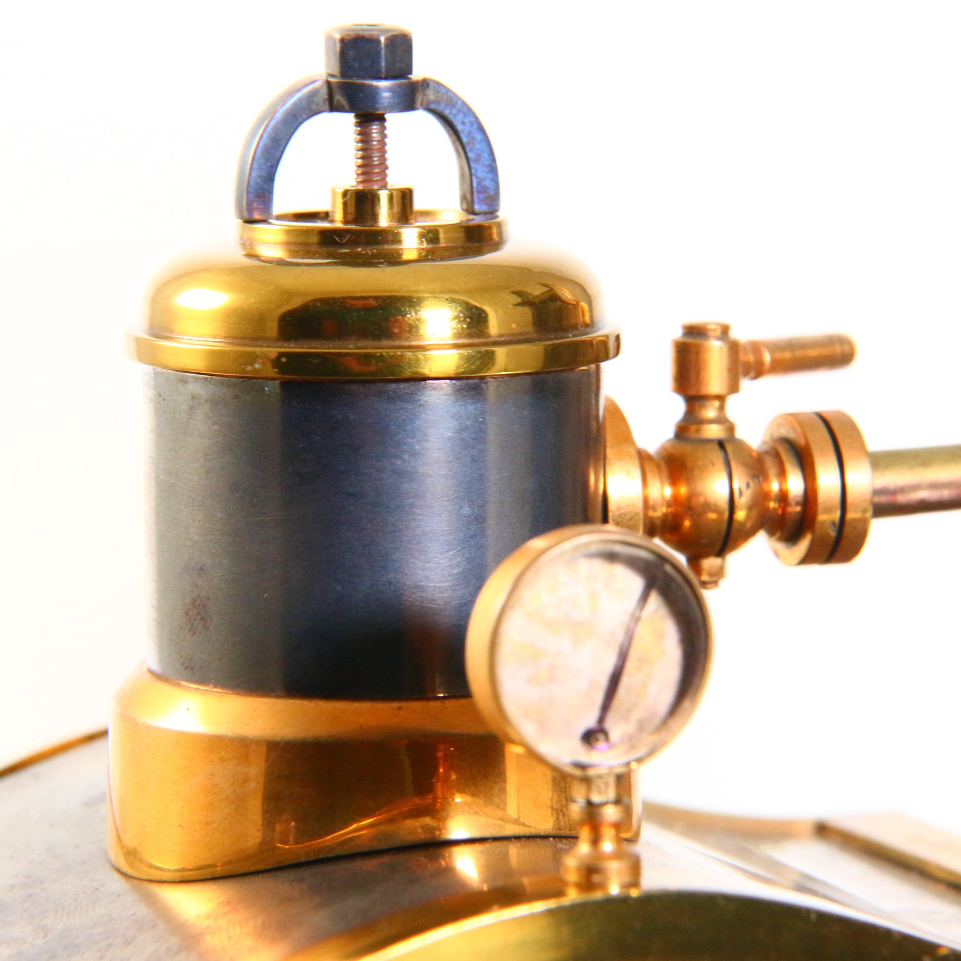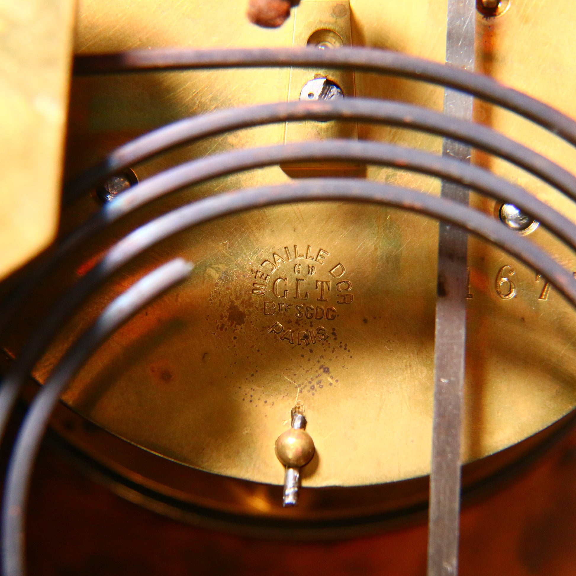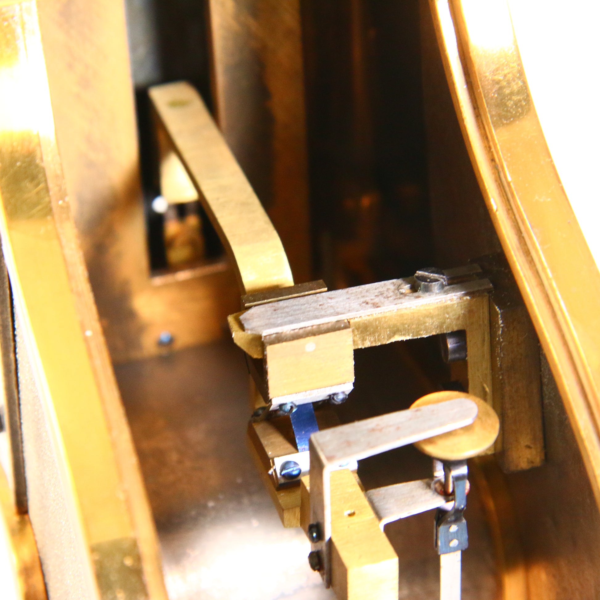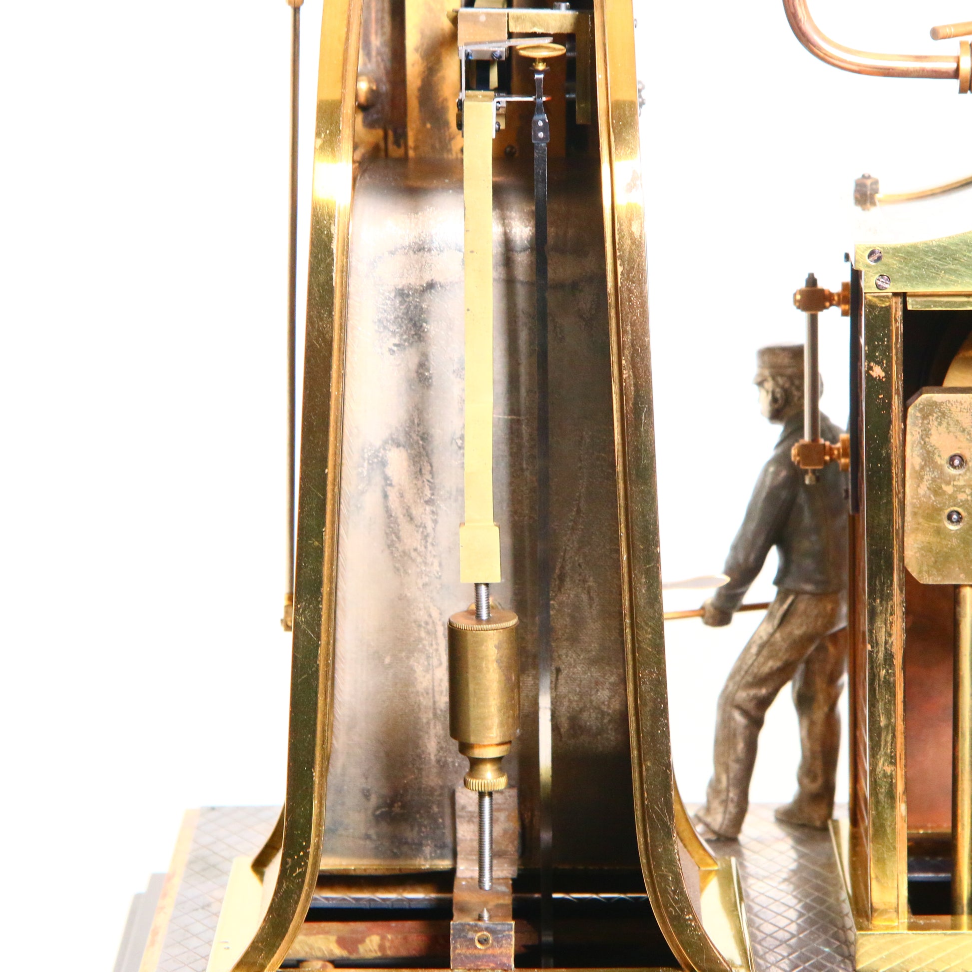 The French twin spring barrel 8-day movement housed in the boilerhouse, striking the hours and halves on a gong, with anchor escapement, the back plate stamped GLT for Guilmet and numbered 1677. The steamhammer which is part of the compound pendulum moves vertically up and down to the front. The pendulum in the rear of the steamhammer receives it's propulsion remotely from the clock movement by a series of levers, it is adjusted for time at the bottom of the pendulum.