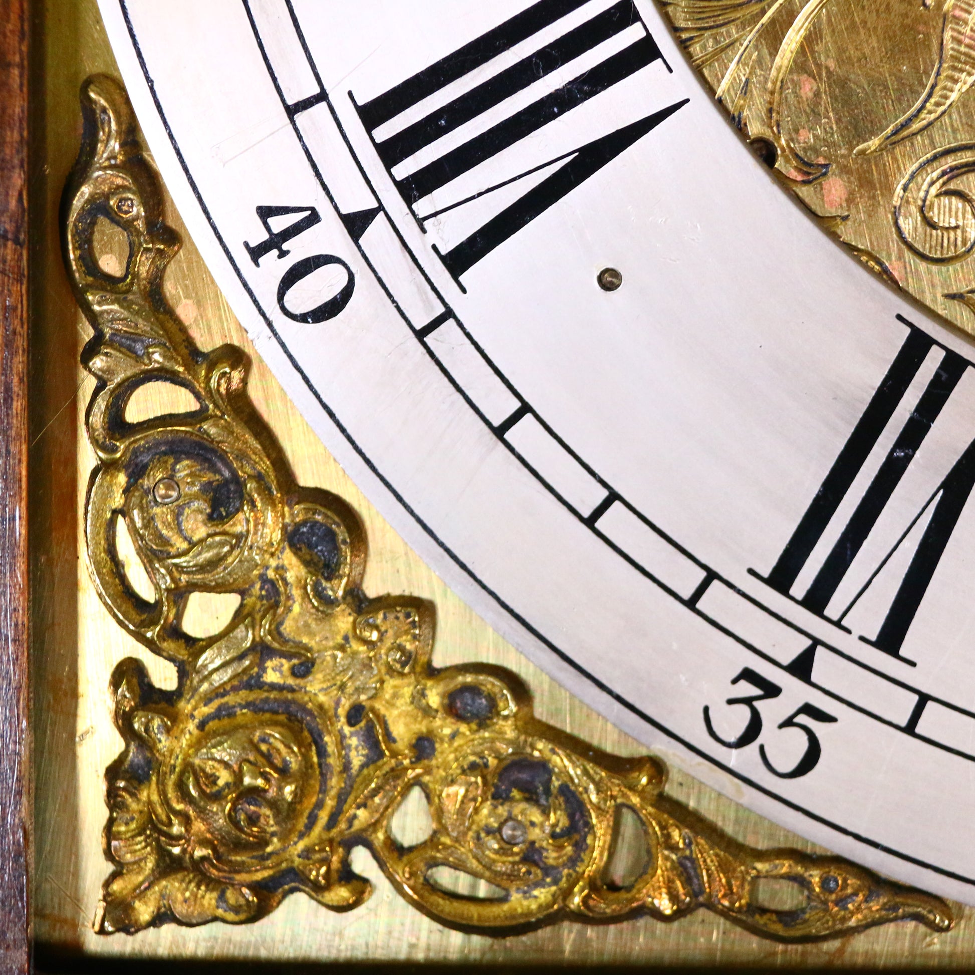 Dial: Brass engraved dial with silvered chapter ring, Roman and Arabic numerals, steel hands, and titled arch boss