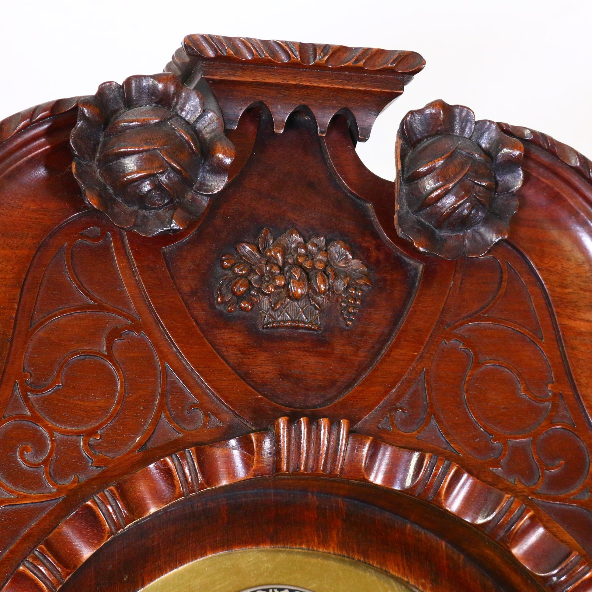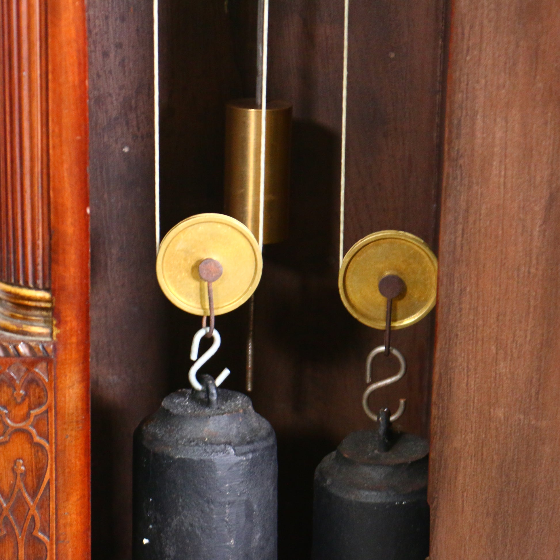 Case: Mahogany with fluted columns, brass Corinthian capitals, blind fretwork, and an elaborately carved hood