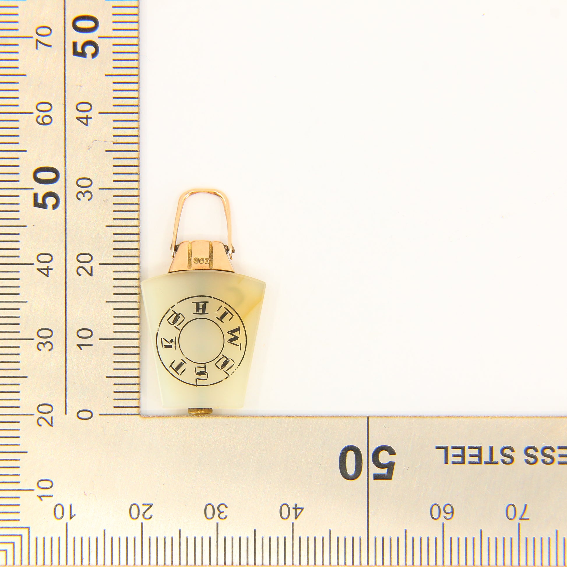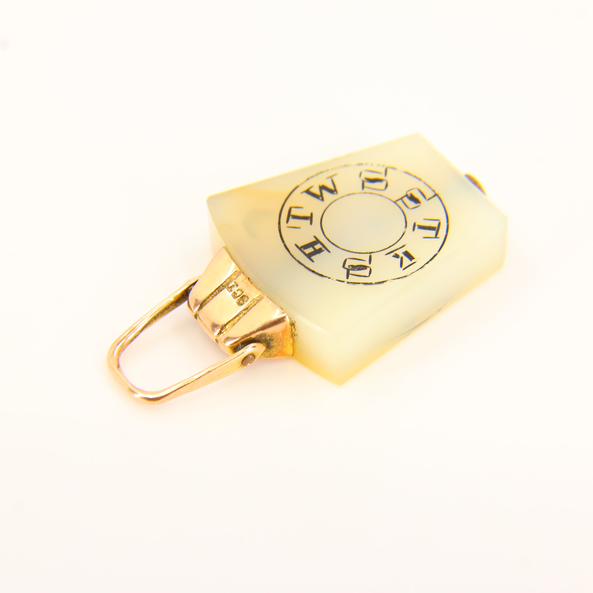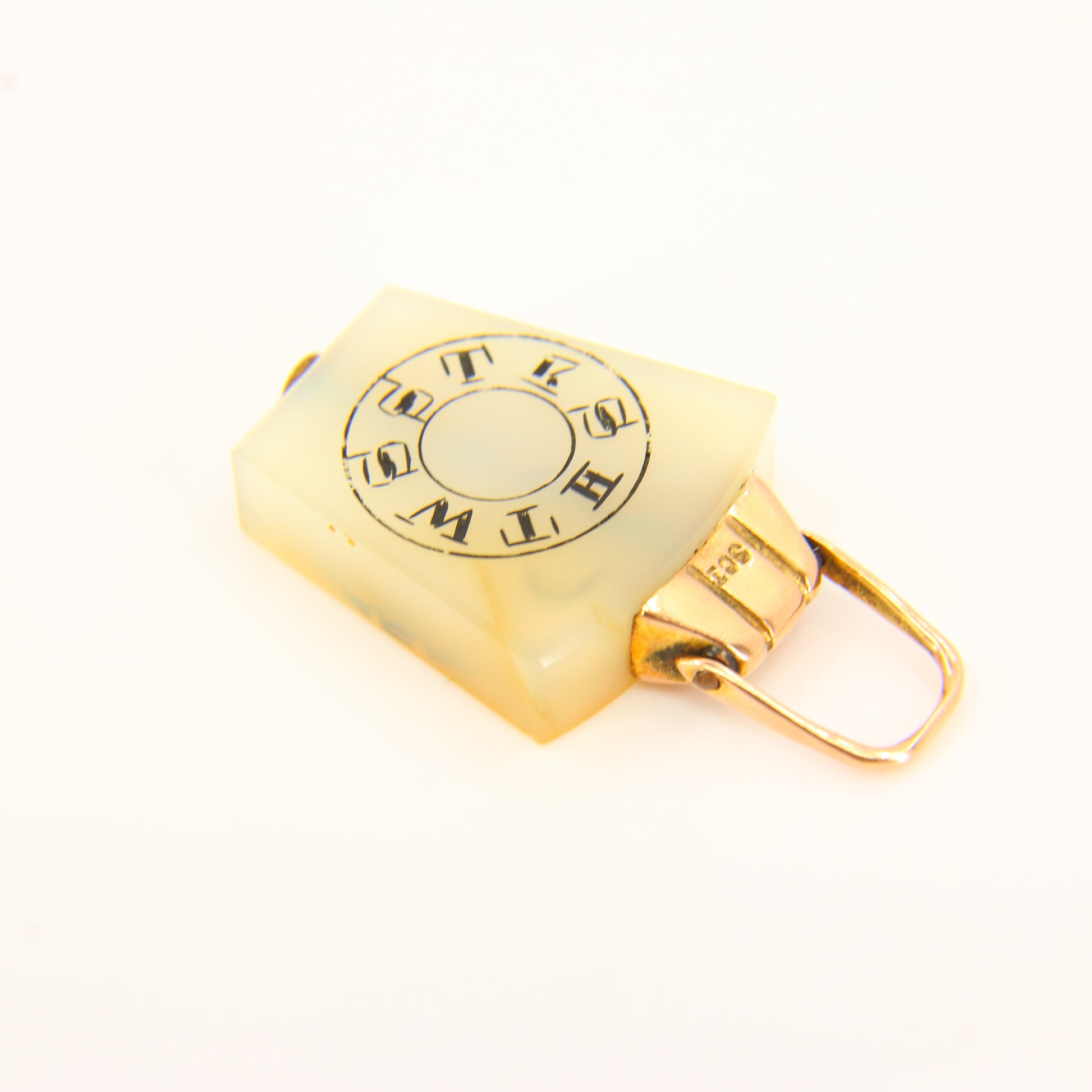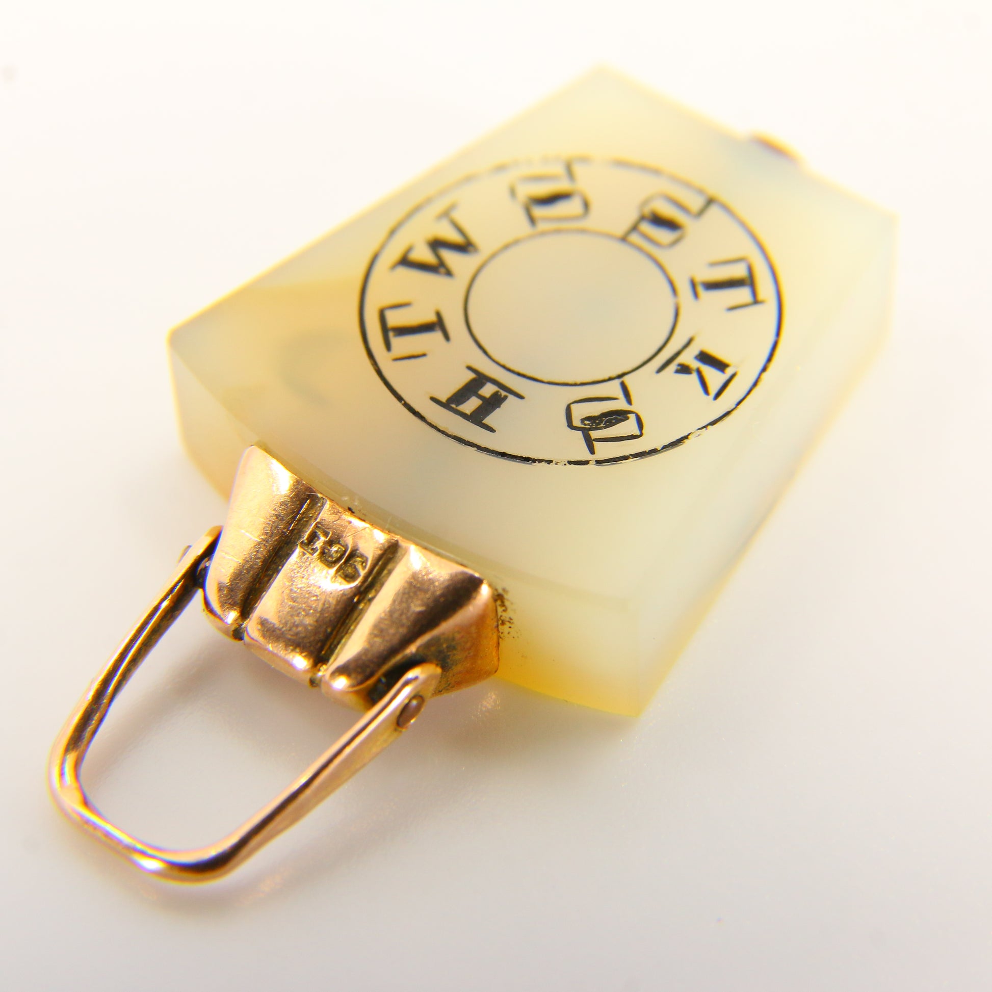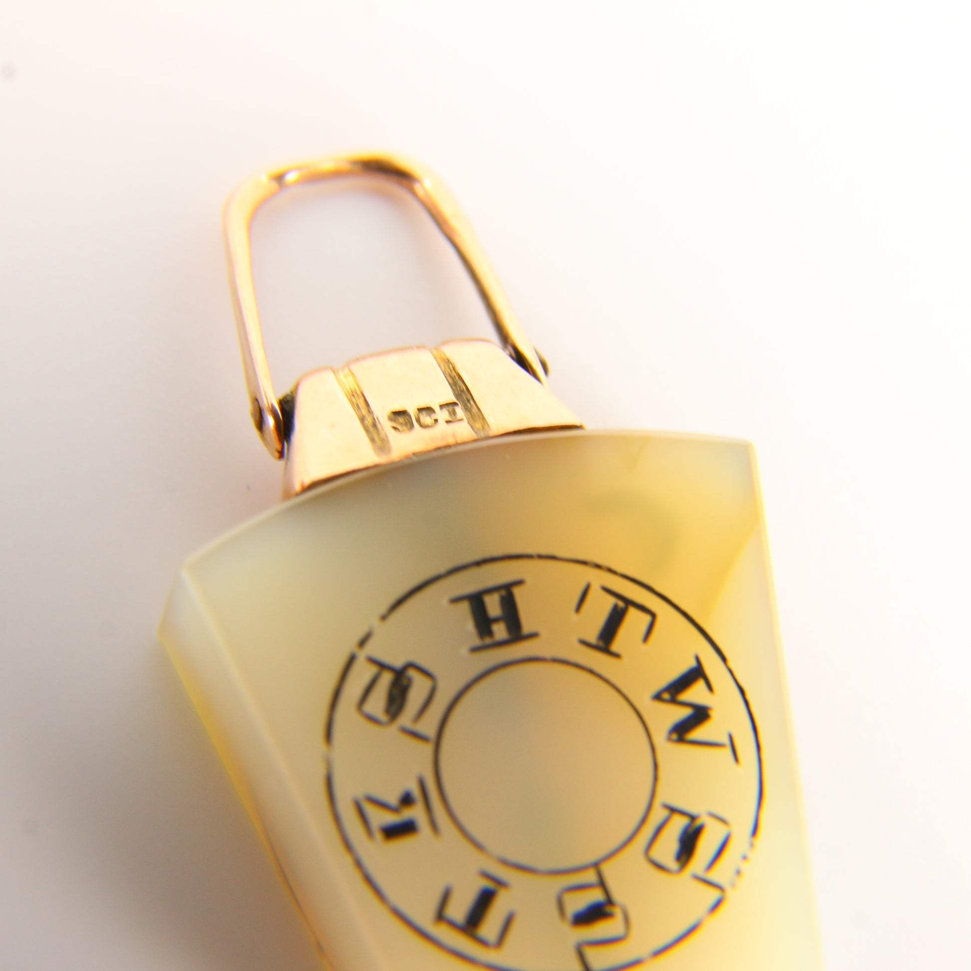 The fob is topped with a gold suspension loop and finial. The stone is inlaid with two agate discs, one of which has letters TKSHTWSS, the otherside has the same letters in Hebrew.