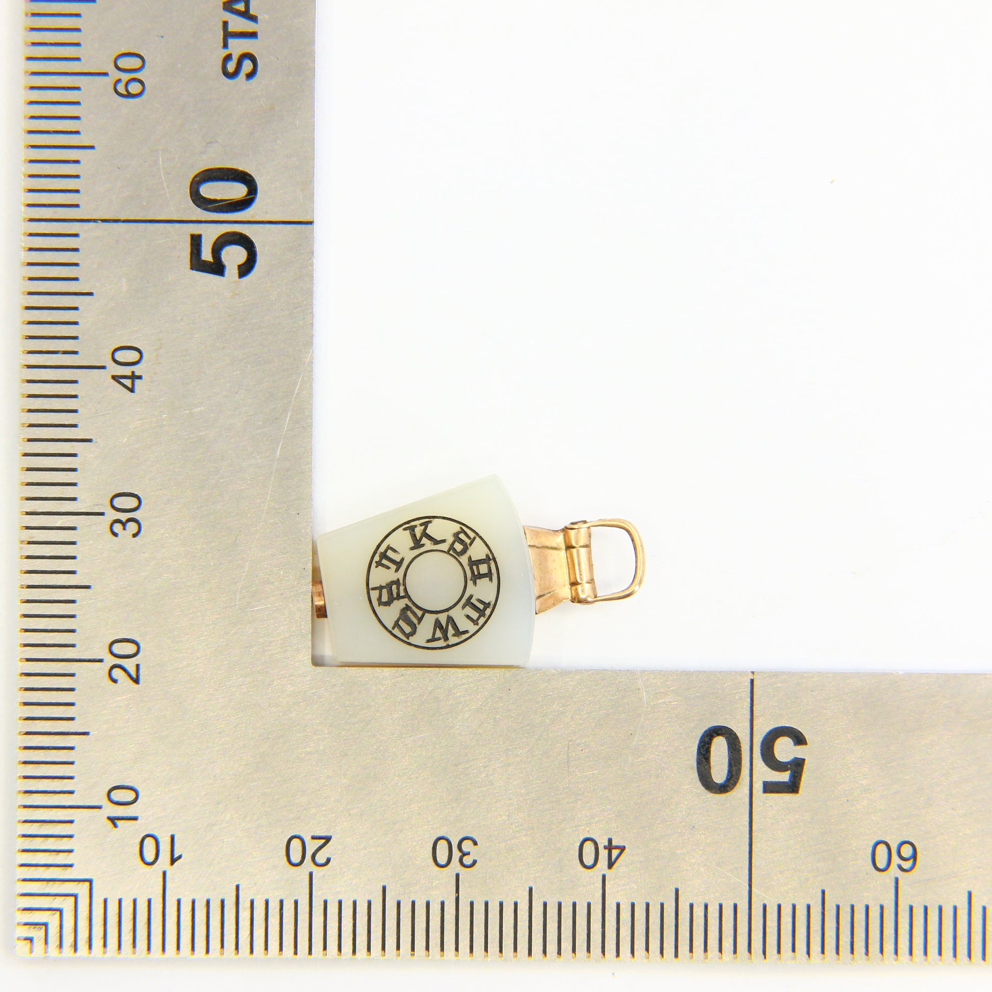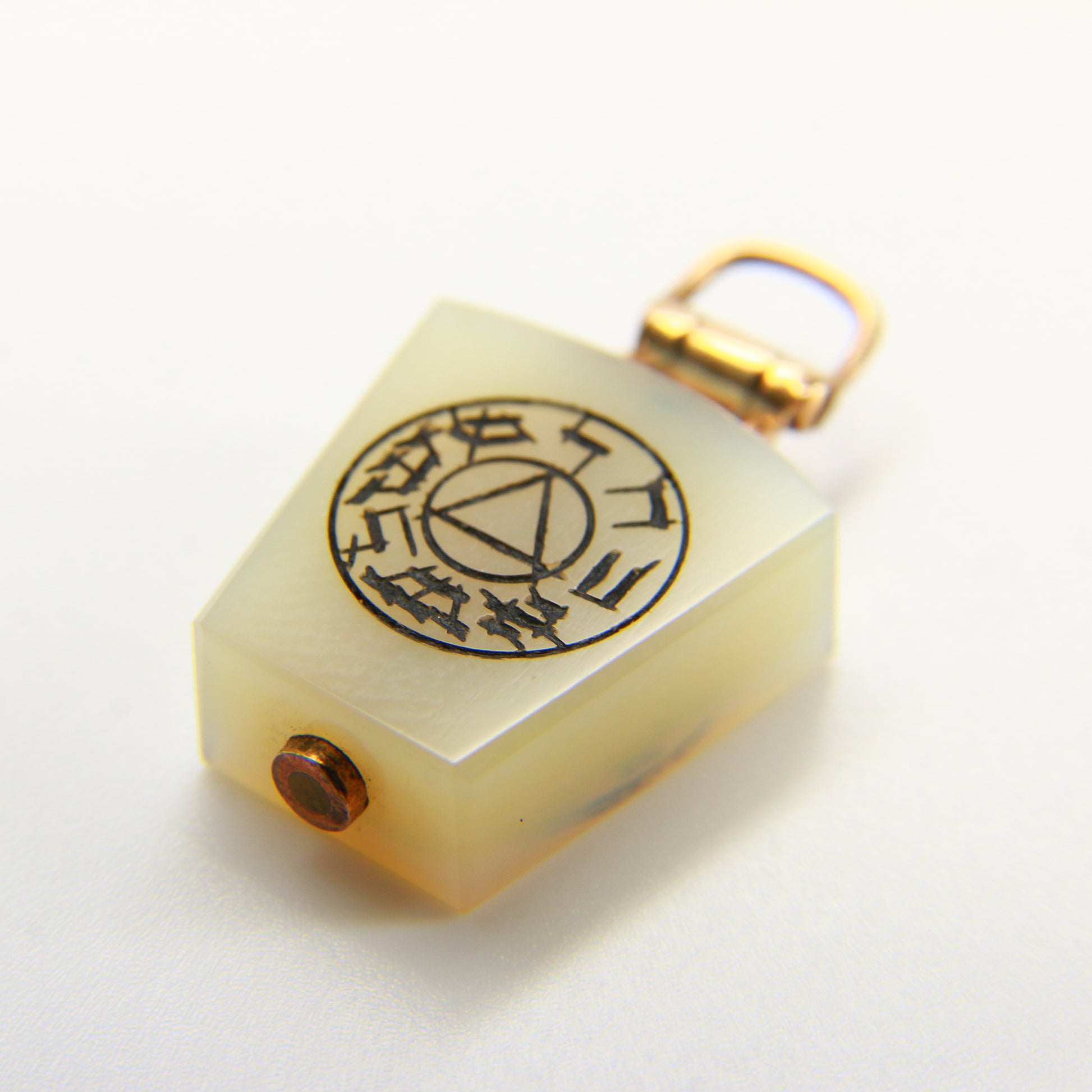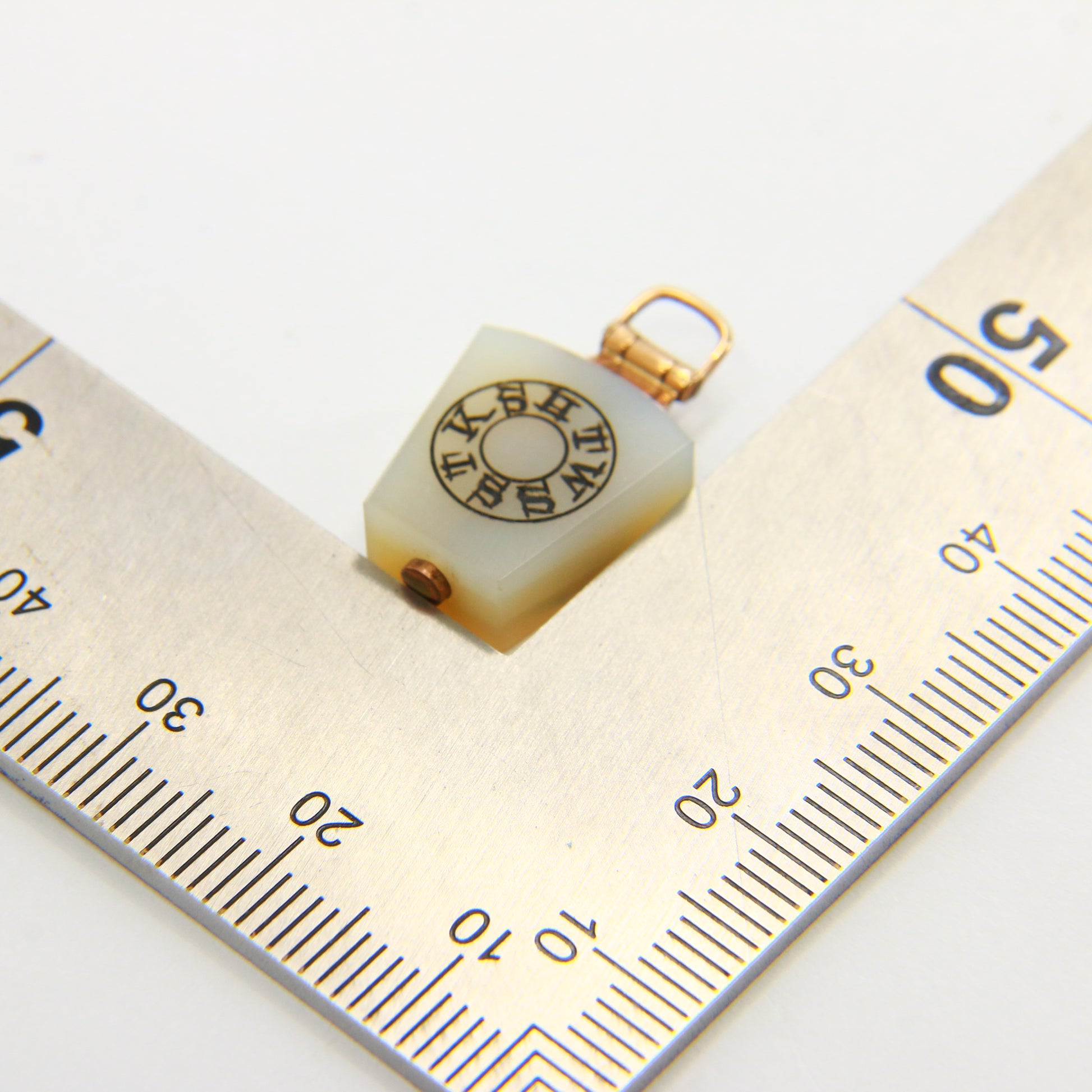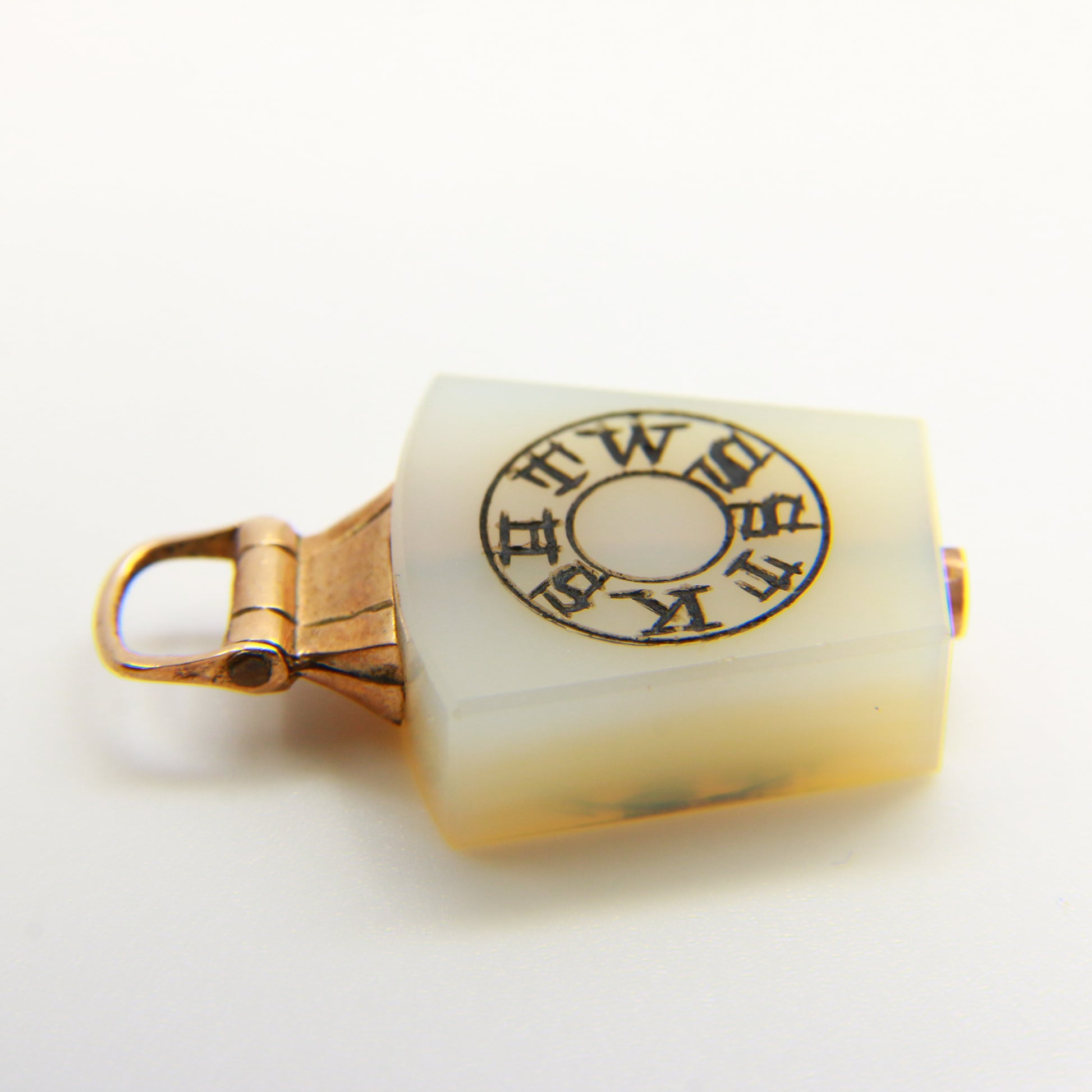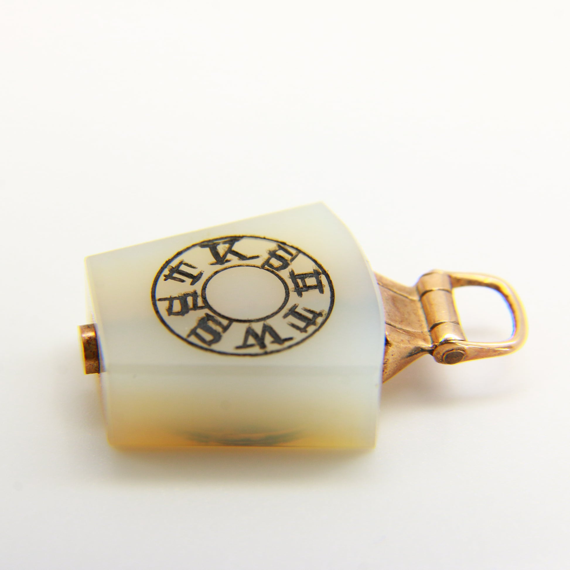 The fob is topped with a gold suspension loop and finial. The stone is inlaid with two agate discs, one of which has letters TKSHTWSS, the other side has the same letters in Hebrew.