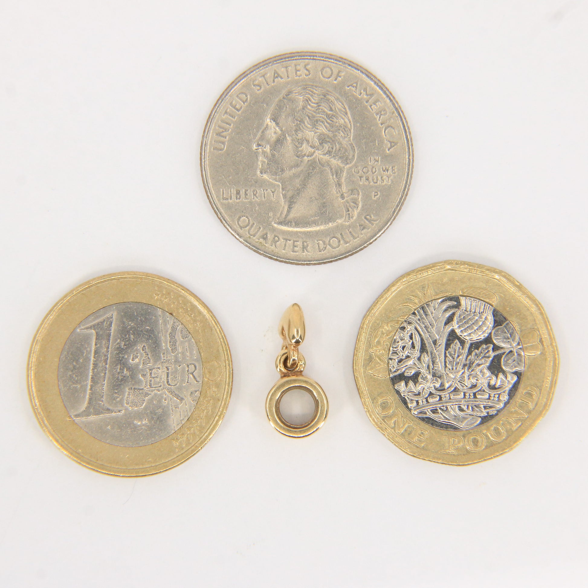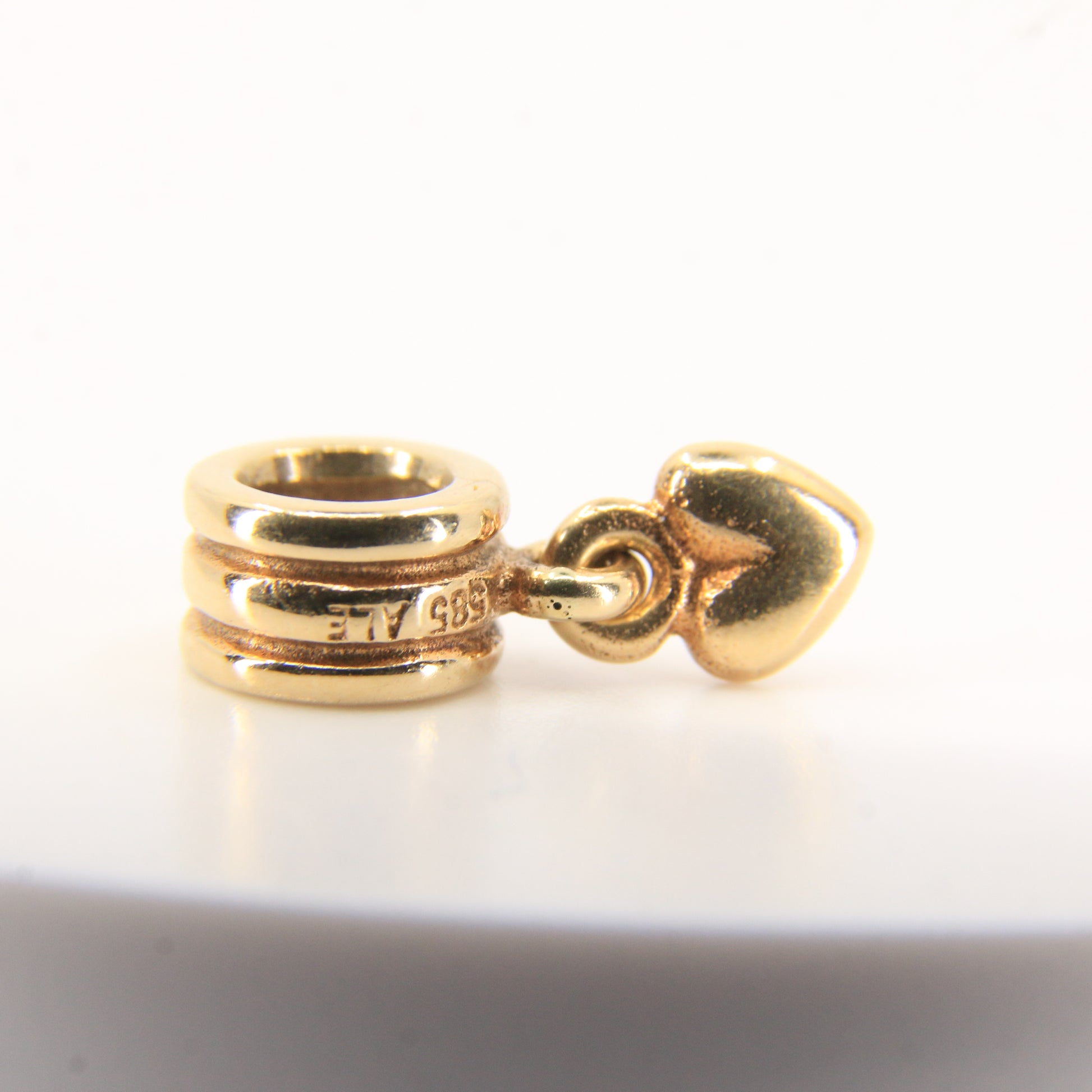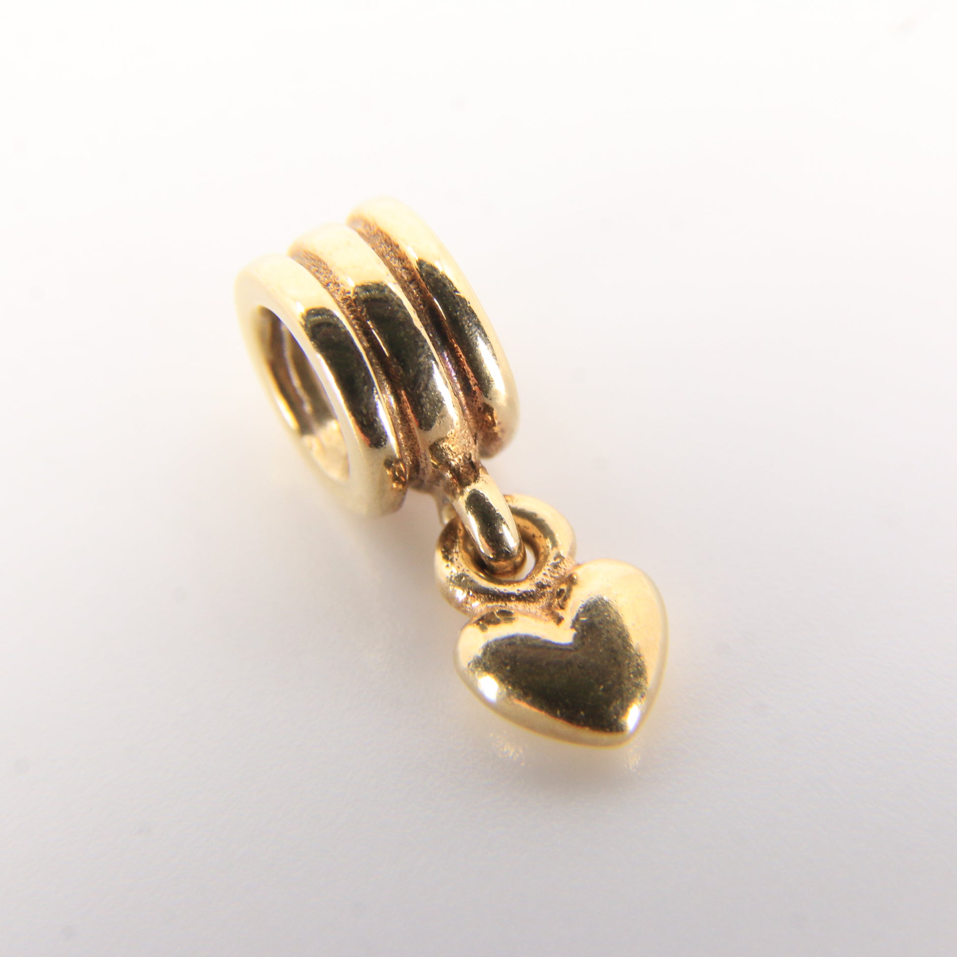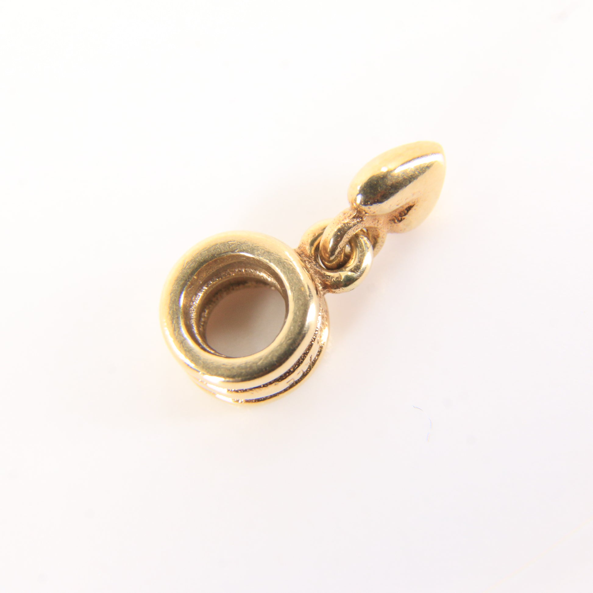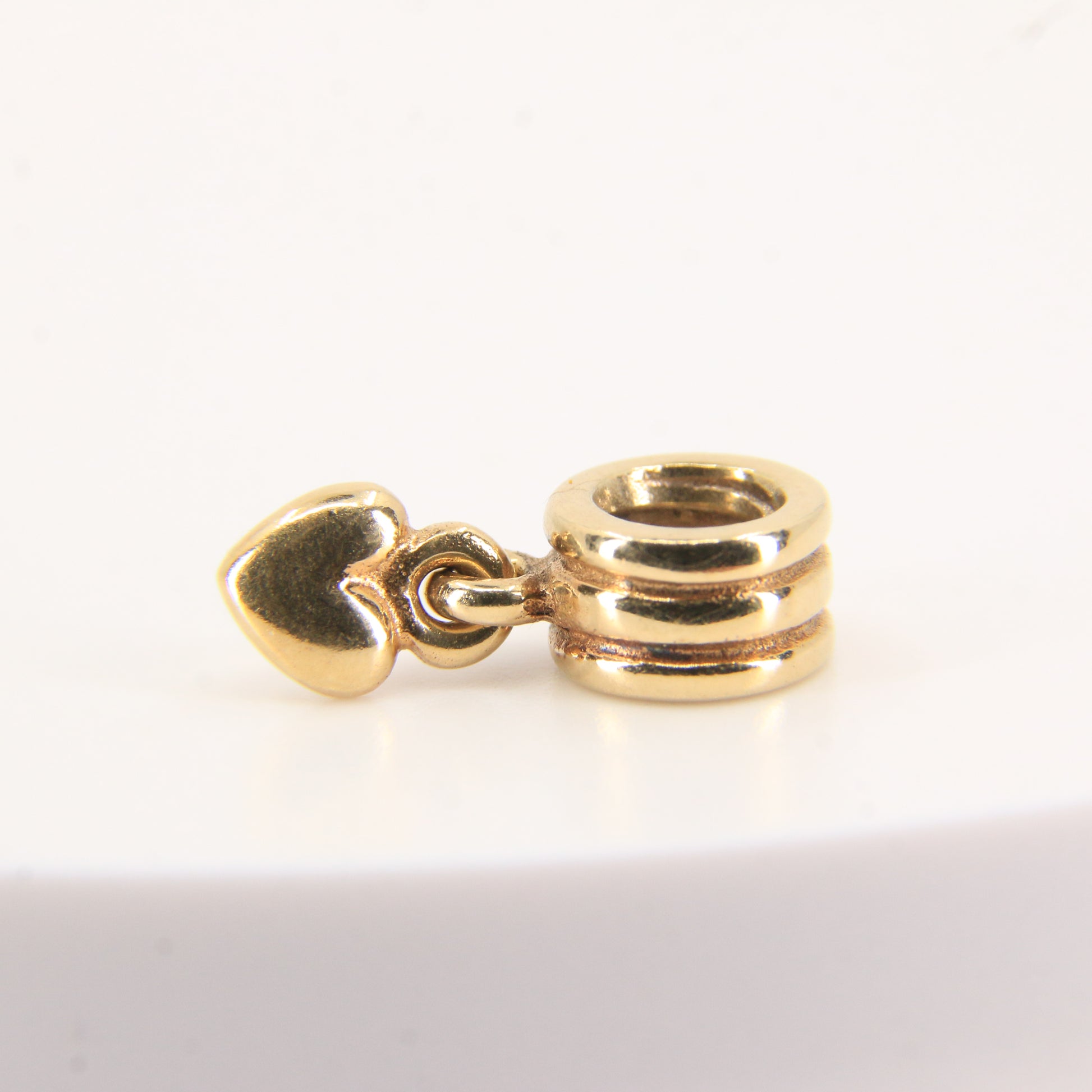 Authentic Pandora 14ct solid yellow gold hanging heart threaded bracelet charm — a rare and collectible design no longer produced by Pandora. Solid gold Pandora charms are highly sought after today, making this a timeless piece to add to your jewellery collection.