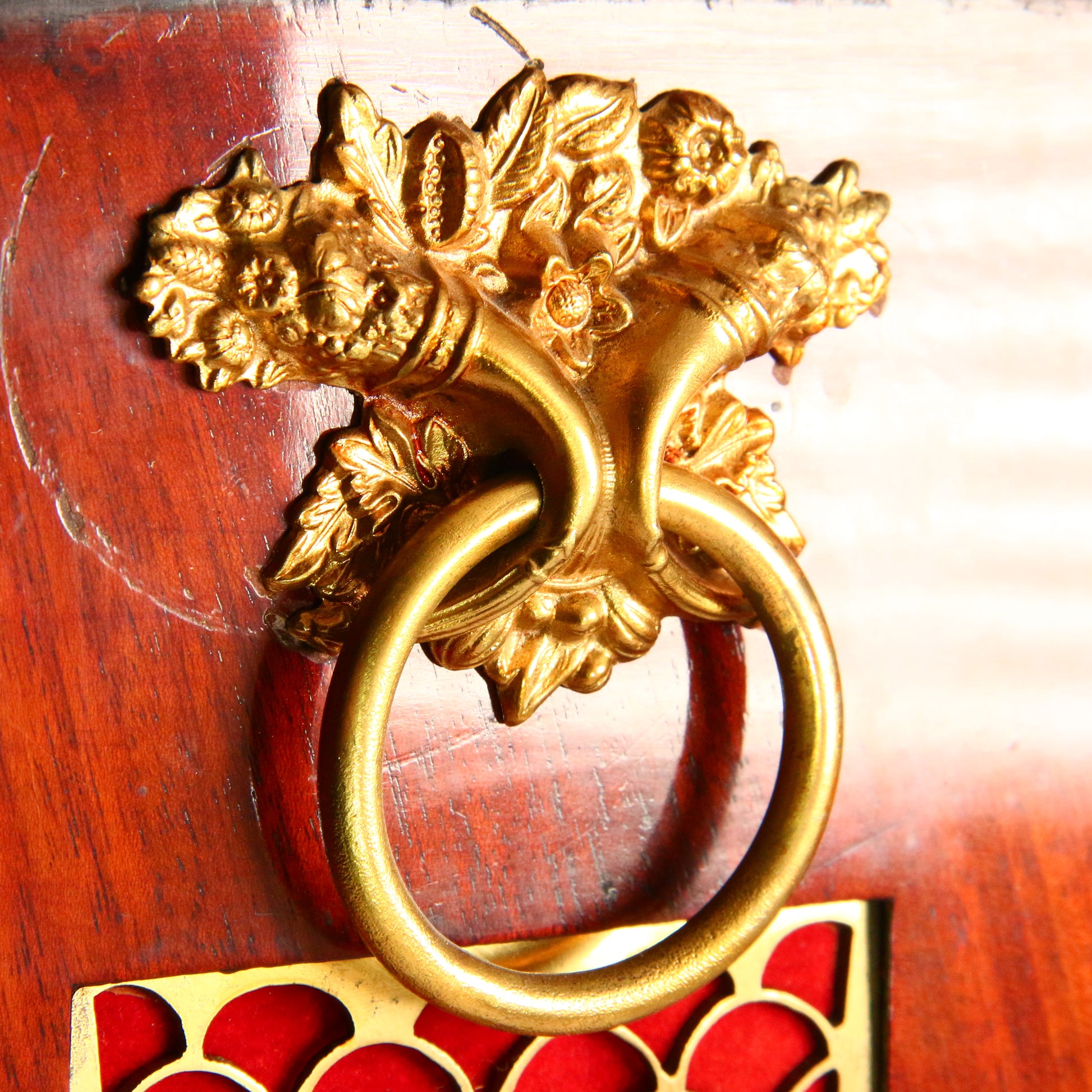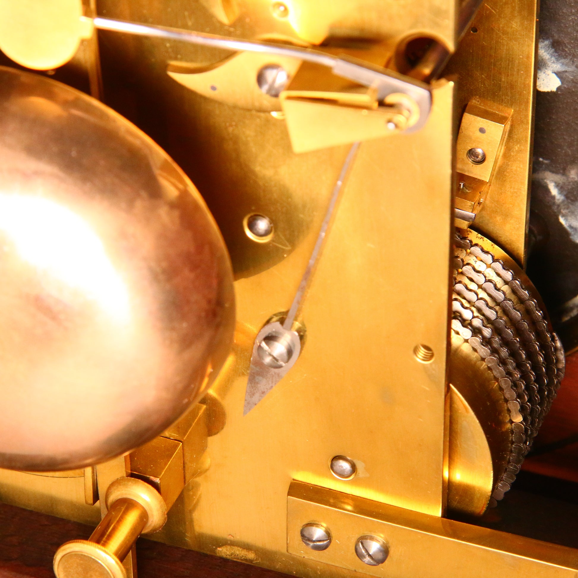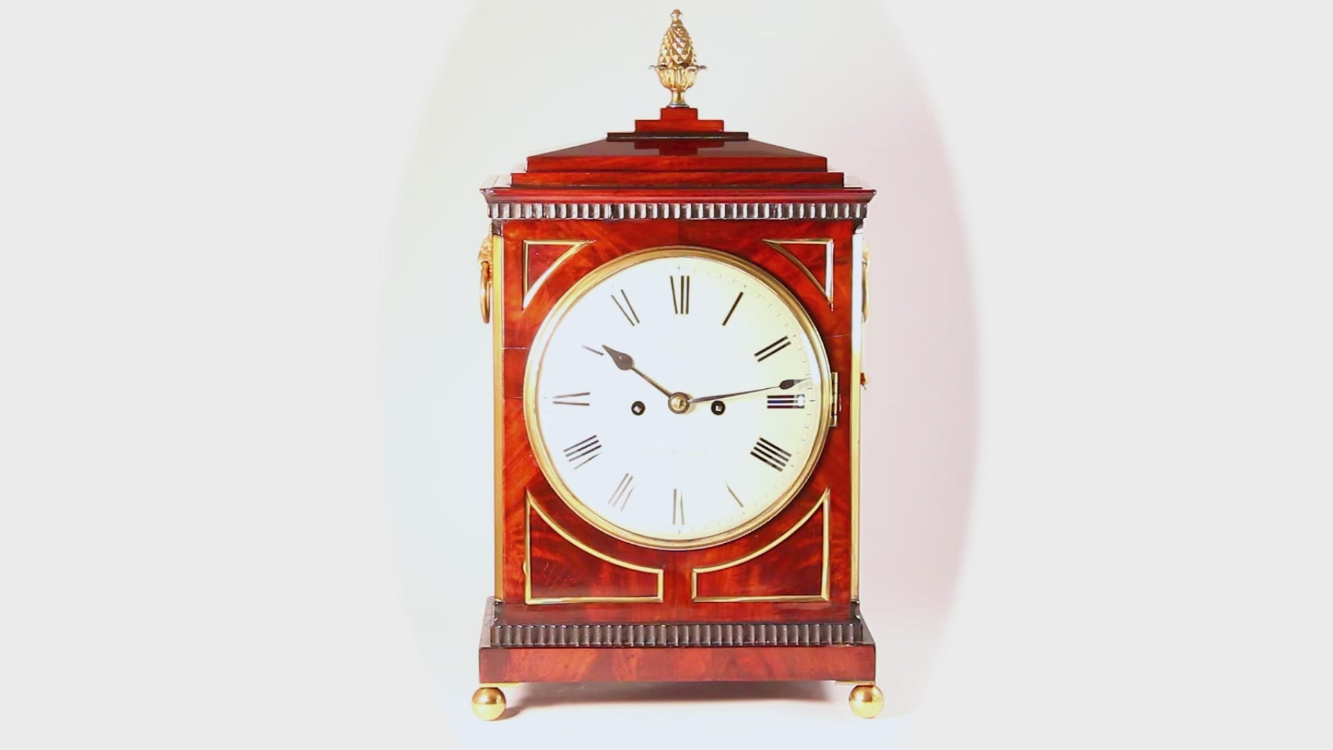 A beautiful mahogany gilt brass bracket clock with repeater chime cord. Please see video for striking. Antique circa 1830 from Richard Webster, 26 Change Alley, London, 1784 - 1840, Livery Clockmakers Company, 1810. "see Old Clocks & Watches. F.S. Brittan". An 8 day duration double fusee movement with anchor escapement striking the hours on a bell and repeating the hour with a pull repeat cord. The dial features Roman numerals and steel hands. The mahogany case stands on brass bun feet with brass sound frets and carrying handles to the sides and brass bordered blind frets around dial. Enclosed under a convex glass in a cast brass bezel, the chamfer top surmounted by a brass pineapple finial.