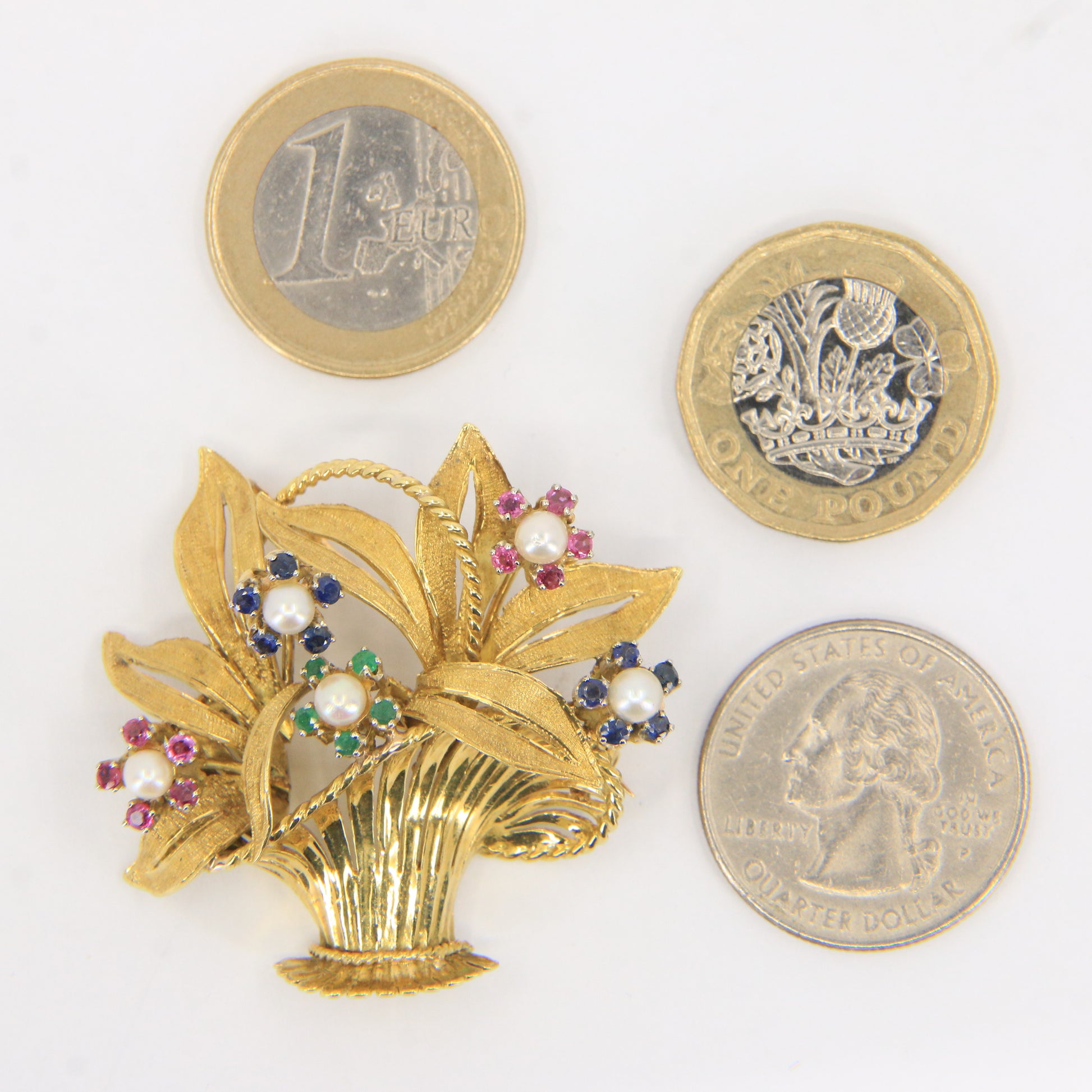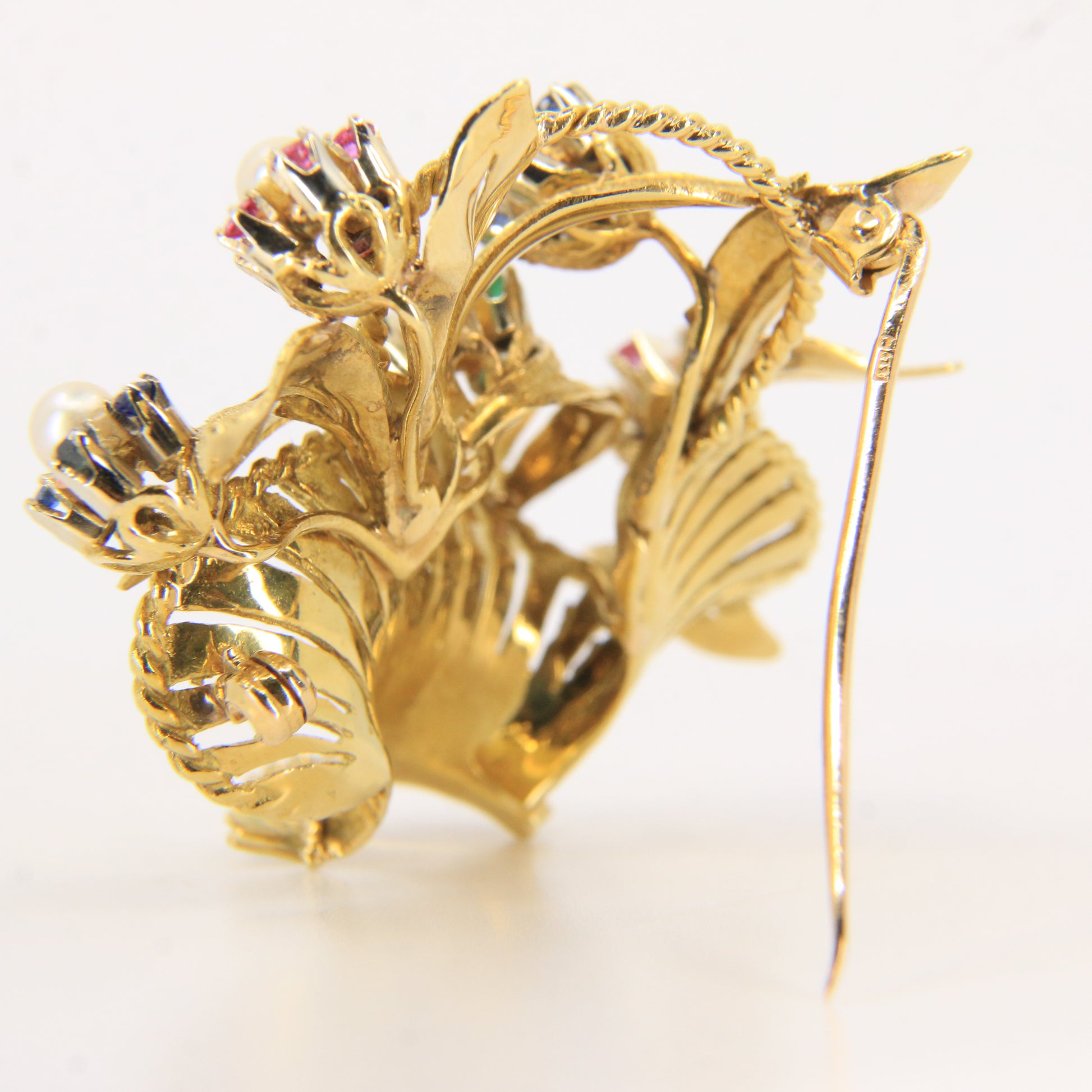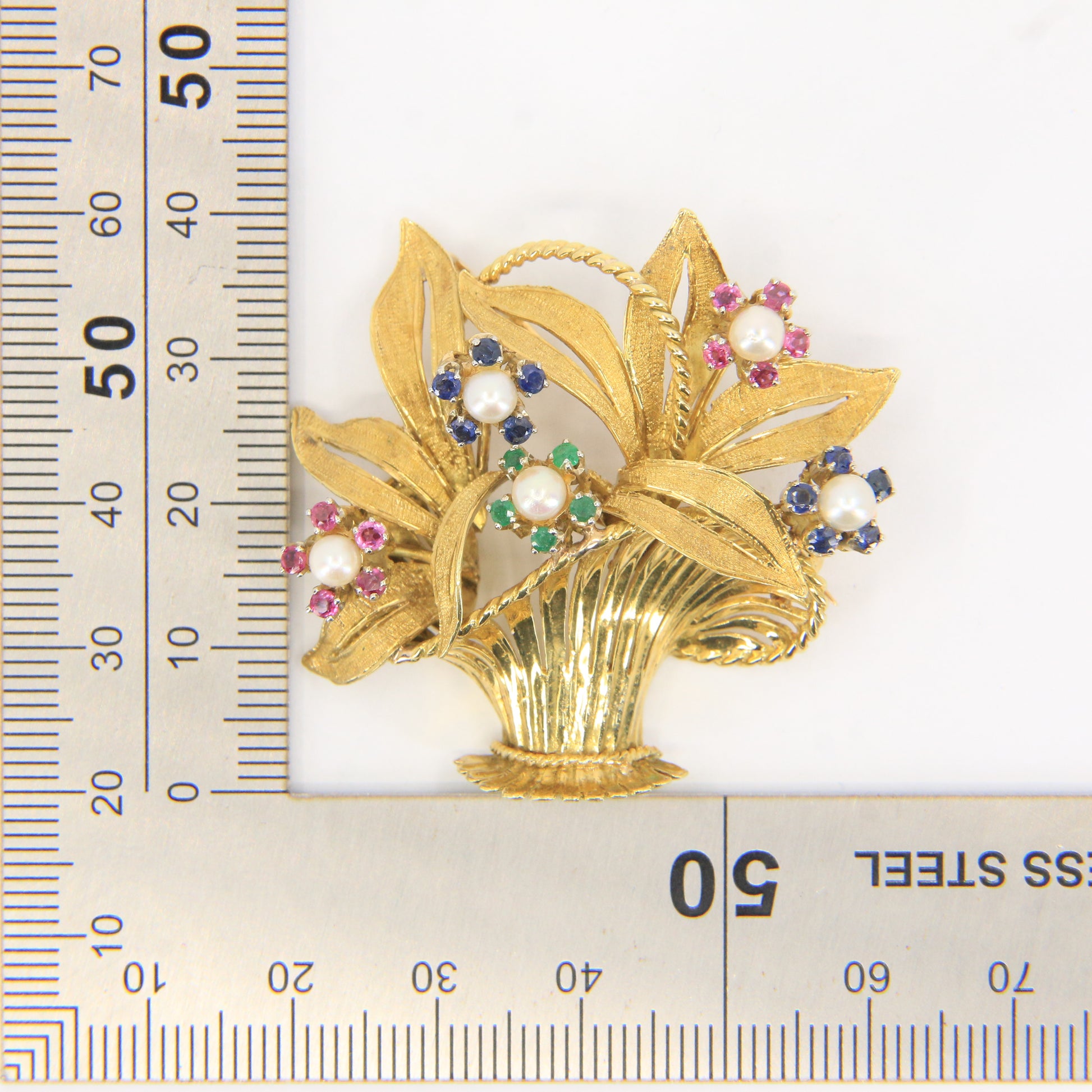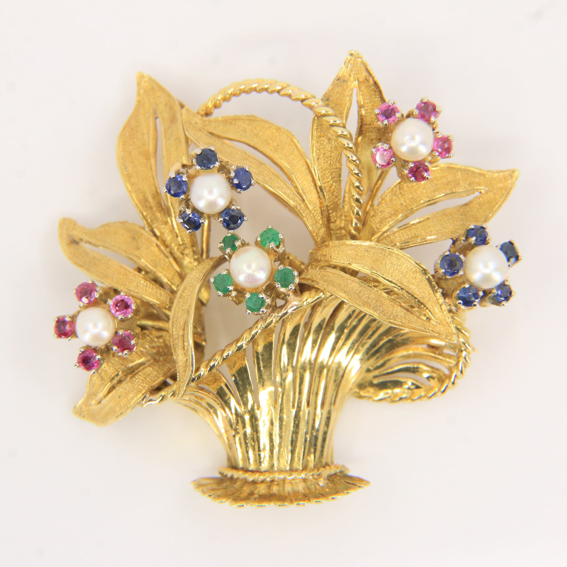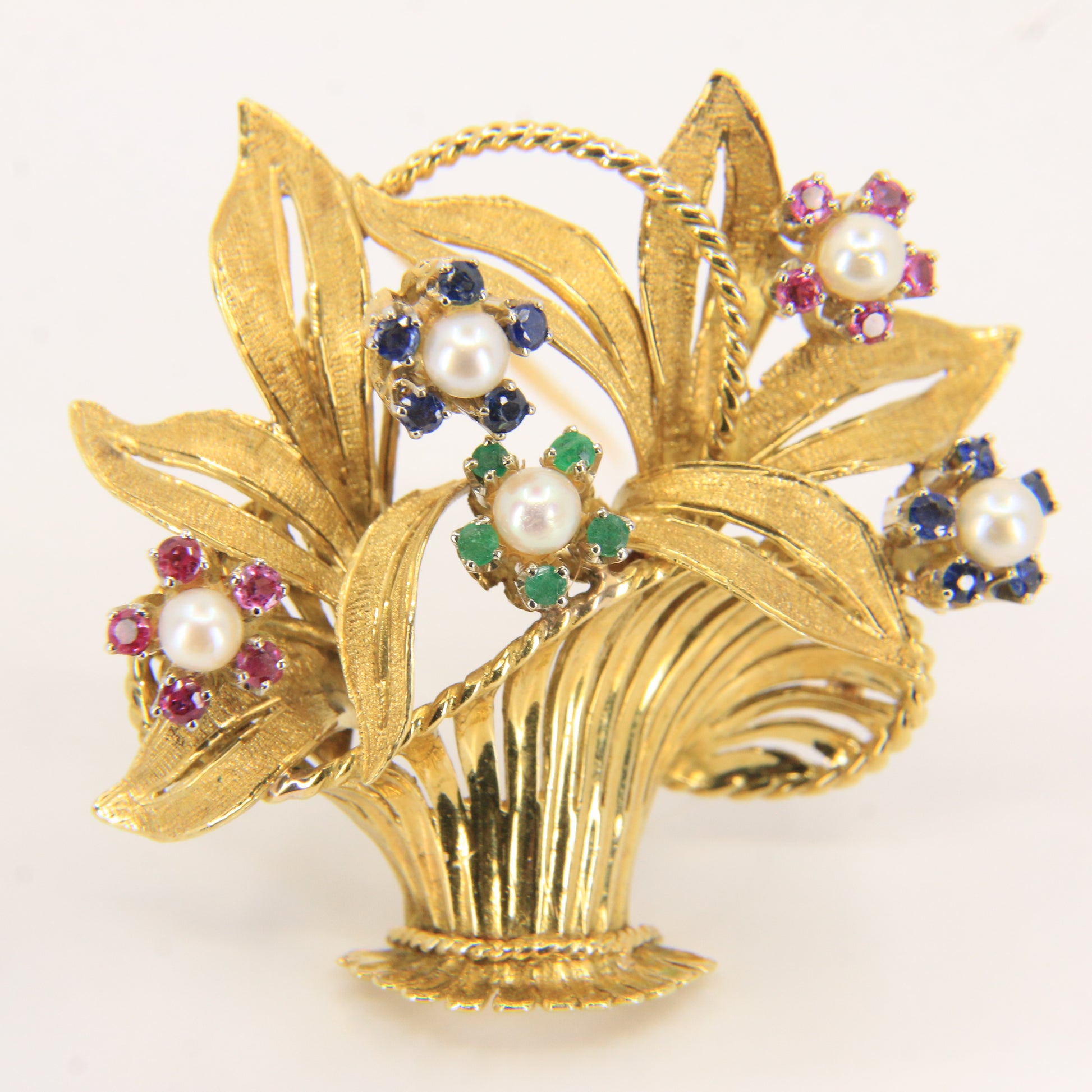 A beautifully detailed vintage 18ct yellow gold gardenia basket brooch set with pearls, emeralds, sapphires, and topaz. Hallmarked and richly textured, this floral statement brooch is a true showcase of craftsmanship and elegance.