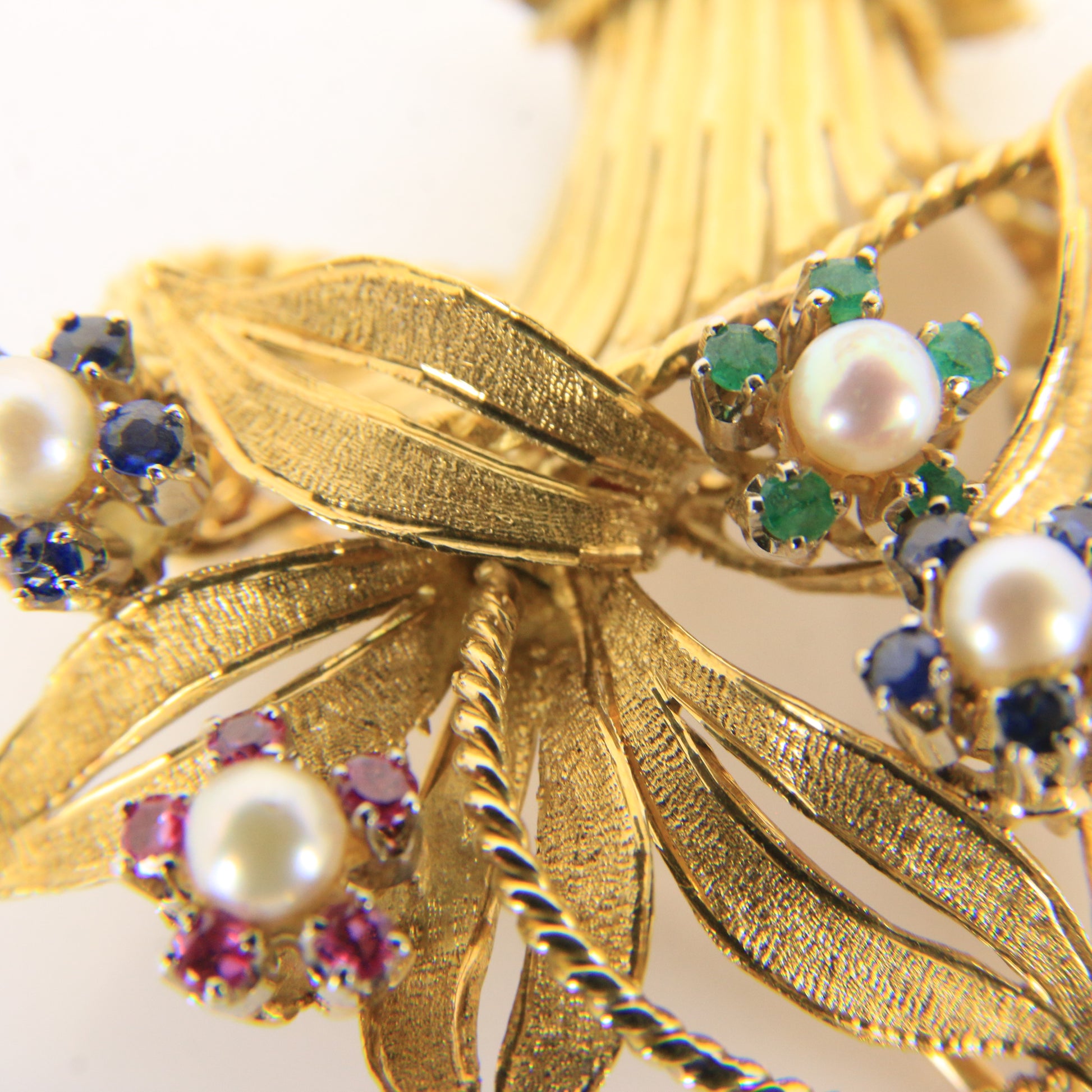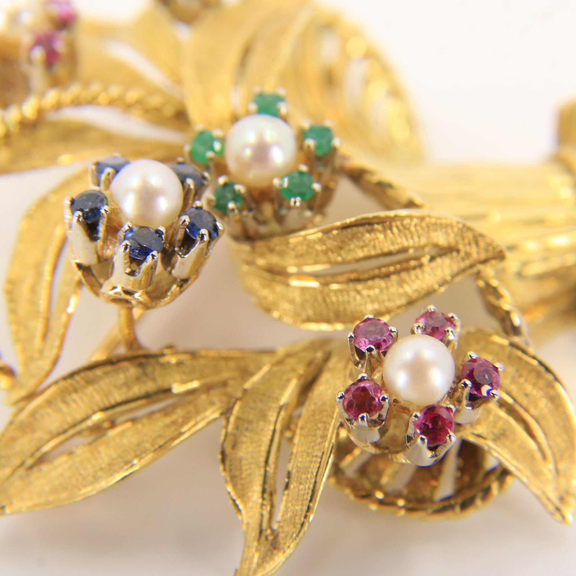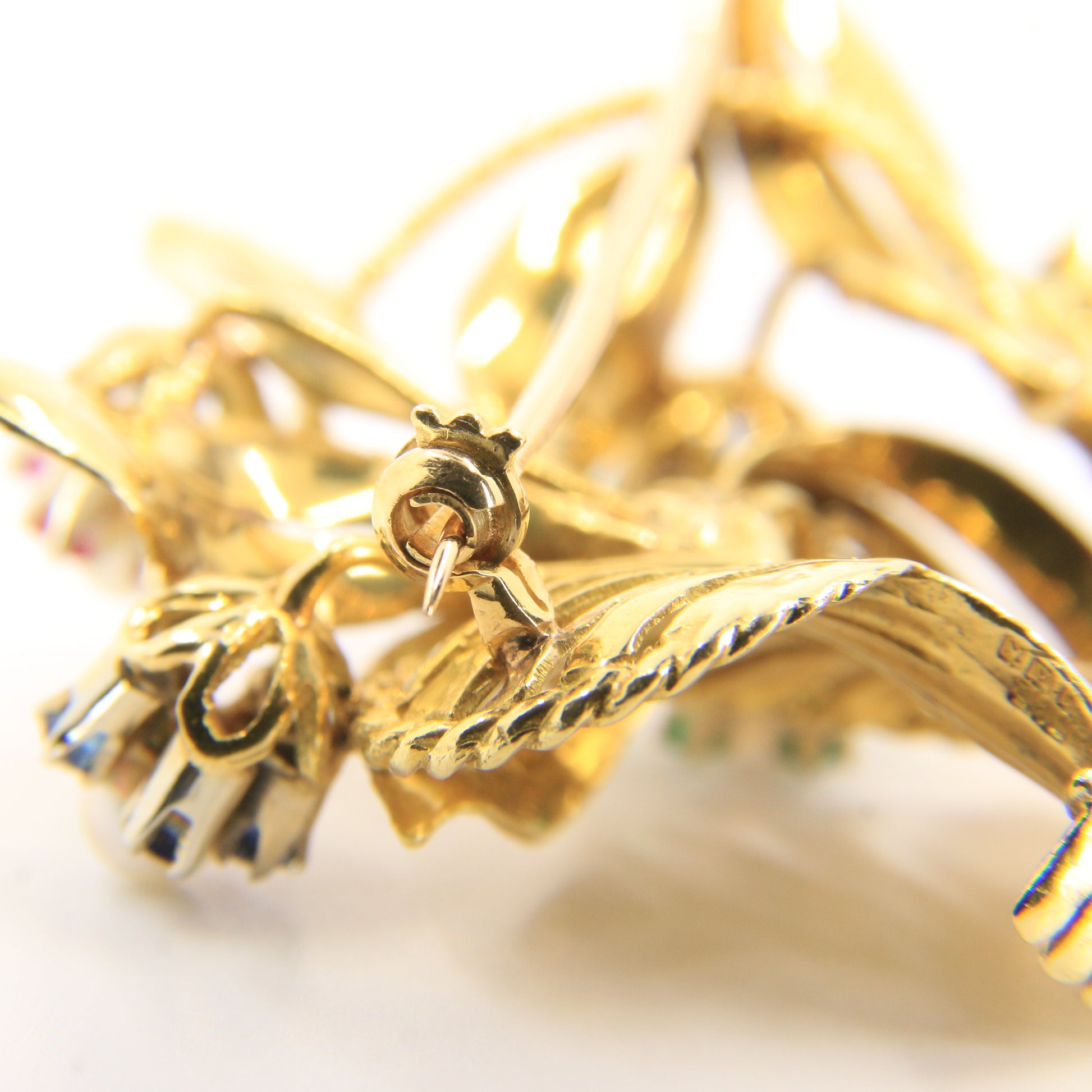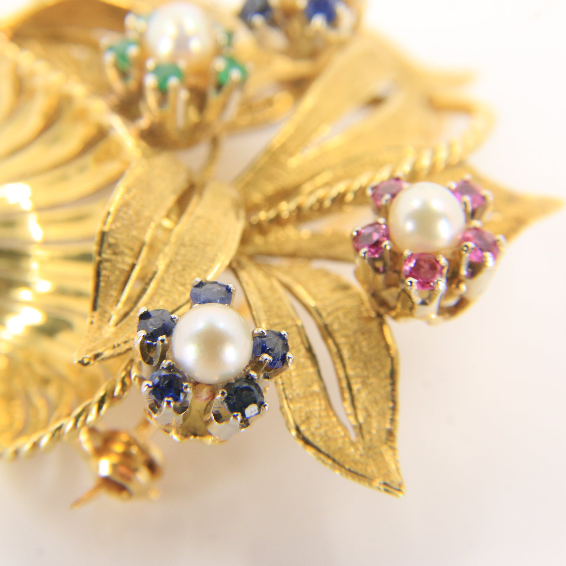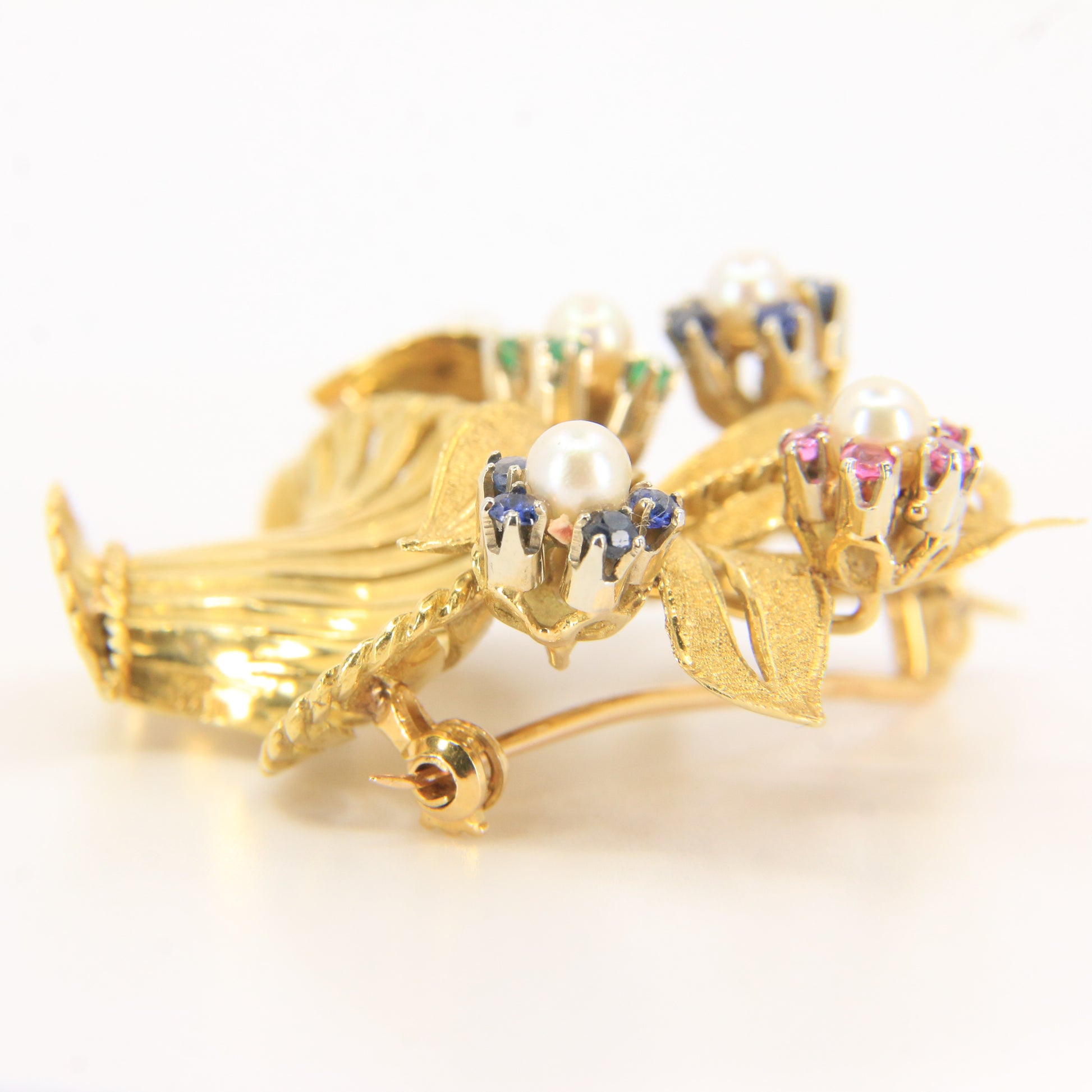 A beautifully detailed vintage 18ct yellow gold gardenia basket brooch set with pearls, emeralds, sapphires, and topaz. Hallmarked and richly textured, this floral statement brooch is a true showcase of craftsmanship and elegance.