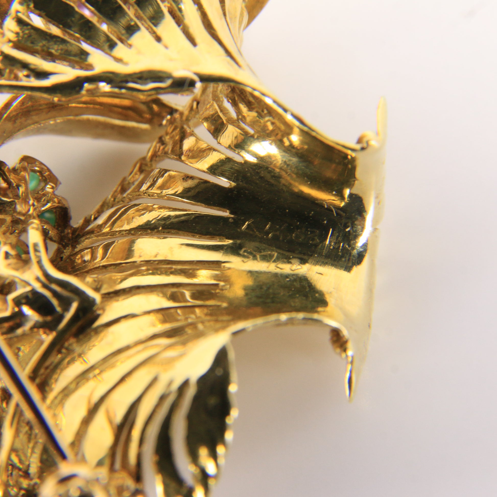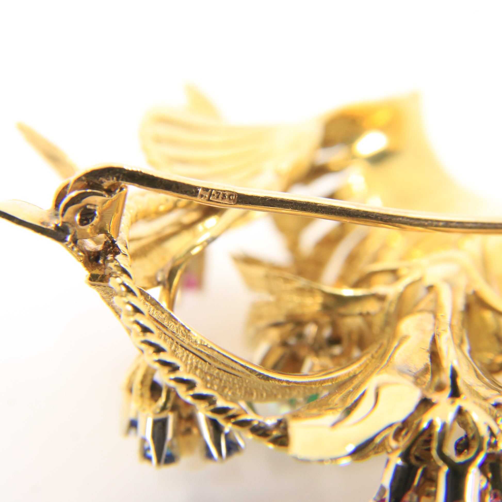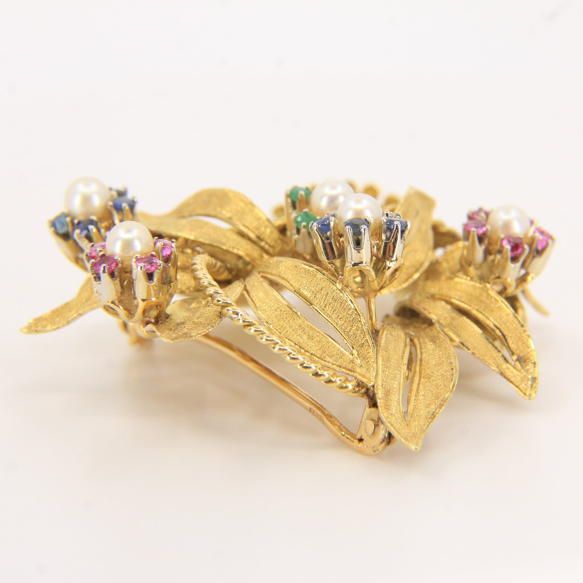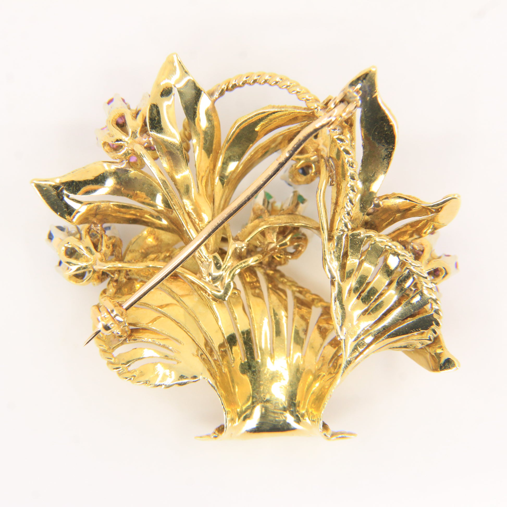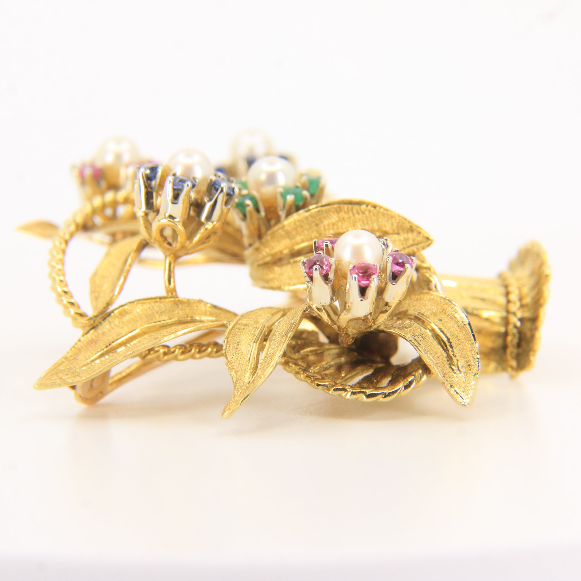 A beautifully detailed vintage 18ct yellow gold gardenia basket brooch set with pearls, emeralds, sapphires, and topaz. Hallmarked and richly textured, this floral statement brooch is a true showcase of craftsmanship and elegance.