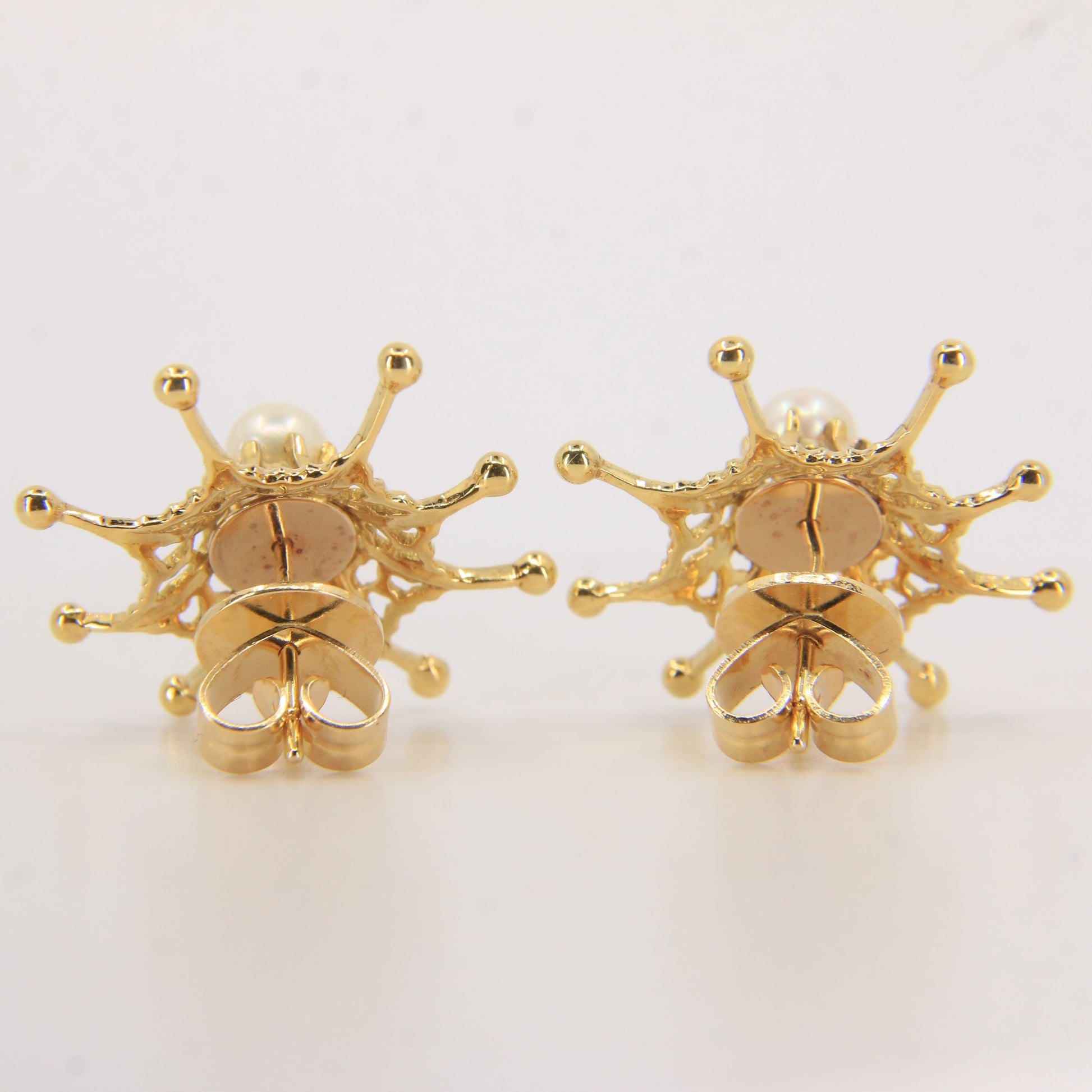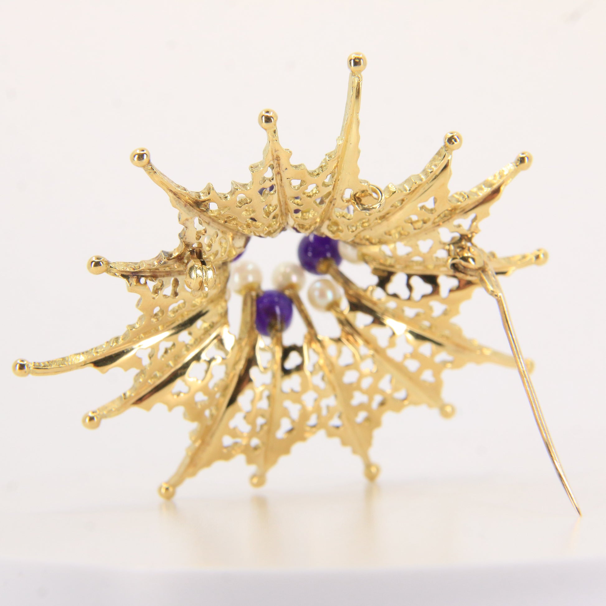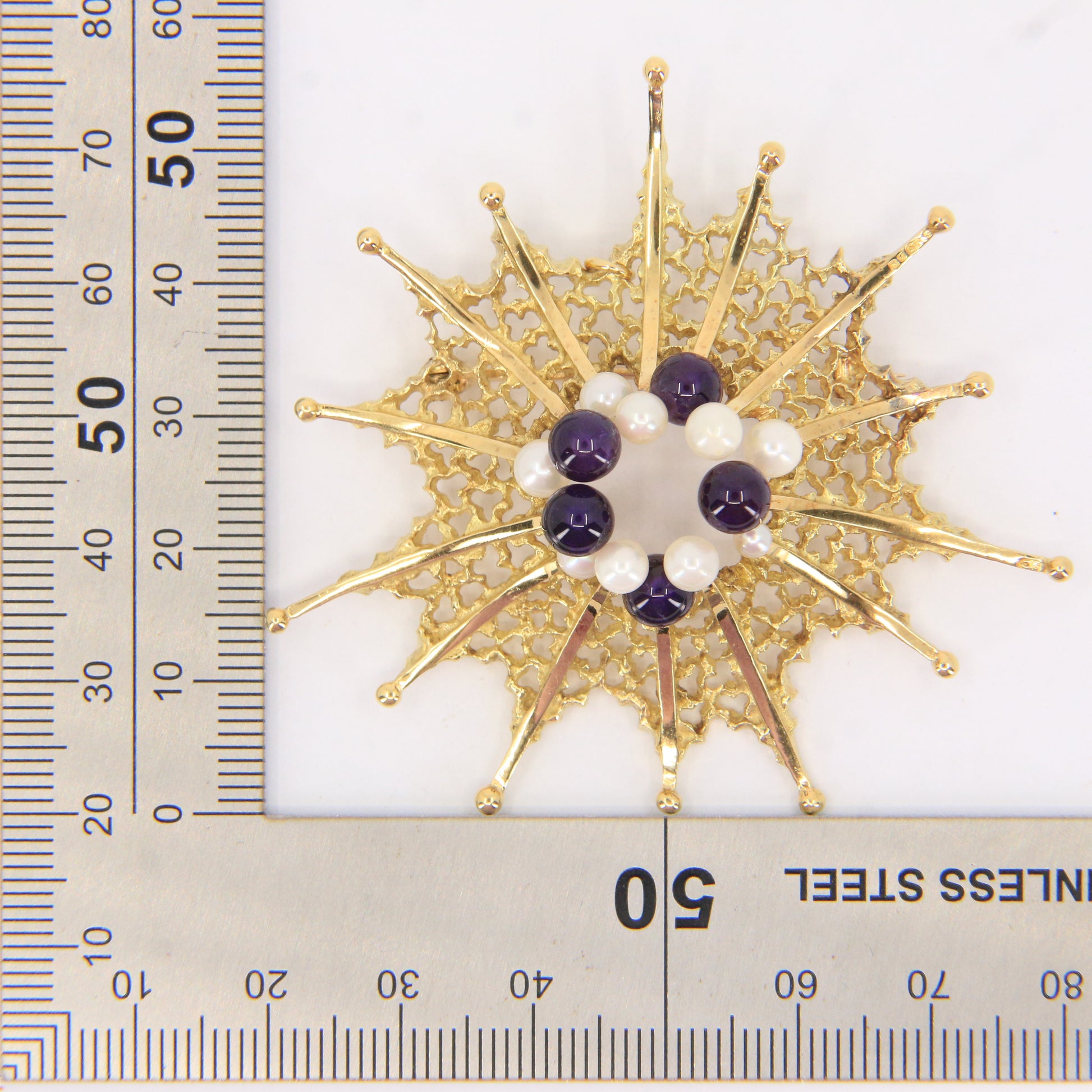 This striking vintage jewellery set by renowned designer Stuart Devlin comprises an 18ct yellow gold brooch and matching stud earrings, set with amethyst and pearls and fully hallmarked. Devlin’s sculptural approach often draws on organic and celestial forms, making this an exceptional and highly collectible designer set—add it to your collection today.
