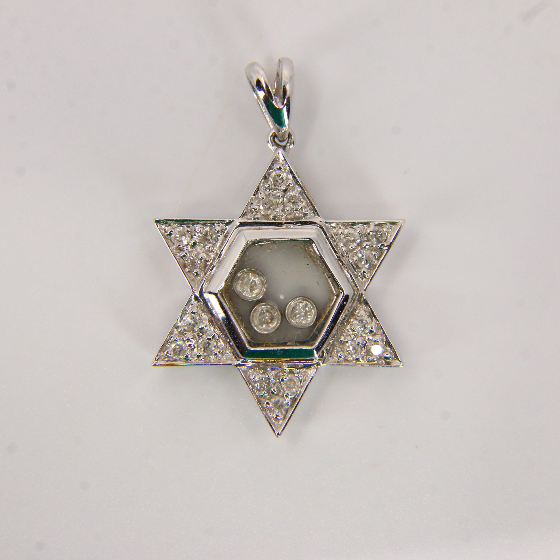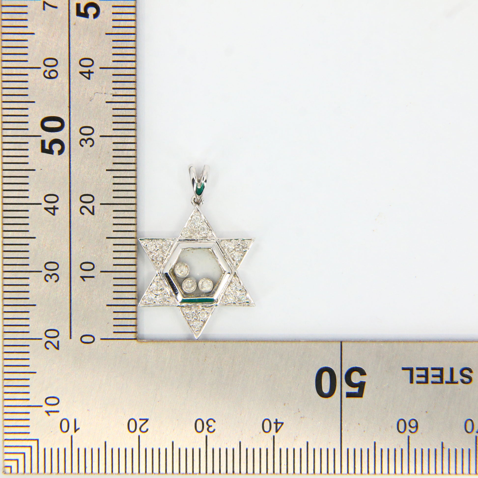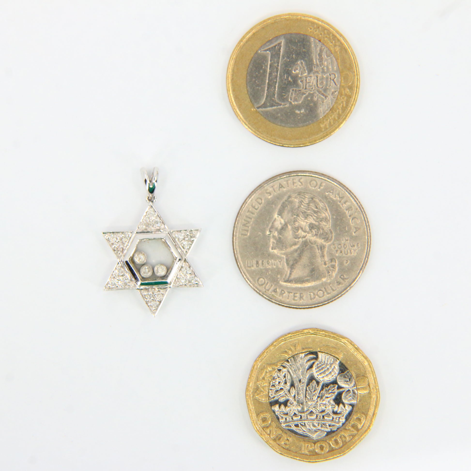 This rare and striking vintage pendant is crafted from solid 18ct white gold in a six-pointed star design, set with pavé diamonds and featuring three floating bezel-set diamonds inside a clear central compartment. Fully hallmarked and inspired by the iconic Happy Diamonds concept, it's a playful yet luxurious piece of fine jewellery. A perfect gift or addition to any collection.
