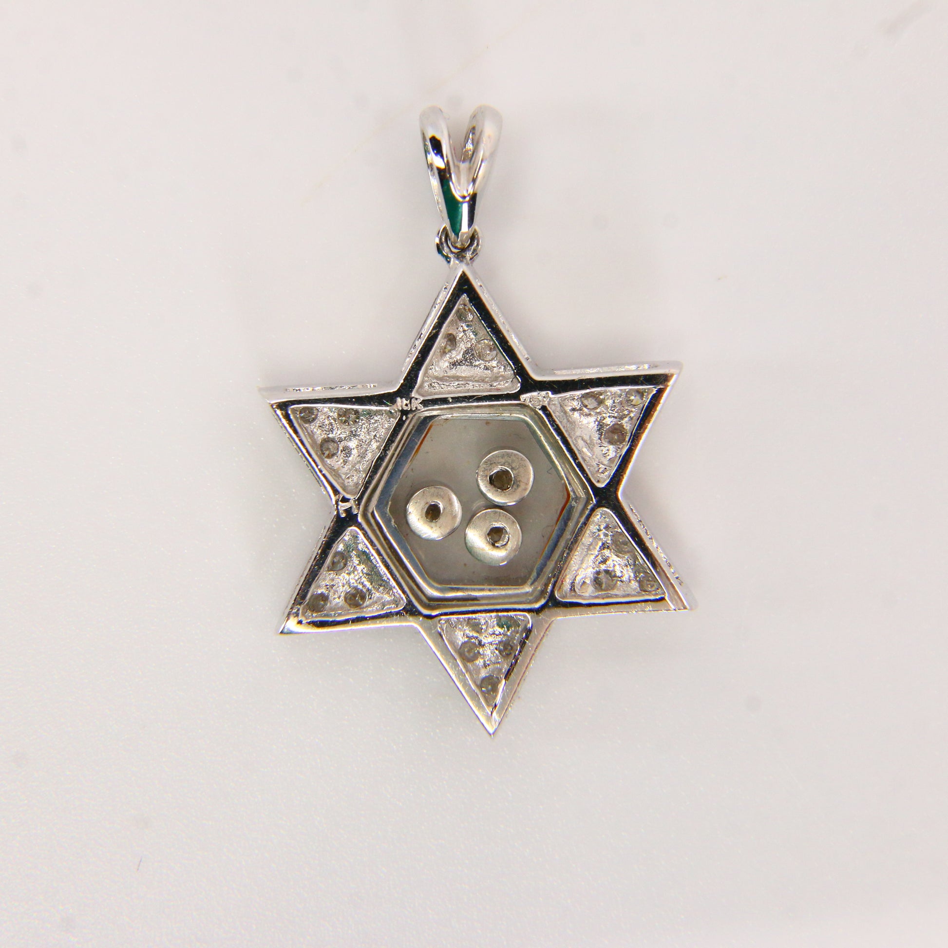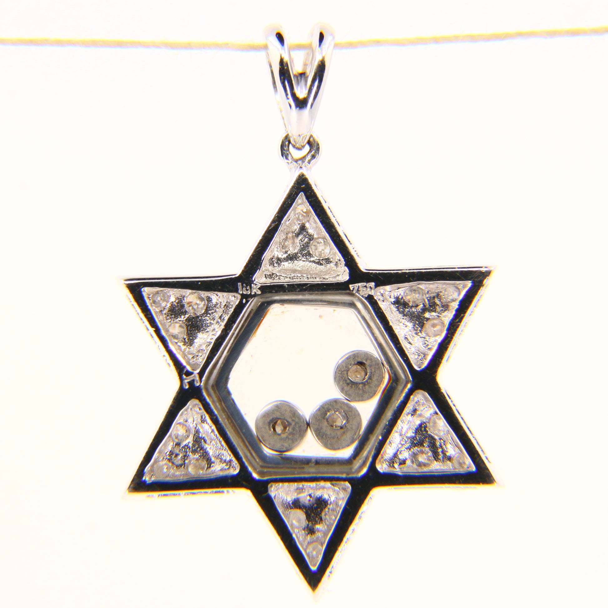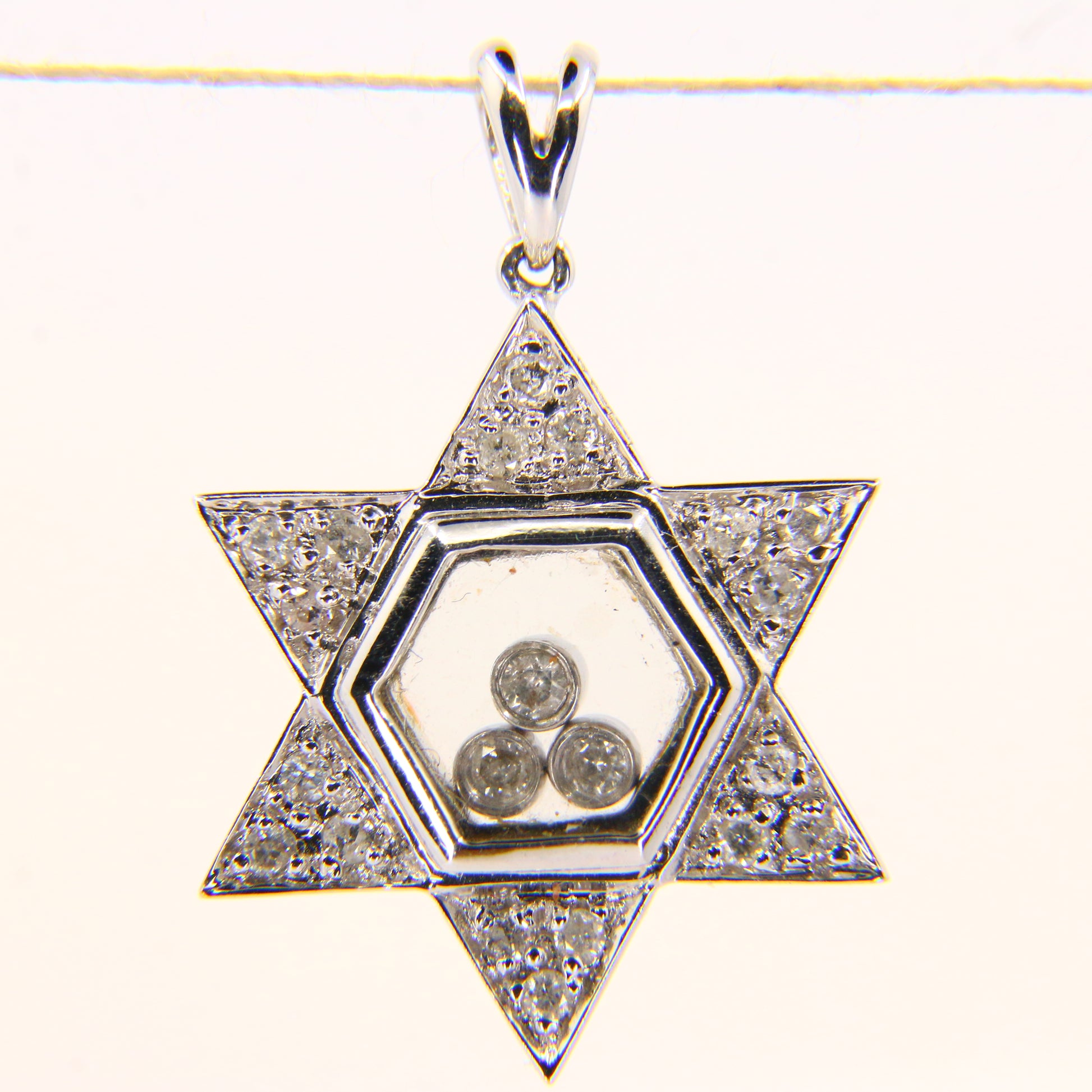 This rare and striking vintage pendant is crafted from solid 18ct white gold in a six-pointed star design, set with pavé diamonds and featuring three floating bezel-set diamonds inside a clear central compartment. Fully hallmarked and inspired by the iconic Happy Diamonds concept, it's a playful yet luxurious piece of fine jewellery. A perfect gift or addition to any collection.