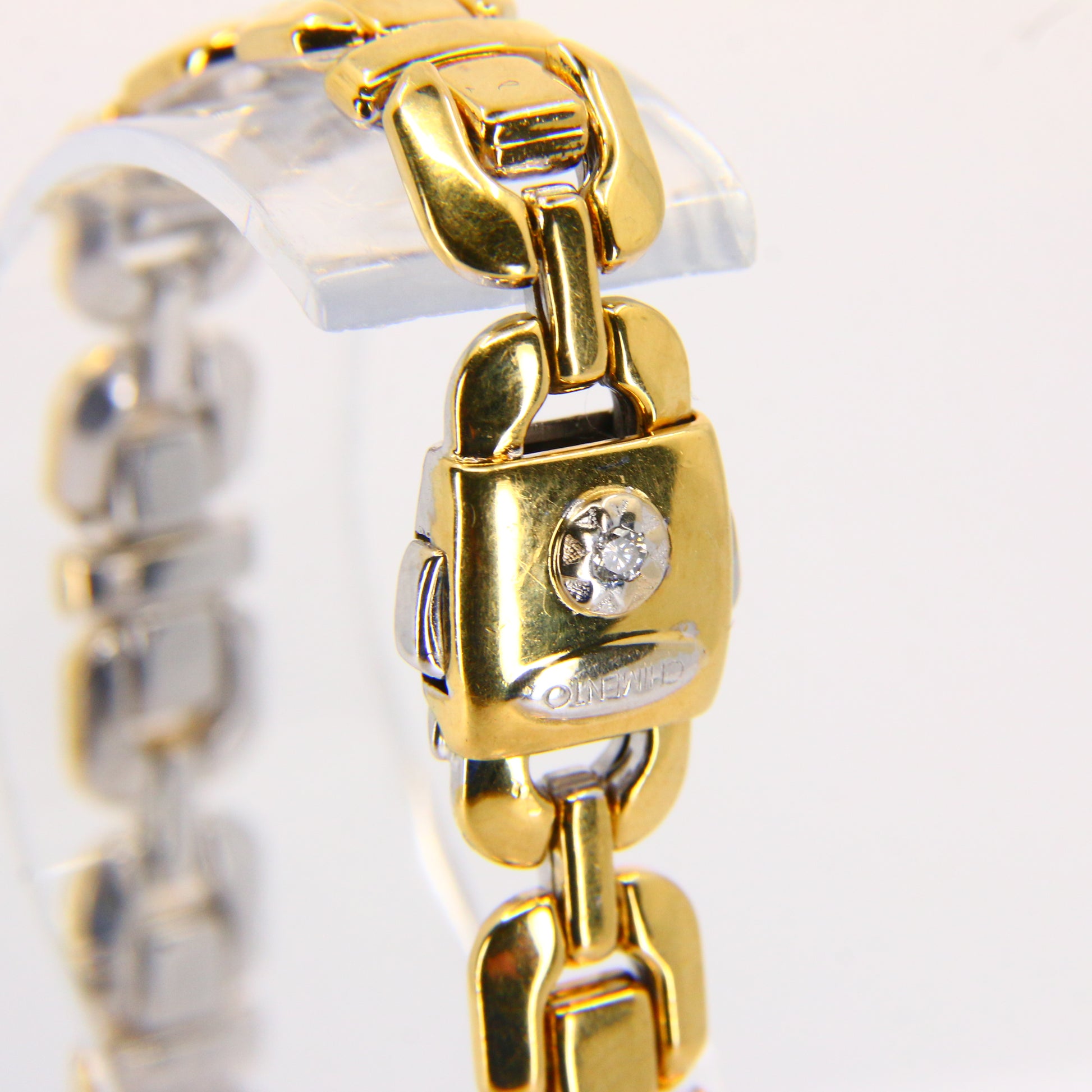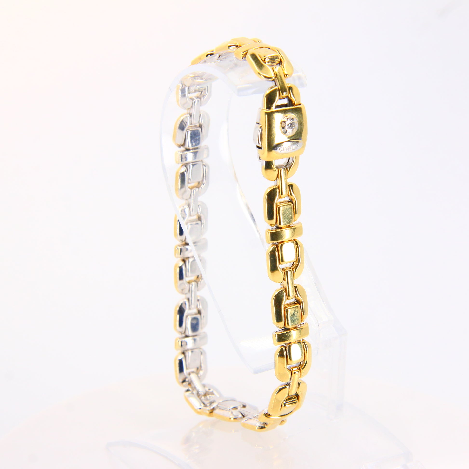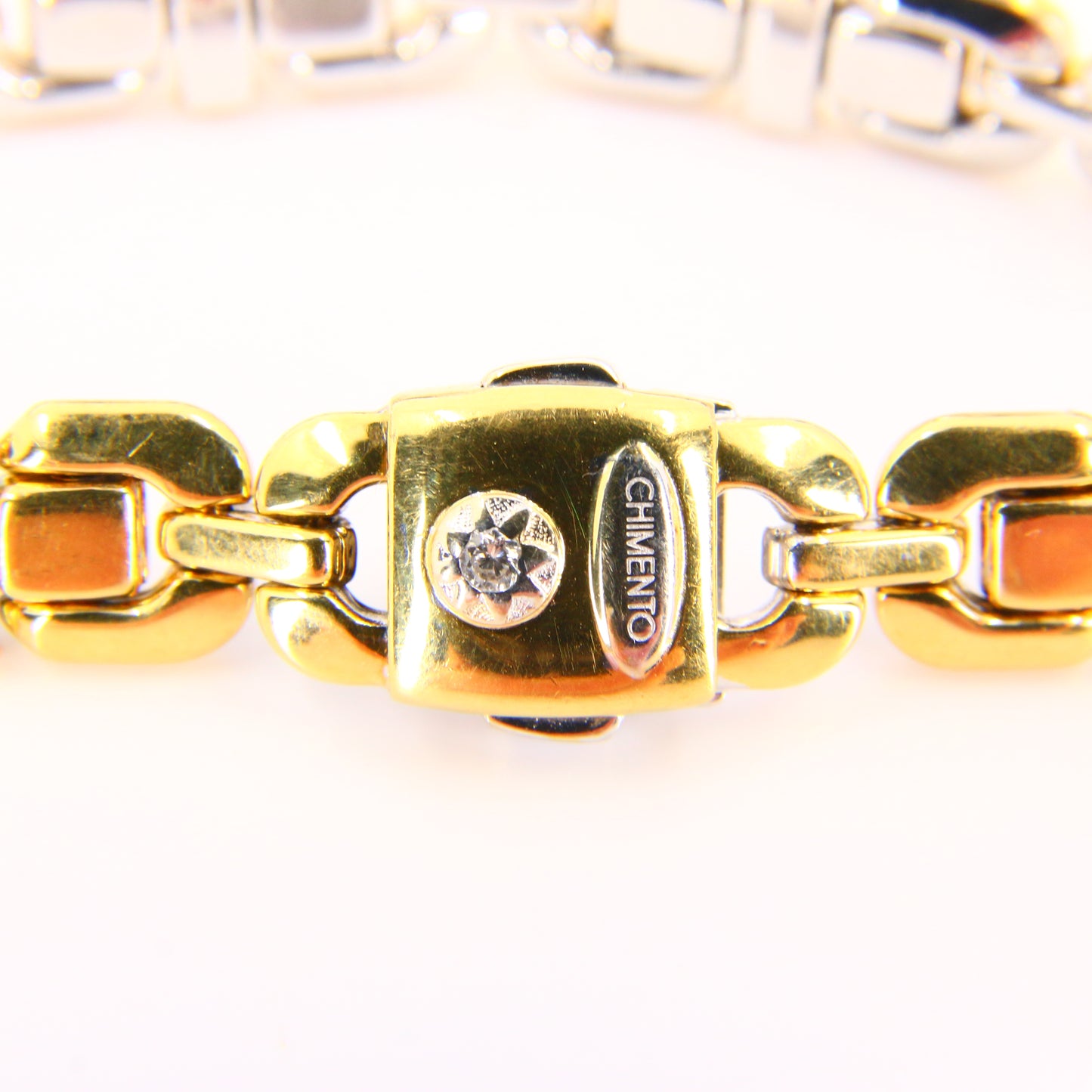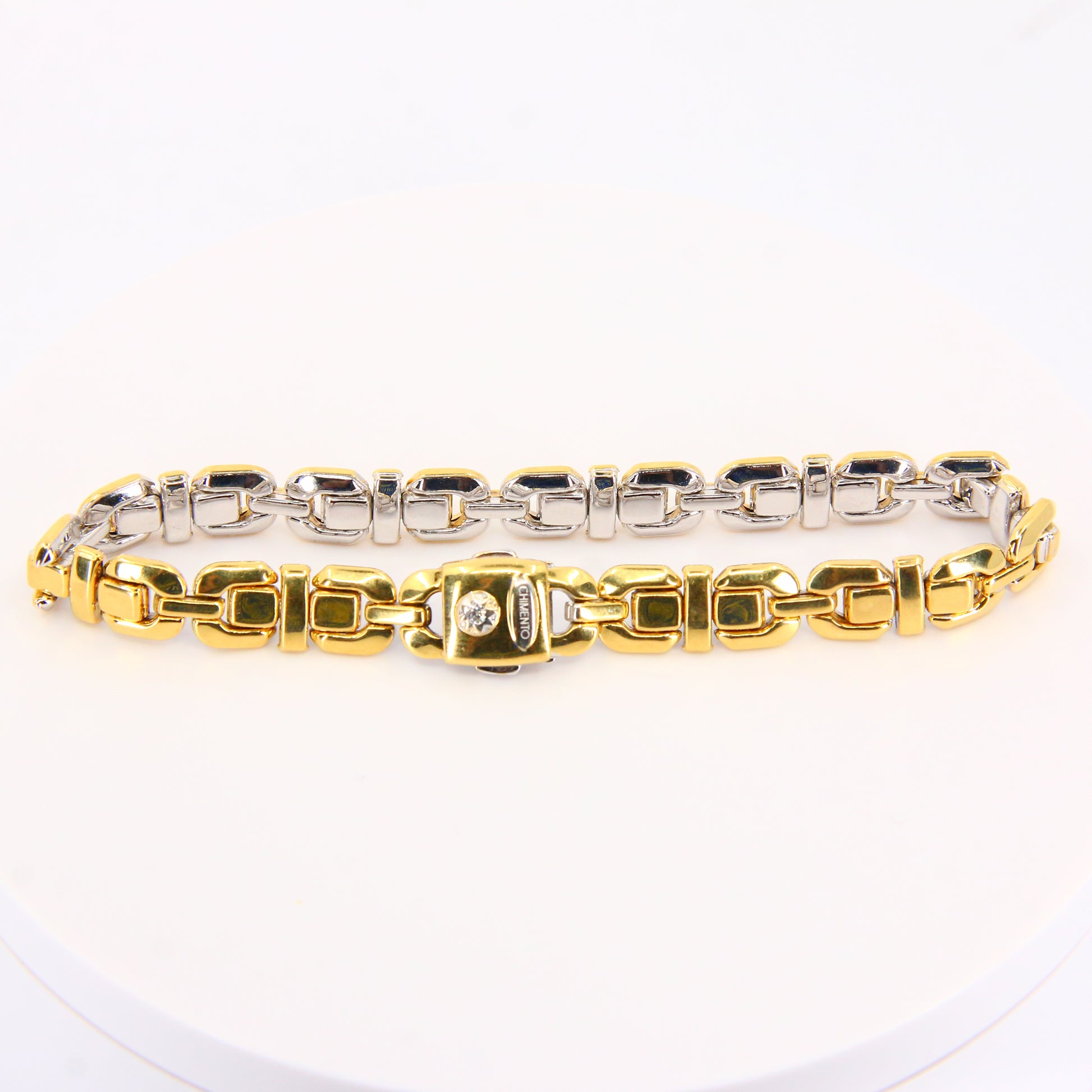 An 8 inch Chimento 18K 2 tone gold bracelet with button clasp. In good condition with only minor signs of wear. Boxed in a plain black box, a perfect gift or addition to any collection.