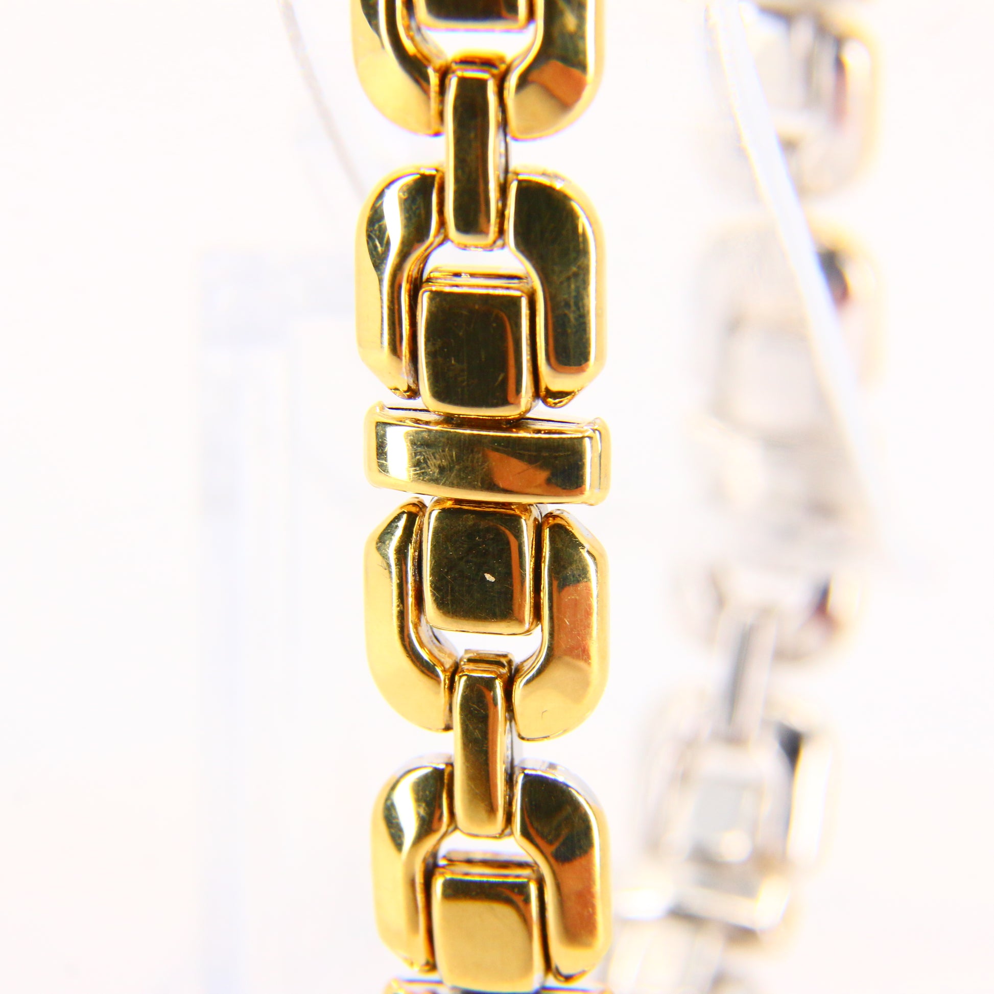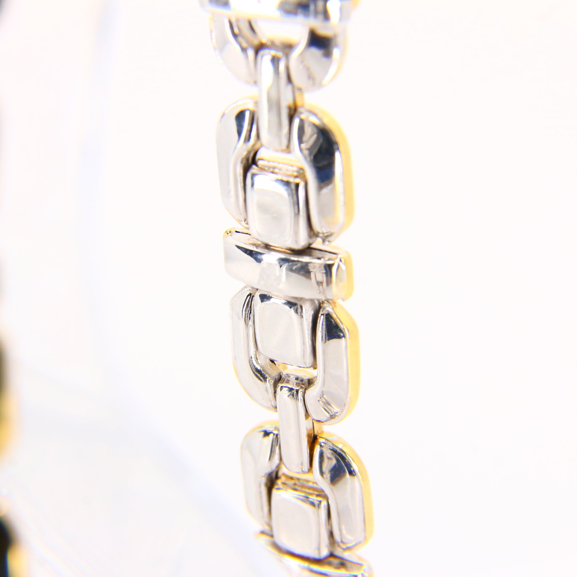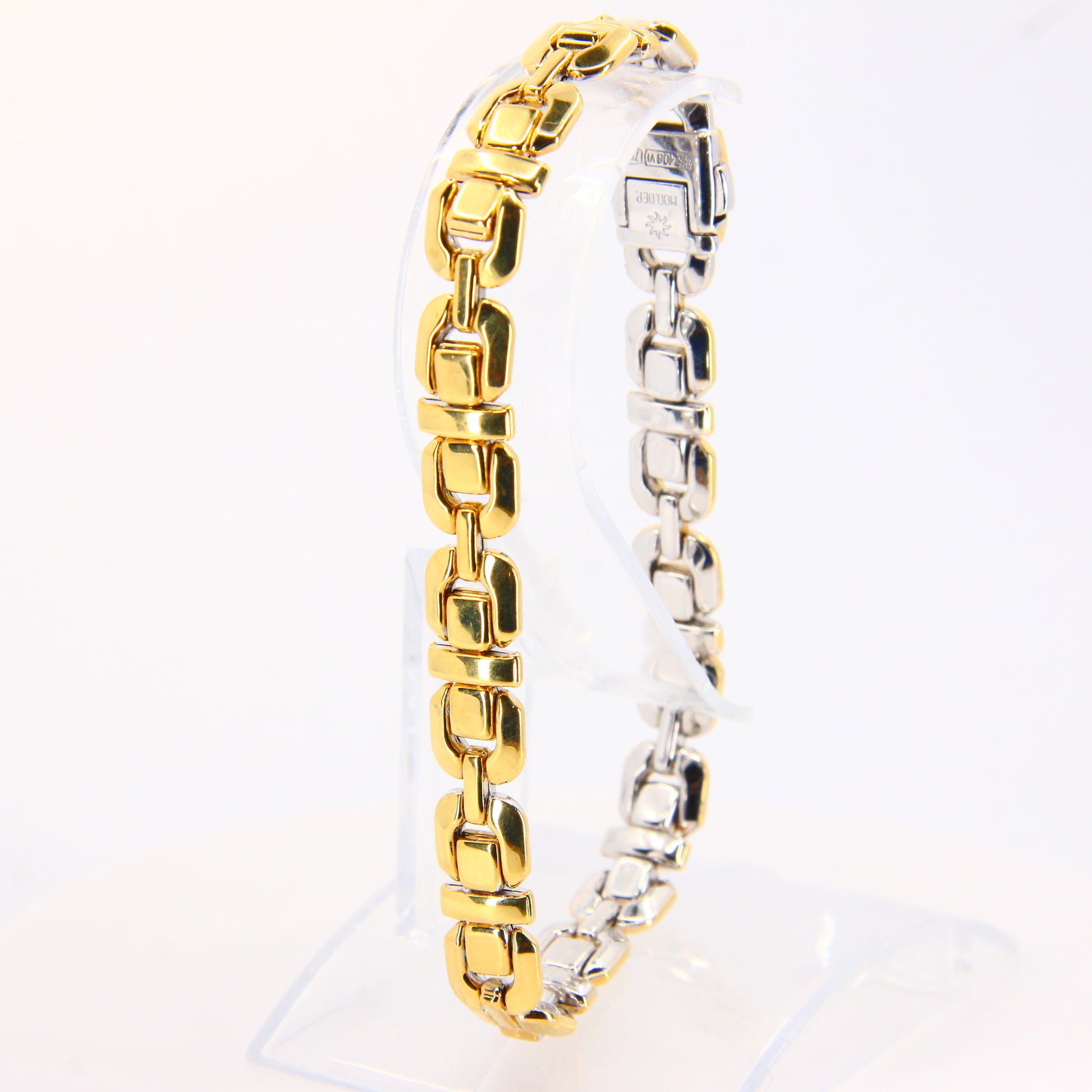 An 8 inch Chimento 18K 2 tone gold bracelet with button clasp. In good condition with only minor signs of wear. Boxed in a plain black box, a perfect gift or addition to any collection.